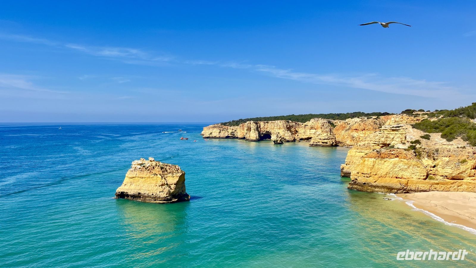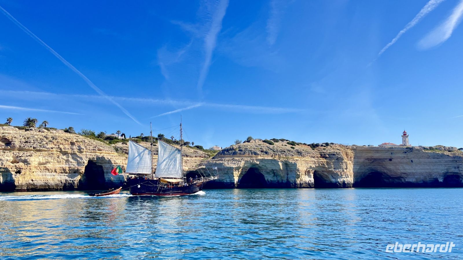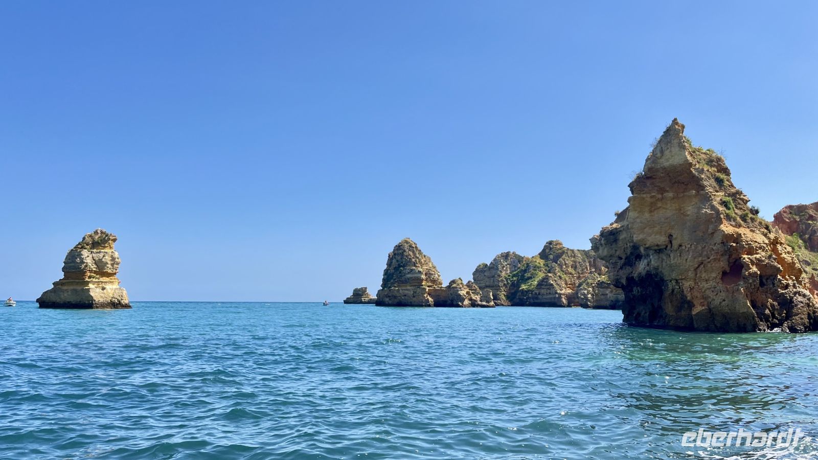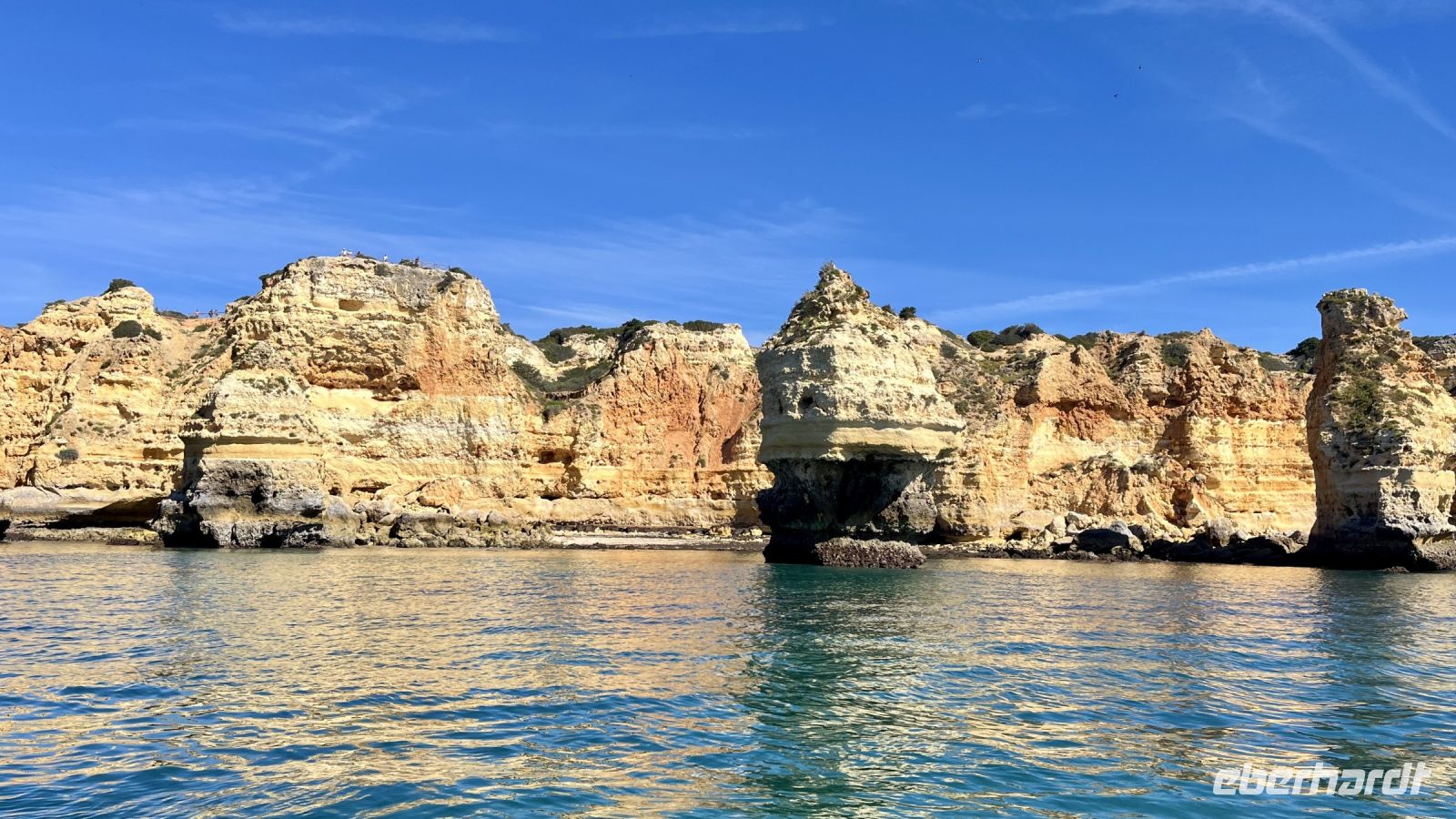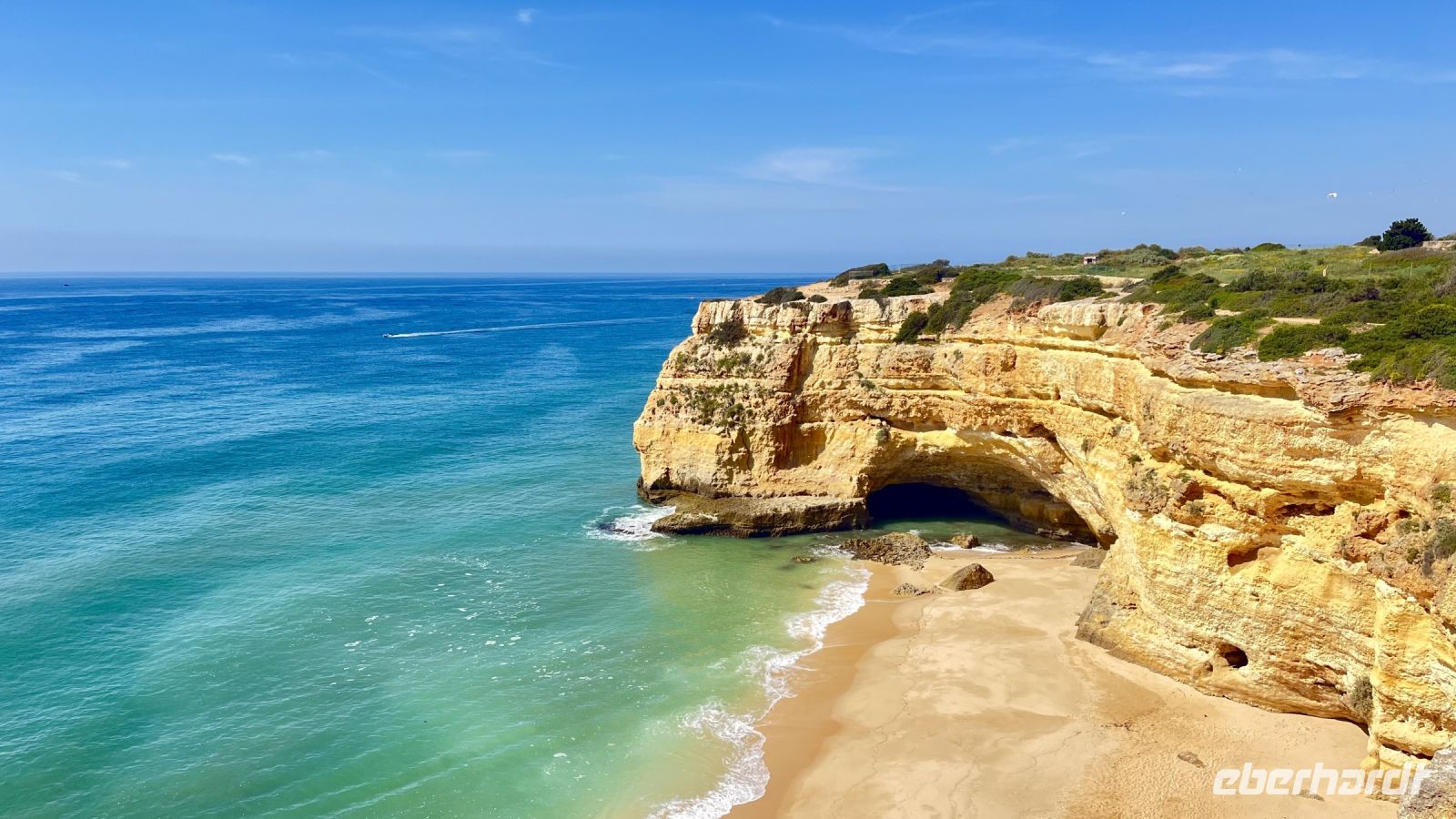 Die Schattierungen des Himmels und des Meeres bildeten einen ständigen Kontrast zu den weißen Klippen der Steilküste von Porto de Mós. Von hier oben ließ uns die sanfte Brise unsere Wanderung aus einer anderen Perspektive erleben, in der die schöne Landschaft zu unseren Füßen ein unbestreitbares Kunstwerk ist. Wir betraten das, was man in der Vergangenheit für das Ende des Südwestens der bis dahin bekannten Welt hielt ... und von dort aus den unendlichen Atlantik, der mit dem Himmel zu einem Horizont verschmilzt, der meisterhaft gezeichnet ist. Eine solche Schönheit sieht man nicht alle Tage, und diese Küste ist eine der schönsten, die wir je gesehen haben.