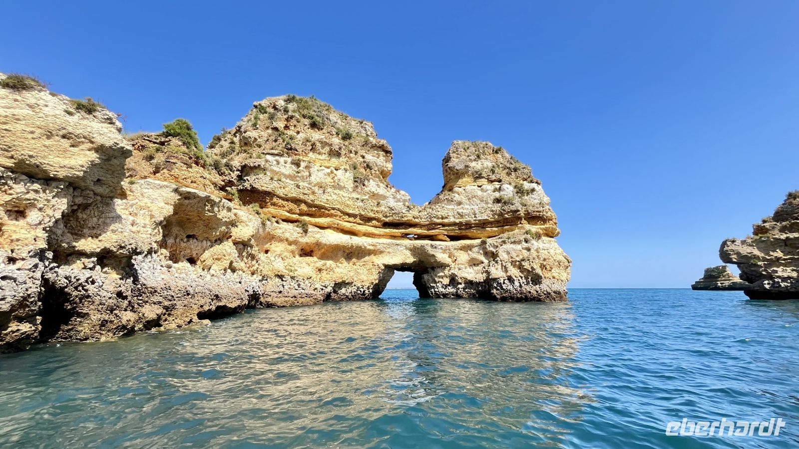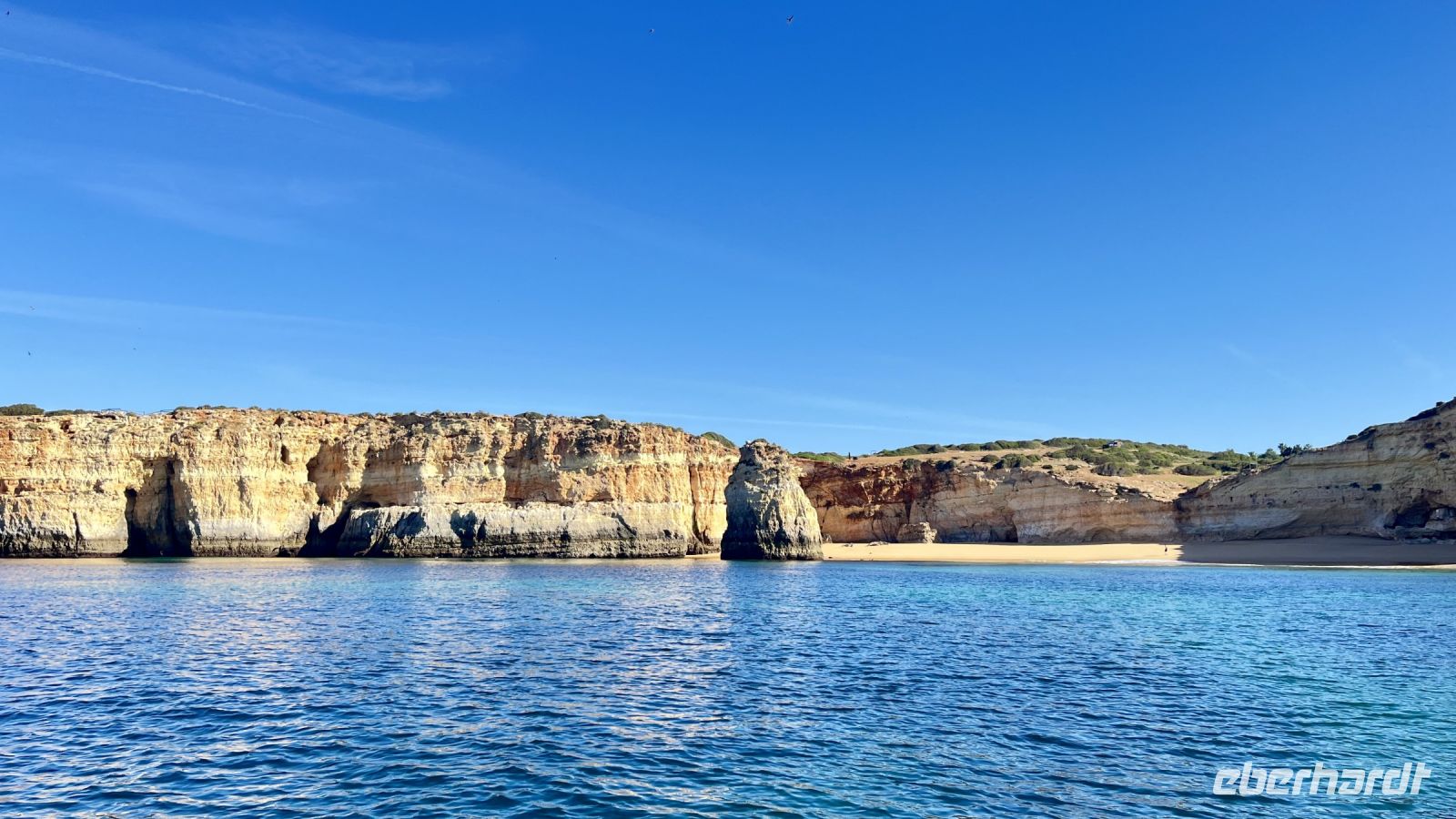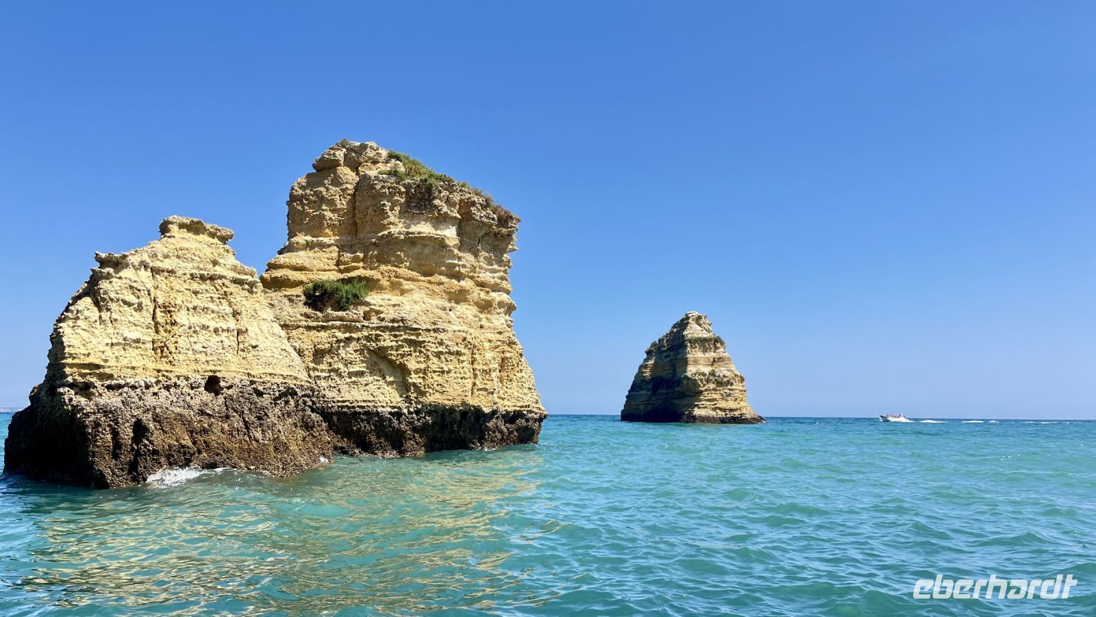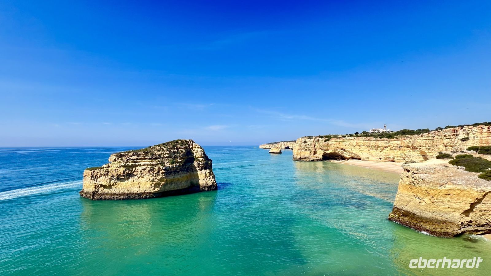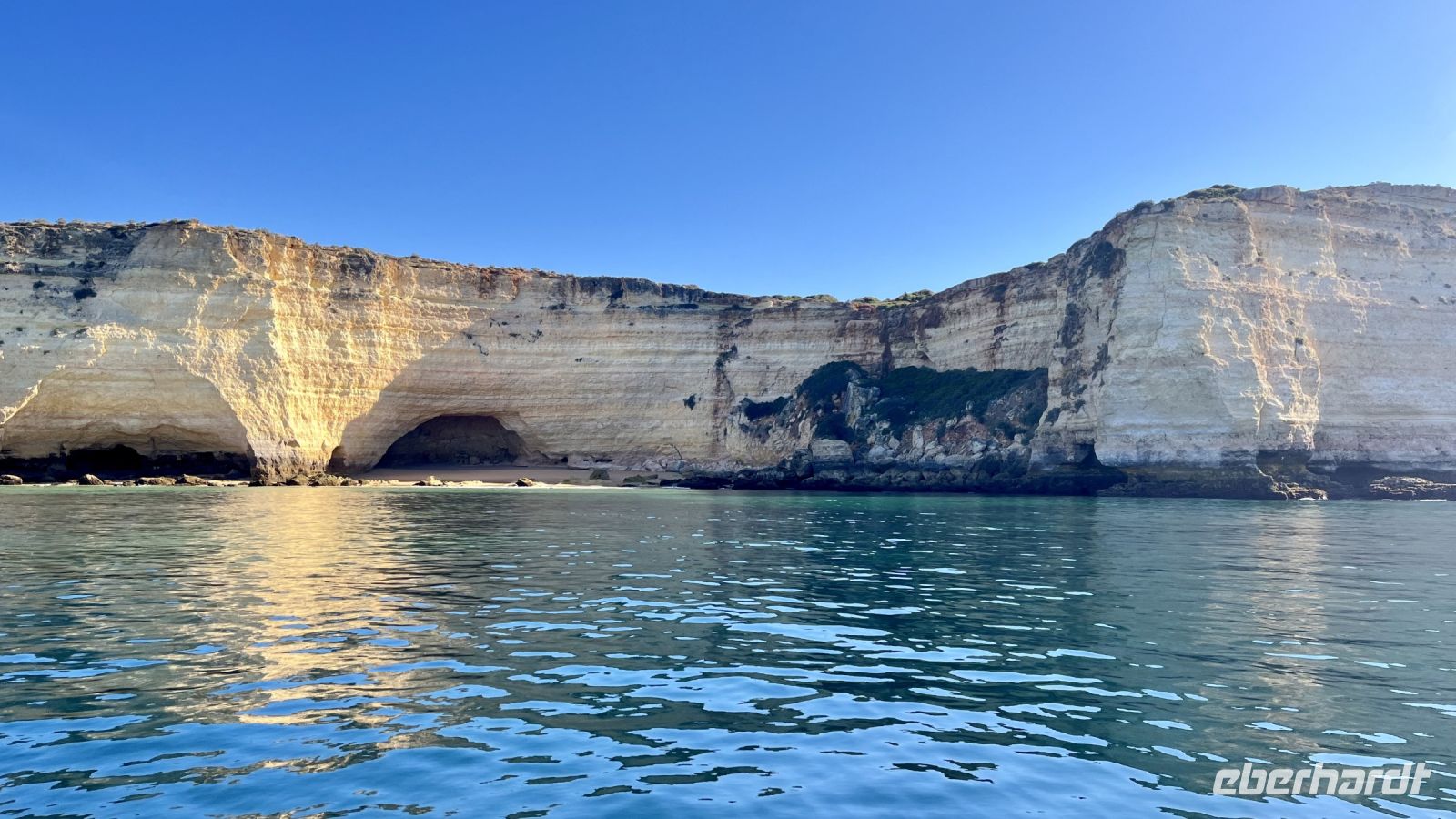 Die Schattierungen des Himmels und des Meeres bildeten einen ständigen Kontrast zu den weißen Klippen der Steilküste von Porto de Mós. Von hier oben ließ uns die sanfte Brise unsere Wanderung aus einer anderen Perspektive erleben, in der die schöne Landschaft zu unseren Füßen ein unbestreitbares Kunstwerk ist. Wir betraten das, was man in der Vergangenheit für das Ende des Südwestens der bis dahin bekannten Welt hielt ... und von dort aus den unendlichen Atlantik, der mit dem Himmel zu einem Horizont verschmilzt, der meisterhaft gezeichnet ist. Eine solche Schönheit sieht man nicht alle Tage, und diese Küste ist eine der schönsten, die wir je gesehen haben.