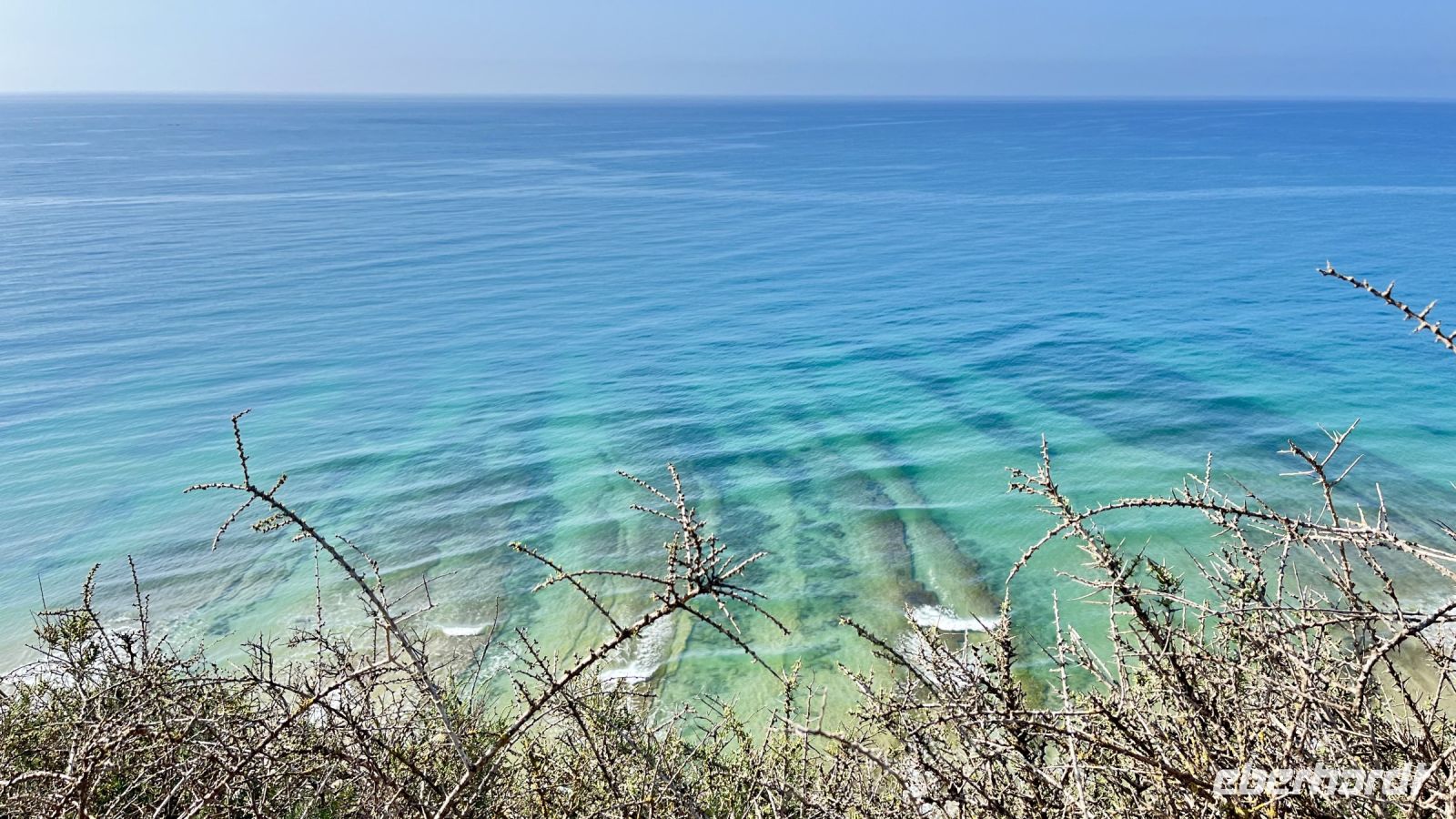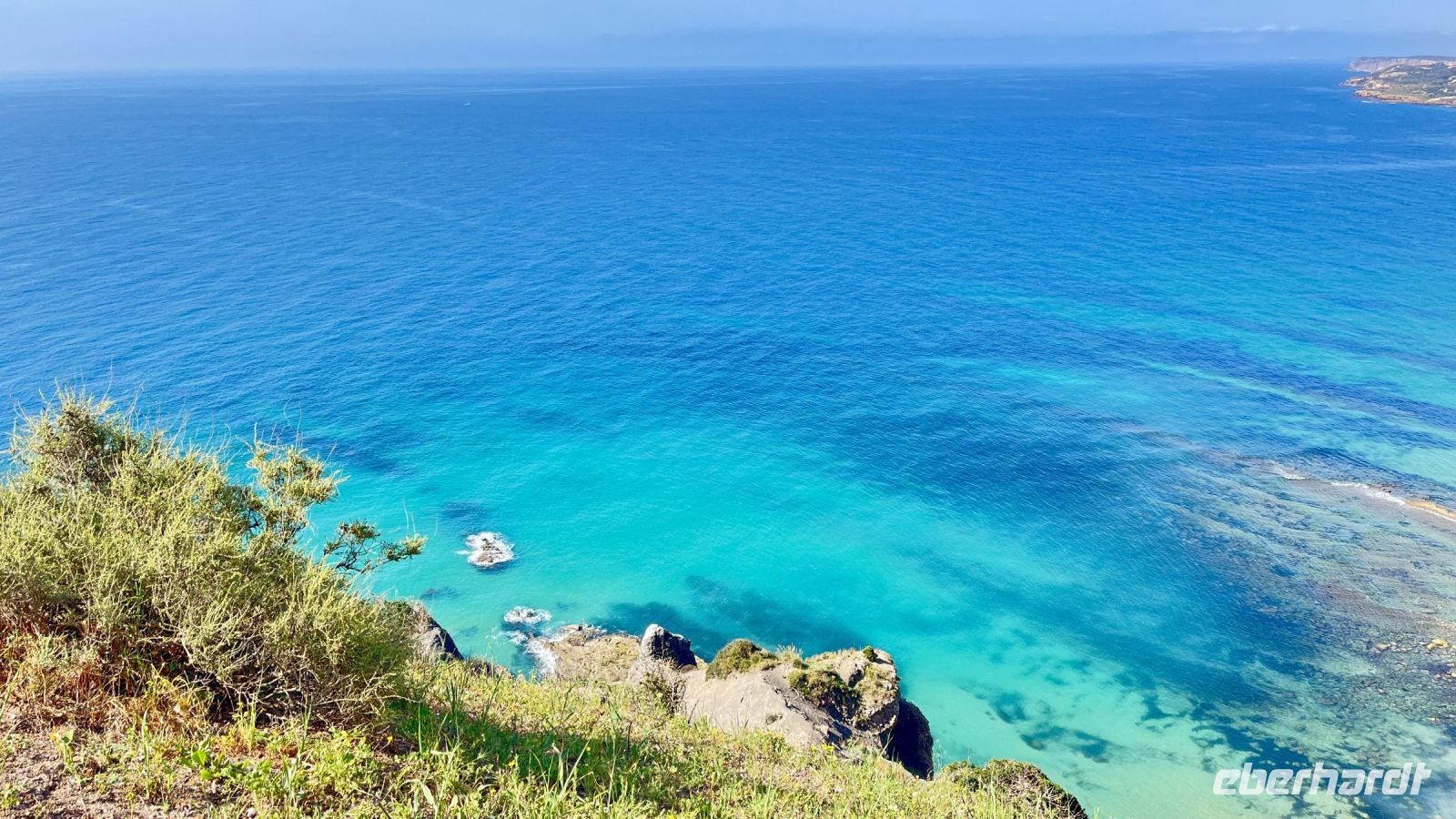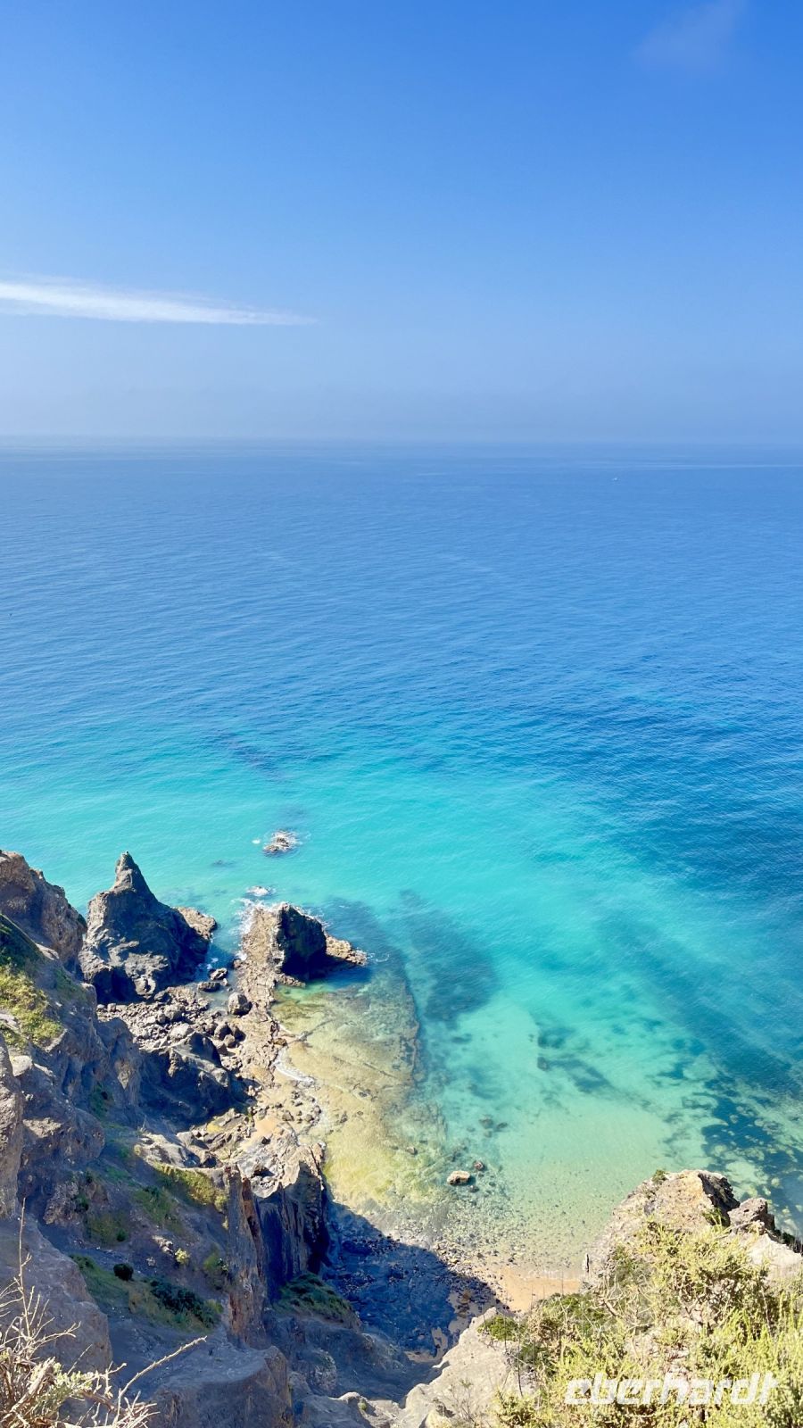 Jeden Tag wurde die Messlatte ein wenig höher gelegt. War es möglich, die bisher gesehenen Schönheiten heute noch zu übertreffen? Die Antwort kam bald. Wir kamen nur langsam voran, denn bei jedem Schritt hielten wir an, um die ganze Herrlichkeit zu bewundern. Lange Wellen, die langsam und stetig zur Küste kommen und sich sanft am Ufer brachen. Die Perspektive von den Klippen aus ist ganz anders. An diesem sonnigen Tag verblassten die Türkistöne des Wassers und verschmolzen mit dem Blau des Himmels in der Ferne und wurden in der Nähe durchsichtig, so dass man den Meeresboden sehen konnte.