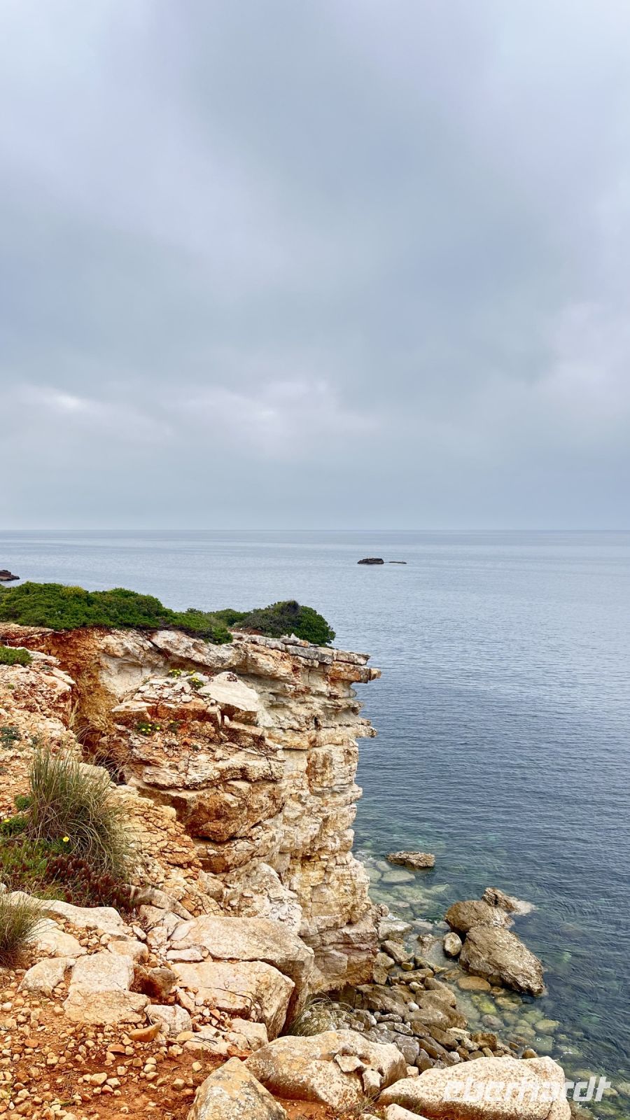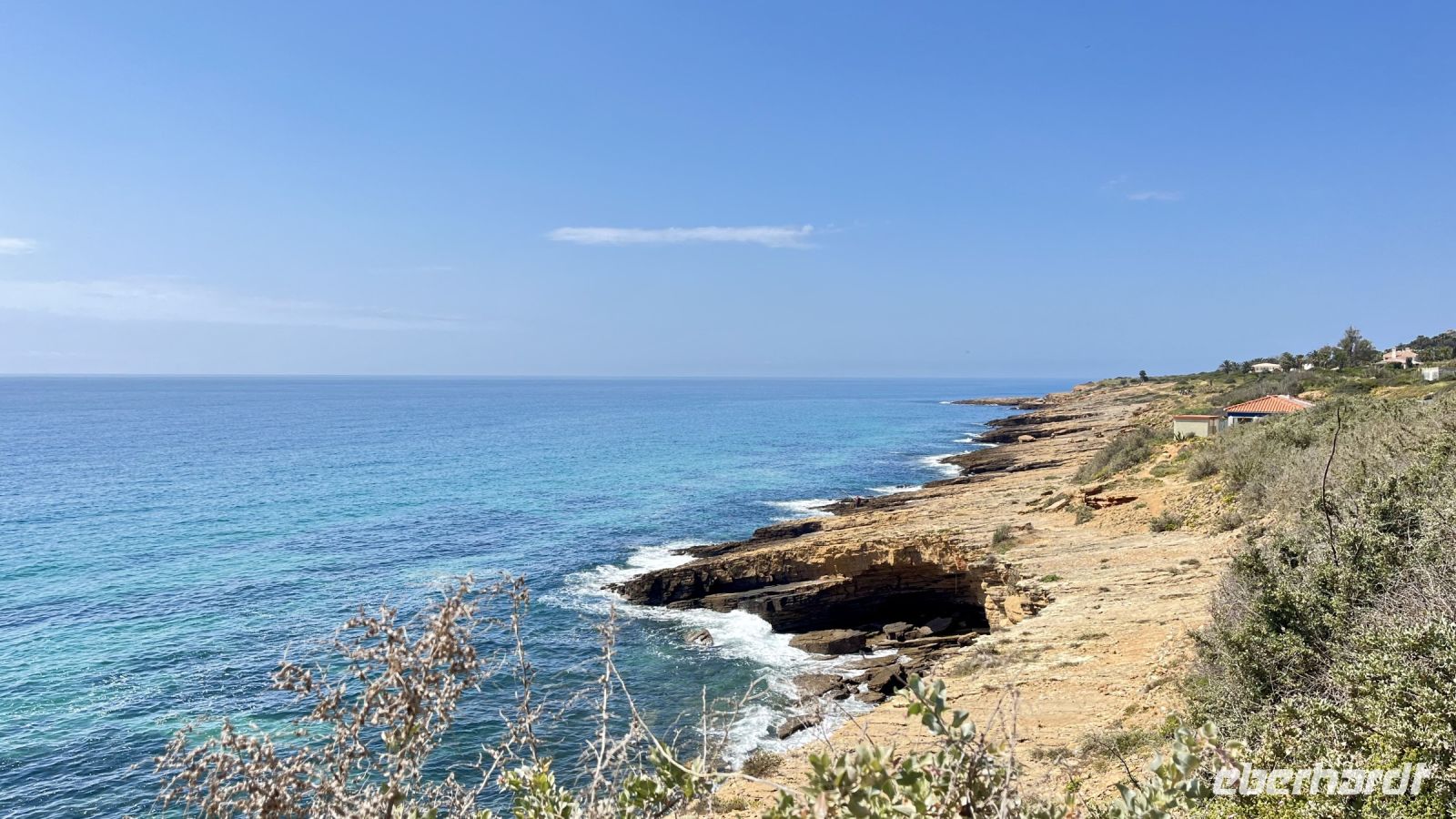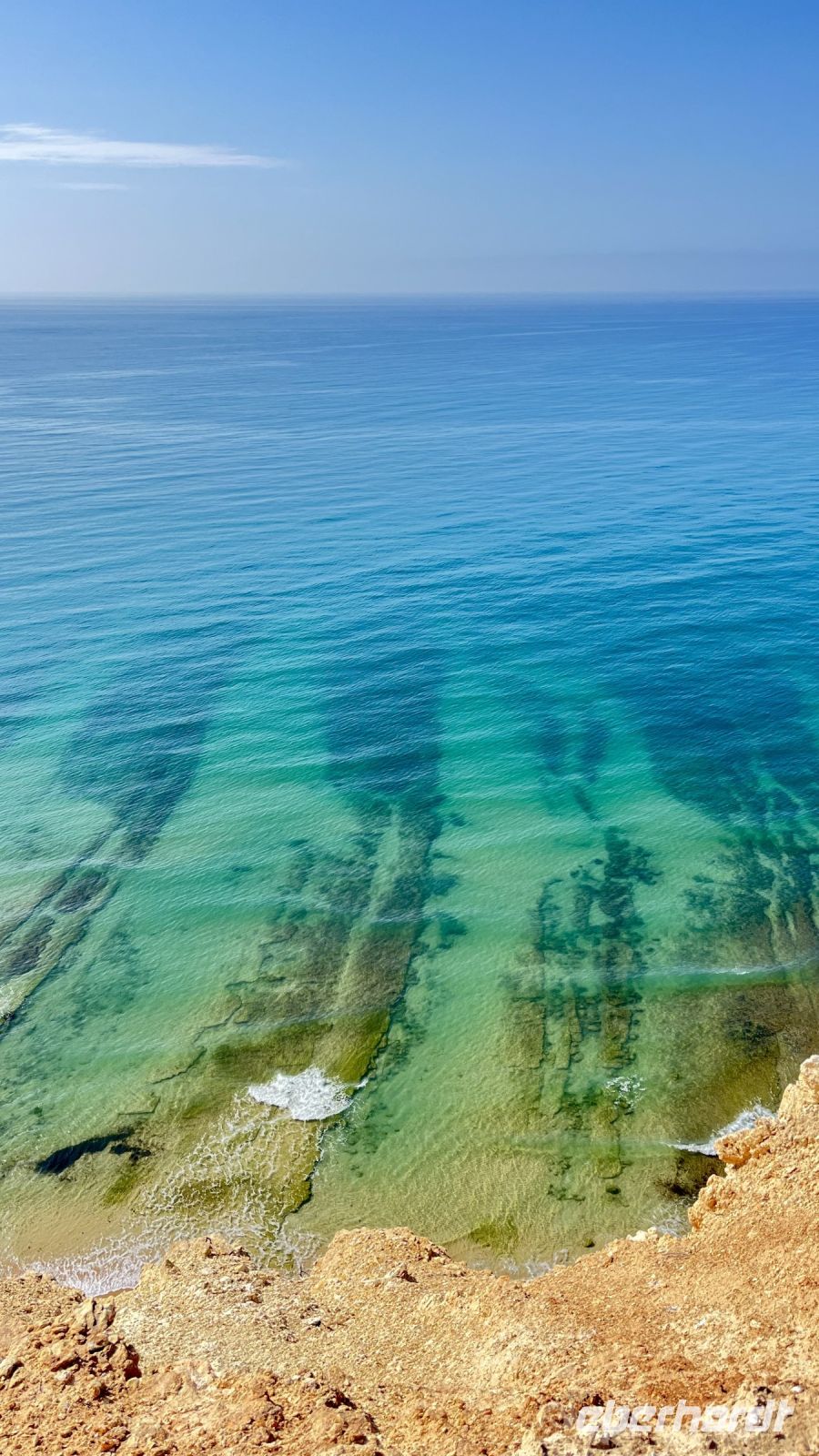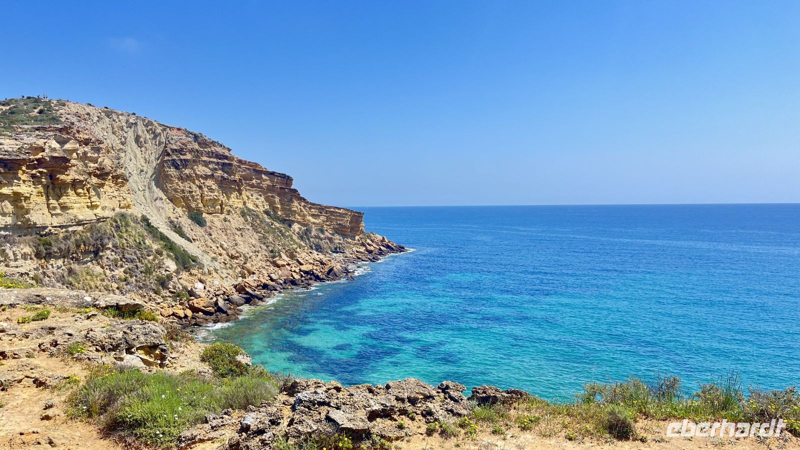 Jeden Tag wurde die Messlatte ein wenig höher gelegt. War es möglich, die bisher gesehenen Schönheiten heute noch zu übertreffen? Die Antwort kam bald. Wir kamen nur langsam voran, denn bei jedem Schritt hielten wir an, um die ganze Herrlichkeit zu bewundern. Lange Wellen, die langsam und stetig zur Küste kommen und sich sanft am Ufer brachen. Die Perspektive von den Klippen aus ist ganz anders. An diesem sonnigen Tag verblassten die Türkistöne des Wassers und verschmolzen mit dem Blau des Himmels in der Ferne und wurden in der Nähe durchsichtig, so dass man den Meeresboden sehen konnte.