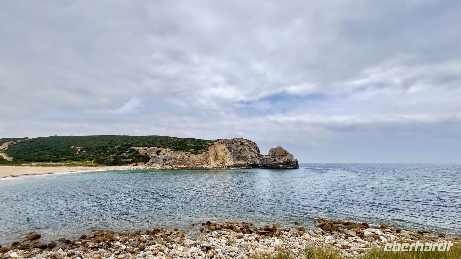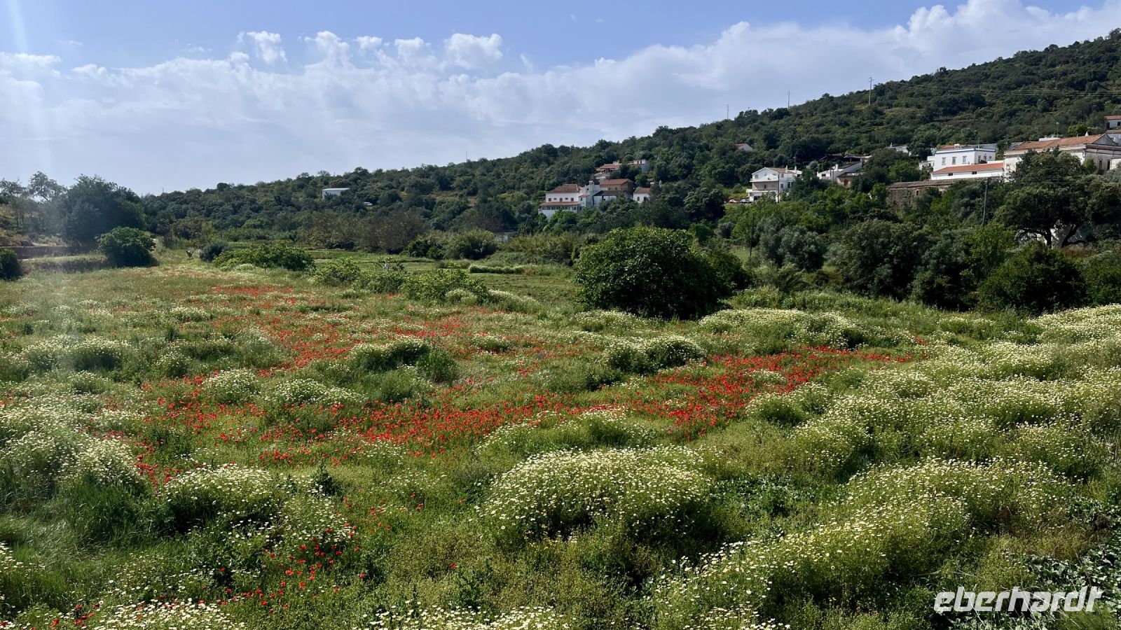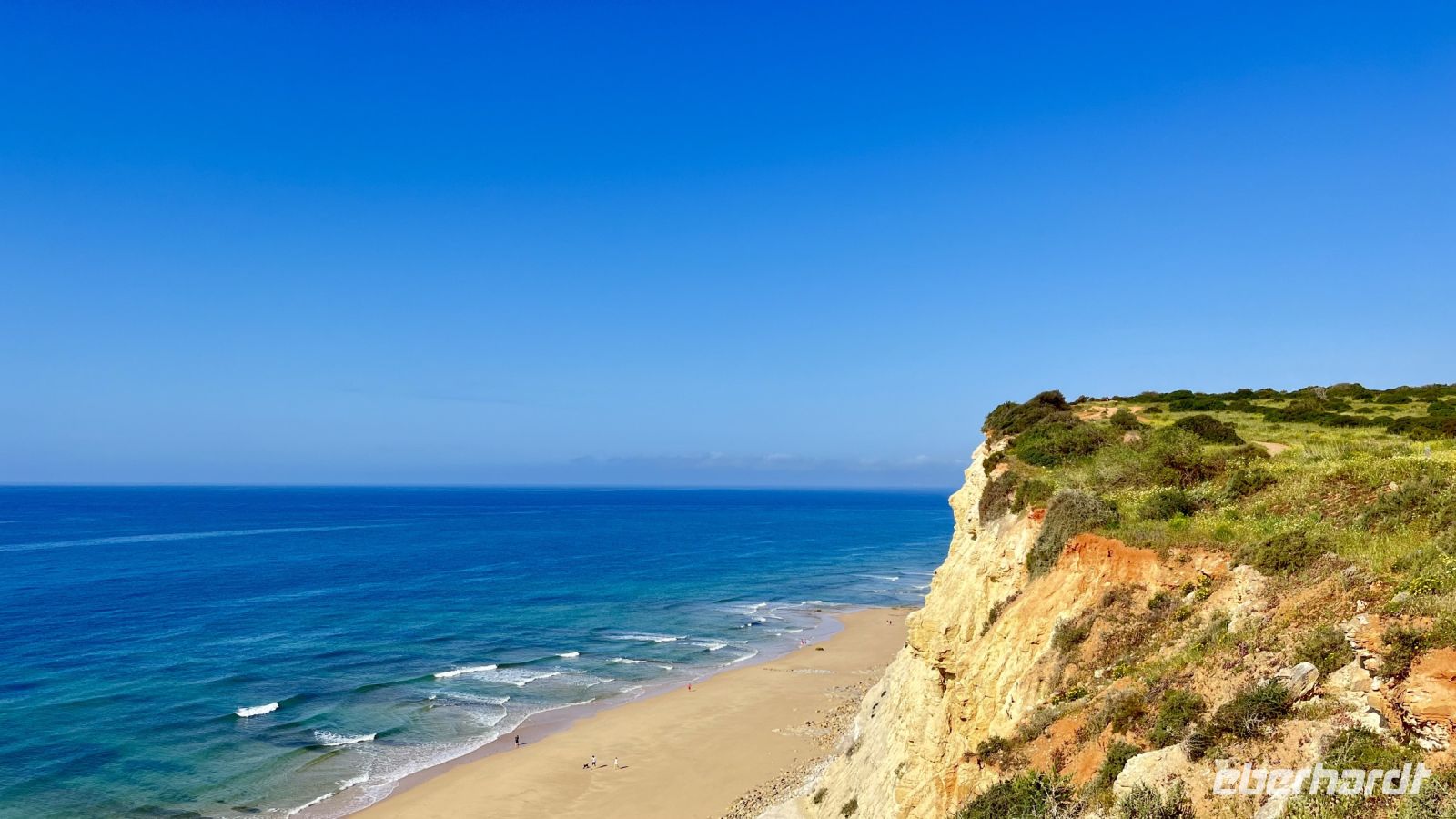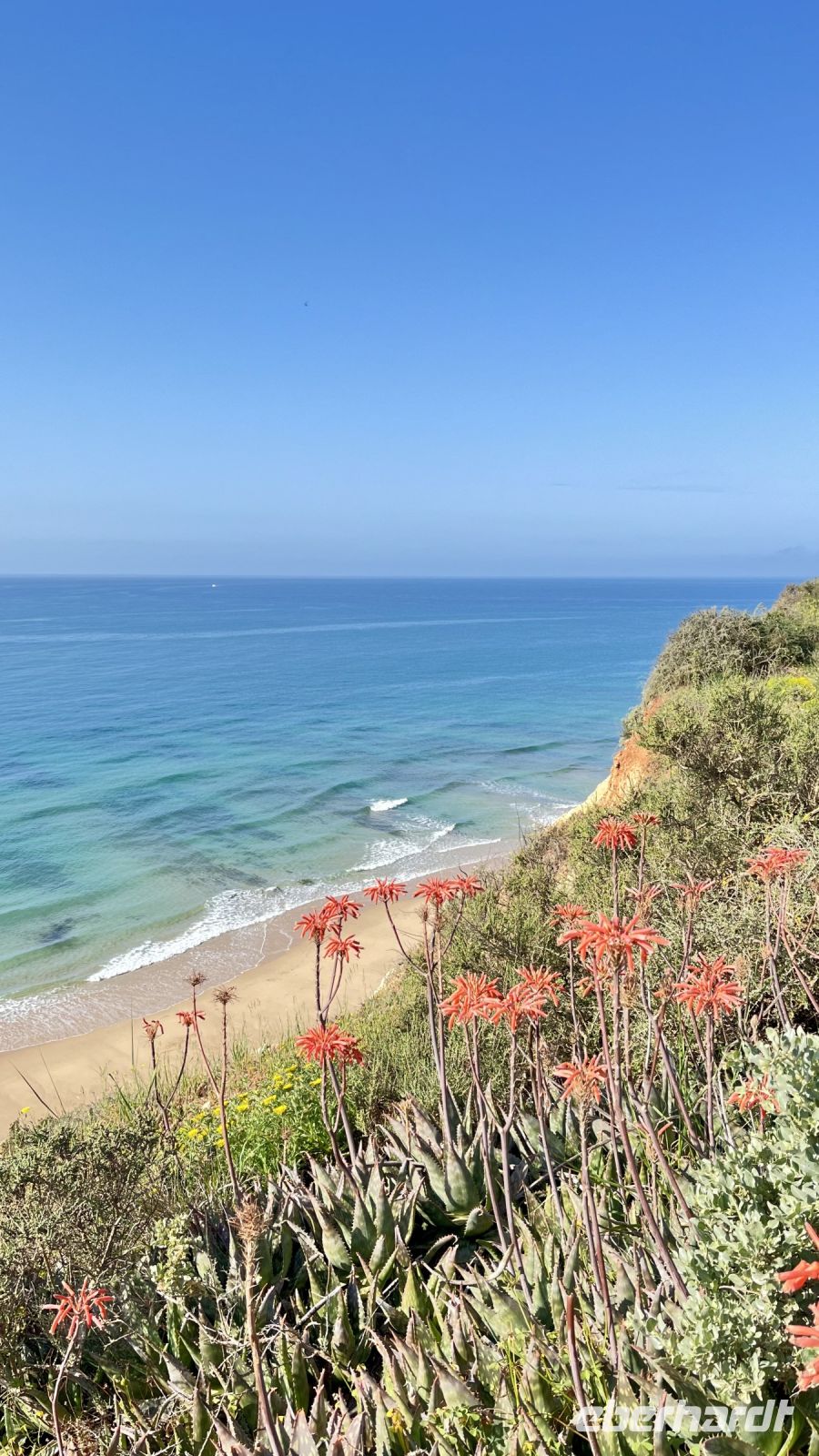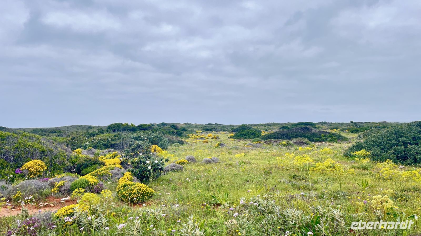 Unsere erste Wanderung begann an der Küste ‚Costa Vicentina‘. Nach und nach stieg das Gelände im ‚Parque Natural do Sudoeste Alentejano‘ an, und fast ohne es zu bemerken, fanden wir uns am Rande schöner Klippen wieder. Wir waren von völliger Schönheit und großer Ruhe umgeben, schafften neue Erinnerungen, ohne unsere Gedanken beiseitezulassen. Zu unserer Rechten umschmeichelte eine Decke aus kristallklarem Wasser die Felsen der Küste und verband sich mit dem Himmel zu jener fernen Linie, die wir den Horizont nennen. Zu unserer Linken und unter unseren Füßen war ein Blumenteppich am Vila do Vispo, der uns auf unserem ständigen Marsch begleitete. Und so gingen wir weiter, bis wir eine kleine Bucht erreichten und die Blumen am Wegesrand gegen weißen Sand austauschten, der uns als Tischdecke für unser Picknick diente, als es Zeit war, sich auszuruhen.