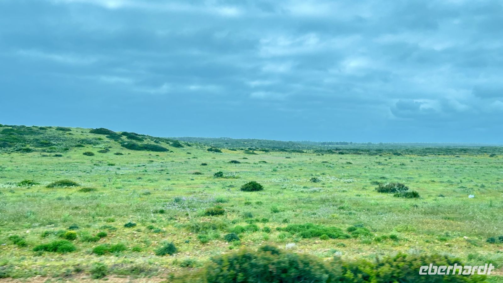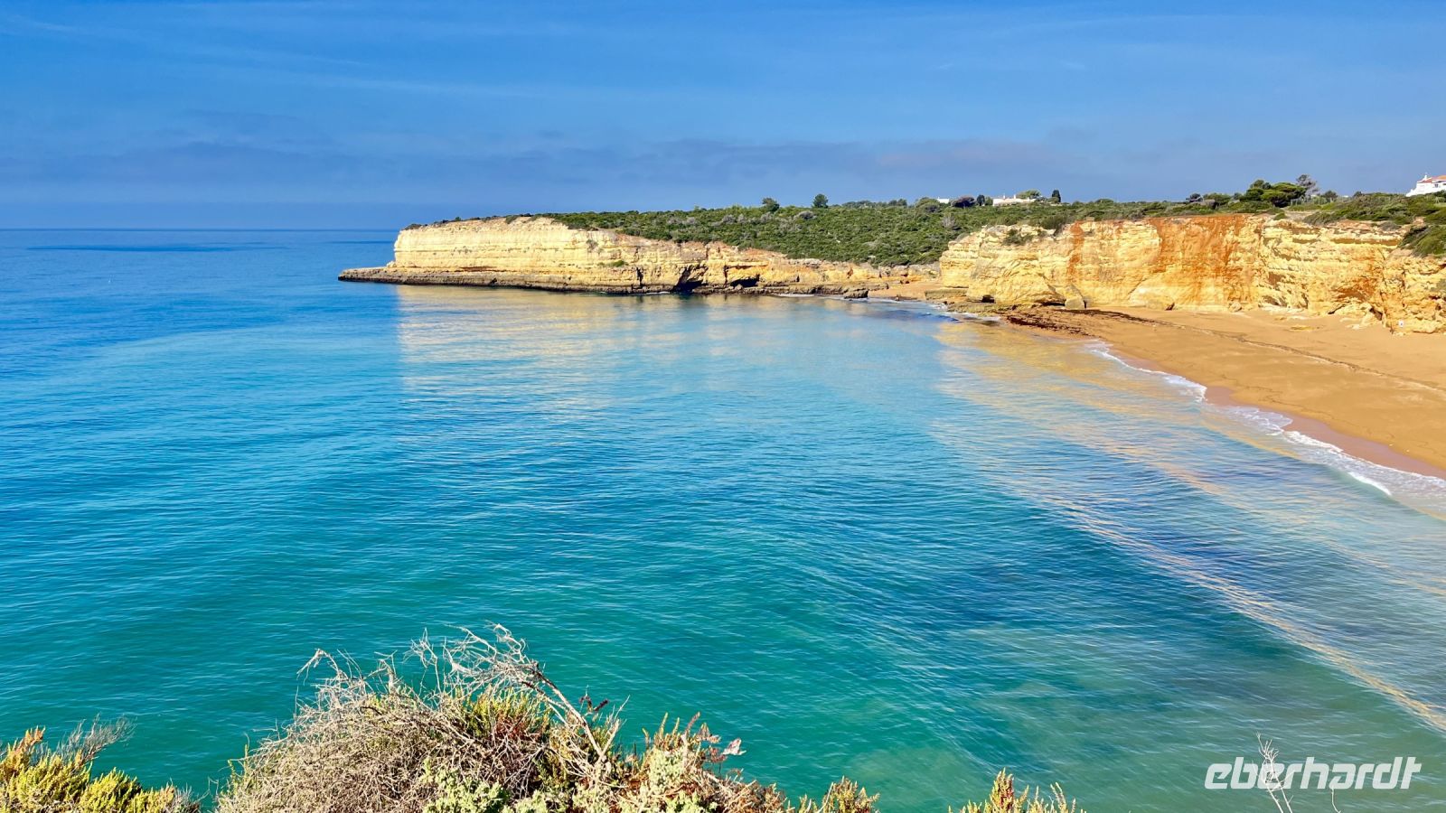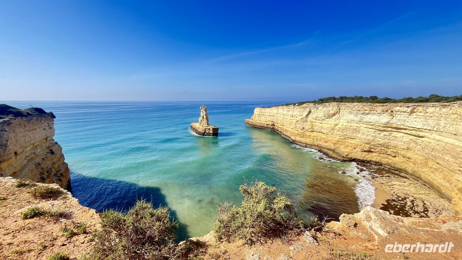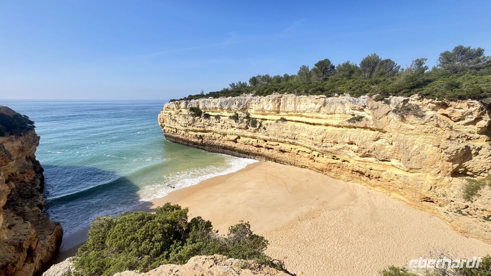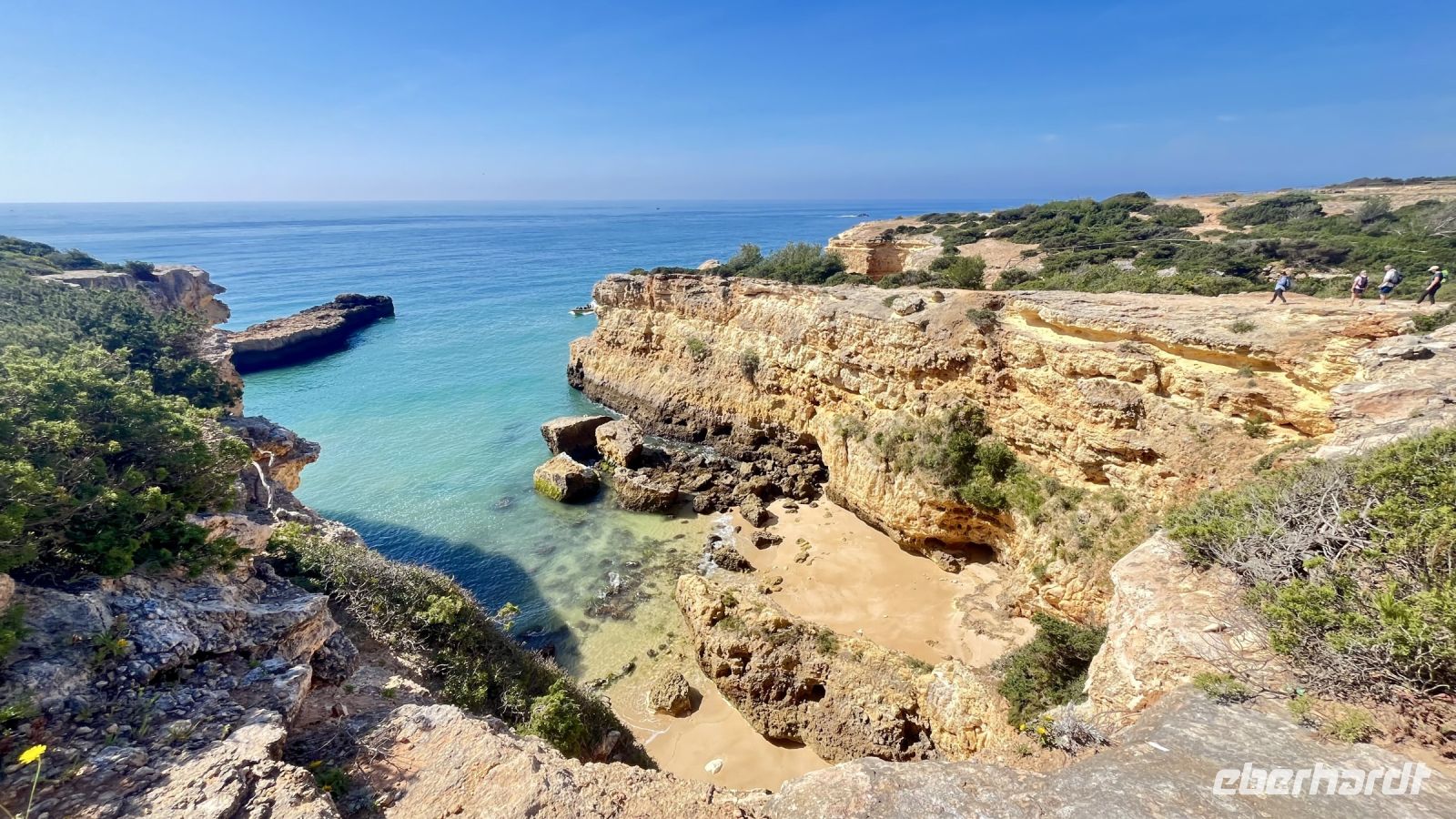 Unsere erste Wanderung begann an der Küste ‚Costa Vicentina‘. Nach und nach stieg das Gelände im ‚Parque Natural do Sudoeste Alentejano‘ an, und fast ohne es zu bemerken, fanden wir uns am Rande schöner Klippen wieder. Wir waren von völliger Schönheit und großer Ruhe umgeben, schafften neue Erinnerungen, ohne unsere Gedanken beiseitezulassen. Zu unserer Rechten umschmeichelte eine Decke aus kristallklarem Wasser die Felsen der Küste und verband sich mit dem Himmel zu jener fernen Linie, die wir den Horizont nennen. Zu unserer Linken und unter unseren Füßen war ein Blumenteppich am Vila do Vispo, der uns auf unserem ständigen Marsch begleitete. Und so gingen wir weiter, bis wir eine kleine Bucht erreichten und die Blumen am Wegesrand gegen weißen Sand austauschten, der uns als Tischdecke für unser Picknick diente, als es Zeit war, sich auszuruhen.