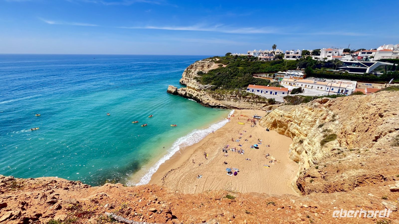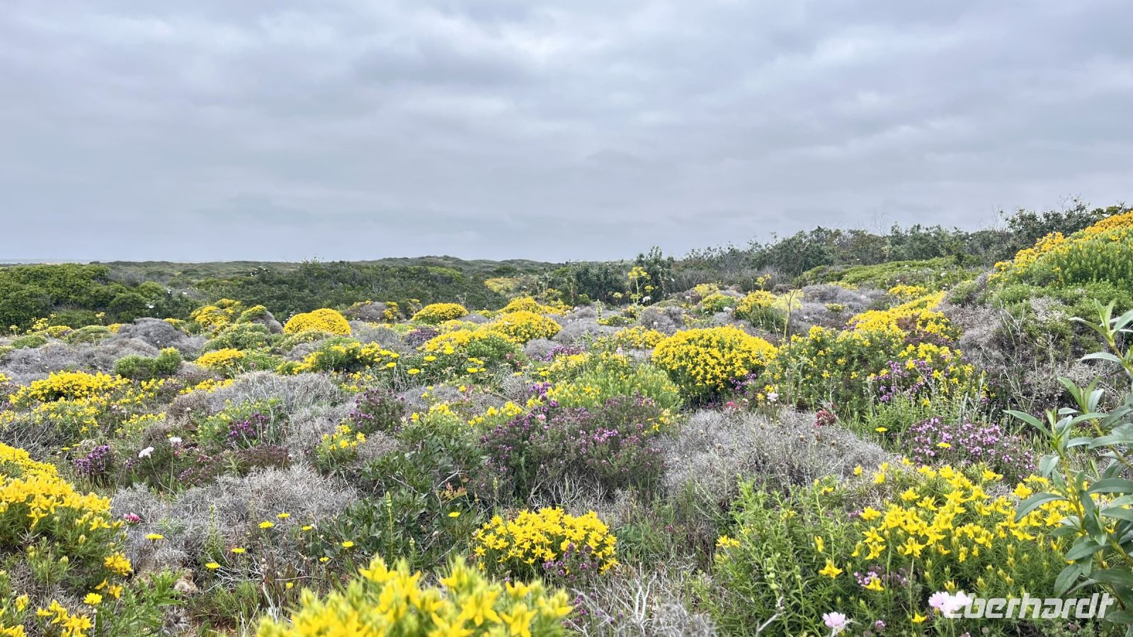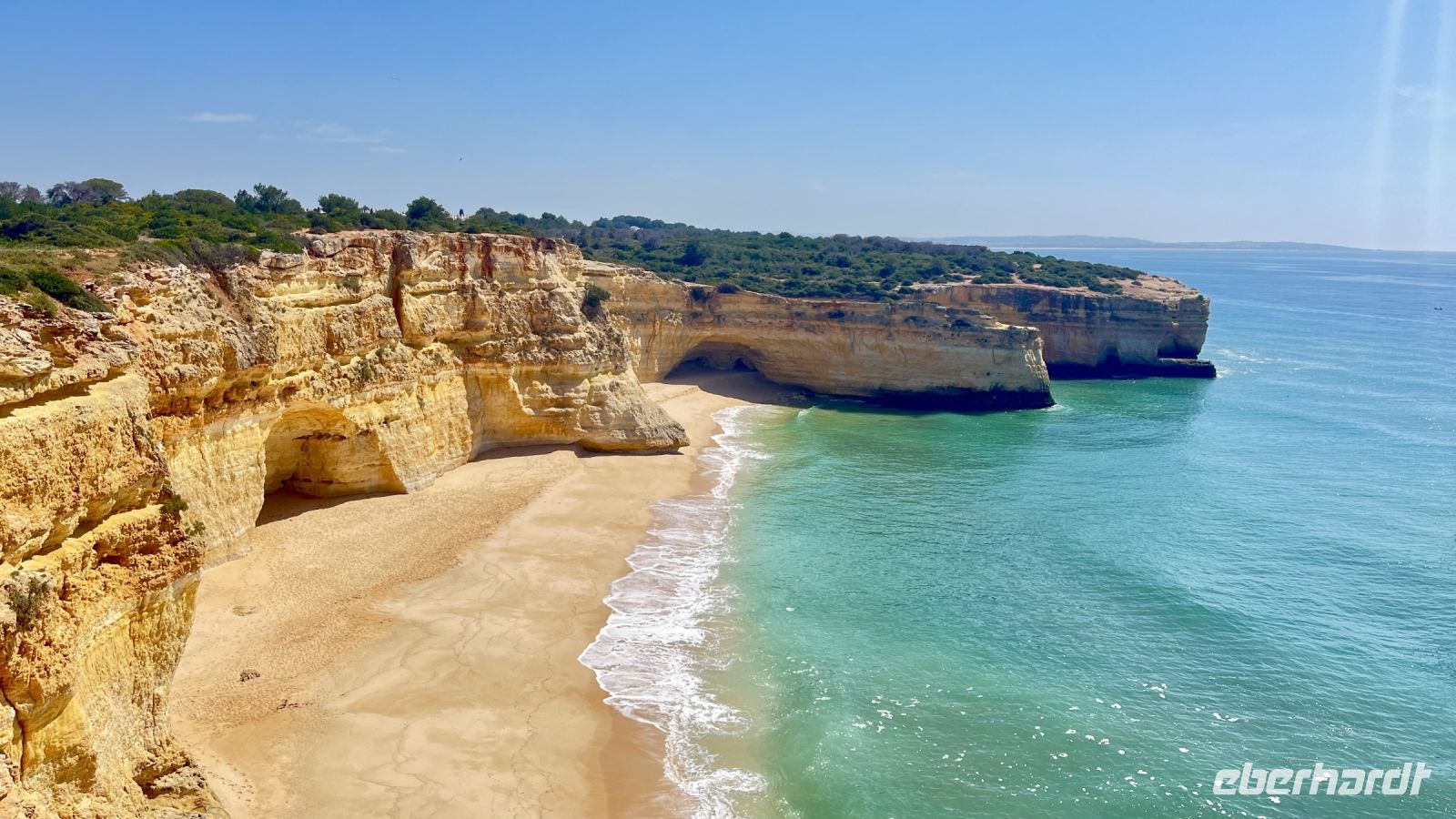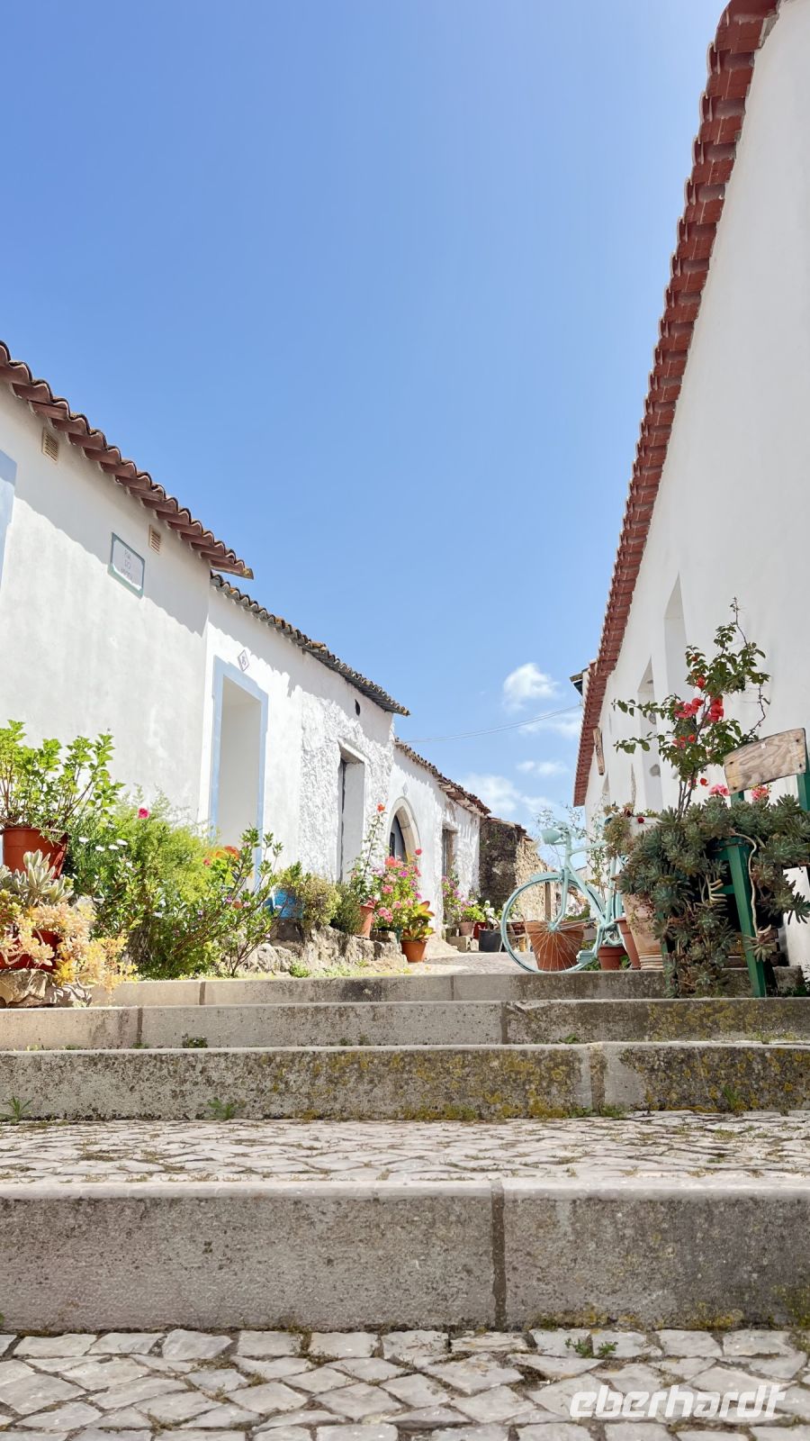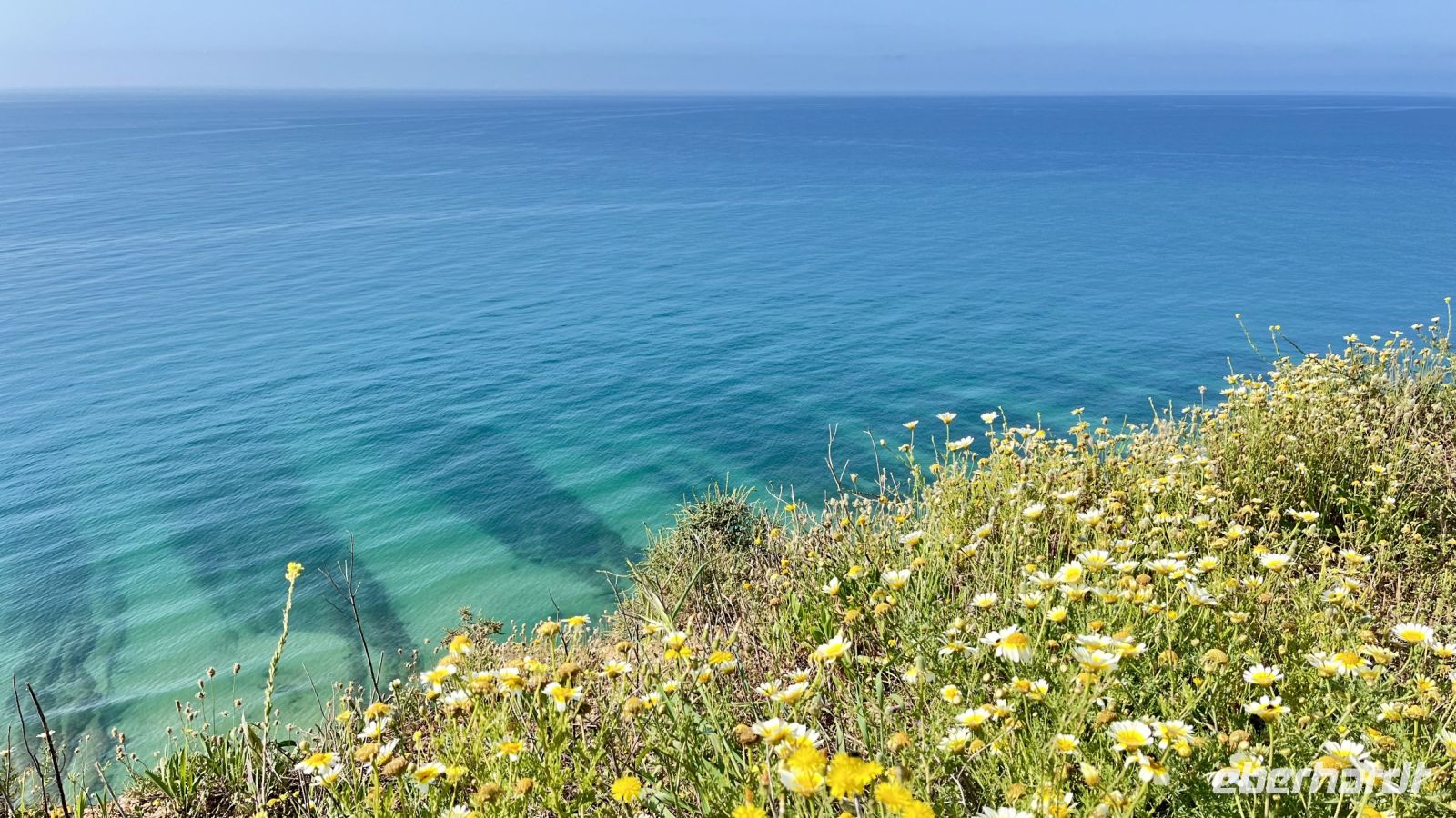 Unsere erste Wanderung begann an der Küste ‚Costa Vicentina‘. Nach und nach stieg das Gelände im ‚Parque Natural do Sudoeste Alentejano‘ an, und fast ohne es zu bemerken, fanden wir uns am Rande schöner Klippen wieder. Wir waren von völliger Schönheit und großer Ruhe umgeben, schafften neue Erinnerungen, ohne unsere Gedanken beiseitezulassen. Zu unserer Rechten umschmeichelte eine Decke aus kristallklarem Wasser die Felsen der Küste und verband sich mit dem Himmel zu jener fernen Linie, die wir den Horizont nennen. Zu unserer Linken und unter unseren Füßen war ein Blumenteppich am Vila do Vispo, der uns auf unserem ständigen Marsch begleitete. Und so gingen wir weiter, bis wir eine kleine Bucht erreichten und die Blumen am Wegesrand gegen weißen Sand austauschten, der uns als Tischdecke für unser Picknick diente, als es Zeit war, sich auszuruhen.