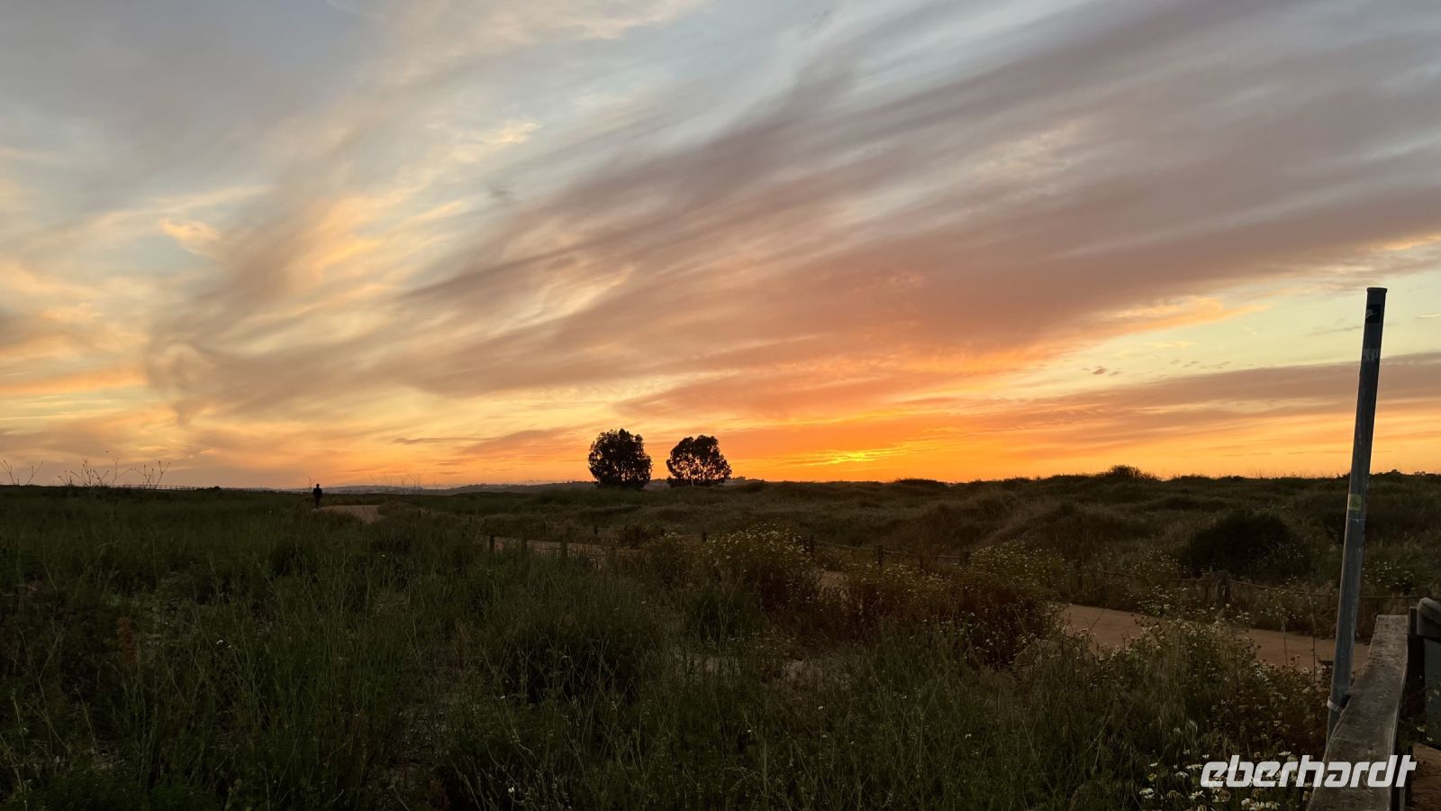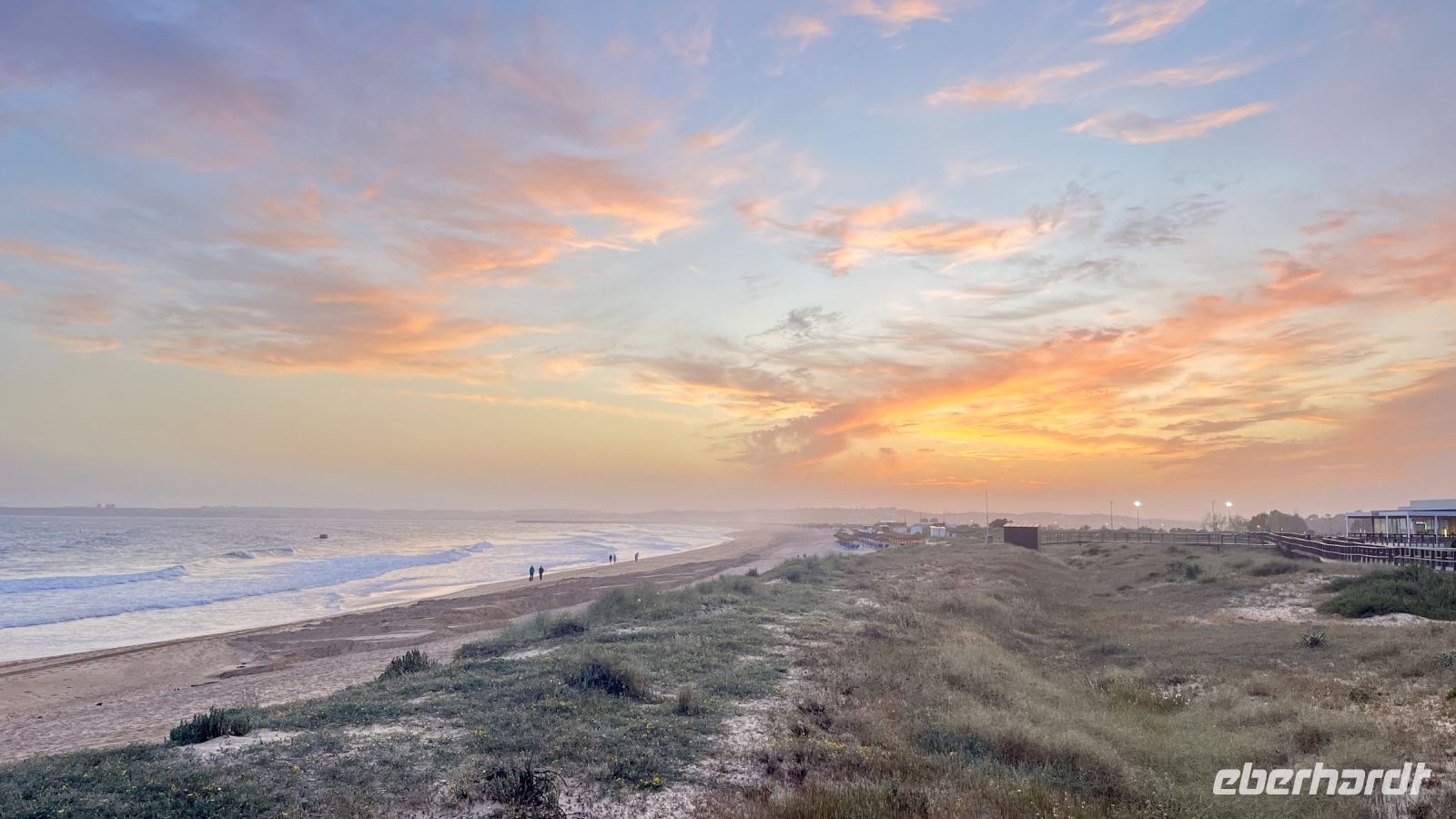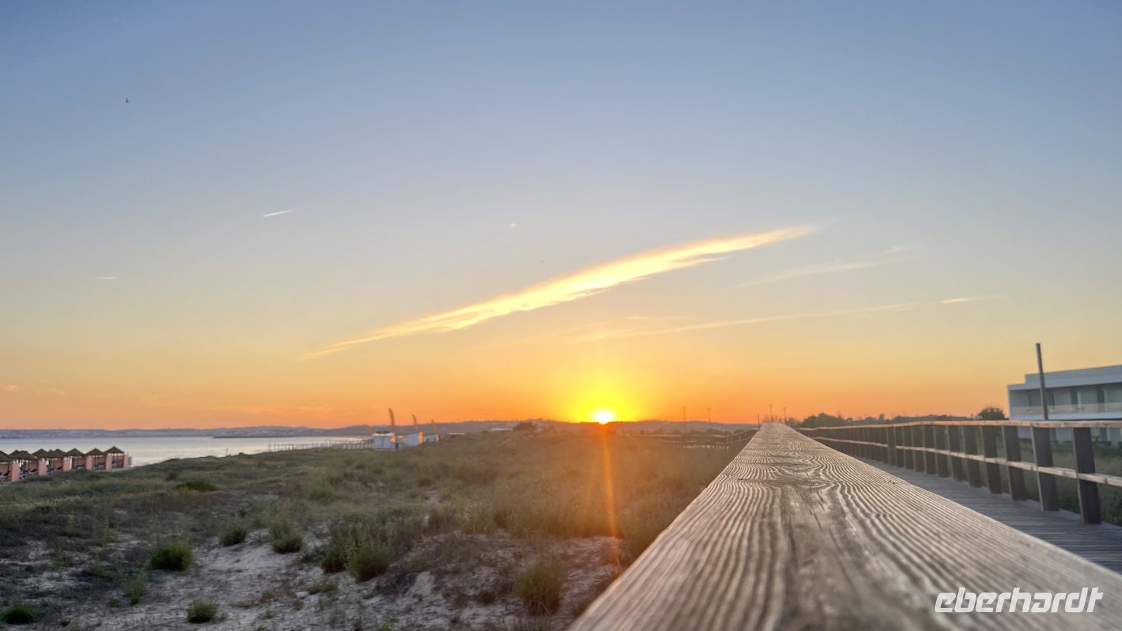Es war ein angenehmer Wetterkontrast, denn bei unserer Ankunft in Faro erwartete uns strahlender Sonnenschein, der uns sofort in den Sommer entführte und den in anderen Breitengraden noch beginnenden Frühling hinter sich ließ. Im Hotel am Rande des Ortes Alvor traf sich die gesamte Gruppe zum ersten Mal. Wie auf jeder langen Reise haben wir die Gurte unserer Rucksäcke angepasst, und so machten wir uns mit größerem Komfort auf den Weg, um uns gegenseitig kennenzulernen und das Abendessen vor der Kulisse unseres ersten Sonnenuntergangs zu genießen.