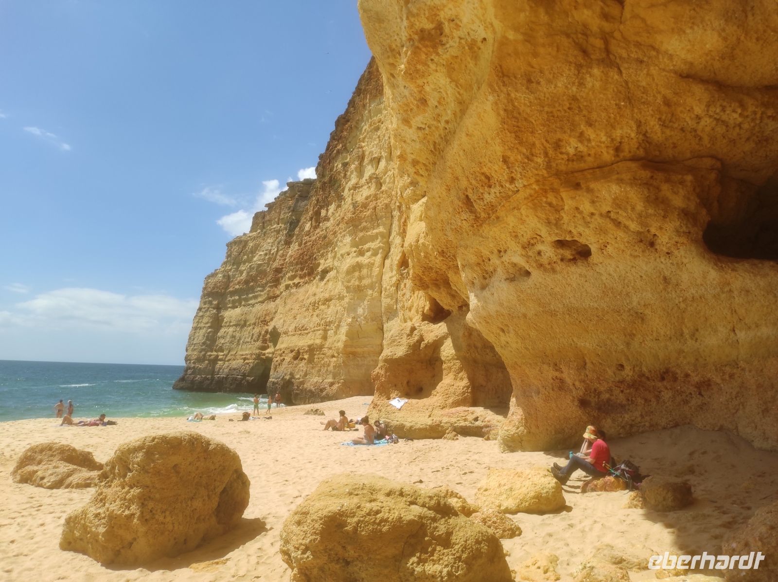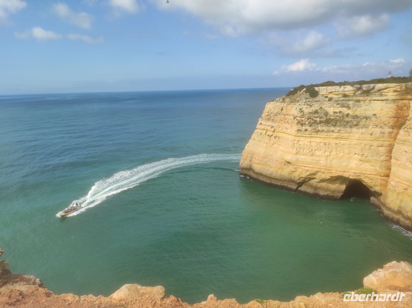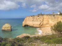 Wahnsinn so schnell vergeht die Zeit, der offizielle letzte Wandertag ist angebrochen. Heute ging es bei bestem Wetter von den Klippen der Kapelle von „Senhora da Rocha“ bis nach „Carvoeiro“. Entlang der schroffen Felsklippen ging es Richtung Osten, nach etwa der Hälfte der Strecke erreichten wir die Erste von vielen sehenswerten Grotten und Felsenbogen im Meer auf unsere Wanderung. Dieser Wanderweg ist sehr beliebt und wir waren nicht die alleine ! Für mich war dieser Tag ein sehr schöner Abschluss der Wanderreise , spiegelte er doch vieles von dem wieder, was wir schon gesehen hatten . In dem kleinen Ort Miradouro do Vale Suspenso war die schönste Pause hier. Wir hatten die Möglichkeit noch einmal zur Freizeit . Einige gönnten sich ein Kaltgetränk und andere nutzen das schöne Wetter um in der geschützten Bucht im Atlantik bei auflandigem Wasser (Flut) zu schwimmen !