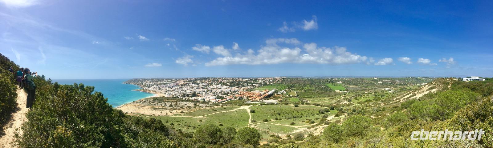 Nach unserem Frühstück sind wir heute gemeinsam nach Burgau, einem kleinen stimmungsvollen Küstenort im Südwesten der Algarve, aufgebrochen. Hier lag unser Ausgangspunkt für unsere heutige Wanderung. Gemeinsam haben wir diese wunderschöne Ortschaft durchquert bis wir an die kleine bezaubernde Meeresbucht gekommen sind. Von dort aus gelangten wir auf einen Klippenpfad der uns oberhalb der beeindruckenden Steilküste zwischen Burgau und Luz entlangführte. Weiter ging es über eine aussichtsreiche Anhöhe und entlang der Sandstein-Klippen, die hier zwar nur 15 m hoch sind, dennoch durch ihre Terrakotta-gefärbten Felsformationen beeindruckten. Die Hälfte der heutigen Etappe ist geschafft, als wir Luz erreichen. Wir belohnen uns mit einer Kugel Eis und einer Pause die uns durch eine kleine musikalische Darbietung eines Straßenkünstlers für einen Moment die Zeit vergessen lässt. Gestärkt ging es für uns anschließend weiter über den Torre de Atalaia nach Porto de Mós. Unser Weg führte uns entlang der belebten Uferpromenade und anschließend ein Stück von der Küste weg. Kurz nach Luz haben wir schnell an Höhe gewonnen und den bereits von Luz aus sichtbaren Torre de Atalaia (109 m) bestiegen. Oben erwartete uns ein phantastischer Ausblick auf die Küste. Von dort aus ging es anschließend auf einen breiten Klippenpfad entlang der beeindruckenden Steilküste weiter. Das Zusammenspiel zwischen den Farben der Natur war insbesondere auf diesem Abschnitt ein Hochgenuss für unsere Augen - farbenfrohe Blumen auf grünen Wiesen, die terrakotta-gefärbten Klippen und im Hintergrund der türkisfarbene Atlantik. Mit wenigen Ab- und Anstiegen erreichten wir gefesselten von diesen Eindrücken unser heutiges Etappenziel die Bucht von Porto de Mós. Zum Ausklang dieses gelungen Tages besuchten wir im Anschluss noch den malerische Küstenort Lagos welchen jeder von uns, mit Blick auf seine eigenen Interessen, erkunden konnte bevor es am späten Nachmittag zurück zum Hotel ging.