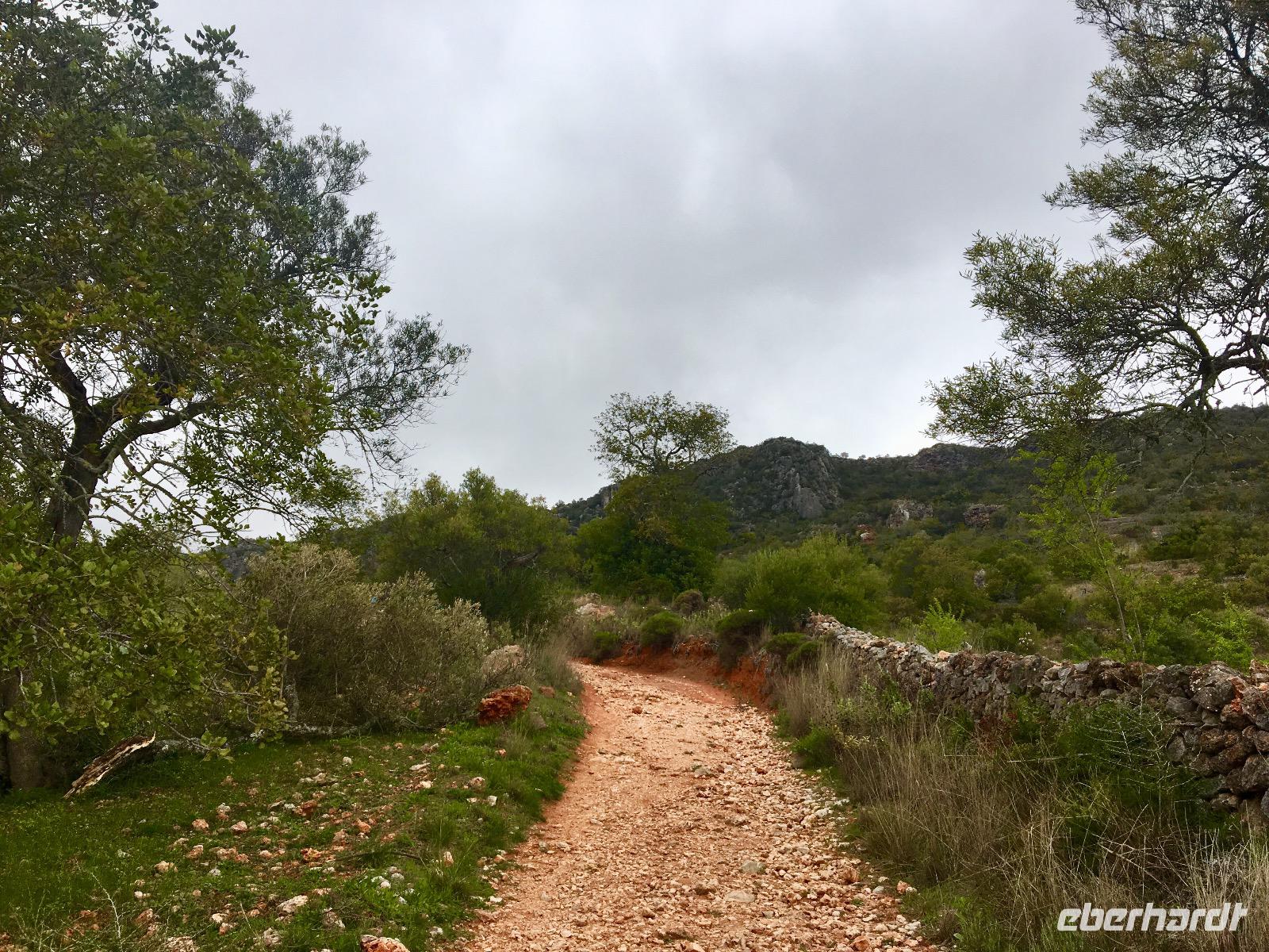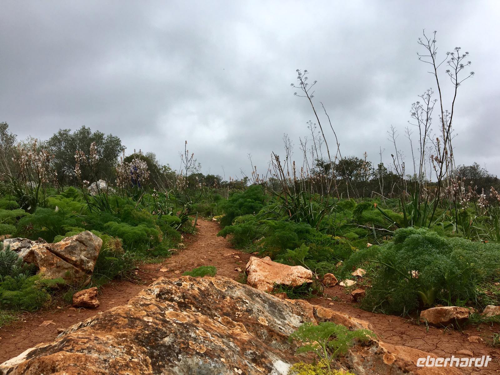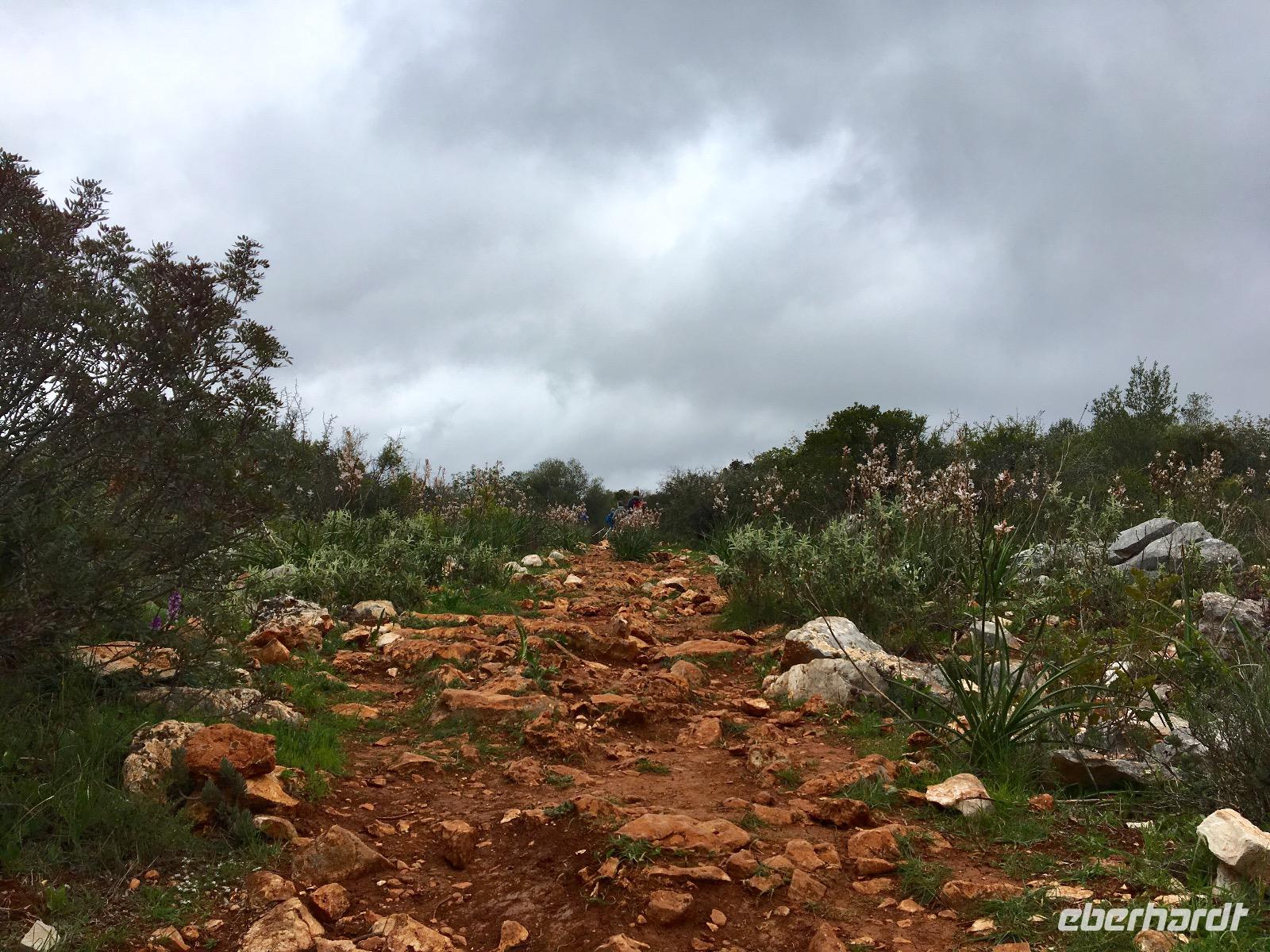 Ziel unserer heutigen Wanderung war der Tafelberg Rocha da Pena im gleichnamigen Naturschutzgebiet. Doch zuvor machten wir noch einen kleinen Abstecher in die traditionelle Marktstadt Loulé, wo wir die von den Mauren inspirierte Markthalle besuchten um uns mit lokalen Spezialitäten einzudecken. Anschließend ging es zum Ausgangspunkt unserer Rundwanderung weiter. Zunächst führte uns der Weg über einen steilen Anstieg, entlang an Oliven und Feigenbäumen, in Richtung einer eindrucksvollen Plateauhochfläche. Von hier aus sind wir zunächst zum Miradouro Norte, einem nahe gelegenen Aussichtspunkt, gegangen. Hier hatten wir die Möglichkeit die Ausläufer der Serra do Caldeirão überblicken zu können. Anschließend sind wir zurückgegangen und haben den Weg Richtung Hochebene eingeschlagen. Hier wanderten wir auf einem schmalen Pfad durch dichte Macchienlandschaft. Auffällig war hier insbesondere die große Anzahl an hohen wilden Fenchelbüschen. Bald darauf erreichten wir die Überreste einer langen Steinmauer, die im Mittelalter als Verteidigungsmauer verwendet wurde. Nach dem Steinwall führte uns der Weg in leichtem Anstieg auf einen breiten Pfad über die Hochebene. Hier abzweigend gelangten wir auf einem schmalen Pfad zum Gipfel Talefe (480 m). Leider konnten wir aufgrund der heutigen Wetterbedingungen den Blick ins Tal nicht genießen, was unserer Wanderstimmung aber kein Abbruch tat. Vom Gipfel sind wir dann in das kleine verschlafene Dorf Penina abgestiegen, wo wir kurz danach unsere Wanderung für heute beendeten. Anschließend sind wir noch in die kleine Ortschaft Alte gefahren, wo wir uns bei einem Stück Kuchen und einer Tasse Kaffee von den Strapazen des Wanderer-Daseins erholen konnten, bevor wir unseren Heimweg ins Hotel antraten.