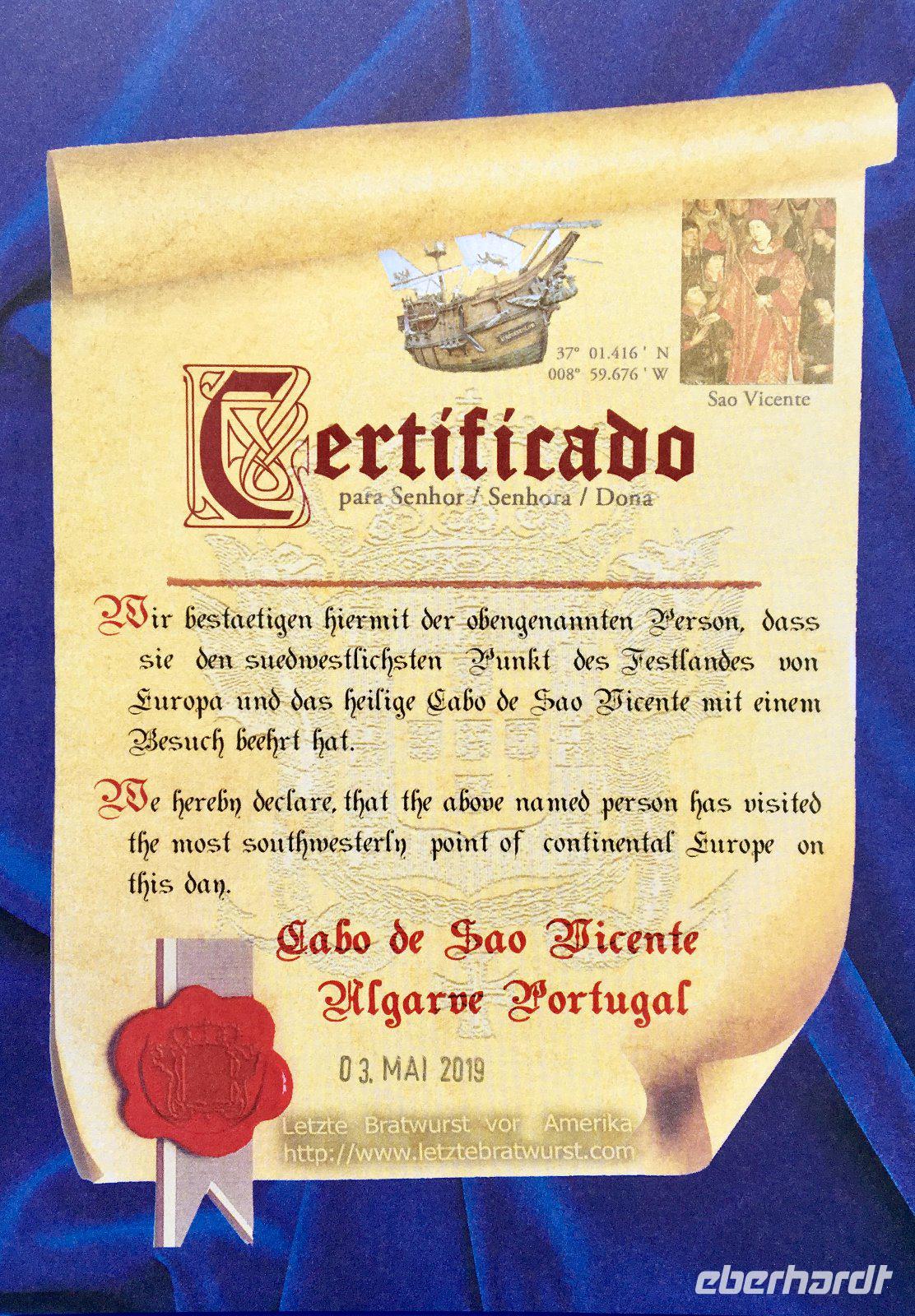 Nach einem ausgiebigen Frühstück ging es pünktlich um 9:00 Uhr mit unserer Reiseleiterin Lina los und wir machten uns im Kleinbus auf den Weg nach Raposeira, unserem Ausgangspunkt für unsere erste Wanderung an der Algarve. Die Algarve - die südlichste Region Portugals - umfasst eine Fläche von rund 5000 km², was ca. 5,6% der Landesfläche ausmacht. Einen ersten wunderbaren Eindruck über die Schönheit dieser Region bekamen wir bereits auf unseren Weg Richtung Raposeira. Dort angekommen führte uns der erste Teil unserer Wanderung durch ein landschaftlich sehr schönes Tal, welches für die ersten 6 km über einen Sand- bzw. Schotterweg, mehr als entschädigte. Bald änderte sich der Weg in eine Art kunstvoll gepflasterte Straße, auf der wir dann in den Talgrund in Richtung Praia do Barranco, einem kleinen, geschlossenen Strand wanderten. Hier angekommen suchten wir uns ein schönes Plätzchen und machten eine längere Rast. Gestärkt führte uns unser Weg dann wieder ins Landesinnere, wo uns ein schmaler Trampelpfad auf die Klippen brachte. Auf der Hochebene - zum Atlantik begrenzt durch ca. 70-80 m steil abfallende Felsen - eröffnete sich uns ein atemberaubender Blick aufs Meer. Entlang der romantisch-wilden Küstenlinie mit ihrer kleinwüchsigen Vegetation und dem Duft von Thymian und Lavendel in der Nase gelangten wir nach weiteren 6 km zum Praia do Martinhal, wo wir unsere heutige Wanderung beendeten. Nach einer ausgiebigen Kaffeepause in Sagres brachte uns unser Bus zum letzten Highlight an diesem Tag - zur letzten Bratwurst vor Amerika, oder wie die Reiseführer es betiteln würden, zum Cabo de São Vicente, dem südwestlichsten Punkt Europas.