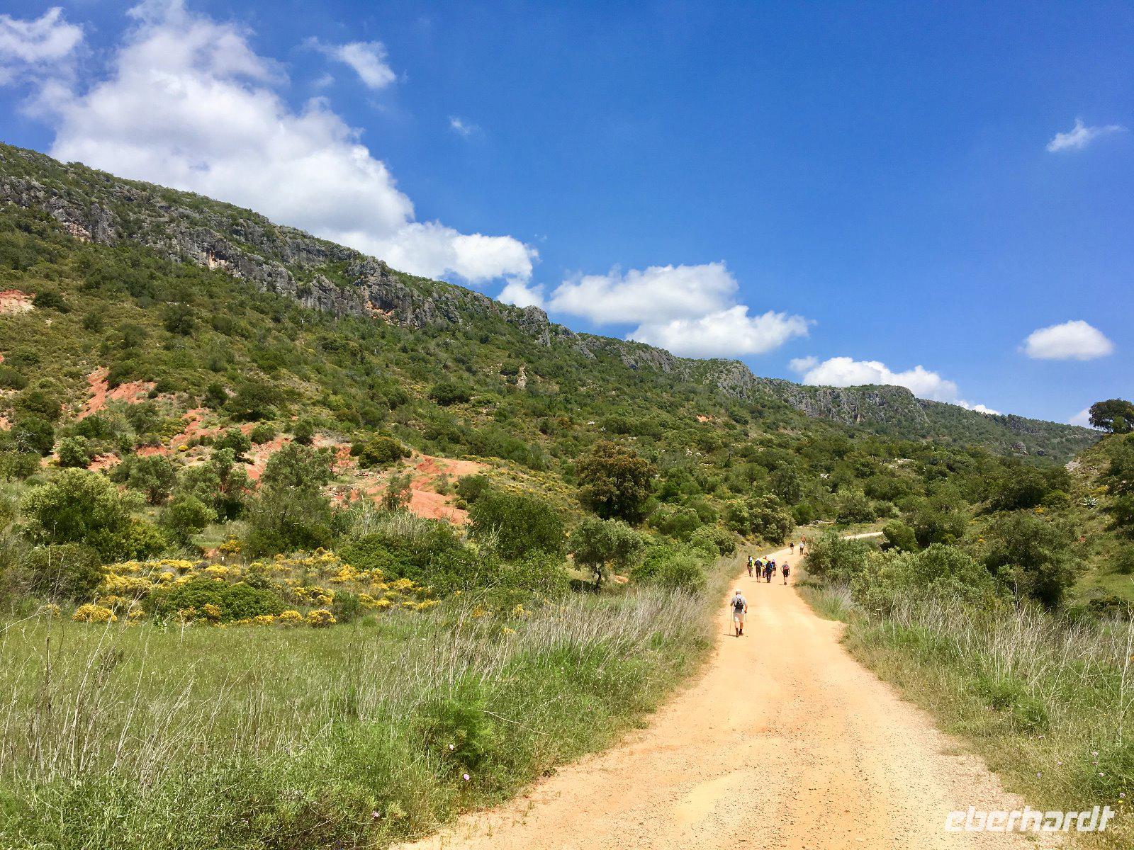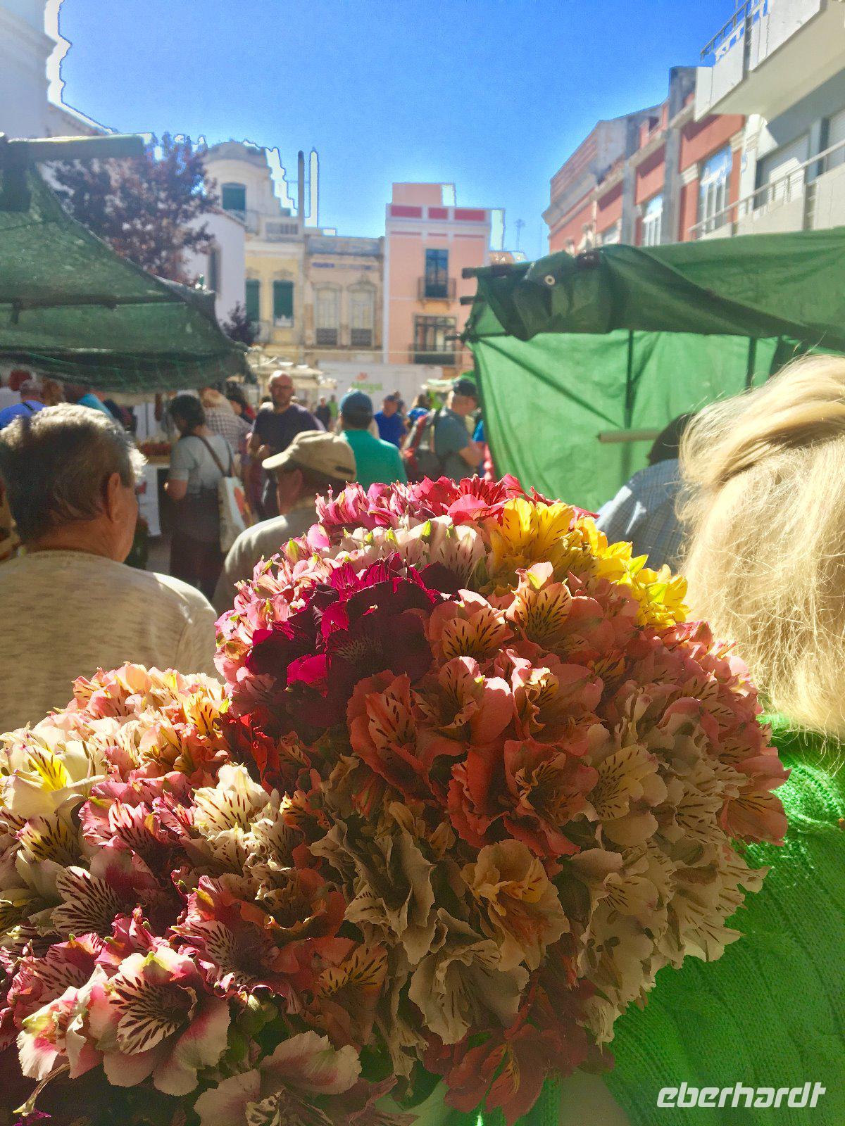 Der Rocha da Pena (ein Tafelberg), gelegen im gleichnamigen Naturschutzgebiet, befindet sich im Hinterland der Algarve und war das heutige Ziel unserer Wanderung. Doch zuvor machten wir noch einen kurzen Abstecher in die kleine Stadt Loulé, wo wir neben der von den Mauren inspirierten Markthalle auch den hiesigen Bauernmarkt besucht haben um uns mit leckeren portugiesischen Spezialitäten einzudecken. Anschließend ging es zum Ausgangspunkt für unseren heutigen Rundwanderweg. Auf einem breiten Erdweg ging es, entlang von Oliven- und Feigenbäumen, mit einem steilen Anstieg auf eine Hochebene. Schon beim hinaufgehen wurden wir mit einer wunderschönen Aussicht belohnt. Unsere botanisch versierten Wanderer erfreuten sich zudem an der so abwechslungsreichen Vegetation, die unseren Weg säumte. Auf 479 m Höhe angekommen konnten wir nicht nur die weite Aussicht über das Umland genießen, sondern auch noch über einen abzweigenden Wanderpfad Richtung Norden zu einem weiteren Aussichtspunkt wandern, der uns eine fantastische Sicht in Richtung Serra de Caldeirão ermöglichte. Der Weg dorthin gab uns zudem einen wunderbaren Einblick in die hier vorkommende vielfältige Flora und Fauna, immer wieder unterbrochen von Geröllhalden und Felsformationen. Zurück auf unserem Rundwanderweg ging es in westlicher Richtung weiter zum Gipfel dieses Bergmassivs. Noch auf der Hochebene entdeckten wir einen interessanten Steinwall, ein Relikt vermutlich noch aus der Eisenzeit stammend. Nach einer entspannten Wanderpause führte uns der Weg langsam wieder hinab, durch das verschlafene Dorf Penina und von dort aus über eine breite Sandstraße, die uns unterhalb des Bergmassivs wieder zu unserem Ausgangspunkt zurückführte. Zum Abschluss des Tages fuhren wir für unsere obligatorische Kaffeepause noch in die kleine Ortschaft Alte, wo wir uns bei einem Stück Kuchen und einer Tasse Kaffee von den Strapazen des Wanderer-Daseins erholen konnten, bevor wir gestärkt und glücklich von den Eindrücken des Tages unseren Heimweg ins Hotel antraten.