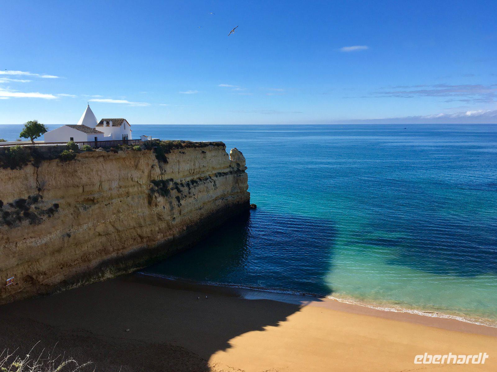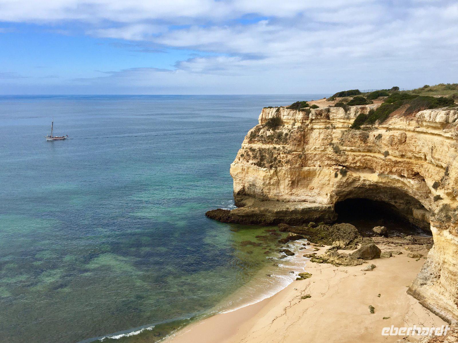 Unsere letzte Wanderung führt uns erneut entlang der Felsküste. Doch wer meint das könnte ja langsam eintönig werden, der irrt. Denn die heutige Klippenwanderung ist wohl eine der schönsten Wanderungen, die man hier an der Algarve machen kann. Heute führte uns der Weg ganz in der Nähe unseres Hotels, von Senhora da Rocha zum Leuchtturm von Alfanzina. Knapp acht Kilometer entlang steiler Felsklippen und Buchten sind einfach etwas Besonderes und lassen unser Wanderherz ein letztes Mal höher schlagen. Das Meer zu unserer Linken wanderten wir fast immer direkt entlang der Küstenlinie und nahe der Abruchkante, die zum Teil durch steile Ab- und Anstiege geprägt waren. Besonders beeindruckend waren sowohl die mit Nischen und Grotten durchbrochenen pittoresken, gelb leuchtenden Felswände als auch die feinsandigen Strände und abgelegenen Buchten mit smaragdgrünem Wasser. Bei dieser heute so reizvollen Landschaft legten wir immer wieder Fotostopps ein, um die vielen Postkartenmotive die sich uns boten, mit unseren Kameras festzuhalten. Nach gut vier Stunden erreichten wir erschöpft aber glücklich den Leuchtturm von Alfanzina. Zum Abschluss dieses herrlichen Tages fuhren wir noch in das lebhafte Zentrum von Carvoeiro, wo uns unsere Reiseleiterin Lina die wohl beste Eisdiele des Ortes zeigte. Nach einer großen Portion Eis ging es für uns zurück zum Hotel, wo wir Abschied von Lina nehmen mussten. Und so endete unser letzter Wandertag für die meisten von uns wohl mit einem lachenden und einem weinenden Auge.