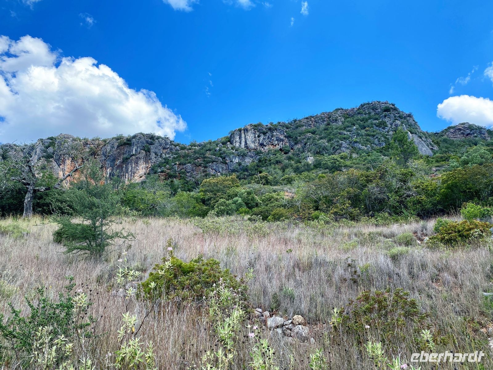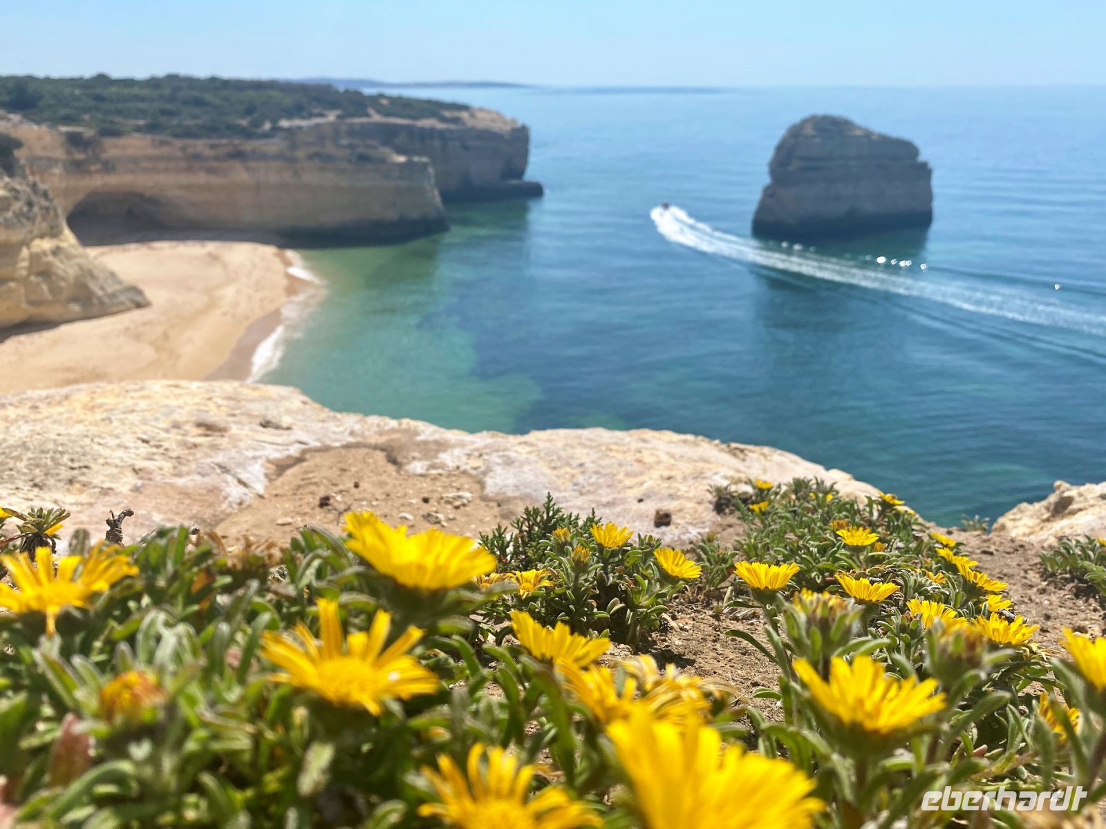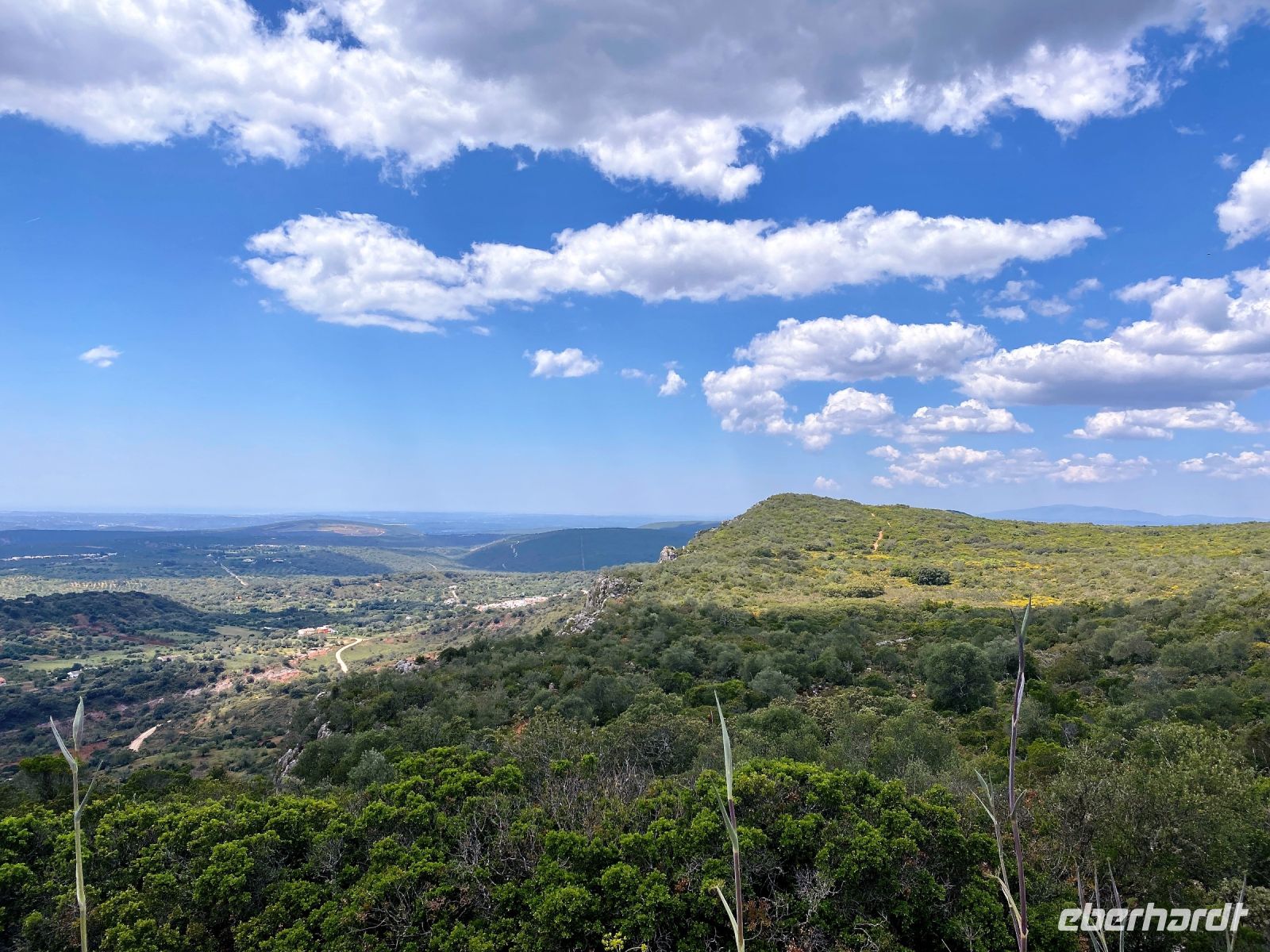 Unsere erste Wanderung führt uns heute in den Naturpark Rocha da Pena und somit ins Hinterland der Algarve. Doch zuvor machen wir noch einen kurzen Abstecher in die kleine Stadt Loulé. Für die fast ausschließlich von Landwirtschaft lebenden Bewohner des Umlandes ist die Loulé wichtigster Marktort und so lassen wir es uns natürlich nicht nehmen, der schönen neomaurischen Markthalle an der Prachtstraße Praça da República einen Besuch abzustatten, um uns dort mit leckeren portugiesischen Spezialitäten für den Tag einzudecken. Anschließend geht es für uns zum Ausgangspunkt für unseren heutigen Rundwanderweg. Auf einem breiten Erdweg geht es zunächst, entlang von Oliven- und Feigenbäumen, mit einem steilen Anstieg auf eine Hochebene. Schon beim hinaufgehen werden wir in mehrfacher Hinsicht belohnt – zum einen mit einer wunderschönen Aussicht und zum anderen mit der bunten und abwechslungsreichen Blumenpracht entlang unseres Weges. Bereits heute sind wir von der floralen Vielfalt der Algarve im Frühling absolut fasziniert und wir sind uns einig, dass diese Jahreszeit in Portugal wohl die schönste Zeit zum Wandern ist, und so genießen wir jeden einzelnen Schritt. Auf dem Hochplateau angekommen werden wir für alle Mühen mit einem fantastischen Rundumblick belohnt. Dann folgen wir einem abzweigenden Wanderpfad Richtung Norden zu einem weiteren Aussichtspunkt, der uns eine fantastische Sicht in Richtung Serra de Caldeirão ermöglicht. Der Weg dorthin gibt uns zudem einen Einblick in die hier vorkommende vielfältige Flora und Fauna, immer wieder unterbrochen von Geröllhalden und Felsformationen. Zurück auf unserem Rundwanderweg gehen wir in westlicher Richtung weiter zum Gipfel dieses Bergmassivs, wo wir eine entspannte Wanderpause einlegen bevor es für uns langsam wieder hinabgeht. Der Weg führt uns weiter durch das verschlafene Bergdorf Penina und von dort aus über eine breite Sandstraße, die uns unterhalb des Bergmassivs zurück zu unserem Ausgangspunkt führt. Glücklich über unsere heutige Leistung stoßen wir mit einer Kostprobe typisch portugiesischem Medronho-Likörs auf den ersten Wandertag an und genießen den Moment. Zum Abschluss des Tages fahren wir für eine kleine Kaffeepause in die kleine Ortschaft Alte, wo wir uns bei einer Tasse Kaffee und frisch gepresstem Orangensaft von den Strapazen des Wanderer-Daseins erholen, bevor wir gestärkt und glücklich von den Eindrücken des Tages unseren Heimweg ins Hotel antreten.