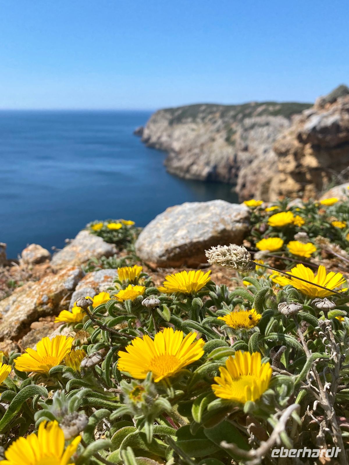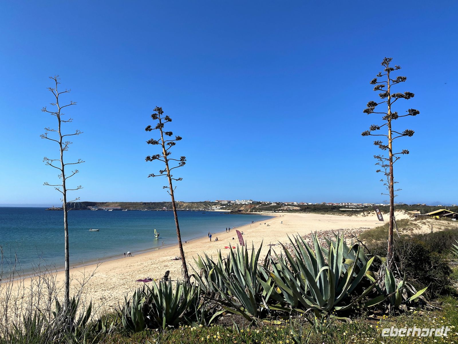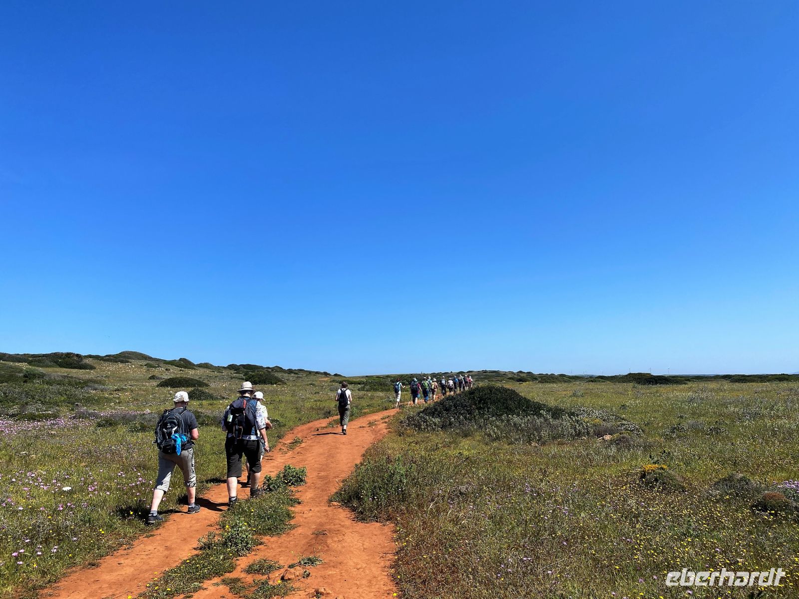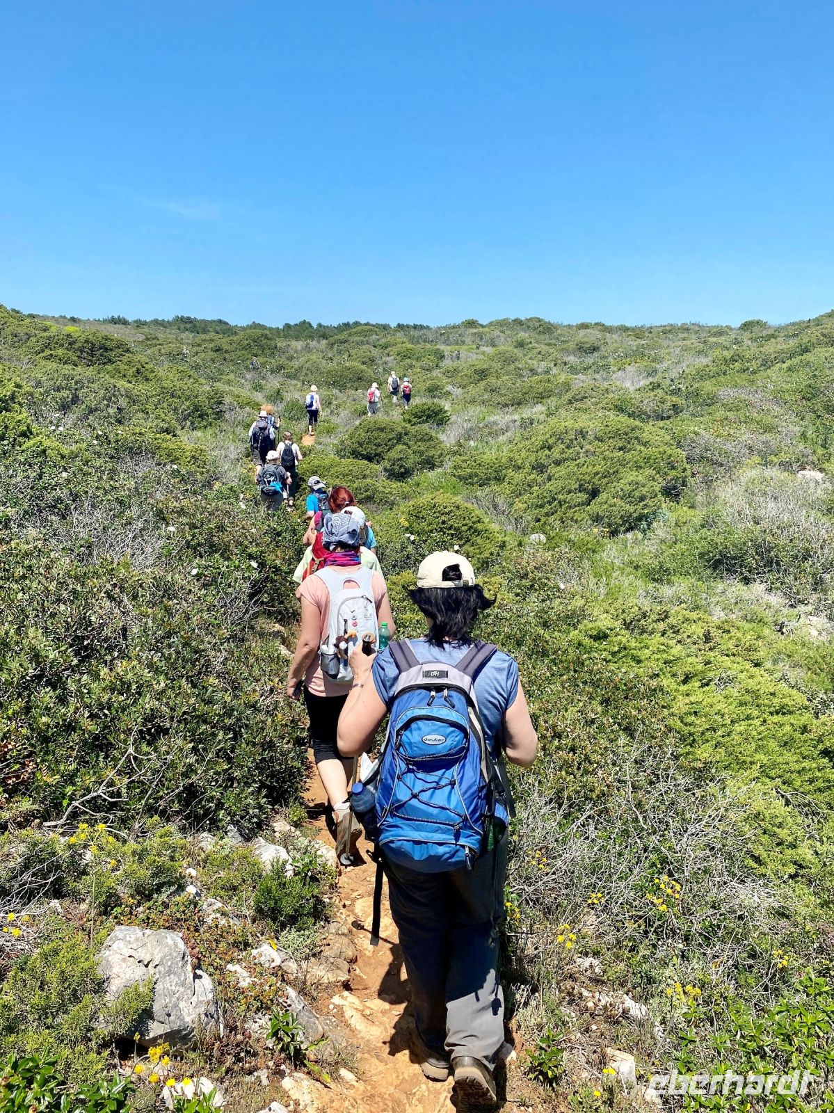 Pünktlich um 9:00 Uhr startet unser zweites Abenteuer am heutigen Tag. In unserem Bus machen wir uns auf den Weg zu unserem Ausgangspunkt, dem Strand von Martinhal. Dort angekommen führt uns die Wanderung oberhalb der Steilküste, die uns immer wieder einen phantastischen Ausblick auf die umgebene Landschaft und den Atlantik bietet. Entlang der romantisch-wilden Küstenlinie mit ihrer kleinwüchsigen, farbenfrohen und duftenden Vegetation und der ein oder anderen endemischen Art gelangen wir nach 6 km zum abgelegenen Surferparadies Praia do Barranco. Der Strand liegt in einer wunderschönen rund geformten Bucht, ist nicht lang, dafür aber sehr breit und gibt uns die Möglichkeit für eine kleine Pause. Gestärkt geht es anschließend noch ca. 4 km weiter bis zum Strand von Ingrina, wo wir unsere heutige Wanderung beenden. Hier bietet sich für einige von uns die Gelegenheit einer willkommenen Abkühlung im Atlantik, während die anderen sich mit einem Kaffee oder kalten Bier stärken. Nach dieser erholsamen Pause treffen wir uns alle am Bus wieder, um gemeinsam zu unserem nächsten Höhepunkt aufzubrechen – dem südwestlichsten Punkt des europäischen Festlandes, oder dem Ende der Welt? Am Cabo de São Vicente angekommen haben wir etwas Zeit zur freien Verfügung. Während die einen die „letzte Bratwurst vor Amerika“ genießen, erfreuen sich andere an der atemberaubenden Aussicht über den Atlantik. Zudem finden wir hier auch den lichtstärksten Leuchtturm des Kontinents. Er steht auf einem 100 m langen, 37 m breiten und 60 m hohen Felsplateau und ist ein weiteres schönes Fotomotiv für unsere persönlichen Erinnerungen. Nach diesen tollen Eindrücken treten wir unseren Heimweg zum Hotel an, wo wir diesen gelungenen Wandertag bei einem gemeinsamen Abendessen ausklingen lassen.