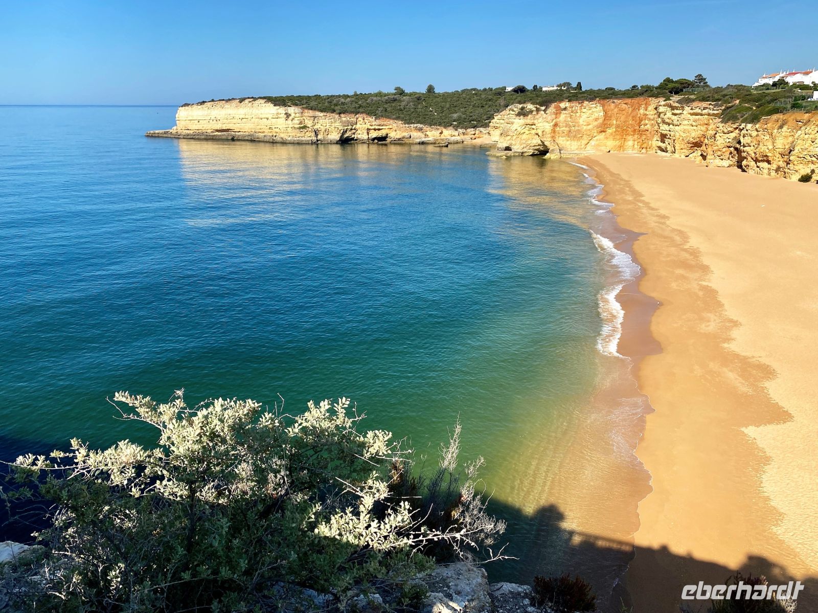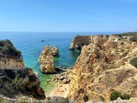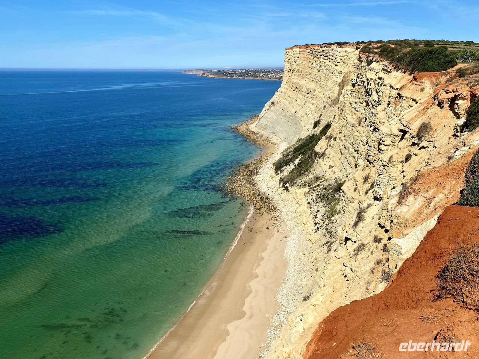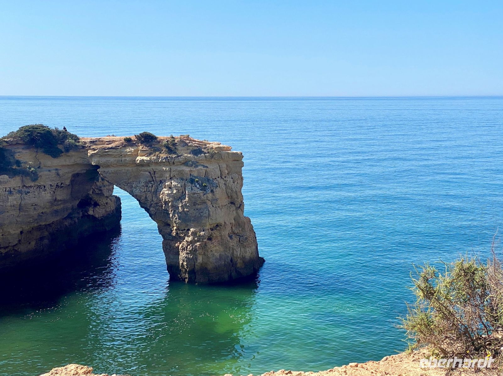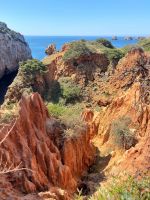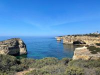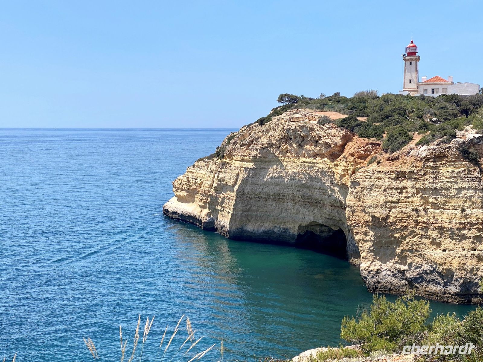 Die Felsküste der Algarve zählt wohl zu den eindrucksvollsten Küstenformationen Europas und ist das Ziel unseres vorletzten Wandertages. Heute führt unser Weg von Senhora da Rocha bis zum Leuchtturm von Alfanzina. Das ganze knapp zehn Kilometer und bei über 25°C entlang steiler Felsklippen und Buchten. Die Küstenlinie zu unserer Linken wandern wir entlang gut markierter Wege, die zum Teil durch steile Ab- und Anstiege geprägt sind. Besonders beeindruckend sind heute die an der Steilküste ockerfarbenen und rotbraunen Felsen, die spektakuläre und bizarre Erosionsformen aufweisen, wodurch uns immer wieder eine besonders reizvolle Landschaft entgegentritt. Trotz der warmen Temperaturen lassen wir es uns nicht nehmen immer wieder Fotostopps zu machen, um den wunderschönen Blick über die von Felsen eingeschnittene Küstenlinie, an der man unterschiedliche geomorphologische Formen wie Bögen, Grotten und auch Wasserhöhlen bewundern kann, für unsere Erinnerungen festzuhalten. Nach gut vier Stunden erreichen wir erschöpft aber glücklich den Leuchtturm von Alfanzina. Zum Abschluss dieses herrlichen Tages fahren wir noch in das lebhafte Zentrum von Carvoeiro, wo unsere Reiseleiterin Lina uns die wohl beste Eisdiele des Ortes zeigt und wir uns zur Belohnung des Tages eben ein solches gönnen. Das war sicher heute ein Tag sowohl für die Augen als auch den Gaumen.