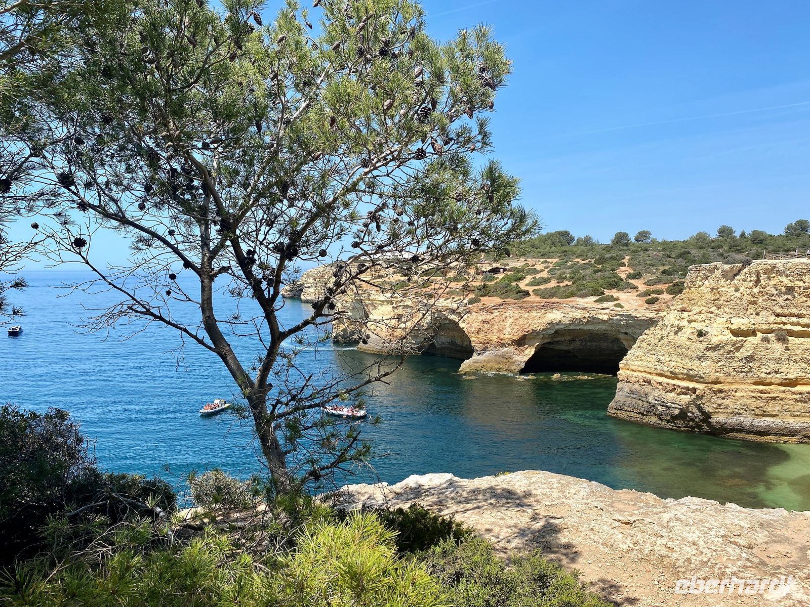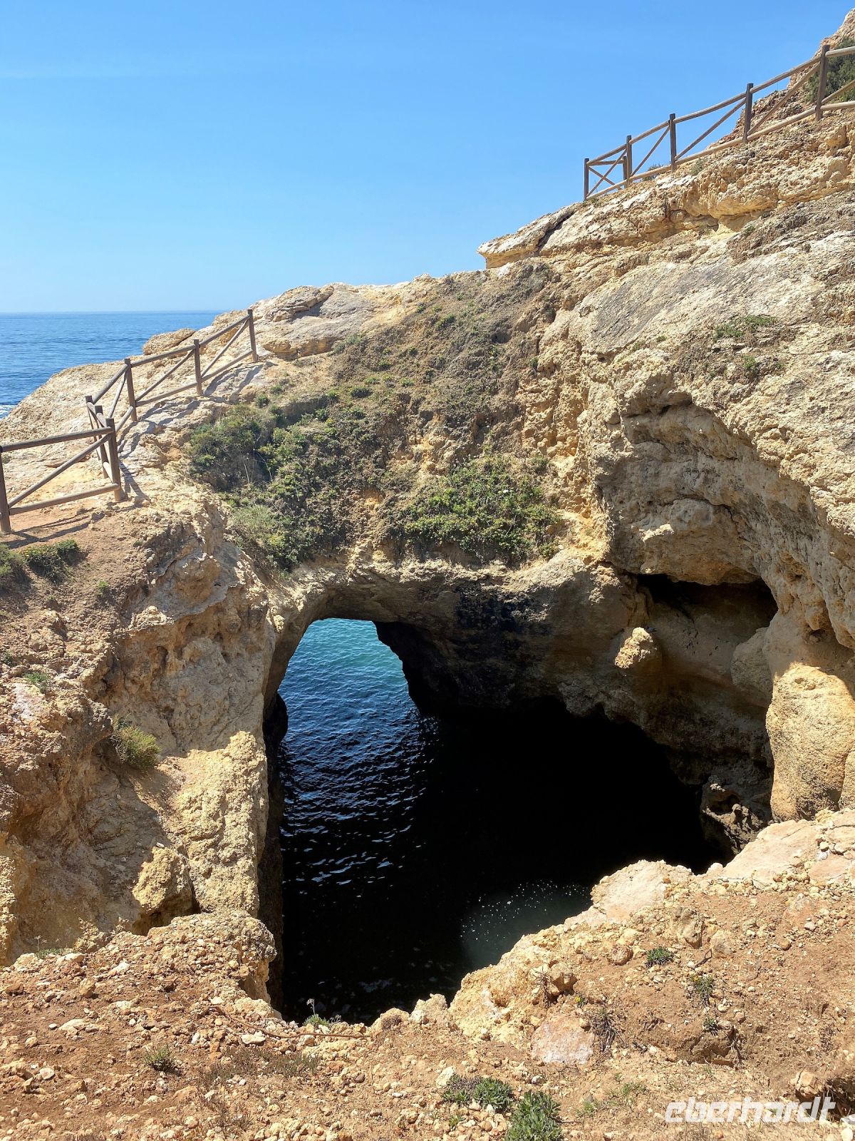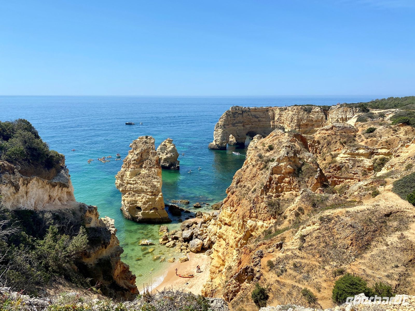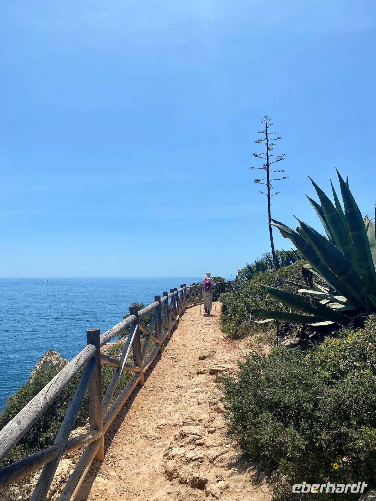 Die Felsküste der Algarve zählt wohl zu den eindrucksvollsten Küstenformationen Europas und ist das Ziel unseres vorletzten Wandertages. Heute führt unser Weg von Senhora da Rocha bis zum Leuchtturm von Alfanzina. Das ganze knapp zehn Kilometer und bei über 25°C entlang steiler Felsklippen und Buchten. Die Küstenlinie zu unserer Linken wandern wir entlang gut markierter Wege, die zum Teil durch steile Ab- und Anstiege geprägt sind. Besonders beeindruckend sind heute die an der Steilküste ockerfarbenen und rotbraunen Felsen, die spektakuläre und bizarre Erosionsformen aufweisen, wodurch uns immer wieder eine besonders reizvolle Landschaft entgegentritt. Trotz der warmen Temperaturen lassen wir es uns nicht nehmen immer wieder Fotostopps zu machen, um den wunderschönen Blick über die von Felsen eingeschnittene Küstenlinie, an der man unterschiedliche geomorphologische Formen wie Bögen, Grotten und auch Wasserhöhlen bewundern kann, für unsere Erinnerungen festzuhalten. Nach gut vier Stunden erreichen wir erschöpft aber glücklich den Leuchtturm von Alfanzina. Zum Abschluss dieses herrlichen Tages fahren wir noch in das lebhafte Zentrum von Carvoeiro, wo unsere Reiseleiterin Lina uns die wohl beste Eisdiele des Ortes zeigt und wir uns zur Belohnung des Tages eben ein solches gönnen. Das war sicher heute ein Tag sowohl für die Augen als auch den Gaumen.