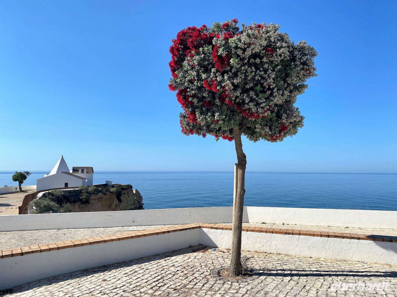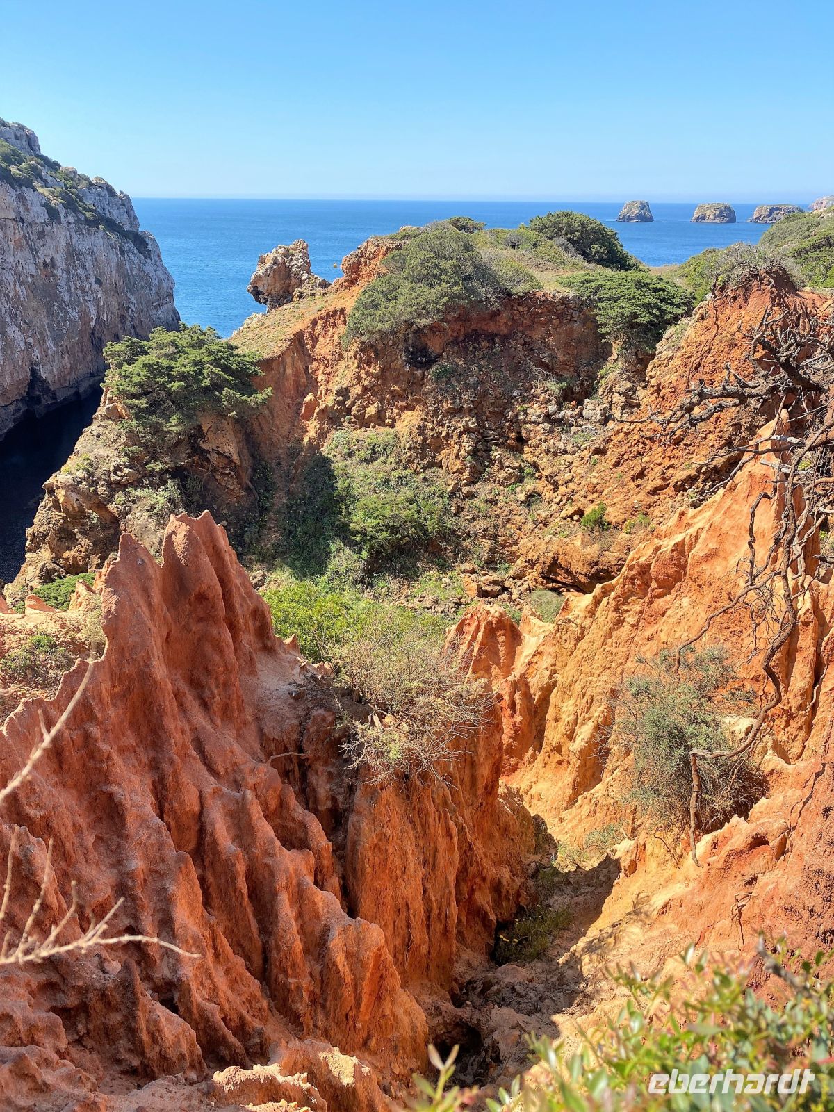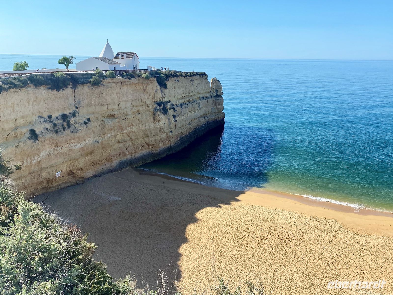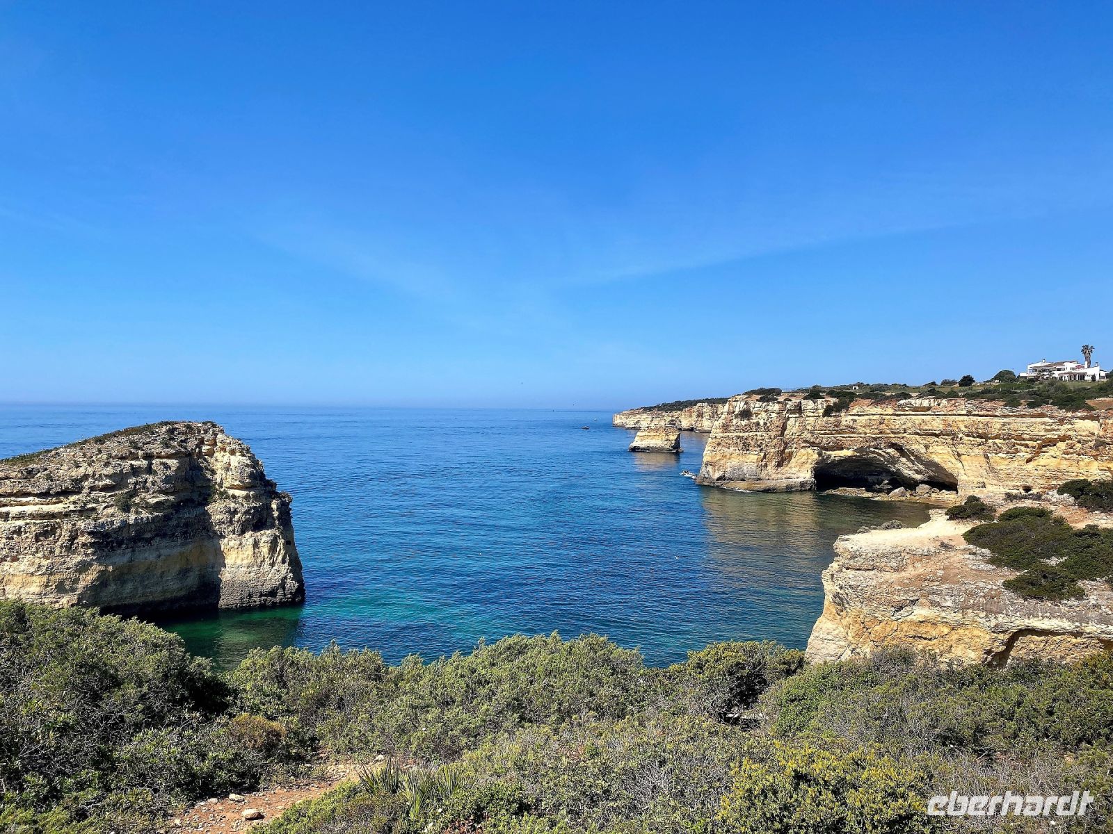Die Felsküste der Algarve zählt wohl zu den eindrucksvollsten Küstenformationen Europas und ist das Ziel unseres vorletzten Wandertages. Heute führt unser Weg von Senhora da Rocha bis zum Leuchtturm von Alfanzina. Das ganze knapp zehn Kilometer und bei über 25°C entlang steiler Felsklippen und Buchten. Die Küstenlinie zu unserer Linken wandern wir entlang gut markierter Wege, die zum Teil durch steile Ab- und Anstiege geprägt sind. Besonders beeindruckend sind heute die an der Steilküste ockerfarbenen und rotbraunen Felsen, die spektakuläre und bizarre Erosionsformen aufweisen, wodurch uns immer wieder eine besonders reizvolle Landschaft entgegentritt. Trotz der warmen Temperaturen lassen wir es uns nicht nehmen immer wieder Fotostopps zu machen, um den wunderschönen Blick über die von Felsen eingeschnittene Küstenlinie, an der man unterschiedliche geomorphologische Formen wie Bögen, Grotten und auch Wasserhöhlen bewundern kann, für unsere Erinnerungen festzuhalten. Nach gut vier Stunden erreichen wir erschöpft aber glücklich den Leuchtturm von Alfanzina. Zum Abschluss dieses herrlichen Tages fahren wir noch in das lebhafte Zentrum von Carvoeiro, wo unsere Reiseleiterin Lina uns die wohl beste Eisdiele des Ortes zeigt und wir uns zur Belohnung des Tages eben ein solches gönnen. Das war sicher heute ein Tag sowohl für die Augen als auch den Gaumen.