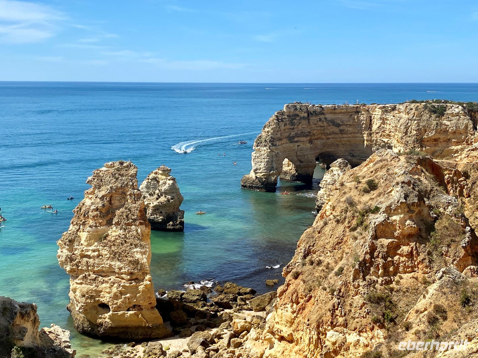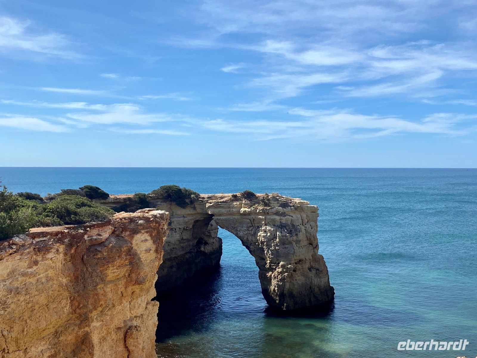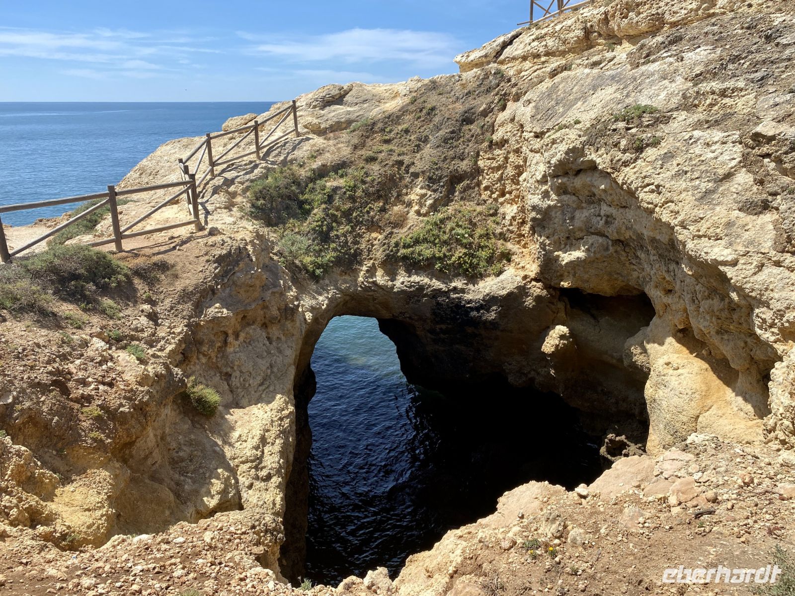 Unsere vorletzte Wanderung führt uns heute noch einmal entlang der Küste, in unmittelbarer Nähe zu unserem Hotel. Und auch wenn es auf dieser Reise mittlerweile unsere dritte Küstenwanderung ist, ist auch die heutige so ganz anders als die zwei vorherigen. Denn heute erwarten uns ganz bizarre Klippenformationen. Wie stumpfe Zähne recken sich auf diesem Küstenabschnitt, die von Wellen und Wind gegerbten Felsen, gelb und rot aus dem Blau des Ozeans empor. Sie formen sich zu Brücken und Toren über Strandbuchten hinweg und es schlängeln sich Sandsteinfelsen zwischen Land und Ozean Kilometerlang dahin. Das Ganze wird immer wieder von Buchten mit ihren feinpudrigen Sandstränden unterbrochen. Schon seit Urzeiten höhlt die Kraft des Meeres am Fuße der Klippen riesige Grotten in den weichen Sandstein, in denen die Brandung ein- und ausspült. Unser Ausgangspunkt ist Senhora da Rocha, von wo aus wir heute wieder etwas früher loslaufen, da auch am heutigen Tag Temperaturen von bis 31°C vorhergesagt sind. Unser Ziel ist der Leuchtturm von Alfanzina. Der Weg dazwischen erstreckt sich auf gut 10 Kilometern und führt uns von einer Bucht in die nächste, bergab – bergauf. Bei dieser heute so reizvollen Landschaft legen wir immer wieder Fotostopps ein, um die vielen Bilderbuchmomente die sich uns bieten, mit unseren Kameras festzuhalten. Nach gut vier Stunden erreichen wir erschöpft aber glücklich den Leuchtturm von Alfanzina. Zum Abschluss dieses herrlichen Tages fahren wir noch in das lebhafte Zentrum von Carvoeiro, wo uns unsere Reiseleiterin Lina die wohl beste Eisdiele des Ortes zeigt. Nach einer großen Portion Eis geht es dann aber zurück zum Hotel, wo ein weiterer faszinierender Wandertag mit vielen Eindrücken für uns endet. Da wir am Nachmittag aber noch ein wenig Zeit haben und die Wetterbedingungen heute so ideal sind, nutzen einige von uns noch die Möglichkeit eine unvergessliche Bootstour zu den beeindruckenden Grotten zu unternehmen. Die Fahrt beginnt am Strand direkt unterhalb unseres Hotels und bietet uns die Möglichkeit die am Vormittag von uns erwanderte Küstenlandschaft nun noch einmal von einer anderen Perspektive zu entdecken. Mit dem Boot über den glasklaren Atlantik genießen wir beeindruckende Meereshöhlen, geheimnisvolle Grotten und paradiesische Strände. Was für ein gelungener Abschluss für den Tag.