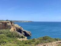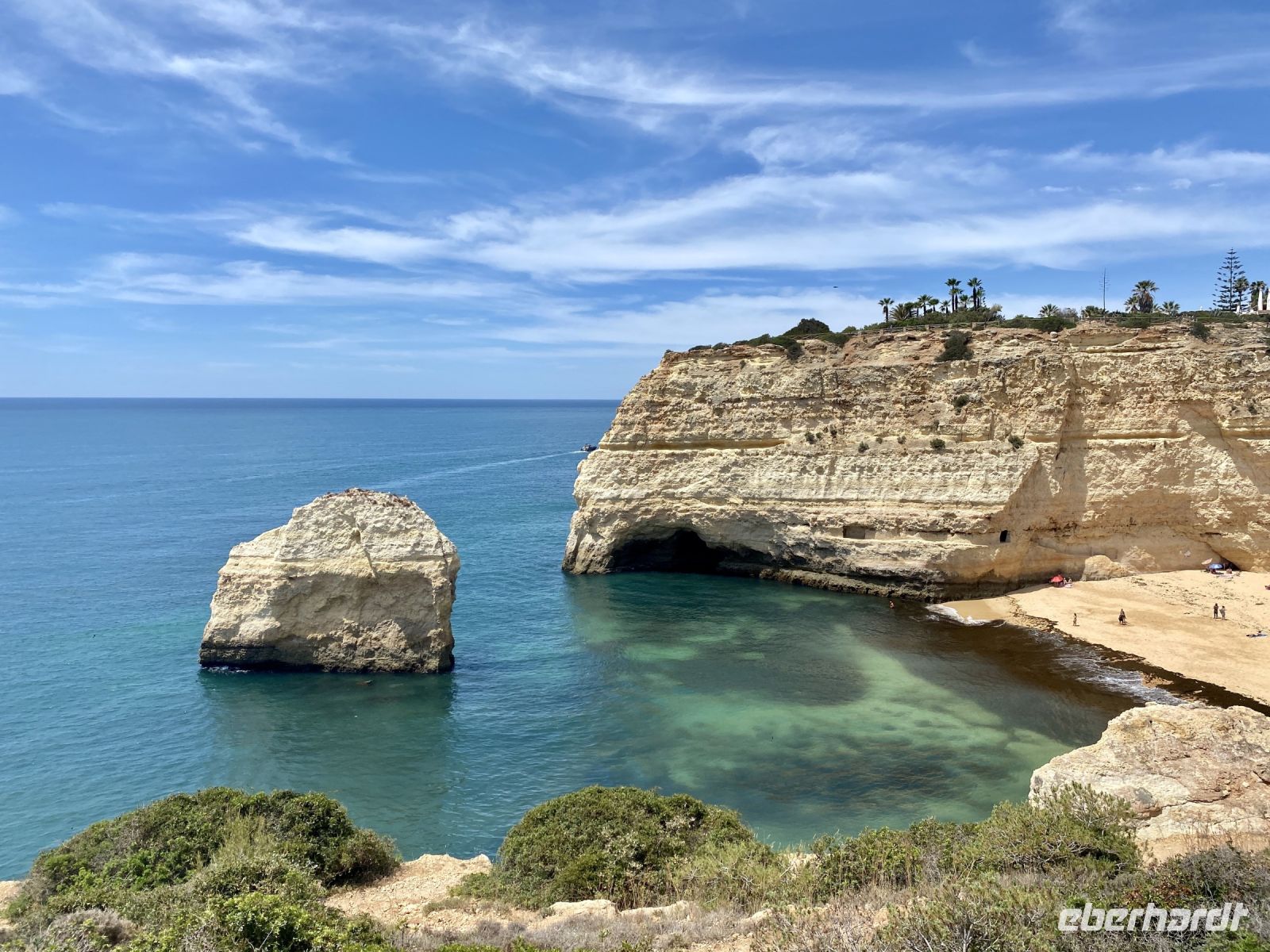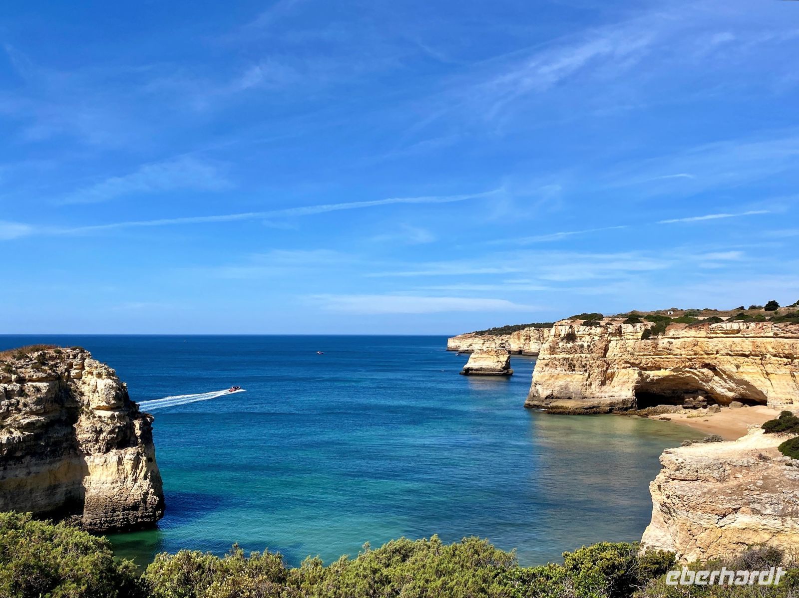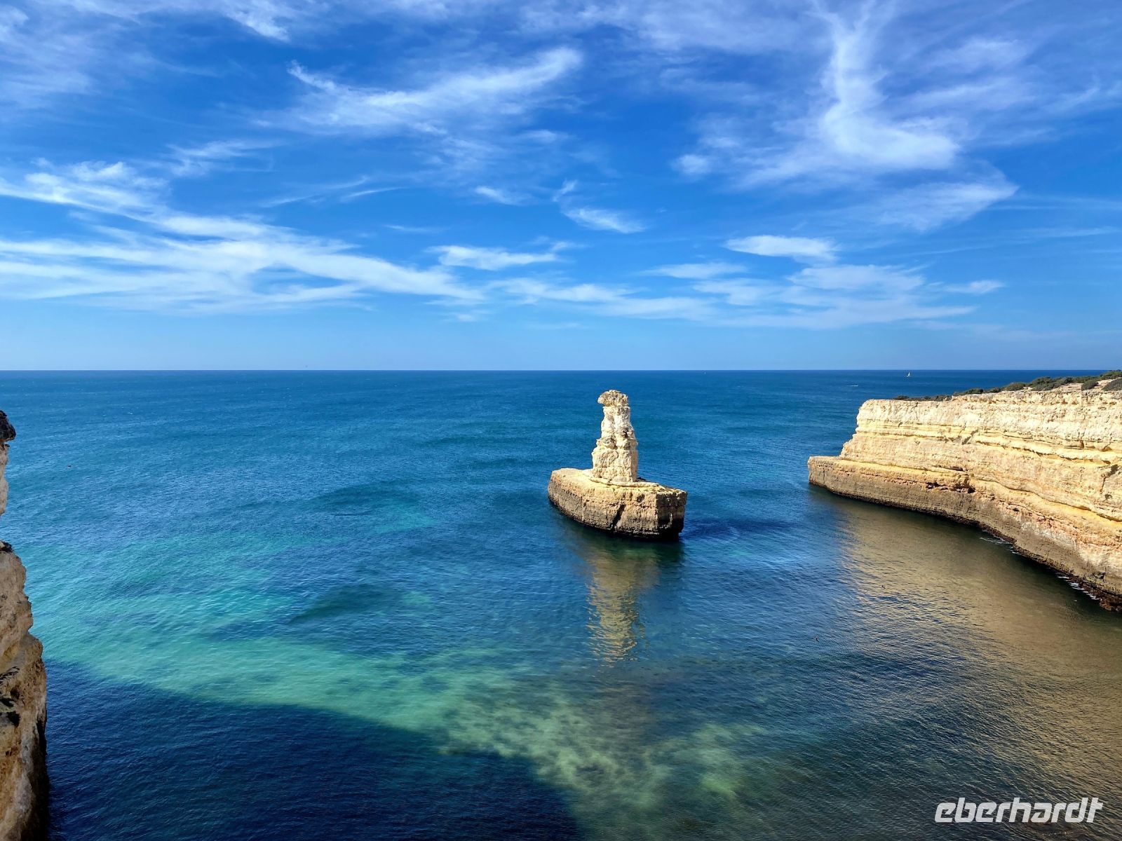 Unsere vorletzte Wanderung führt uns heute noch einmal entlang der Küste, in unmittelbarer Nähe zu unserem Hotel. Und auch wenn es auf dieser Reise mittlerweile unsere dritte Küstenwanderung ist, ist auch die heutige so ganz anders als die zwei vorherigen. Denn heute erwarten uns ganz bizarre Klippenformationen. Wie stumpfe Zähne recken sich auf diesem Küstenabschnitt, die von Wellen und Wind gegerbten Felsen, gelb und rot aus dem Blau des Ozeans empor. Sie formen sich zu Brücken und Toren über Strandbuchten hinweg und es schlängeln sich Sandsteinfelsen zwischen Land und Ozean Kilometerlang dahin. Das Ganze wird immer wieder von Buchten mit ihren feinpudrigen Sandstränden unterbrochen. Schon seit Urzeiten höhlt die Kraft des Meeres am Fuße der Klippen riesige Grotten in den weichen Sandstein, in denen die Brandung ein- und ausspült. Unser Ausgangspunkt ist Senhora da Rocha, von wo aus wir heute wieder etwas früher loslaufen, da auch am heutigen Tag Temperaturen von bis 31°C vorhergesagt sind. Unser Ziel ist der Leuchtturm von Alfanzina. Der Weg dazwischen erstreckt sich auf gut 10 Kilometern und führt uns von einer Bucht in die nächste, bergab – bergauf. Bei dieser heute so reizvollen Landschaft legen wir immer wieder Fotostopps ein, um die vielen Bilderbuchmomente die sich uns bieten, mit unseren Kameras festzuhalten. Nach gut vier Stunden erreichen wir erschöpft aber glücklich den Leuchtturm von Alfanzina. Zum Abschluss dieses herrlichen Tages fahren wir noch in das lebhafte Zentrum von Carvoeiro, wo uns unsere Reiseleiterin Lina die wohl beste Eisdiele des Ortes zeigt. Nach einer großen Portion Eis geht es dann aber zurück zum Hotel, wo ein weiterer faszinierender Wandertag mit vielen Eindrücken für uns endet. Da wir am Nachmittag aber noch ein wenig Zeit haben und die Wetterbedingungen heute so ideal sind, nutzen einige von uns noch die Möglichkeit eine unvergessliche Bootstour zu den beeindruckenden Grotten zu unternehmen. Die Fahrt beginnt am Strand direkt unterhalb unseres Hotels und bietet uns die Möglichkeit die am Vormittag von uns erwanderte Küstenlandschaft nun noch einmal von einer anderen Perspektive zu entdecken. Mit dem Boot über den glasklaren Atlantik genießen wir beeindruckende Meereshöhlen, geheimnisvolle Grotten und paradiesische Strände. Was für ein gelungener Abschluss für den Tag.