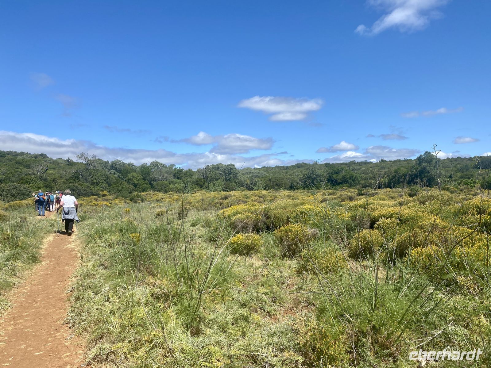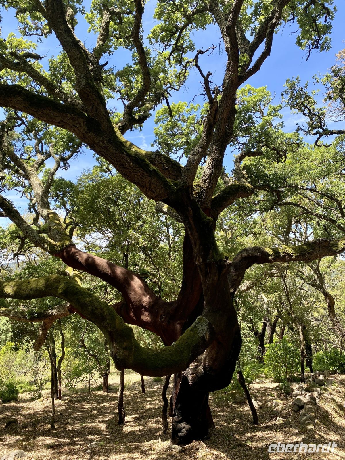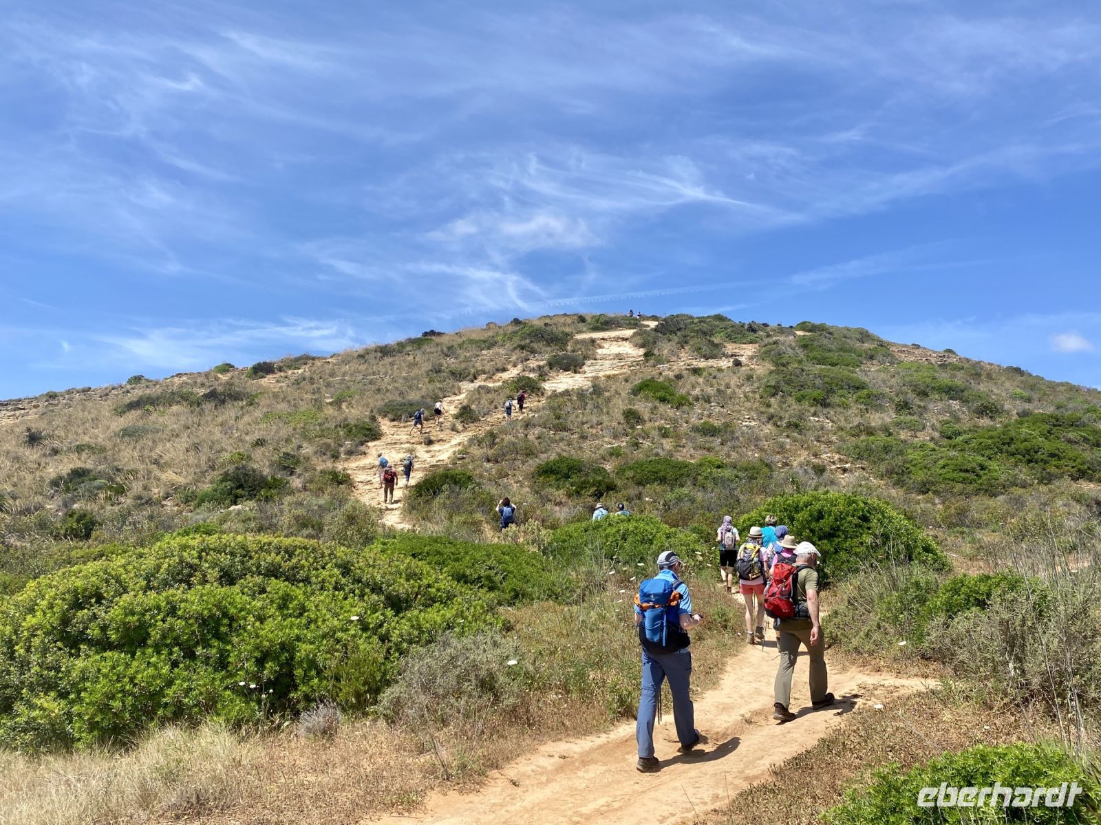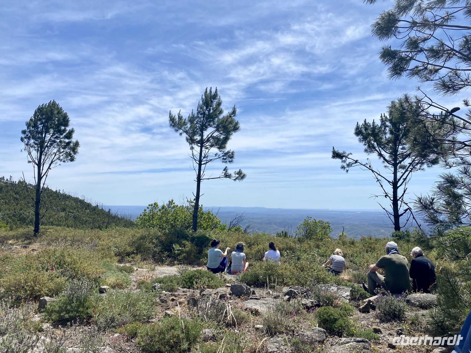 Unsere letzte Wanderung auf unserer Reise führt uns heute in das im Hinterland gelegene Monchique Gebirge, der Garten der Algarve, das nicht nur durch eine wunderbare Landschaft, sondern auch durch die bekannten Korkeneichen geprägt ist. Wir starten unsere Wanderung in Richtung Picota. Mit 773 Metern ist er die zweithöchste Erhebung des Monchique-Gebirges. Unser Weg führt uns zuerst ein kleines Stück eine Straße bergauf, aber schnell wird es wirklich richtig schön, denn um uns herum säumen immer mehr Korkeichen unseren Weg. Untenrum kahl geschält und weiter oben mit viel Rinde. Eine tolle und faszinierende Landschaft für unsere Fotografen. Dem Korkeichenwald folgt der Eukalyptus. Das klingt exotisch, ist auch erstmal sehr nett anzusehen – aber ist nicht ganz unproblematisch, da die Bäume tiefe Saugwurzeln besitzen, die das Grundwasser durcheinanderbringen und wenig Wachstumschancen für Unterholz bieten. Zudem brennen die ölhaltigen Blätter sehr schnell, was unter anderem ein Grund für die großen Waldbrände in Portugal ist. Unser Weg führt uns weiter bergauf, die Vegetation lässt nach und dann liegt die komplett baumlose Kuppe des Picota plötzlich auch schon vor uns. Leider bleibt uns die grandiose Aussicht vom Gipfel heute verwehrt, da es für einen Aufstieg zu windig ist. Und so suchen wir uns ein schönes Plätzchen für eine kleine Rast und genießen von unten die Sicht auf den Berg und die umgebende Natur. Nachdem wir uns gestärkt haben geht es zurück. Schnell kommen wir zurück in bewaldetes Gebiet – hier säumen neben den Korkeichen auch Erdbeerbäume und jede Menge Esskastanien unseren Weg zum Bus. Nach diesem Erlebnis besuchen wir am Nachmittag noch die Thermen Caldas de Monchiques, wo ich meine Idee unsere Wanderer mit einem leckeren landestypischen Picknick zu überraschen, mit Hilfe von Lina umsetzen kann. Portugiesische Spezialitäten wie Oliven, Maisbrot, Schinken, Käse, Sardinenpastete, Karottenkuchen, Weintrauben und Wein dürfen hierbei natürlich nicht fehlen. Und so lassen wir diesen erlebnisreichen letzten Wandertag mit gutem Essen, Wein und tollen Gesprächen ausklingen.