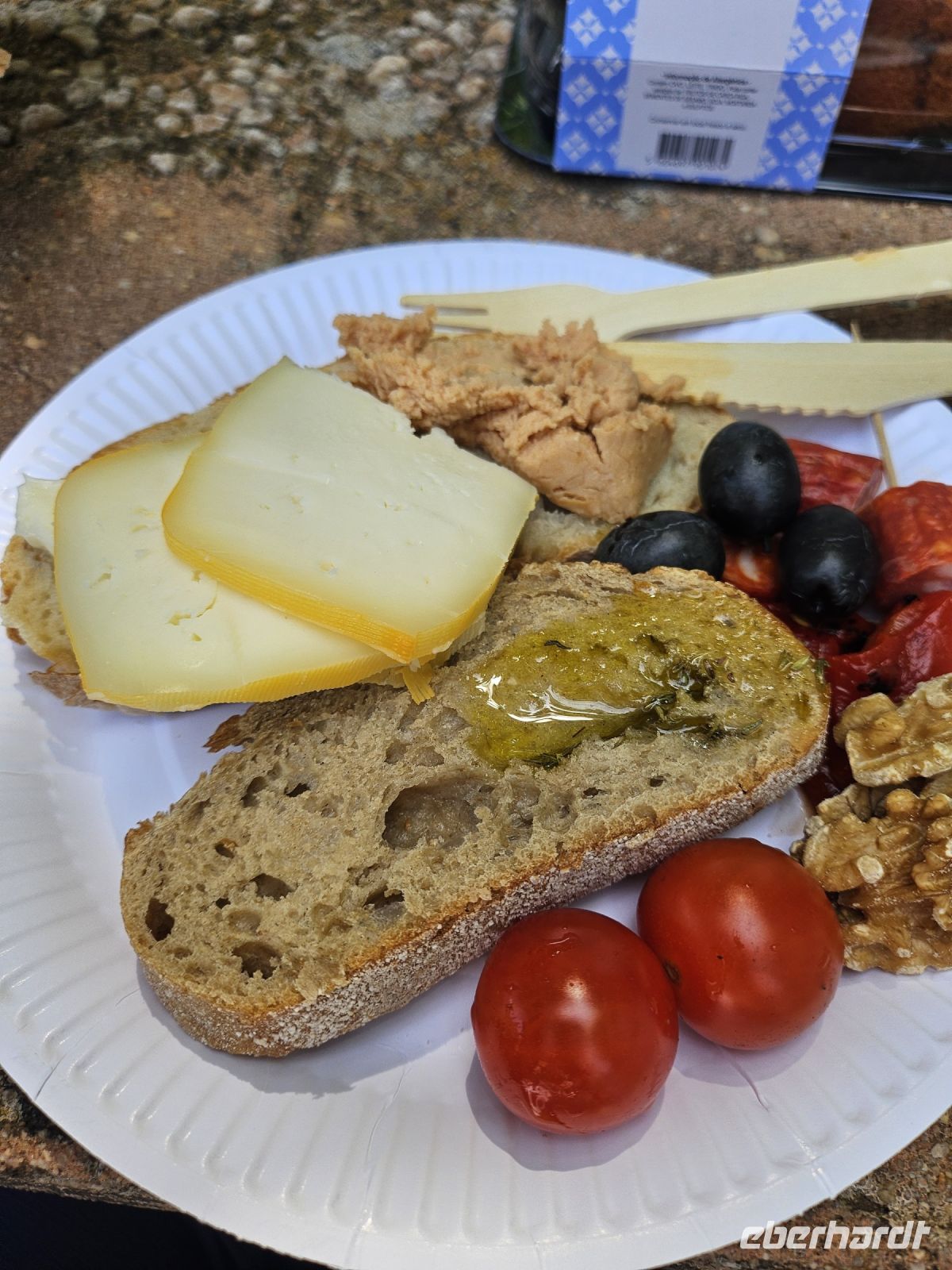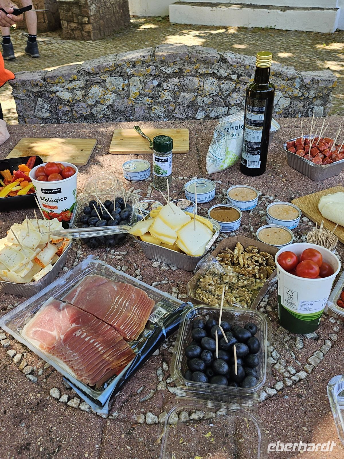 Nach der Wanderung fuhren wir nur kurz weiter bis Alta, wo Lina und Mariele alles für ein ganz besonderes Highlight vorbereiteten: ein Picknick am Bachlauf, liebevoll arrangiert und regional bestückt. Brot, Käse, Schinken, Fischpasteten, Oliven, gegrillte Paprika, Nüsse, Kuchen – und natürlich ein großzügiger Krug mit portugiesischem Wein. Während wir genossen, schnatterten Entenküken am Wasser, und die Seele hatte Zeit zum Nachkommen.