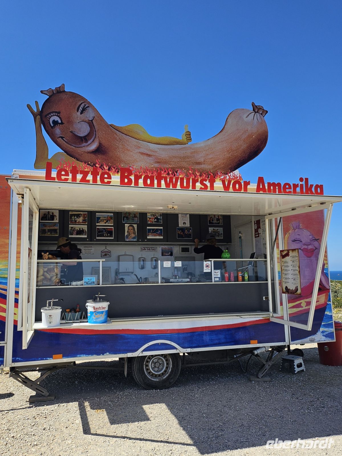 Am Nachmittag fuhren wir weiter zum Cabo de São Vicente, dem südwestlichsten Punkt Europas. Der Wind pfiff kräftig über das Kap, die Klippen fielen dramatisch ins Meer – und wir genossen diesen rauen, ehrfürchtigen Ort mit Humor und Hunger: „Die letzte Bratwurst vor Amerika“ (natürlich mit Zertifikat!) war genau das Richtige.