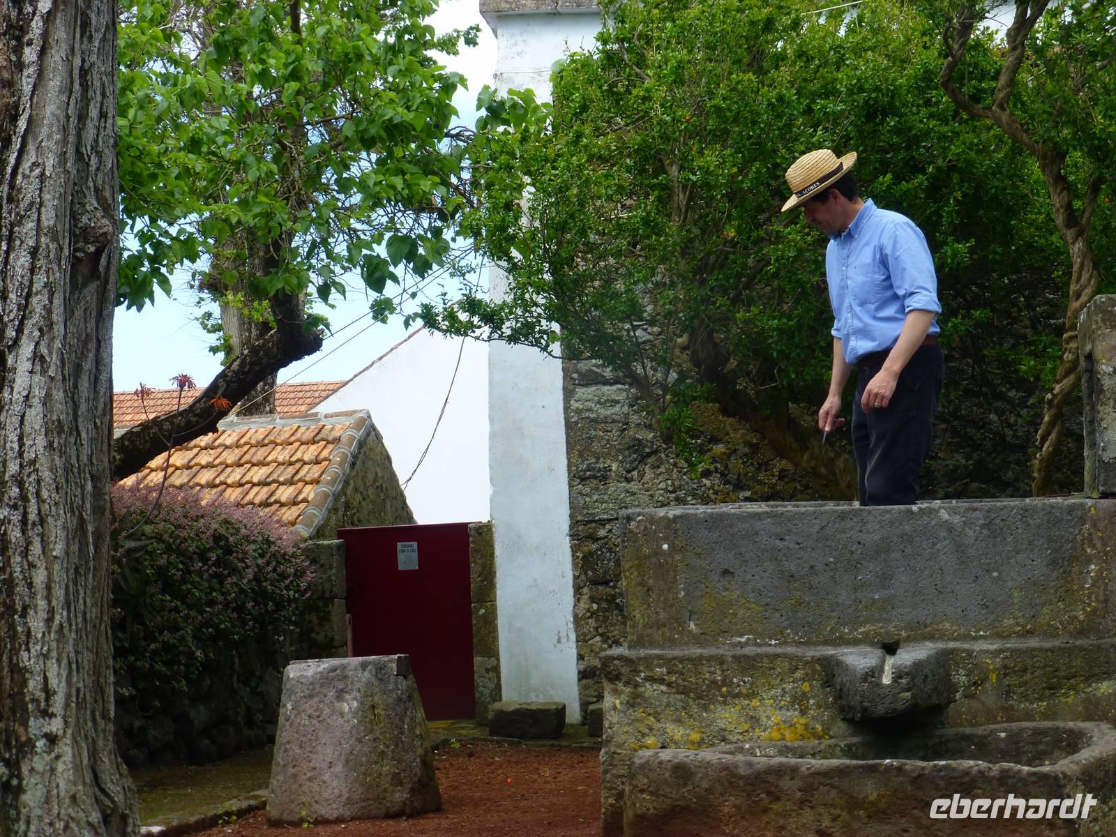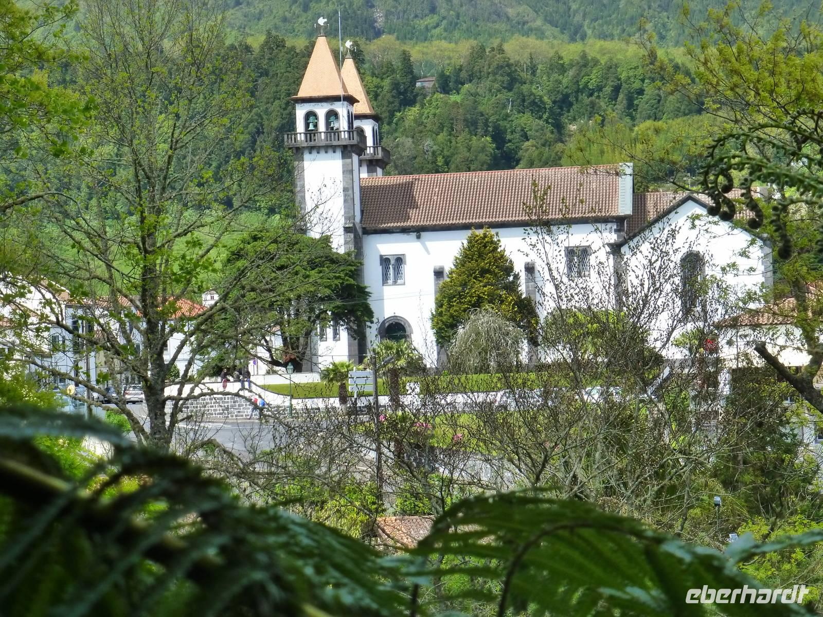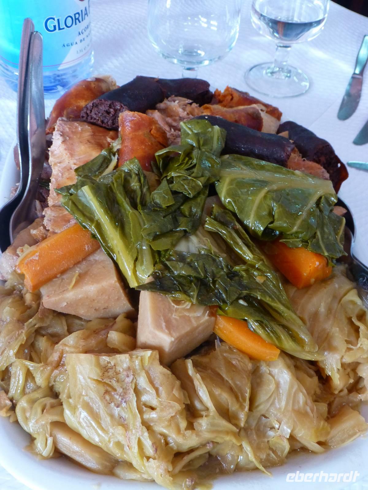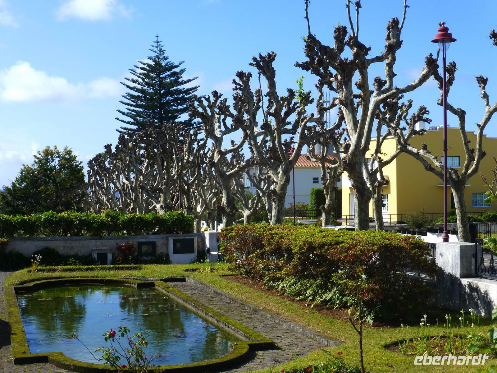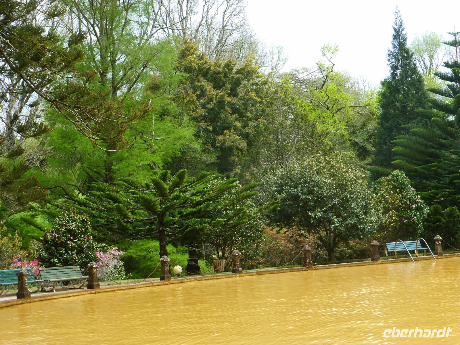 Der Topf wird gefüllt und dann heißt es Deckel schließen und abwarten. Man muss nur seinen Topf in einen der vorbereiteten Erdlöcher hinablassen. Nach sechs Stunden hat der stetige Dampf mit seinen Mineralstoffen dem ganzen eine besondere Geschmacksnote bereitet. Wir schauen zu als die Töpfe heraus gehoben wurden. Jetzt haben wir doch schon Hunger und fahren in Tony´s Restaurant. Wir ließen uns die einheimische Spezialität den „Cozido das Furnas" schmecken. Es ist eine Art „Eintopf" mit verschiedenem Fleisch, Chorizo-Salami, der Blutwurst Morçela und einer Reihe von Gemüse. Ein Glas Wein oder Bier rundete das "kleine" Mittagessen ab. Anschließend fuhren wir in den in den Terra Nostra-Park, einer der schönsten der Azoren. Hier kann man die unterschiedlichsten Pflanzen entdecken. Der Park ist mit seiner bunten Mischung aus Pflanzen und Bäumen einzigartig. In dem 12ha große Park befinden sich rund 2.500 Bäume. Entlang der Wege stehen Kamelien, Magnolien, Azaleen, Strelizien, Hibiskus, Araukarien und noch vieles mehr. Wir unternahmen einen Spaziergang durch den Terra Nostra Park. Hier befindet sich ein 38 Grad heißes Thermal-Wasserbecken. Viele von uns nutzten die Chance und nahmen ein Bad. Es sah zwar nicht gerade einladend aus, denn das Wasser ist sehr braun. Nach unserem "kühlen" Bad fuhren wir nach Vila Franca do Campo. Wir hielten an der Kirche St. Michael, die, wie auch alle anderen Kirchen auf den Inseln, in schlichtem weiß und schwarz gehalten war. Wir besuchten die Kirche du uns fiel gleich auf das die Fenster mit Gardine versehen waren. Die Kirche war für die Einwohner schon immer ein wichtiger Anlaufpunkt und Sie sollten sich in der Kirche wie daheim fühlen. Am frühen Abend erreichten wir unser Hotel in Ponta Delgada.