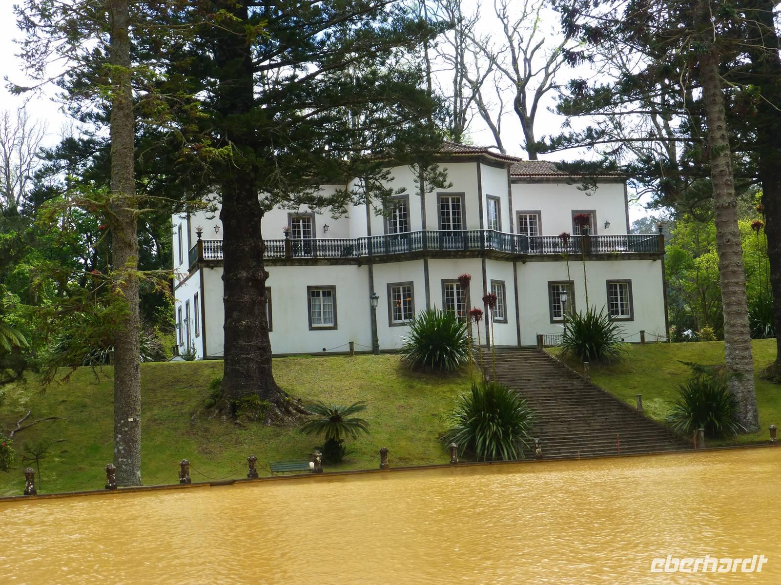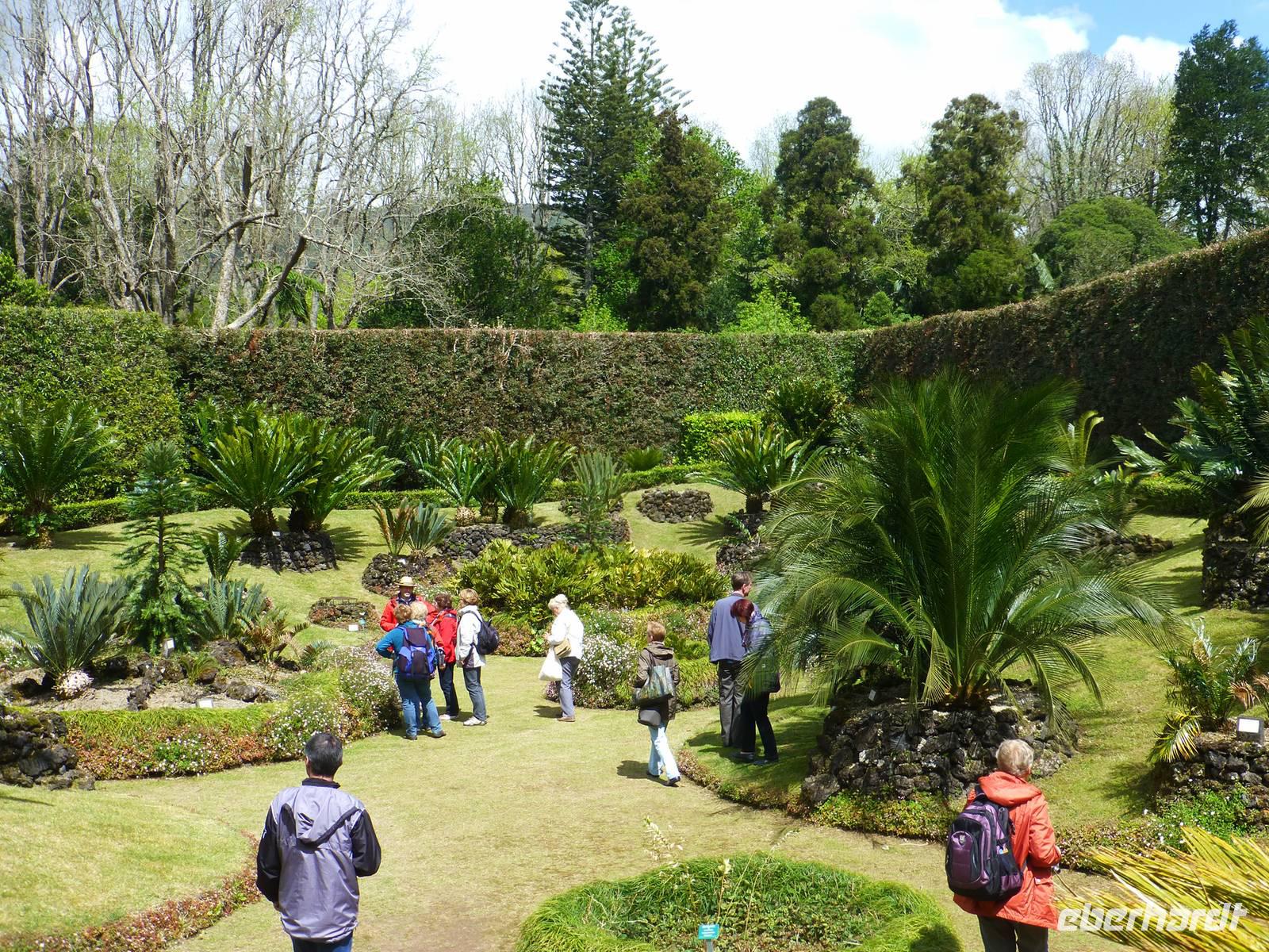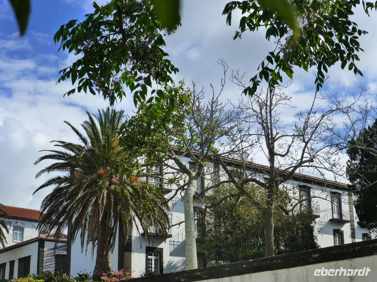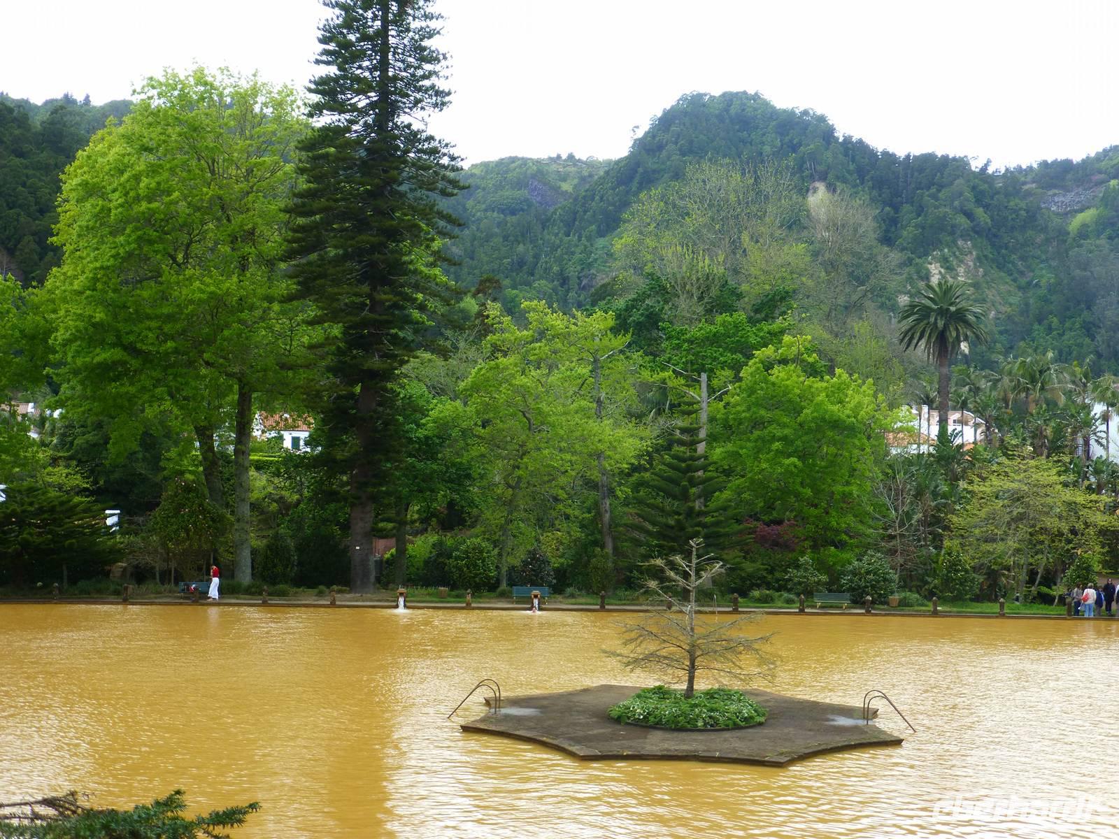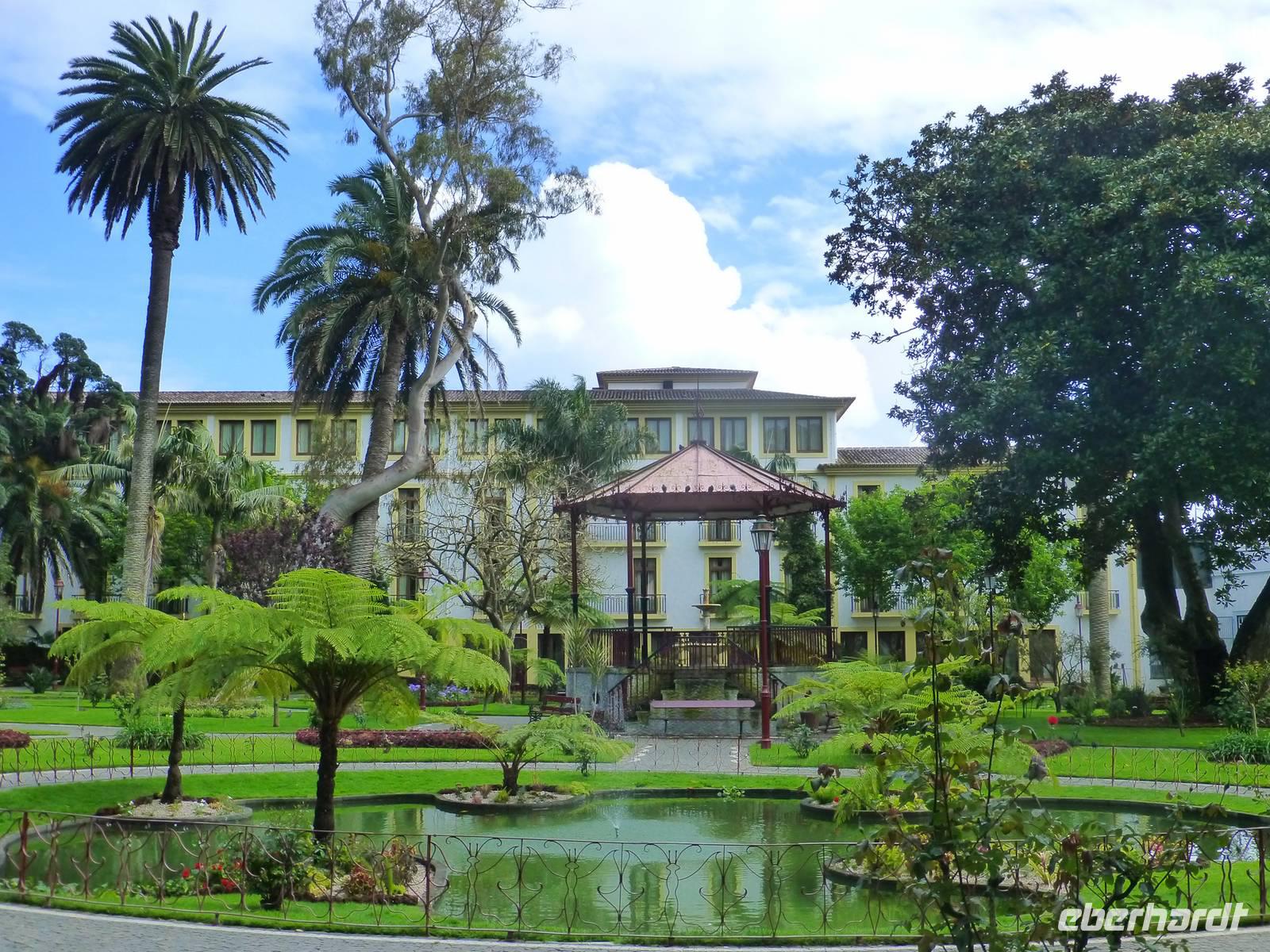 Der Topf wird gefüllt und dann heißt es Deckel schließen und abwarten. Man muss nur seinen Topf in einen der vorbereiteten Erdlöcher hinablassen. Nach sechs Stunden hat der stetige Dampf mit seinen Mineralstoffen dem ganzen eine besondere Geschmacksnote bereitet. Wir schauen zu als die Töpfe heraus gehoben wurden. Jetzt haben wir doch schon Hunger und fahren in Tony´s Restaurant. Wir ließen uns die einheimische Spezialität den „Cozido das Furnas" schmecken. Es ist eine Art „Eintopf" mit verschiedenem Fleisch, Chorizo-Salami, der Blutwurst Morçela und einer Reihe von Gemüse. Ein Glas Wein oder Bier rundete das "kleine" Mittagessen ab. Anschließend fuhren wir in den in den Terra Nostra-Park, einer der schönsten der Azoren. Hier kann man die unterschiedlichsten Pflanzen entdecken. Der Park ist mit seiner bunten Mischung aus Pflanzen und Bäumen einzigartig. In dem 12ha große Park befinden sich rund 2.500 Bäume. Entlang der Wege stehen Kamelien, Magnolien, Azaleen, Strelizien, Hibiskus, Araukarien und noch vieles mehr. Wir unternahmen einen Spaziergang durch den Terra Nostra Park. Hier befindet sich ein 38 Grad heißes Thermal-Wasserbecken. Viele von uns nutzten die Chance und nahmen ein Bad. Es sah zwar nicht gerade einladend aus, denn das Wasser ist sehr braun. Nach unserem "kühlen" Bad fuhren wir nach Vila Franca do Campo. Wir hielten an der Kirche St. Michael, die, wie auch alle anderen Kirchen auf den Inseln, in schlichtem weiß und schwarz gehalten war. Wir besuchten die Kirche du uns fiel gleich auf das die Fenster mit Gardine versehen waren. Die Kirche war für die Einwohner schon immer ein wichtiger Anlaufpunkt und Sie sollten sich in der Kirche wie daheim fühlen. Am frühen Abend erreichten wir unser Hotel in Ponta Delgada.