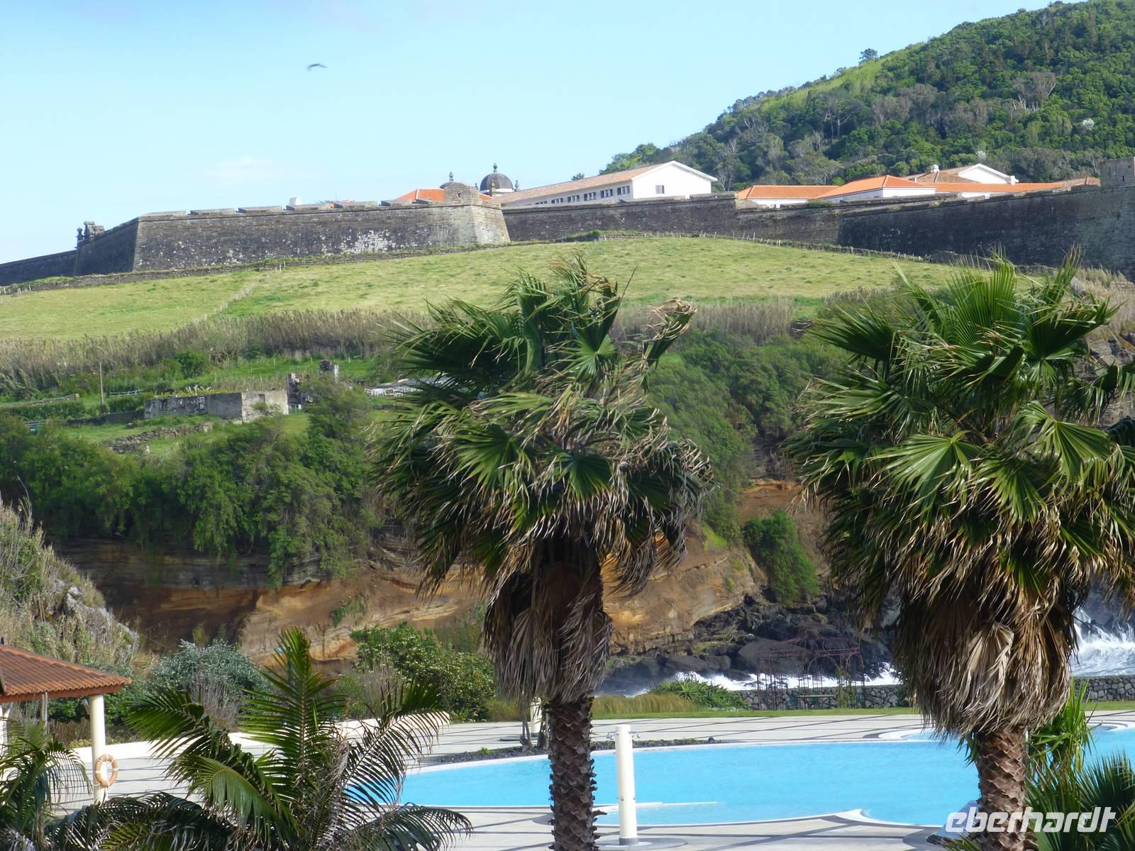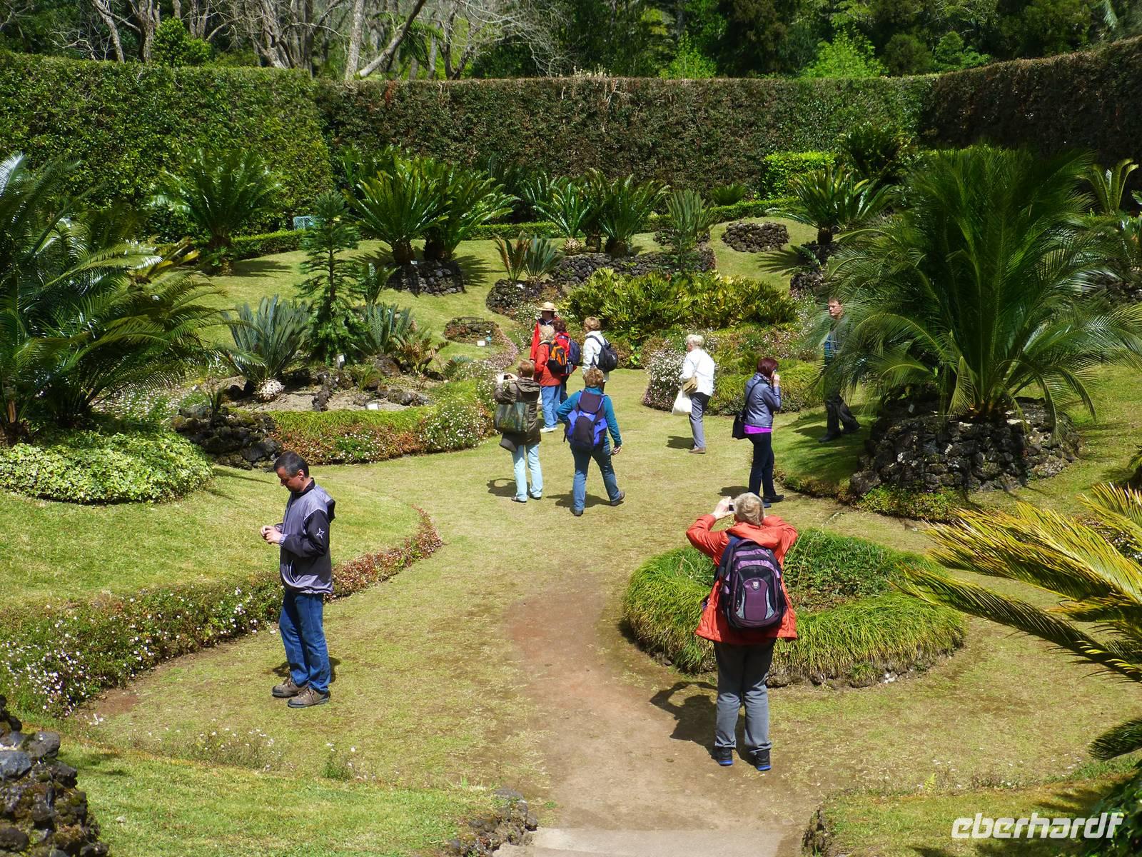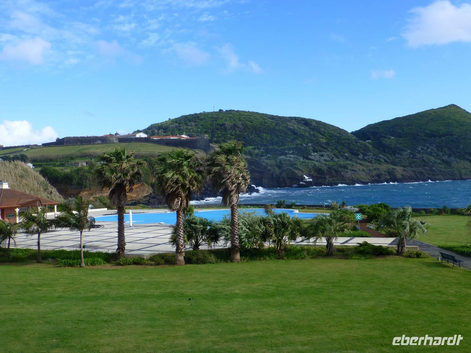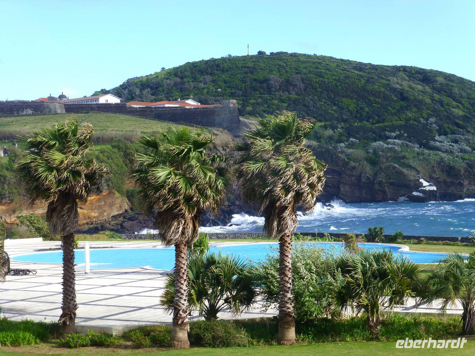 Der Topf wird gefüllt und dann heißt es Deckel schließen und abwarten. Man muss nur seinen Topf in einen der vorbereiteten Erdlöcher hinablassen. Nach sechs Stunden hat der stetige Dampf mit seinen Mineralstoffen dem ganzen eine besondere Geschmacksnote bereitet. Wir schauen zu als die Töpfe heraus gehoben wurden. Jetzt haben wir doch schon Hunger und fahren in Tony´s Restaurant. Wir ließen uns die einheimische Spezialität den „Cozido das Furnas" schmecken. Es ist eine Art „Eintopf" mit verschiedenem Fleisch, Chorizo-Salami, der Blutwurst Morçela und einer Reihe von Gemüse. Ein Glas Wein oder Bier rundete das "kleine" Mittagessen ab. Anschließend fuhren wir in den in den Terra Nostra-Park, einer der schönsten der Azoren. Hier kann man die unterschiedlichsten Pflanzen entdecken. Der Park ist mit seiner bunten Mischung aus Pflanzen und Bäumen einzigartig. In dem 12ha große Park befinden sich rund 2.500 Bäume. Entlang der Wege stehen Kamelien, Magnolien, Azaleen, Strelizien, Hibiskus, Araukarien und noch vieles mehr. Wir unternahmen einen Spaziergang durch den Terra Nostra Park. Hier befindet sich ein 38 Grad heißes Thermal-Wasserbecken. Viele von uns nutzten die Chance und nahmen ein Bad. Es sah zwar nicht gerade einladend aus, denn das Wasser ist sehr braun. Nach unserem "kühlen" Bad fuhren wir nach Vila Franca do Campo. Wir hielten an der Kirche St. Michael, die, wie auch alle anderen Kirchen auf den Inseln, in schlichtem weiß und schwarz gehalten war. Wir besuchten die Kirche du uns fiel gleich auf das die Fenster mit Gardine versehen waren. Die Kirche war für die Einwohner schon immer ein wichtiger Anlaufpunkt und Sie sollten sich in der Kirche wie daheim fühlen. Am frühen Abend erreichten wir unser Hotel in Ponta Delgada.
