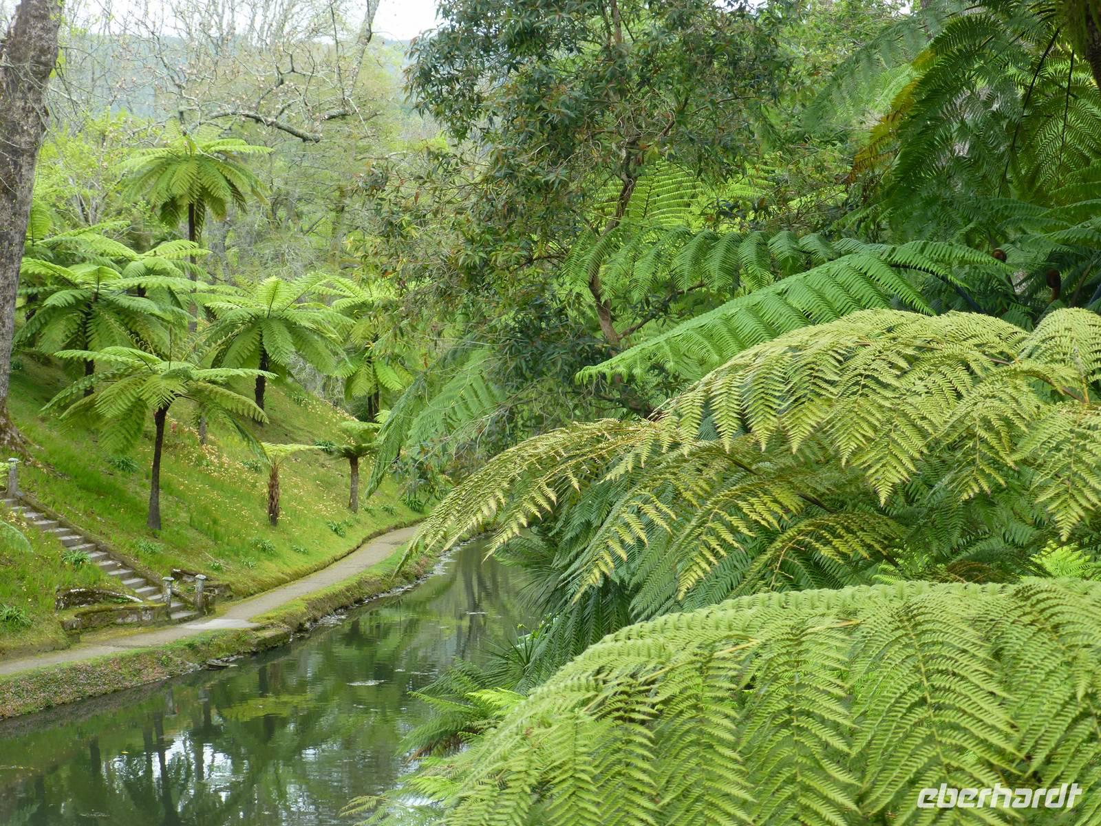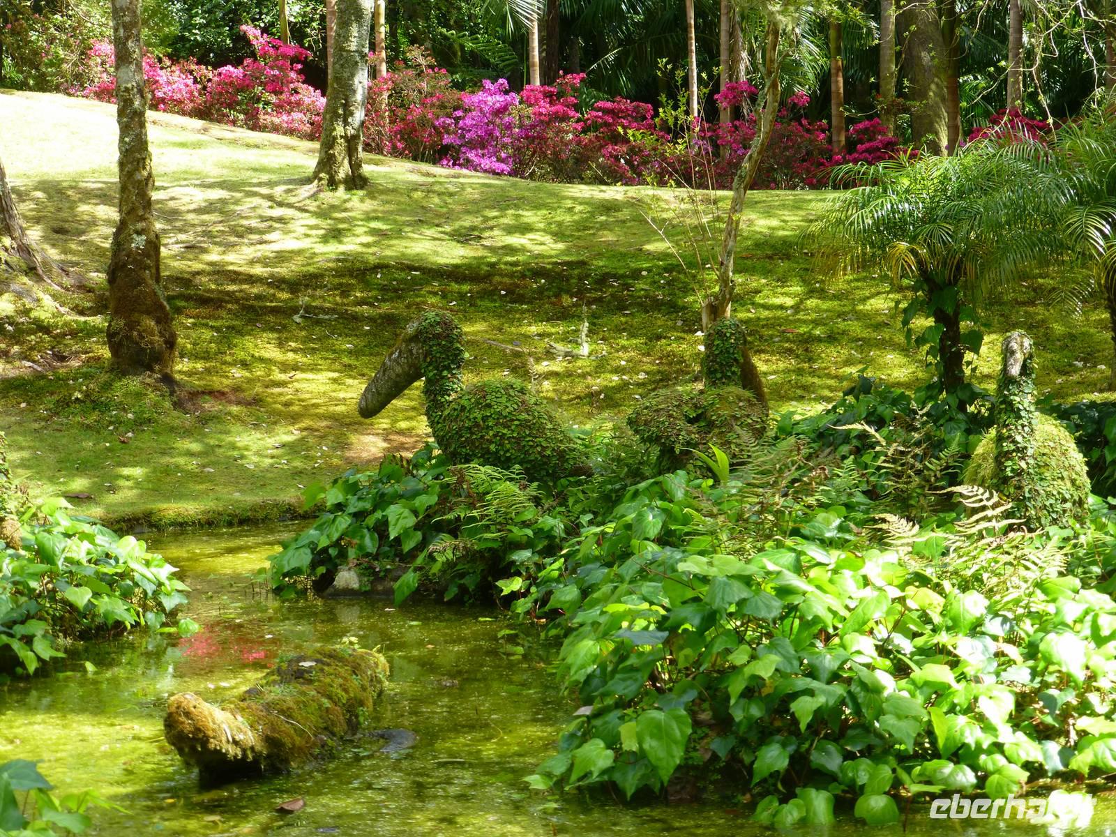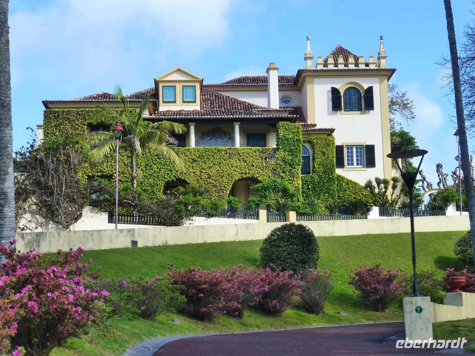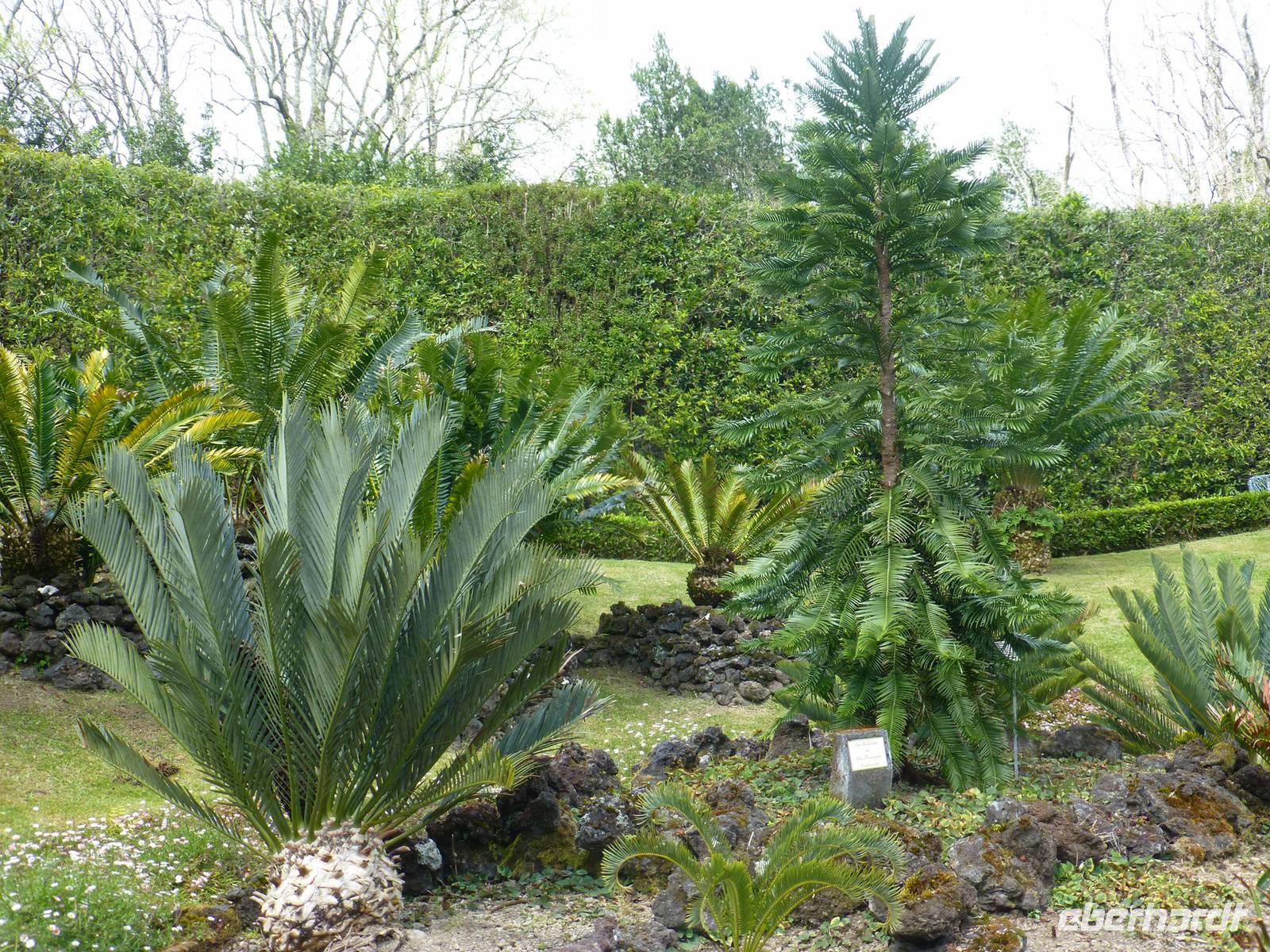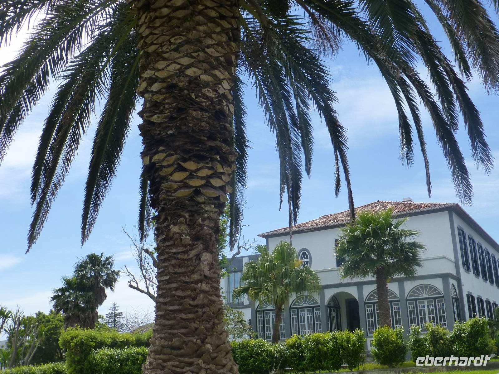 Der Topf wird gefüllt und dann heißt es Deckel schließen und abwarten. Man muss nur seinen Topf in einen der vorbereiteten Erdlöcher hinablassen. Nach sechs Stunden hat der stetige Dampf mit seinen Mineralstoffen dem ganzen eine besondere Geschmacksnote bereitet. Wir schauen zu als die Töpfe heraus gehoben wurden. Jetzt haben wir doch schon Hunger und fahren in Tony´s Restaurant. Wir ließen uns die einheimische Spezialität den „Cozido das Furnas" schmecken. Es ist eine Art „Eintopf" mit verschiedenem Fleisch, Chorizo-Salami, der Blutwurst Morçela und einer Reihe von Gemüse. Ein Glas Wein oder Bier rundete das "kleine" Mittagessen ab. Anschließend fuhren wir in den in den Terra Nostra-Park, einer der schönsten der Azoren. Hier kann man die unterschiedlichsten Pflanzen entdecken. Der Park ist mit seiner bunten Mischung aus Pflanzen und Bäumen einzigartig. In dem 12ha große Park befinden sich rund 2.500 Bäume. Entlang der Wege stehen Kamelien, Magnolien, Azaleen, Strelizien, Hibiskus, Araukarien und noch vieles mehr. Wir unternahmen einen Spaziergang durch den Terra Nostra Park. Hier befindet sich ein 38 Grad heißes Thermal-Wasserbecken. Viele von uns nutzten die Chance und nahmen ein Bad. Es sah zwar nicht gerade einladend aus, denn das Wasser ist sehr braun. Nach unserem "kühlen" Bad fuhren wir nach Vila Franca do Campo. Wir hielten an der Kirche St. Michael, die, wie auch alle anderen Kirchen auf den Inseln, in schlichtem weiß und schwarz gehalten war. Wir besuchten die Kirche du uns fiel gleich auf das die Fenster mit Gardine versehen waren. Die Kirche war für die Einwohner schon immer ein wichtiger Anlaufpunkt und Sie sollten sich in der Kirche wie daheim fühlen. Am frühen Abend erreichten wir unser Hotel in Ponta Delgada.