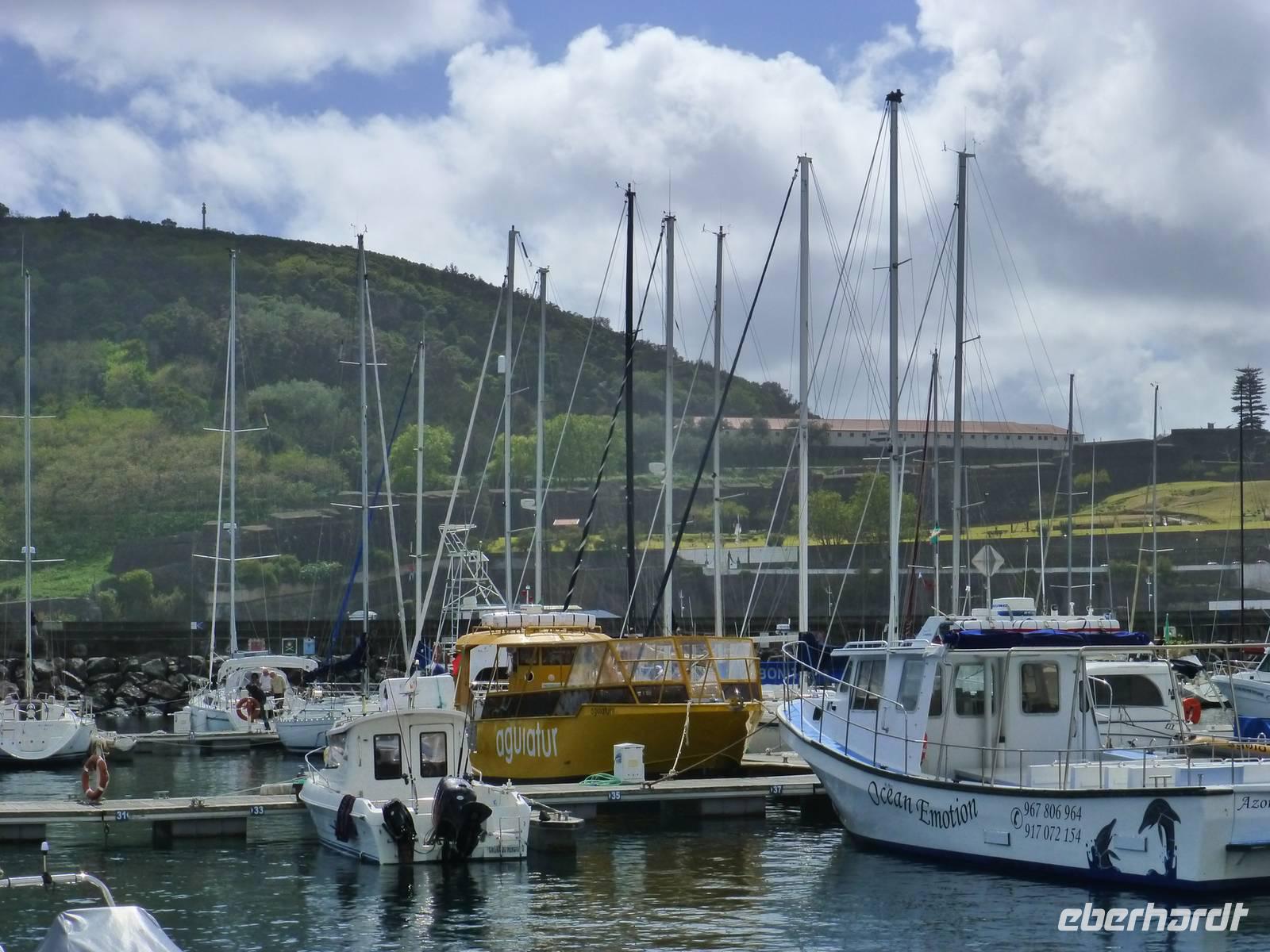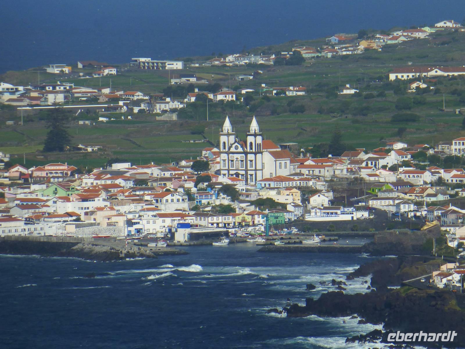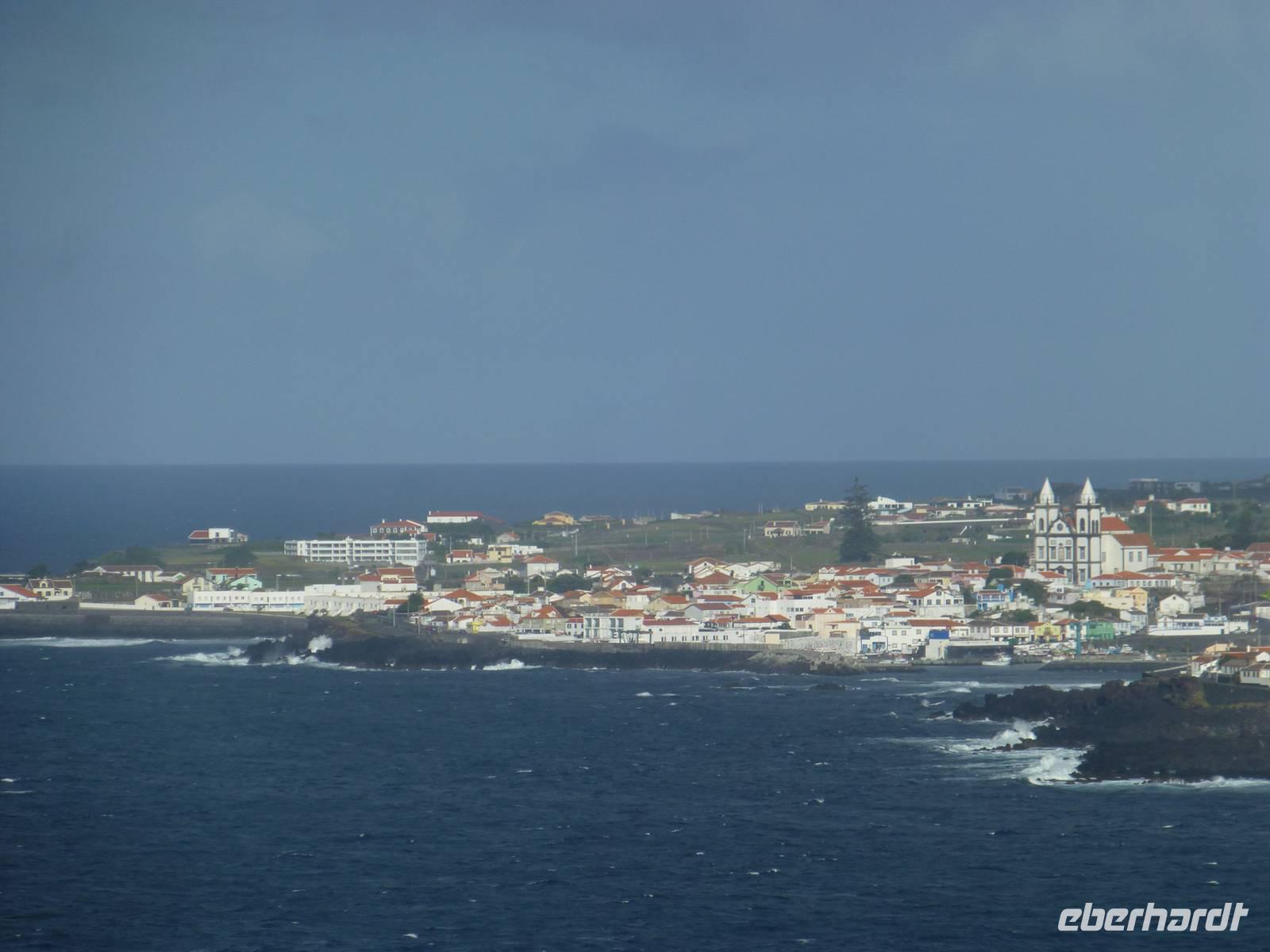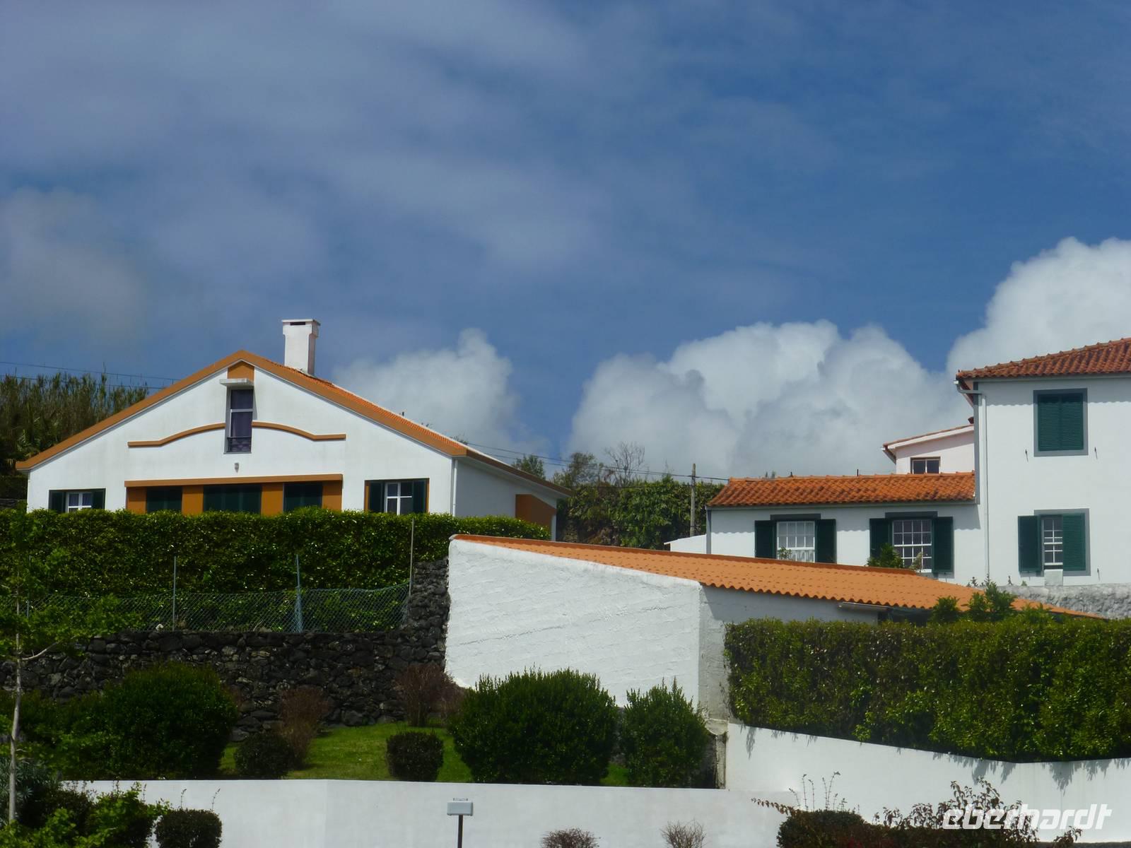 Nach dem Frühstück fuhren wir zum Flughafen,.denn wir wollten heute auf die nächste Insel fliegen. Nachdem wir wieder traumhaft schöne Ausblicke aus dem Flugzeug auf den Pico genossen hatten, unternahmen wir eine Inselrundfahrt. Als erstes stoppten wir an einem Aussichtspunkt und hatten von dort aus einen wunderschönen Blick über die Insel, Horta und natürlich auf dir Nachbarinsel Pico mit dem gleichnamigen Berg. Auch heute schien wieder die Sonne. Wir erreichten Caldeira und hatten einen schönen Blick in den Krater. So, nun hatten wir aber Hunger. So machten wir in einem kleinen Restaurant einen Stopp und ließen uns dort nieder. Gut gestärkt, ging es dann weiter nach Capelinhos in das Informationszentrum. Hier ca. 100 Meter vor der Küste brach im Jahr 1957 ein Vulkan auf offener See aus. Es wurden ungefähr 300 Häuser vernichtet und viele Menschen mussten umgesiedelt werden. Noch immer sieht man die alten Mauern der zerstören Häuser. Außerdem steht hier auch ein alter Leuchtturm, der wie ein Mahnmal an die damalige Katastrophe erinnert. Ursprünglich stand dieser natürlich direkt am Wasser, heute befindet er sich aber mitten auf dem Land, umhüllt von Vulkanasche. Nach dem Ausbruch gewann die Insel neues Land hinzu. Wir sahen den Teil, der heute unter der Vulkanasche begraben ist und viele Ausstellungsstücke, die an den Ausbruch erinnern. Nachdem wir nun die Insel erkundet hatten, fuhren wir zurück nach Horta zu unserem Hotel do Canal. Es liegt direkt am Hafen. Zum Abendessen hatten wir einen Tisch in Peters Café Sport bestellt. Der Besuch in diesem legendären Restaurant ist ein muß. Natürlich probierten wir auch den berühmten Gin Tonic. Das Essen schmeckte und wir erhielten einen ersten Eindruck von der Live Musik die am späten Abend gespielt wurde.