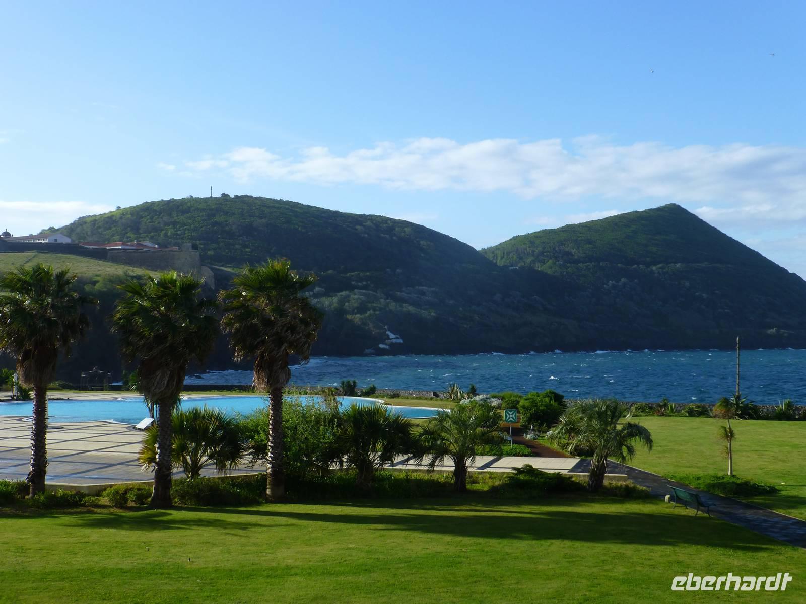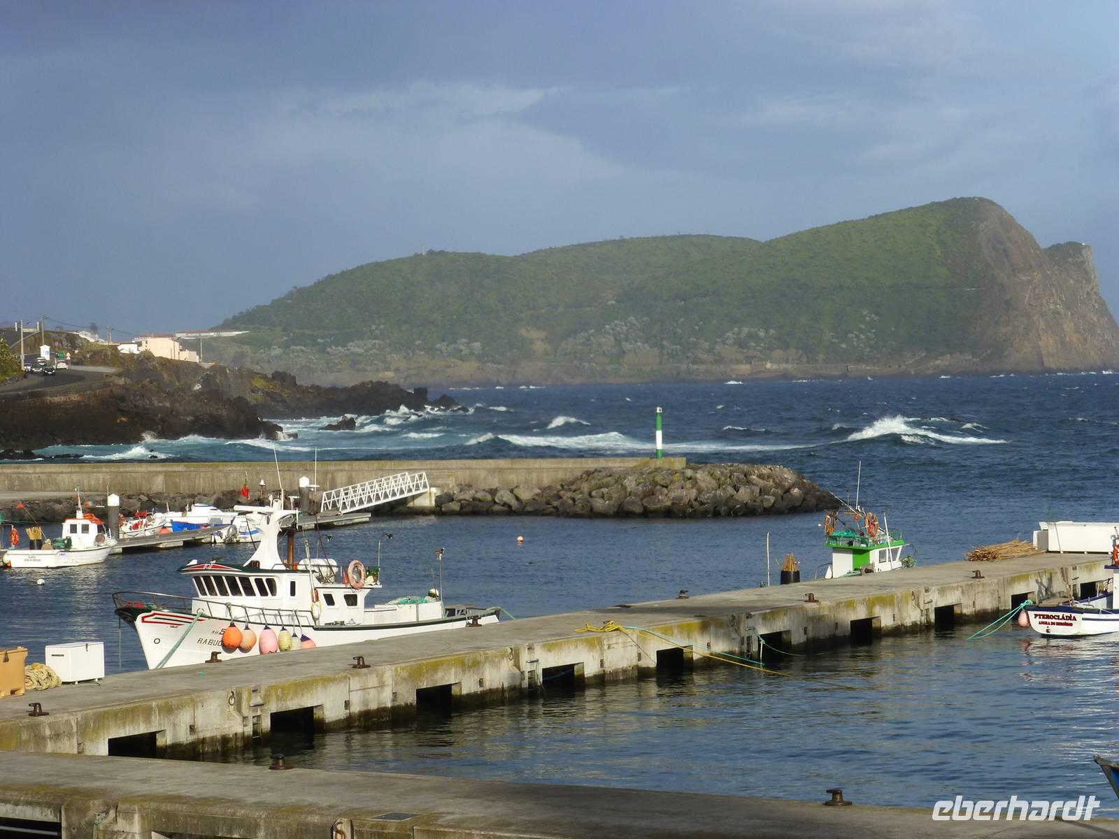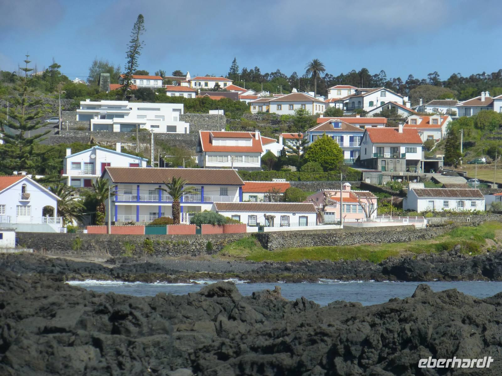 Nach dem Frühstück fuhren wir zum Flughafen,.denn wir wollten heute auf die nächste Insel fliegen. Nachdem wir wieder traumhaft schöne Ausblicke aus dem Flugzeug auf den Pico genossen hatten, unternahmen wir eine Inselrundfahrt. Als erstes stoppten wir an einem Aussichtspunkt und hatten von dort aus einen wunderschönen Blick über die Insel, Horta und natürlich auf dir Nachbarinsel Pico mit dem gleichnamigen Berg. Auch heute schien wieder die Sonne. Wir erreichten Caldeira und hatten einen schönen Blick in den Krater. So, nun hatten wir aber Hunger. So machten wir in einem kleinen Restaurant einen Stopp und ließen uns dort nieder. Gut gestärkt, ging es dann weiter nach Capelinhos in das Informationszentrum. Hier ca. 100 Meter vor der Küste brach im Jahr 1957 ein Vulkan auf offener See aus. Es wurden ungefähr 300 Häuser vernichtet und viele Menschen mussten umgesiedelt werden. Noch immer sieht man die alten Mauern der zerstören Häuser. Außerdem steht hier auch ein alter Leuchtturm, der wie ein Mahnmal an die damalige Katastrophe erinnert. Ursprünglich stand dieser natürlich direkt am Wasser, heute befindet er sich aber mitten auf dem Land, umhüllt von Vulkanasche. Nach dem Ausbruch gewann die Insel neues Land hinzu. Wir sahen den Teil, der heute unter der Vulkanasche begraben ist und viele Ausstellungsstücke, die an den Ausbruch erinnern. Nachdem wir nun die Insel erkundet hatten, fuhren wir zurück nach Horta zu unserem Hotel do Canal. Es liegt direkt am Hafen. Zum Abendessen hatten wir einen Tisch in Peters Café Sport bestellt. Der Besuch in diesem legendären Restaurant ist ein muß. Natürlich probierten wir auch den berühmten Gin Tonic. Das Essen schmeckte und wir erhielten einen ersten Eindruck von der Live Musik die am späten Abend gespielt wurde.