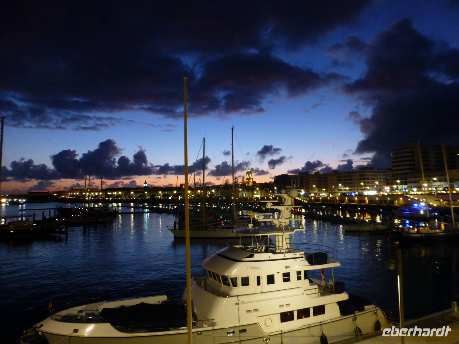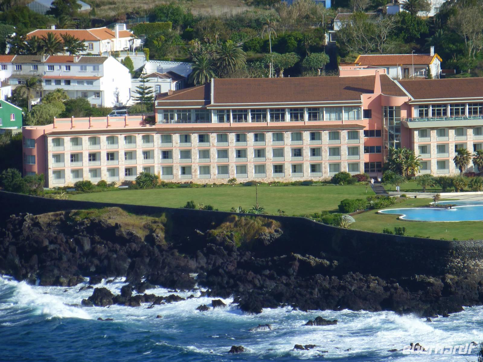 Pünktlich flog unsere Maschine auf die Azoren nach Ponta Delgada. Nach 2 Stunden erreichten wir dann auch die größte Insel der Azoren, Sao Miguel. Schon von oben sah alles ganz toll aus! Am Ausgang wartete dann schon unser Reiseleiter Jose und unser Busfahrer Petro, die uns begrüßten. Schnell waren die Koffer im Bus verladen und schon fuhren zu unserem Hotel Marina Atlantico. Natürlich mussten wir alle noch die Uhren um eine Stunde zurückstellen. Auf dem Weg zum Hotel erzählte uns Jose schon einiges zur Insel und wir konnten schon erahnen, dass uns eine wirklich traumhafte Naturkulisse in den nächsten Tagen erwarten würde. Die Fahrt dauerte nicht lang. Da wir schon zeitig da waren konnten wir unsere Zimmer noch nicht beziehen. Wir nutzten die Zeit für erste Erkundungen in der Stadt. Gemeinsam besuchten wir beim Regierungssitz Palacio de Sant'Ana den botanischen Garten Jacome Correira. Ein kurzer Regenschauer überraschte uns. Doch er war schnell wieder vorüber. Wir bestaunten schöne große Bäume und viele endemische Gewächse. Besonders angetan hatten es uns die großen Gummibäume und der übergroße Bambus. Weiterhin besuchten wir die kleine beschauliche Kirche Sant'Ana. Unser nächster Abstecher führte uns in den Stadtgarten Antonio Borges. Dieser ist sehr phantasievoll mit Gewächsen aus aller Welt angelegt. Besonders sehenswert ist die romantische Steinbrücke. Jetzt hatten wir uns eine Pause verdient. In einem kleinen Cafe probierten wir unseren ersten Expresso und die Suppe des Tages. Nun ging es zurück zum Hotel wo wir einchecken konnten. Da alle ein Zimmer mit Meerblick hatten genießen wir den ersten Blick auf den Atlantik. Gemeinsam mit Jose trafen wir uns zum Gemeinsamen Willkommens-Abendessen im Restaurant ANFITEATRO. Uns erwartete ein leckeres Menü mit einem raffinierten Vorspeiseteller, Schwertfisch und Dessert. Die Auszubildenden gaben sich viel Mühe und wir genießen bei einem guten Glas Wein unser erstes gemeinsames Abendessen. Inzwischen war die Stadt hell beleuchtet. Ein schöner Anblick.
