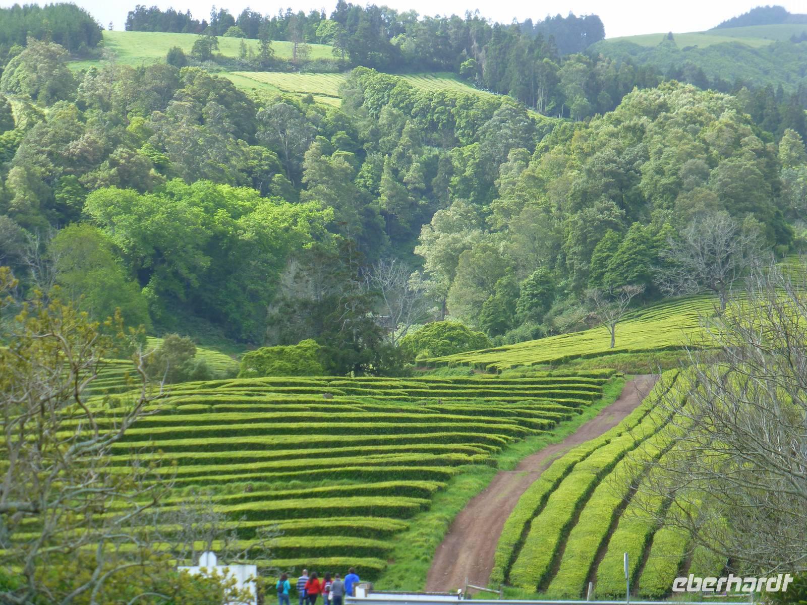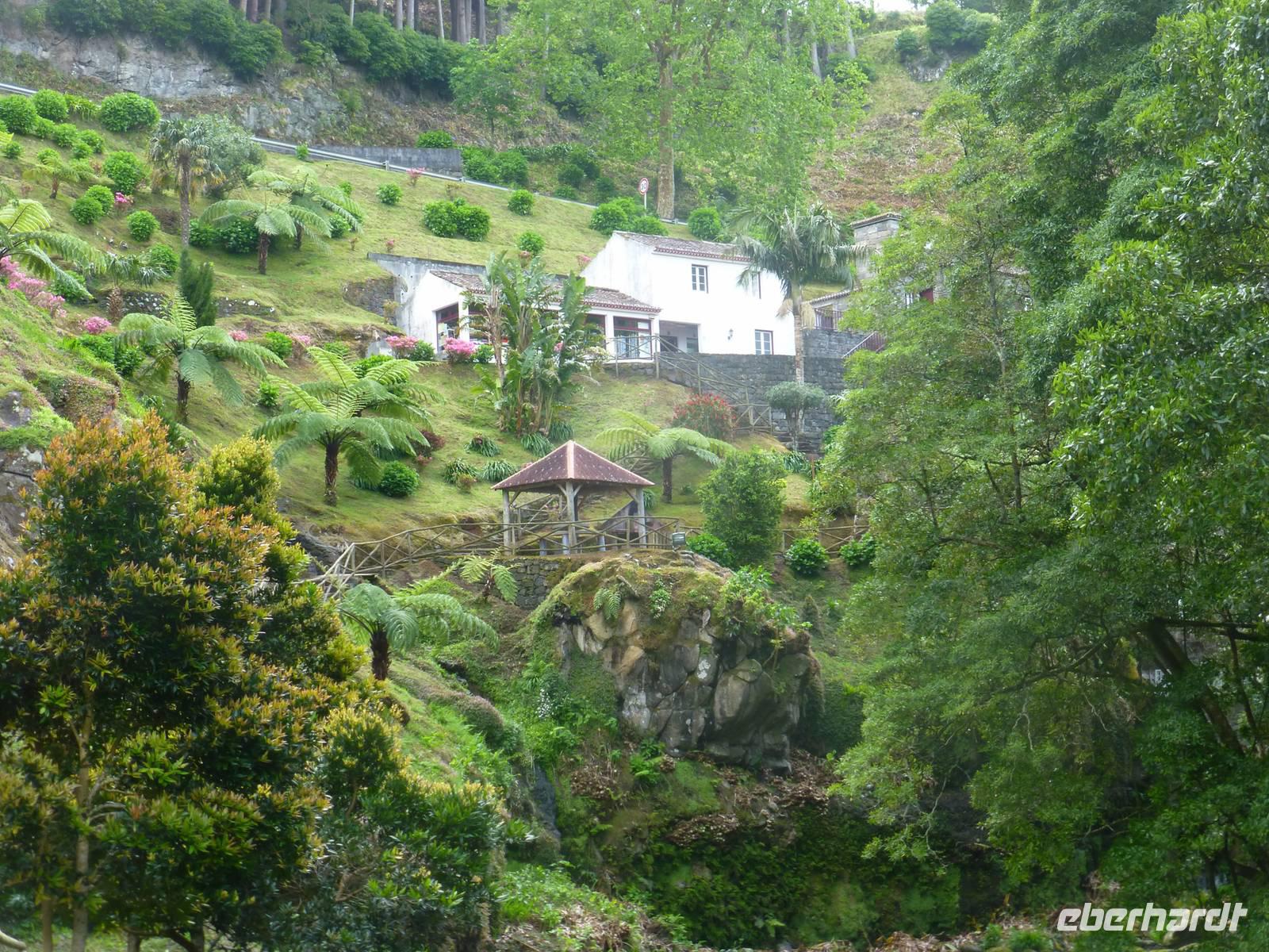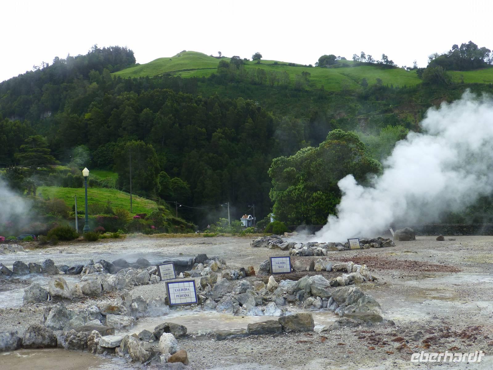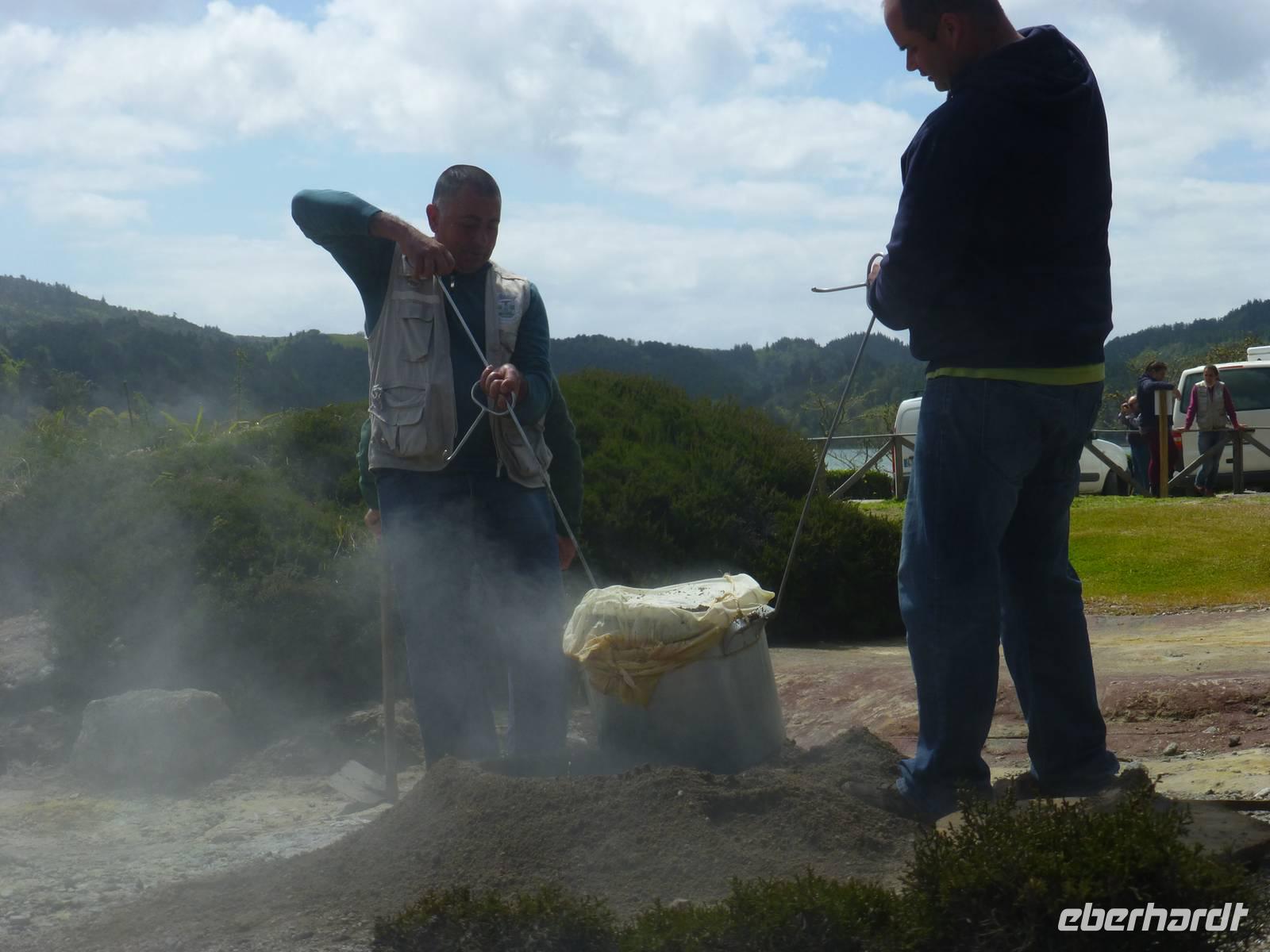 Die größte Insel der Azoren erwartete uns. Unser erster Besichtigung Punkt war die Teeplantage von Gorreana. Wir sahen die Anbauflächen und Jose erzählte uns etwas über den Anbau und die Verarbeitung der Teeblätter. Natürlich probierten wir auch dieses edle Getränk. Bei einem kurzen Stopp am Aussichtspunkt Caloura hatten wir einen schönen Blick über den Atlantik. Wir erreichten den Ort Furnas, der bekannt ist für seine Caldeiras von Furnas, die dampfenden Schwefelquellen. Wir konnten auch von den Quellen probieren. Unser nächstes Ziel war der Lagoa das Furmas. Schon von weiten sahen wir es dampfen. In den heißen Erdlöchern befanden sich große Töpfe in den unser Mittagessen vorbereitet wurde.
