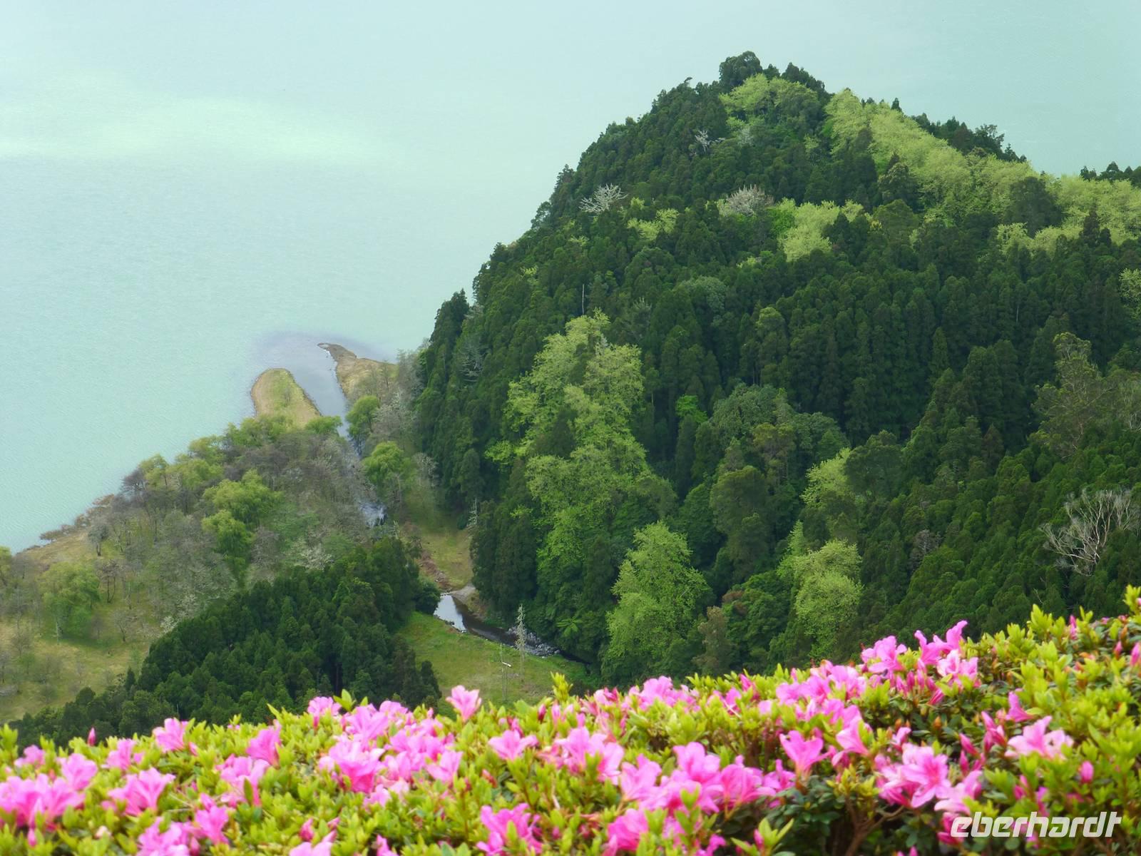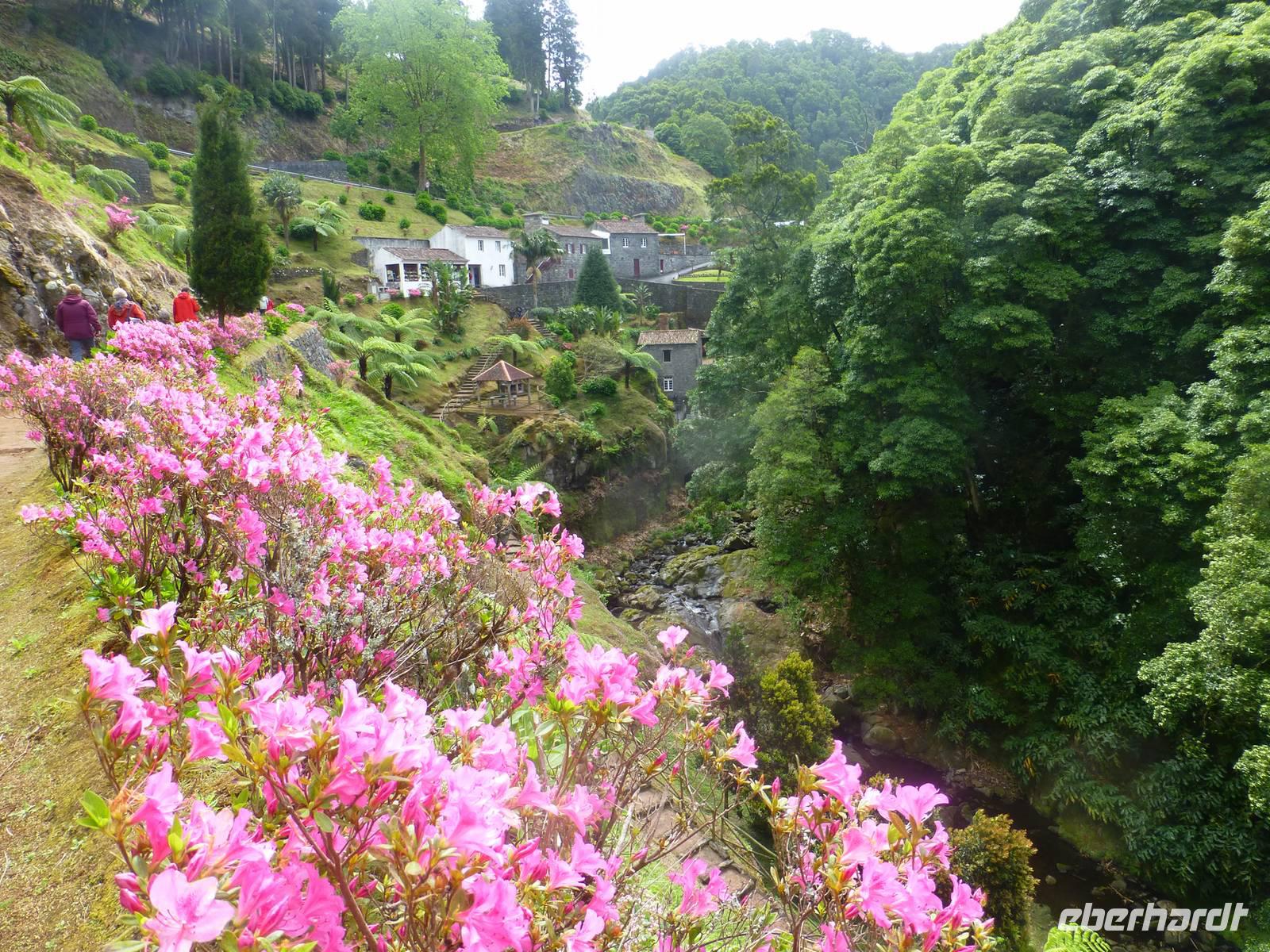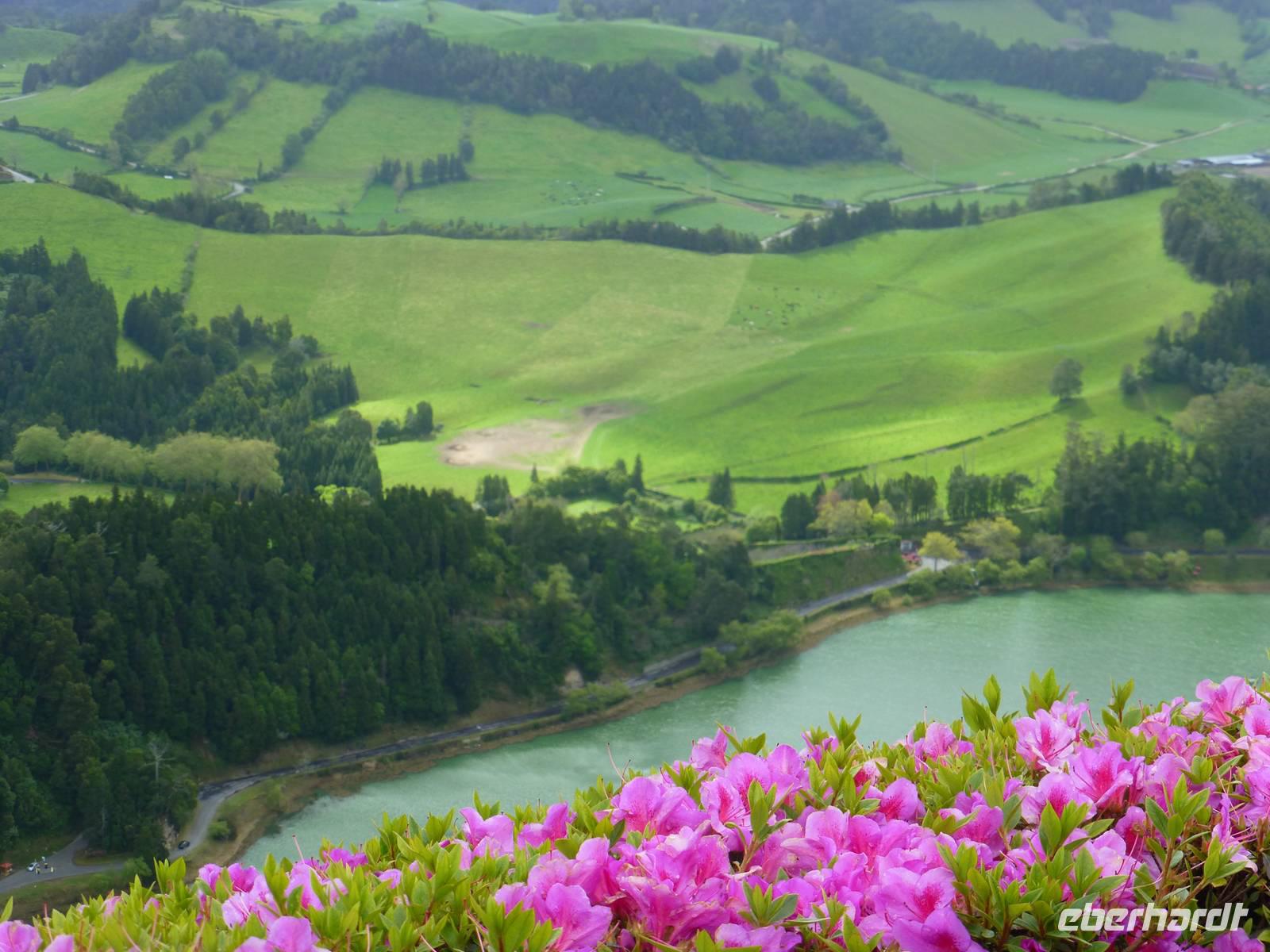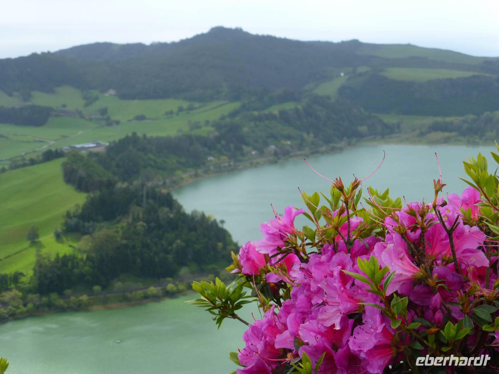 Von unserem Balkon konnten wir am frühen Morgen die riesigen Kreuzfahrtschiffe, die im Hafen anlegen wollten beobachten. Heute fuhren wir in Richtung Sete Cidades. Vorbei an grünen Felden und blühenden Azaleen fuhren wir Richtung Osten. Wir stoppten immer wieder , um ein paar Fotos zu schießen und somit die verschiedenen Grüntöne einzufangen. Unser erstes Ziel war eine Ananas-Plantage, wo man in Gewächshäusern die einzelnen Wachstumstadien der einzelnen Früchte betrachten konnte. Eine Ananas benötigt bis zu 18 Monate um hier zu reifen. Natürlich waren sind diese Früchte nicht ganz preiswert. Ein Schluck Ananas-Schnaps durfte natürlich auch nicht fehlen. Als nächstes besuchten wir ein etnographisches Museum. Versteckt hinter einer kleinen Hausfassade, hinter einen unscheinbaren Tür, verbirgt sich diese einmalige Sammlung von Antiquitäten der Insel. Diese wurden im Laufe der Jahre gesammelt und werden nun liebevoll in diesem Museum präsentiert. Wie ein kleines Dorf ist es angelegt und hinter jeder Ecke verbirgt sich etwas neues Spannendes. Nun ging es aber dann auf direktem Weg zu dem beiden Seen Lagoa Azul und Lagoa Verde. Das spannende an diesen Seen ist, dass beide direkt nebeneinander liegen und dennoch verschiedene Farben haben. Einer ist blau und einer ist grün. Das ist schon ein faszinierendes Naturwunder! Unsere Mittagspause wollten wir dann im kleinen Örtchen Sete Cidades verbringen. Wir kehrten in ein kleines Restaurant ein. Im Anschluss nutzte wir die Zeit, einen kleinen Spaziergang am See zu unternehmen und die Landschaft zu genießen.