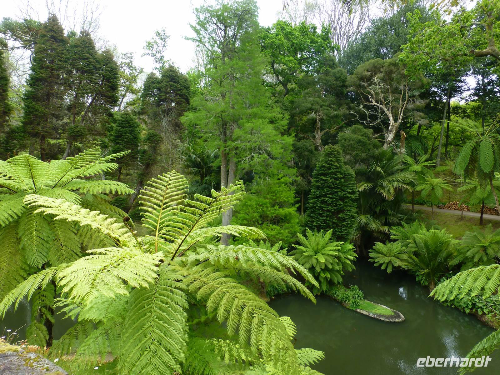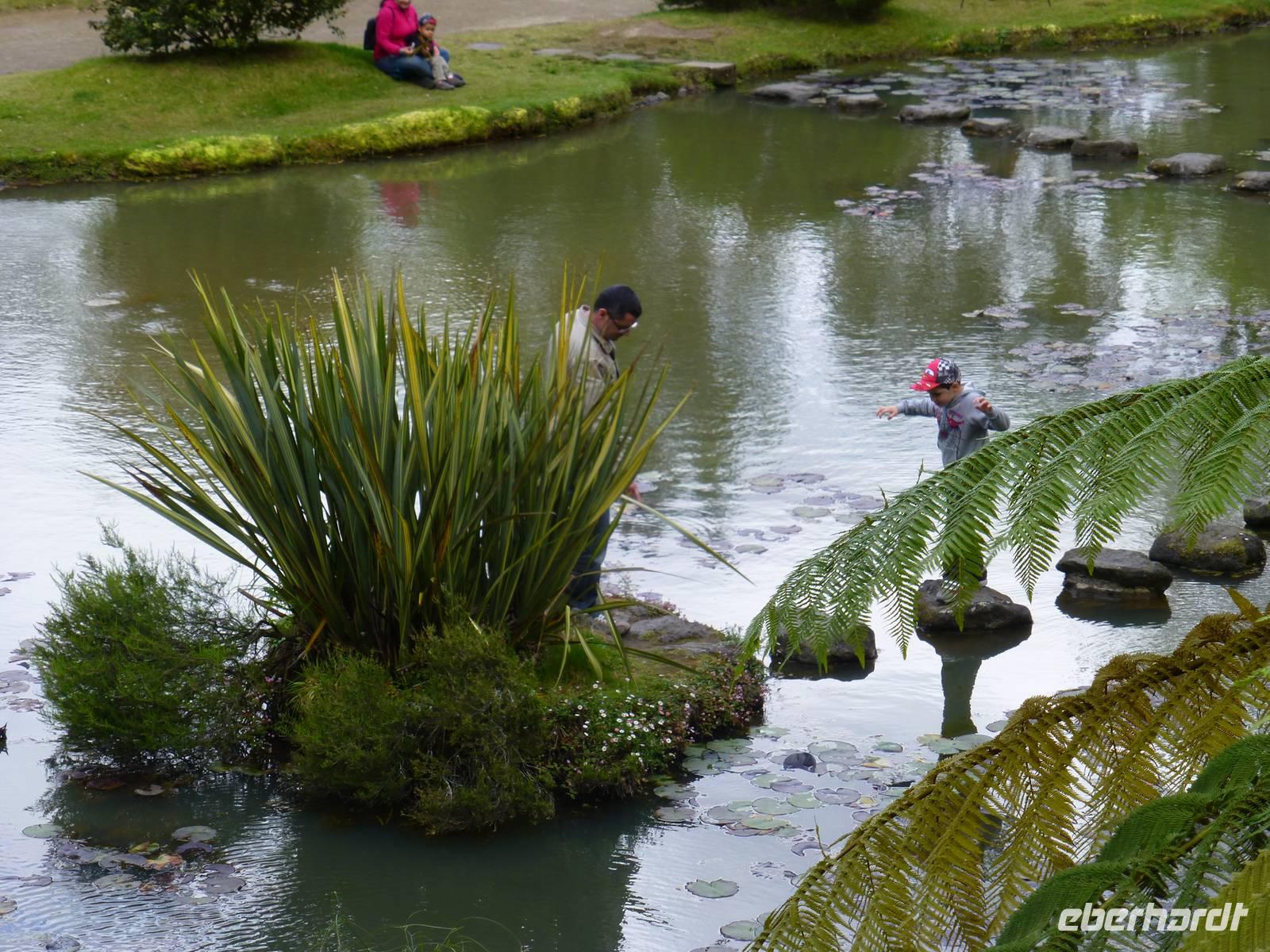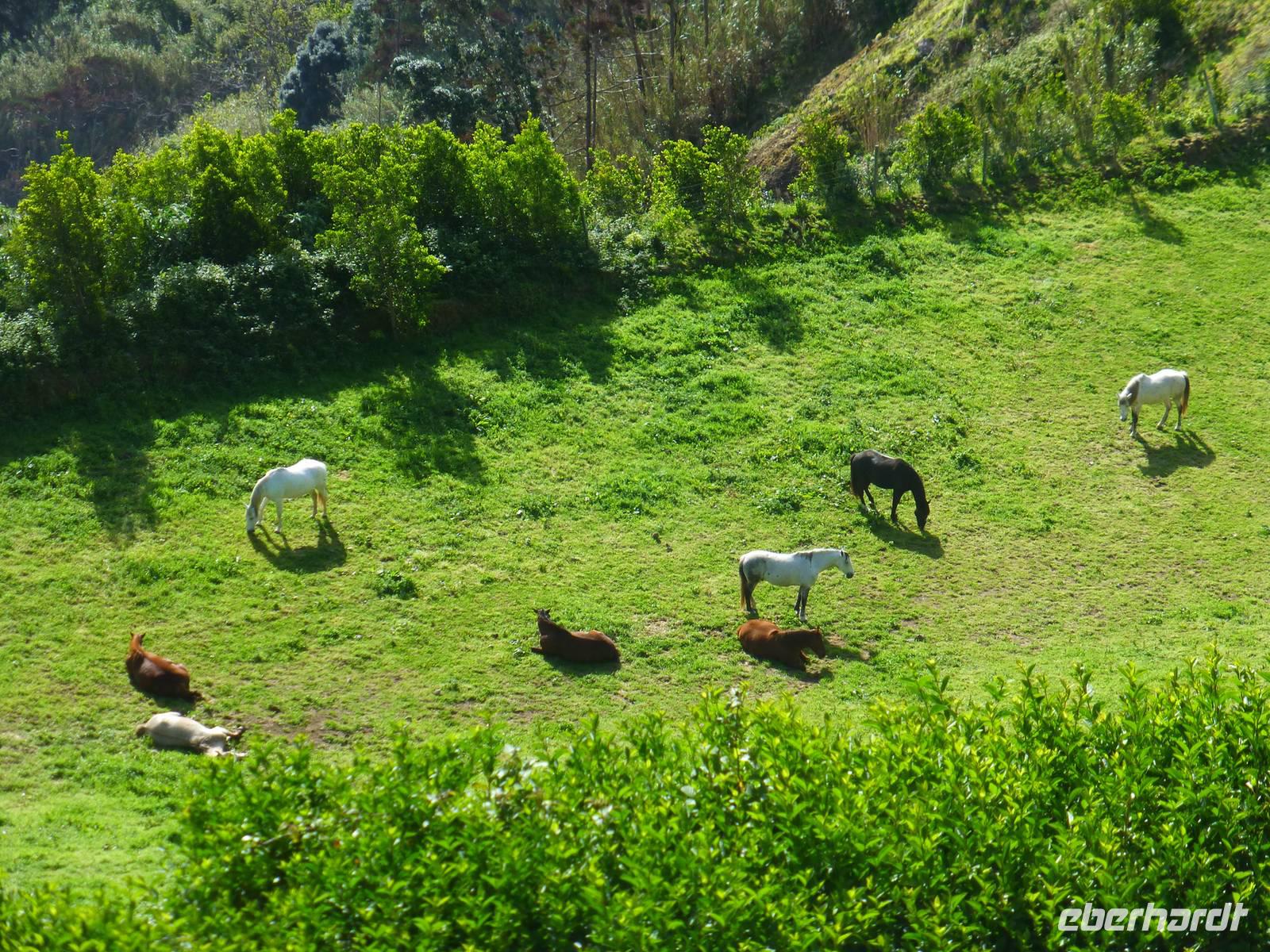 Von unserem Balkon konnten wir am frühen Morgen die riesigen Kreuzfahrtschiffe, die im Hafen anlegen wollten beobachten. Heute fuhren wir in Richtung Sete Cidades. Vorbei an grünen Felden und blühenden Azaleen fuhren wir Richtung Osten. Wir stoppten immer wieder , um ein paar Fotos zu schießen und somit die verschiedenen Grüntöne einzufangen. Unser erstes Ziel war eine Ananas-Plantage, wo man in Gewächshäusern die einzelnen Wachstumstadien der einzelnen Früchte betrachten konnte. Eine Ananas benötigt bis zu 18 Monate um hier zu reifen. Natürlich waren sind diese Früchte nicht ganz preiswert. Ein Schluck Ananas-Schnaps durfte natürlich auch nicht fehlen. Als nächstes besuchten wir ein etnographisches Museum. Versteckt hinter einer kleinen Hausfassade, hinter einen unscheinbaren Tür, verbirgt sich diese einmalige Sammlung von Antiquitäten der Insel. Diese wurden im Laufe der Jahre gesammelt und werden nun liebevoll in diesem Museum präsentiert. Wie ein kleines Dorf ist es angelegt und hinter jeder Ecke verbirgt sich etwas neues Spannendes. Nun ging es aber dann auf direktem Weg zu dem beiden Seen Lagoa Azul und Lagoa Verde. Das spannende an diesen Seen ist, dass beide direkt nebeneinander liegen und dennoch verschiedene Farben haben. Einer ist blau und einer ist grün. Das ist schon ein faszinierendes Naturwunder! Unsere Mittagspause wollten wir dann im kleinen Örtchen Sete Cidades verbringen. Wir kehrten in ein kleines Restaurant ein. Im Anschluss nutzte wir die Zeit, einen kleinen Spaziergang am See zu unternehmen und die Landschaft zu genießen.