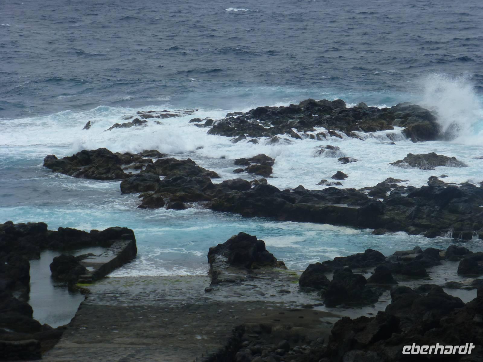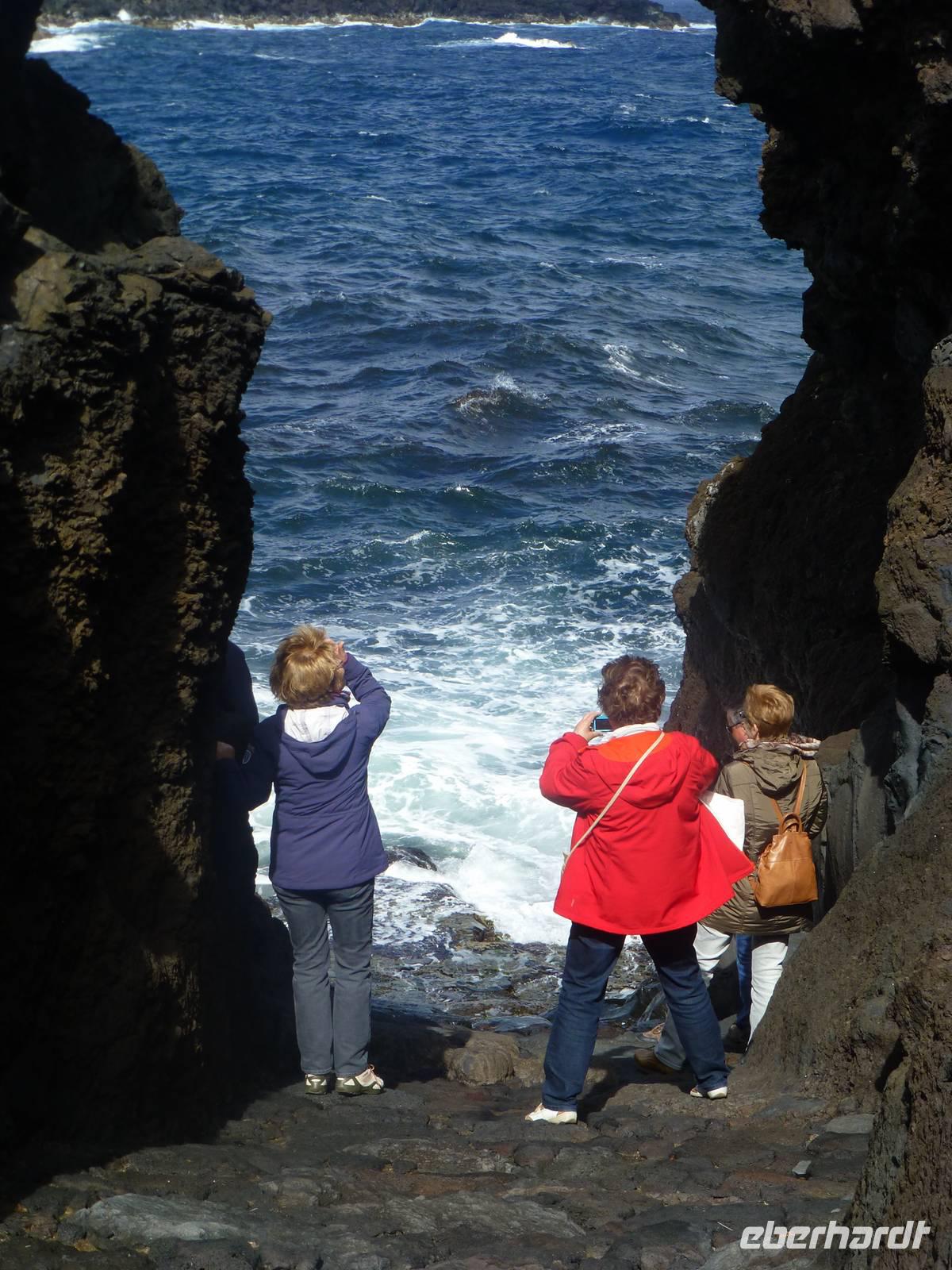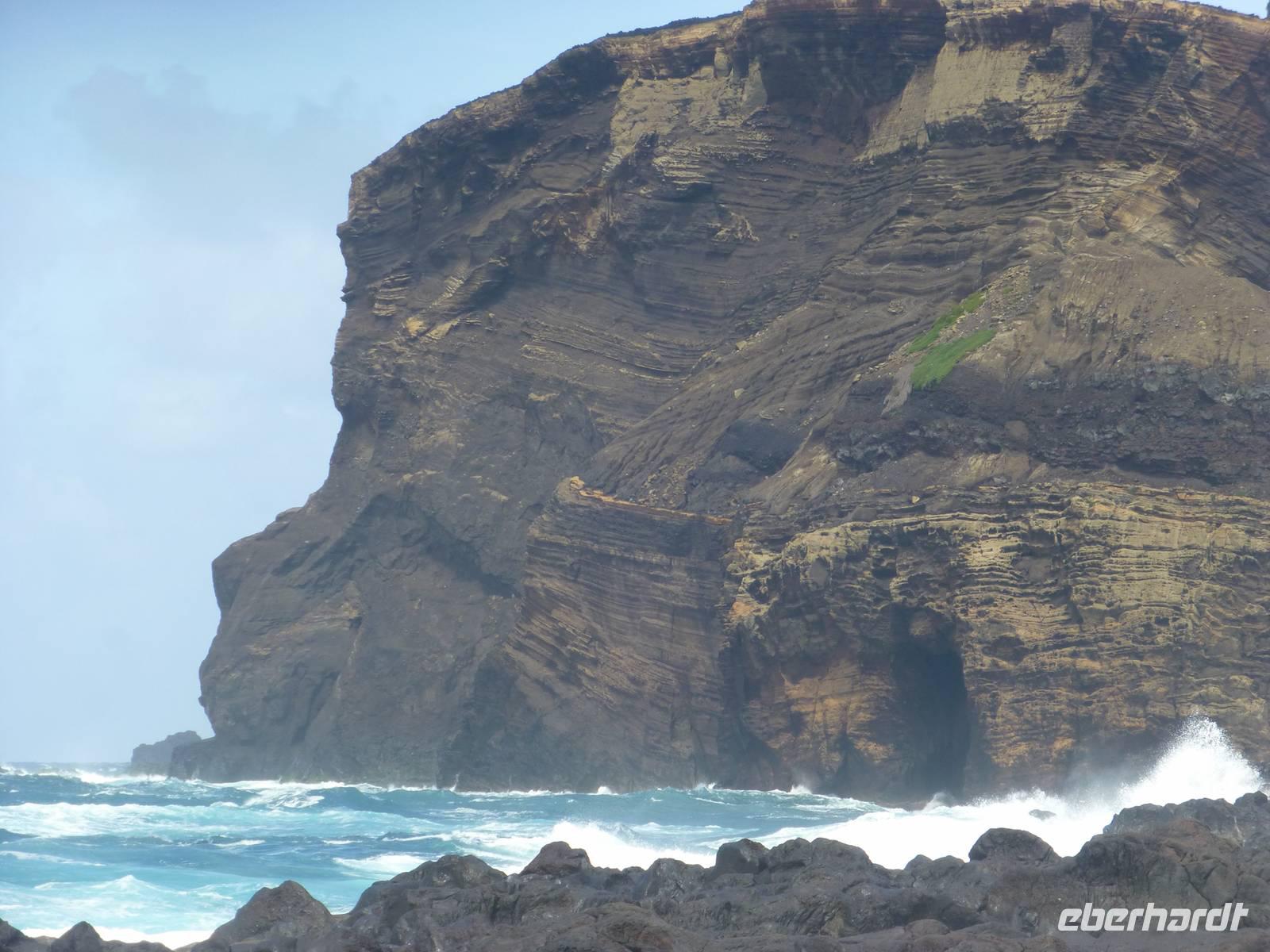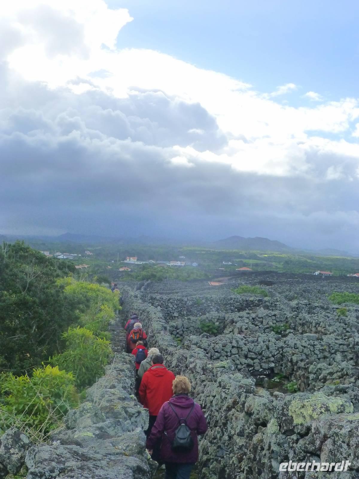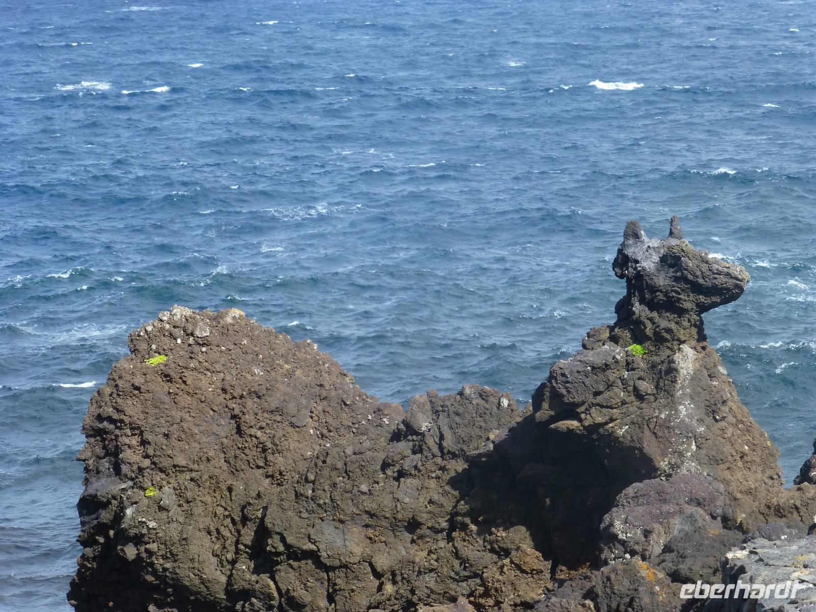 Heute hieß es zeitig aufstehen den die Insel Pico wartete auf unseren Besuch. Wir fuhren zum Hafen. Dort wartete schon unsere Fähre, die uns nach Pico bringen sollte. Etwa eine halbe Stunde dauerte die Überfahrt mit vielen Fotomotiven. Wir stiegen in den Bus, der für uns an diesem Tag bereit stand und begannen unsere Inselrundfahrt. Als erstes erreichten wir den kleinen Ort Cacherro. Hier kann man das Meer beobachten, wie es zwischen dem Lavagestein immer wieder ins Landesinnere schießt und welche gewaltige Kraft es dabei ausübt. Dabei formen sich auch die merkwürdigsten Dinge aus dem Stein. An einer Stelle meint man doch tatsächlich einen Hundekopf erkennen zu können. Im Anschluss fuhren wir dann in das Weinanbaugebiet von Pico und schossen hier noch ein paar schöne Bilder. Wir waren erstaunt wie der Wein in dem Lavagestein angebaut wird. Zum Mittagessen kehrten wir in ein Weingut ein. Wo wir reichlich Schlemmen konnten und natürlich den eigenen Wein und Schnaps probiert haben. Der Pico zeigte sich heute leider nicht. Noch verschieden Foto Stopps und dann war der faszinierende Tag auch schon wieder fast vorbei und wir fuhren mit der Fähre zurück nach Horta. Unser Abendessen konnten wir heute selbst zubereiten. Ein besonderes Vergnügen ein Essen auf dem heißen Lavastein. Es war sehr reichlich und der Wein mundete auch.