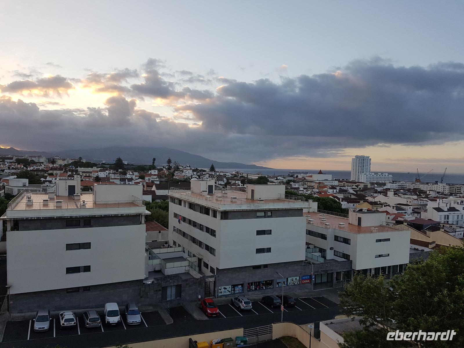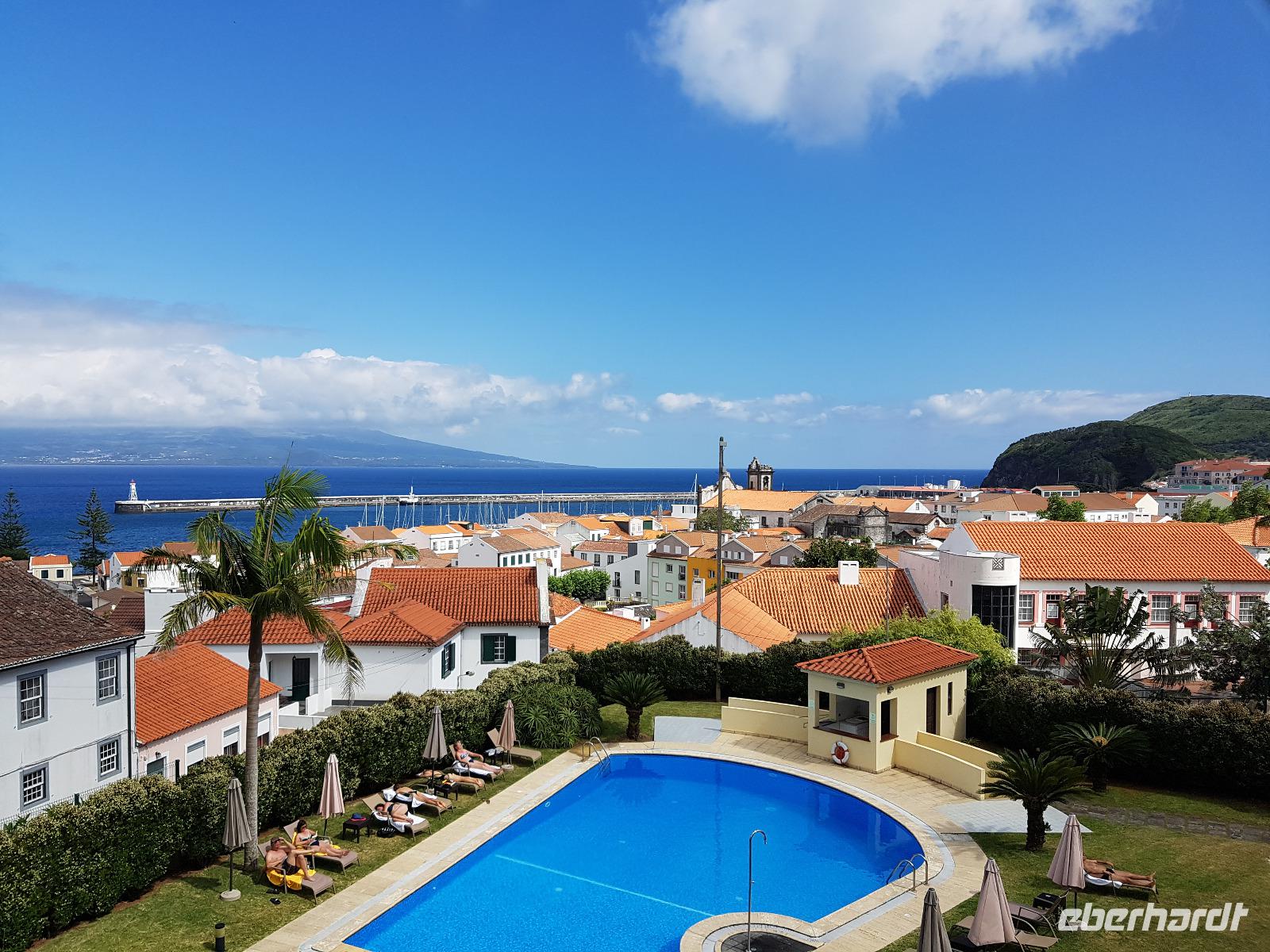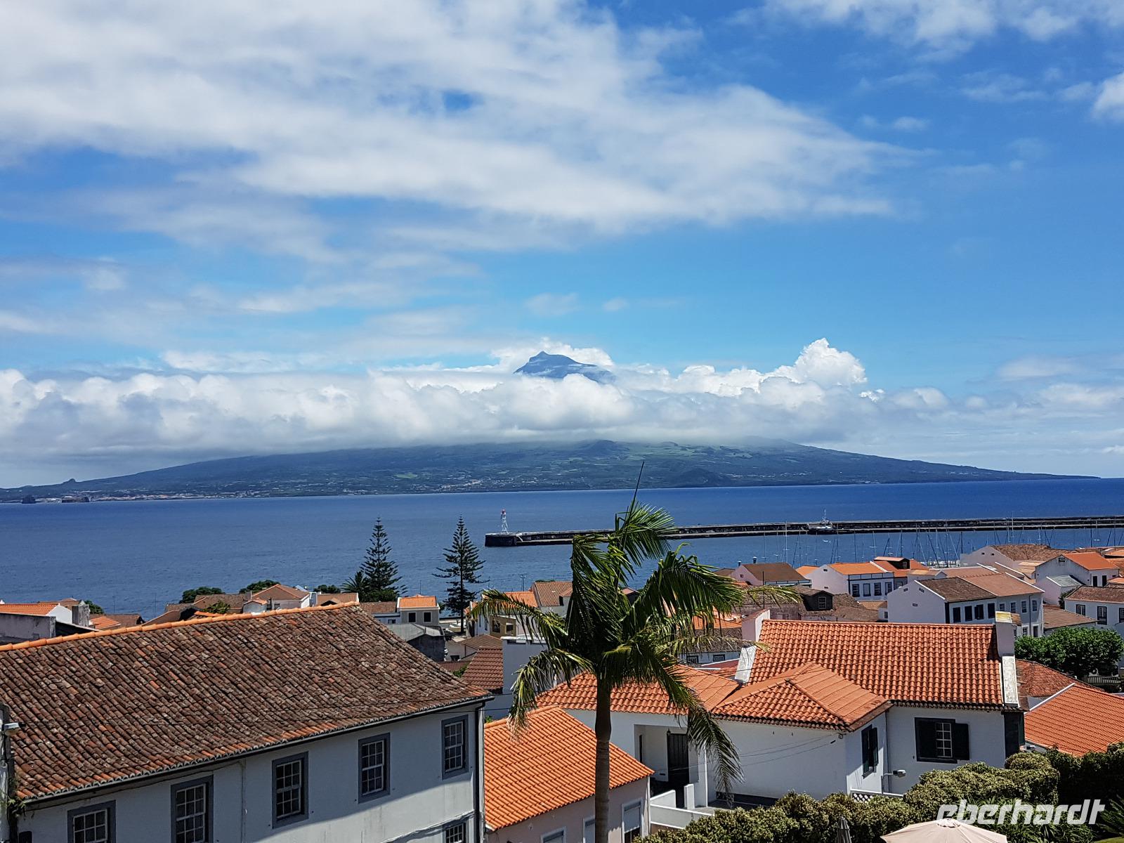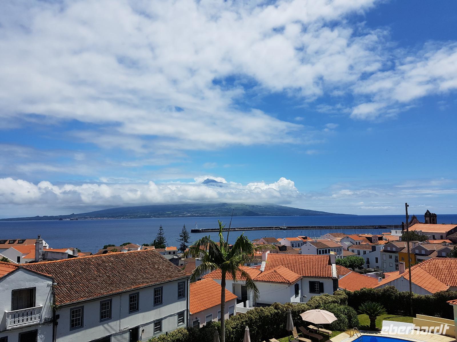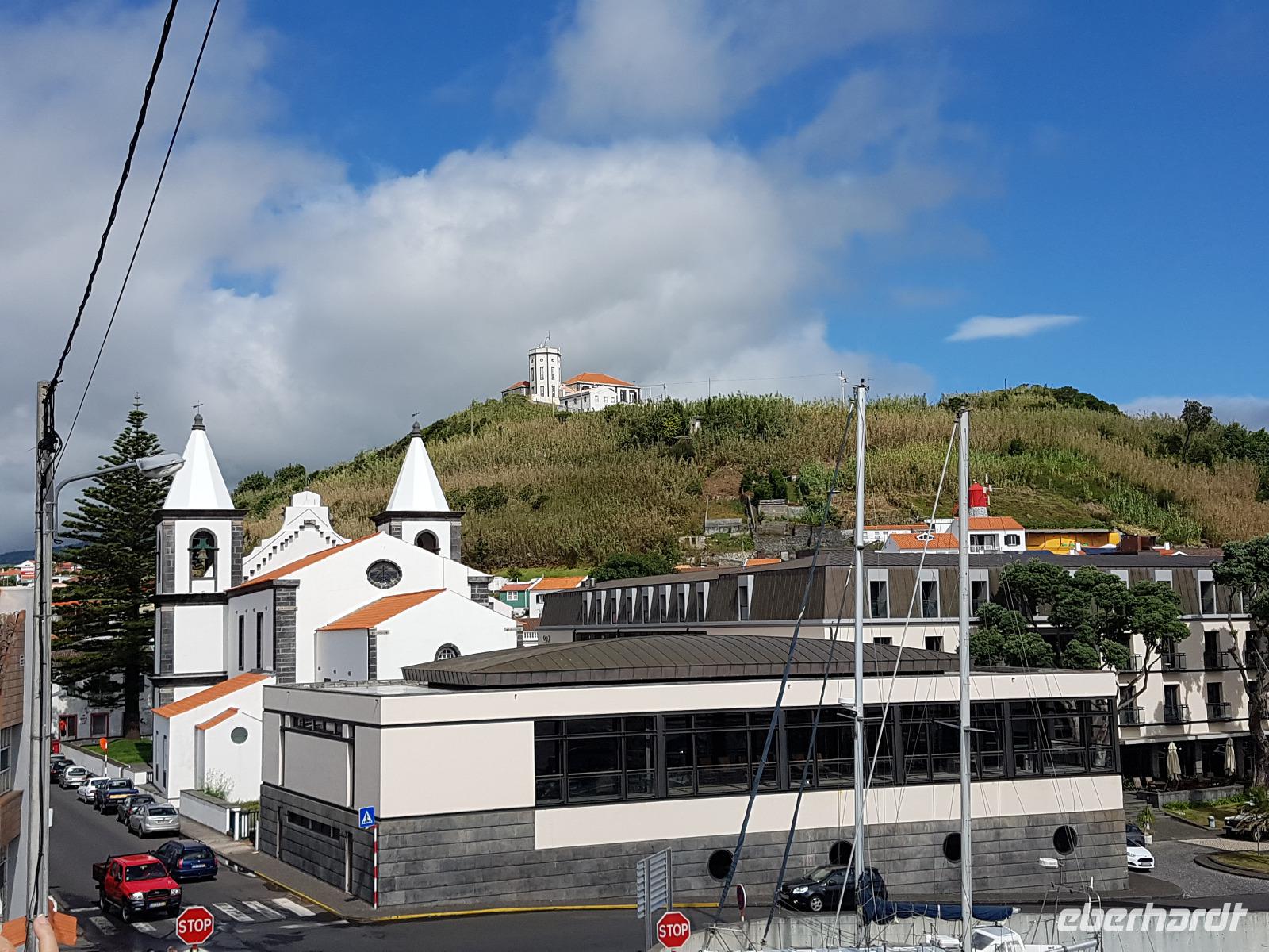 Zurück im Hotel räumten wir die Zimmer und genossen die Wartezeit bis zur Abholung auf der Terrasse unseres Hotels. Und plötzlich zogen die Wolken auf und wir sahen die Spitze des Vulkanes Pico. Ein grandioser Anblick und gerade noch rechtzeitig vor unserer Abreise. Am Nachmittag flogen wir dann zurück auf die Insel Sao Miguel und checkten ein im uns schon bekannten Park Hotel Sao Miguel. Unser Abendssen nahmen wir wieder bei der Kirche im Cafe Central ein.