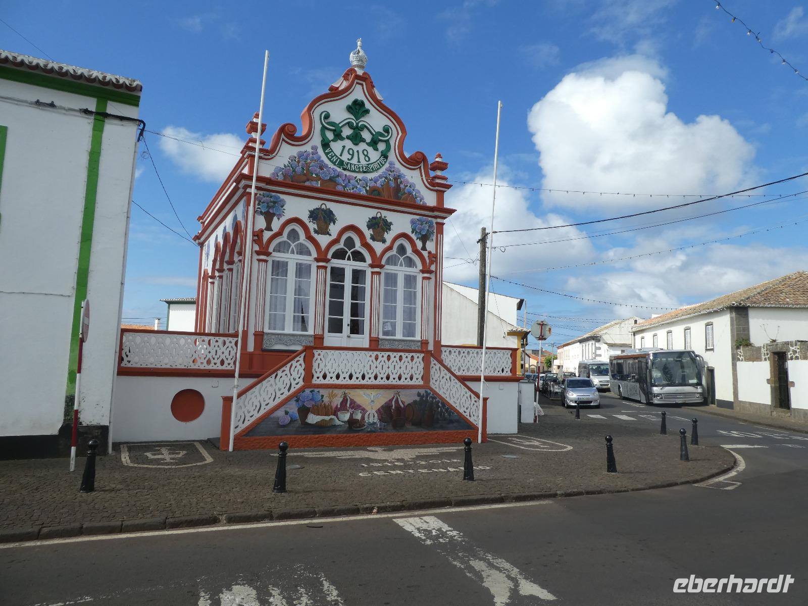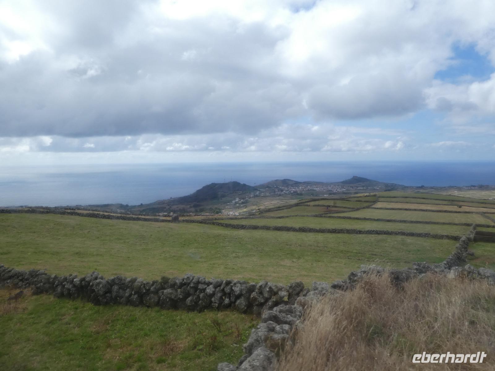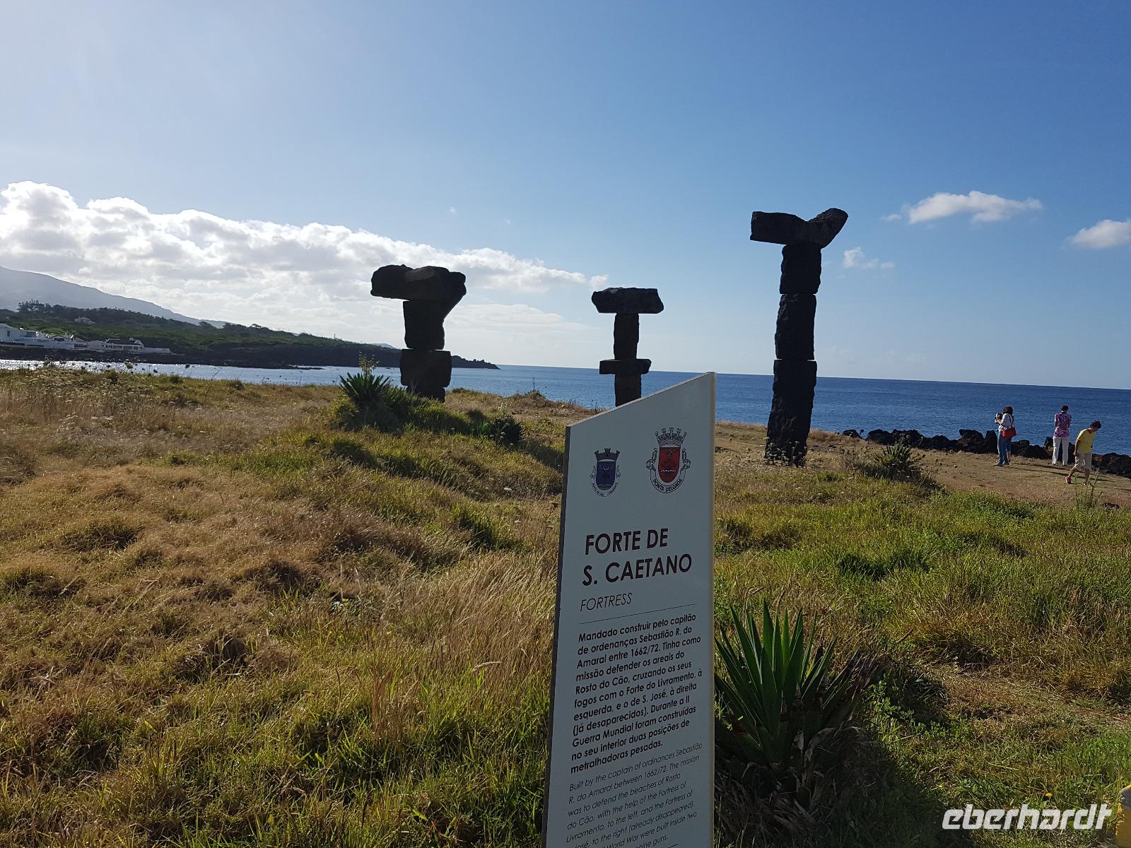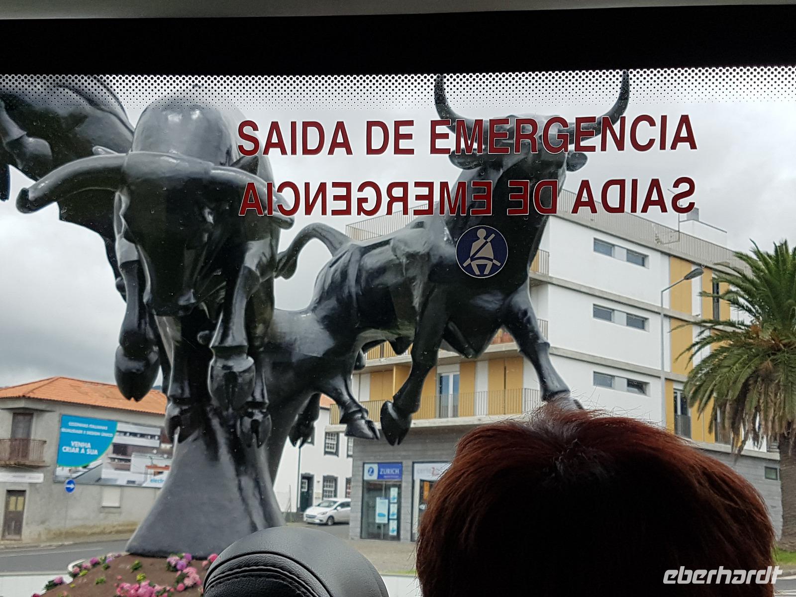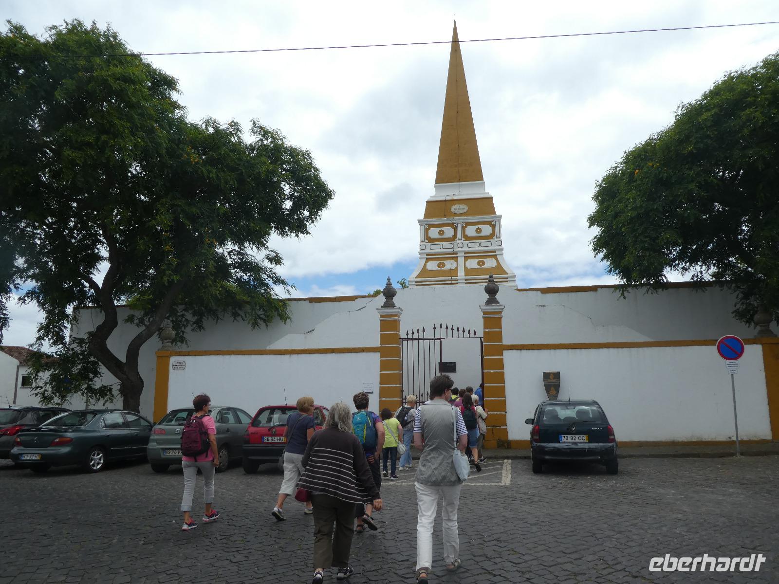 Nach dem Frühstück starteten wir unsere Rundfahrt auf den Monte Brasil mit herrlicher Aussicht auf Angra und auch unser Hotel. Der Berg ist grössten Teils von einer Festungsmauer umgeben und auch das Militär war dort präsent. Weiter fuhren wir noch einmal durch Agra und später oberhalb der Küste durch Ribeirinha. Im Dorf wurde schon alles für das bevorstehende Fest geschmückt und natürlich findet dort auch eine Tourada statt. Über dem Dorf liegen die Viehweiden und sind durch Steinmauern getrennt. Unsere nächster Halt war in Sao Sebastiao mit Besuch eines Heiliggeist Hauses und der Kirche mit wunderschönen Mosaiken an den Wänden.