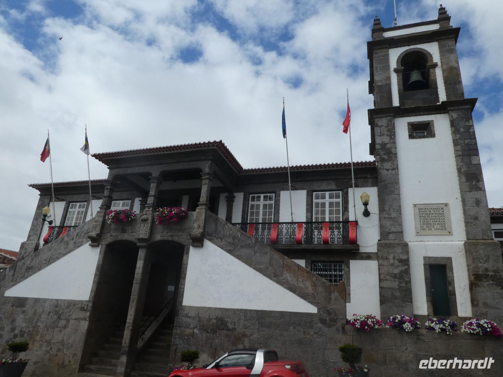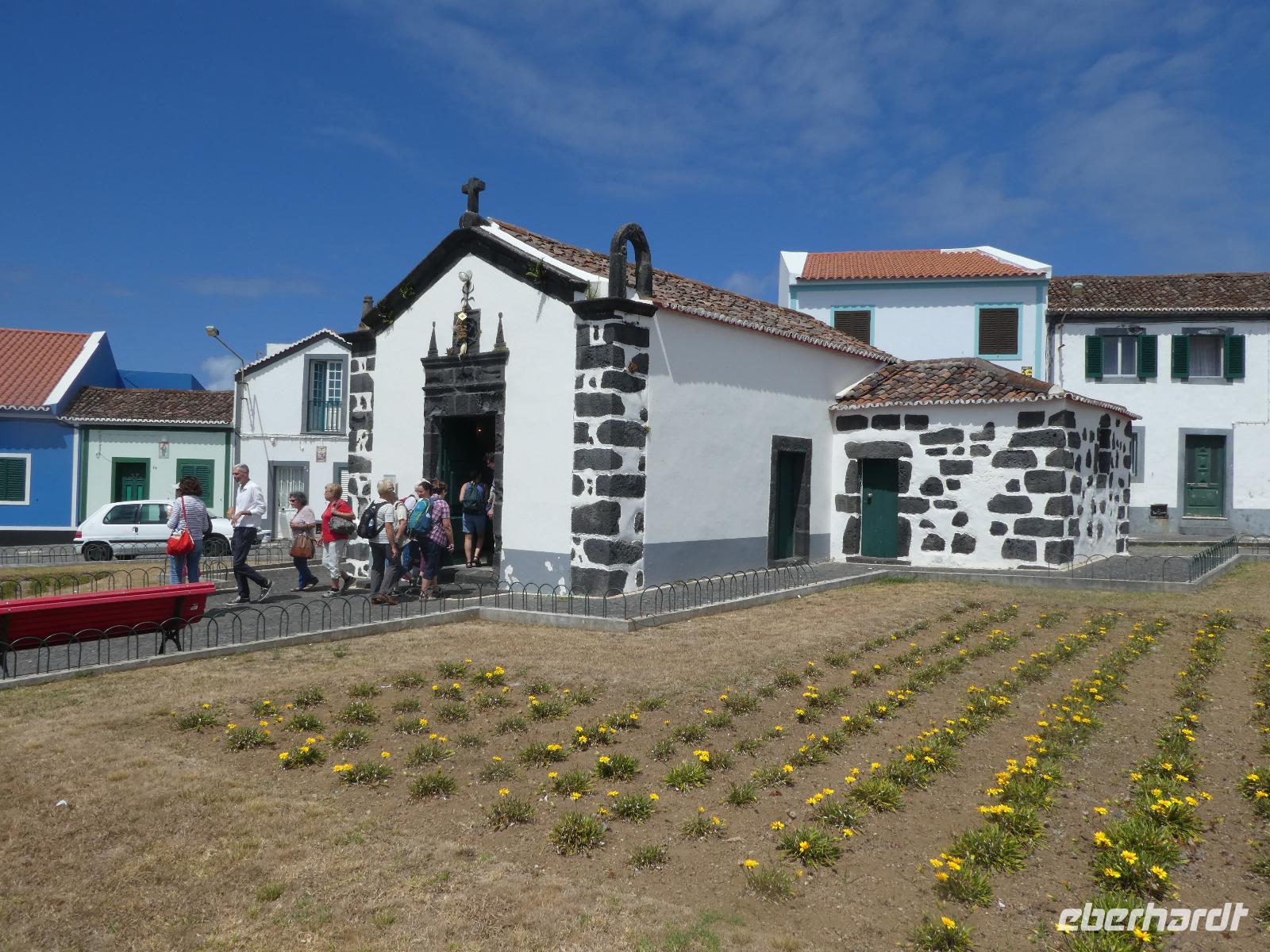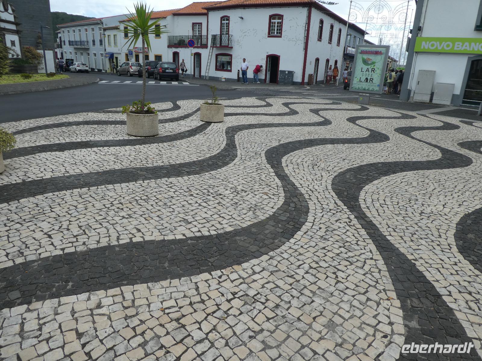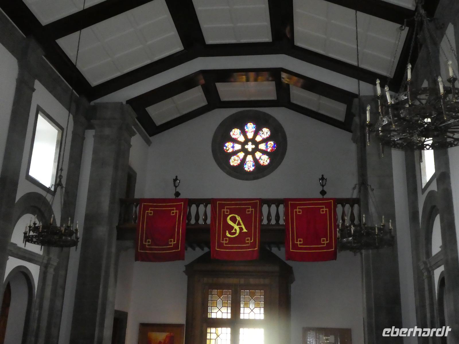 Nach dem Frühstück starteten wir unsere Rundfahrt auf den Monte Brasil mit herrlicher Aussicht auf Angra und auch unser Hotel. Der Berg ist grössten Teils von einer Festungsmauer umgeben und auch das Militär war dort präsent. Weiter fuhren wir noch einmal durch Agra und später oberhalb der Küste durch Ribeirinha. Im Dorf wurde schon alles für das bevorstehende Fest geschmückt und natürlich findet dort auch eine Tourada statt. Über dem Dorf liegen die Viehweiden und sind durch Steinmauern getrennt. Unsere nächster Halt war in Sao Sebastiao mit Besuch eines Heiliggeist Hauses und der Kirche mit wunderschönen Mosaiken an den Wänden.