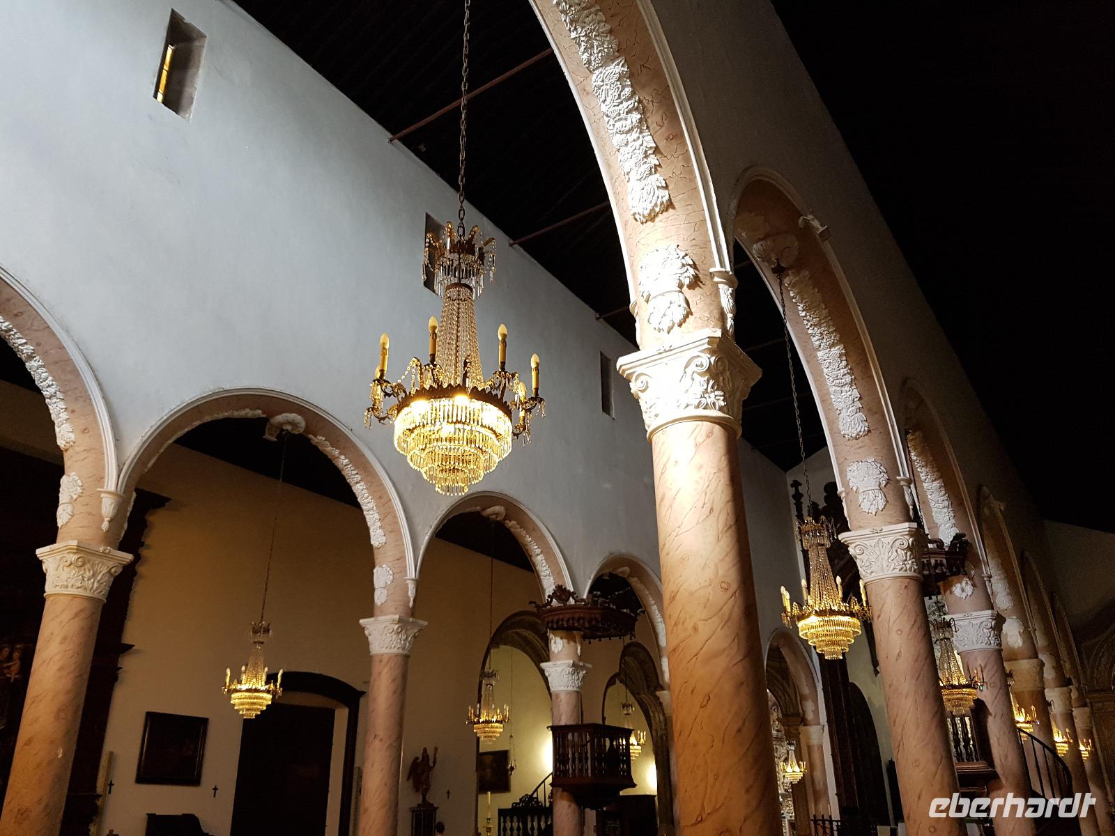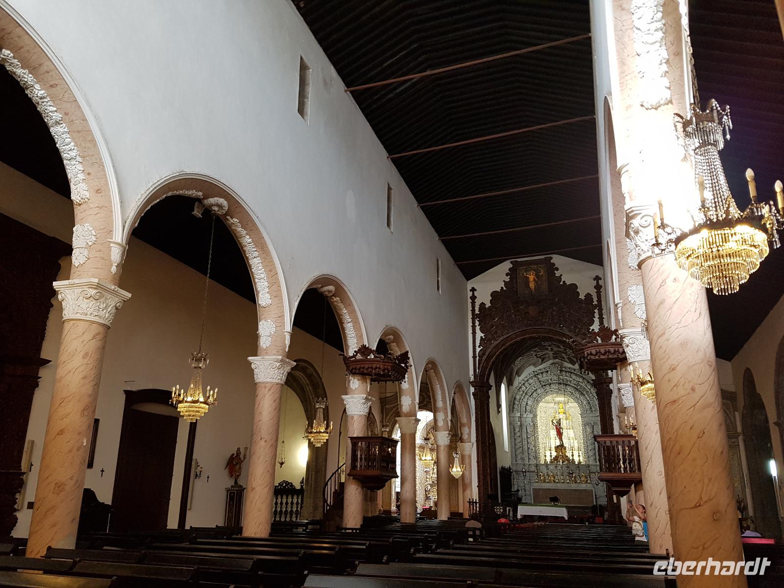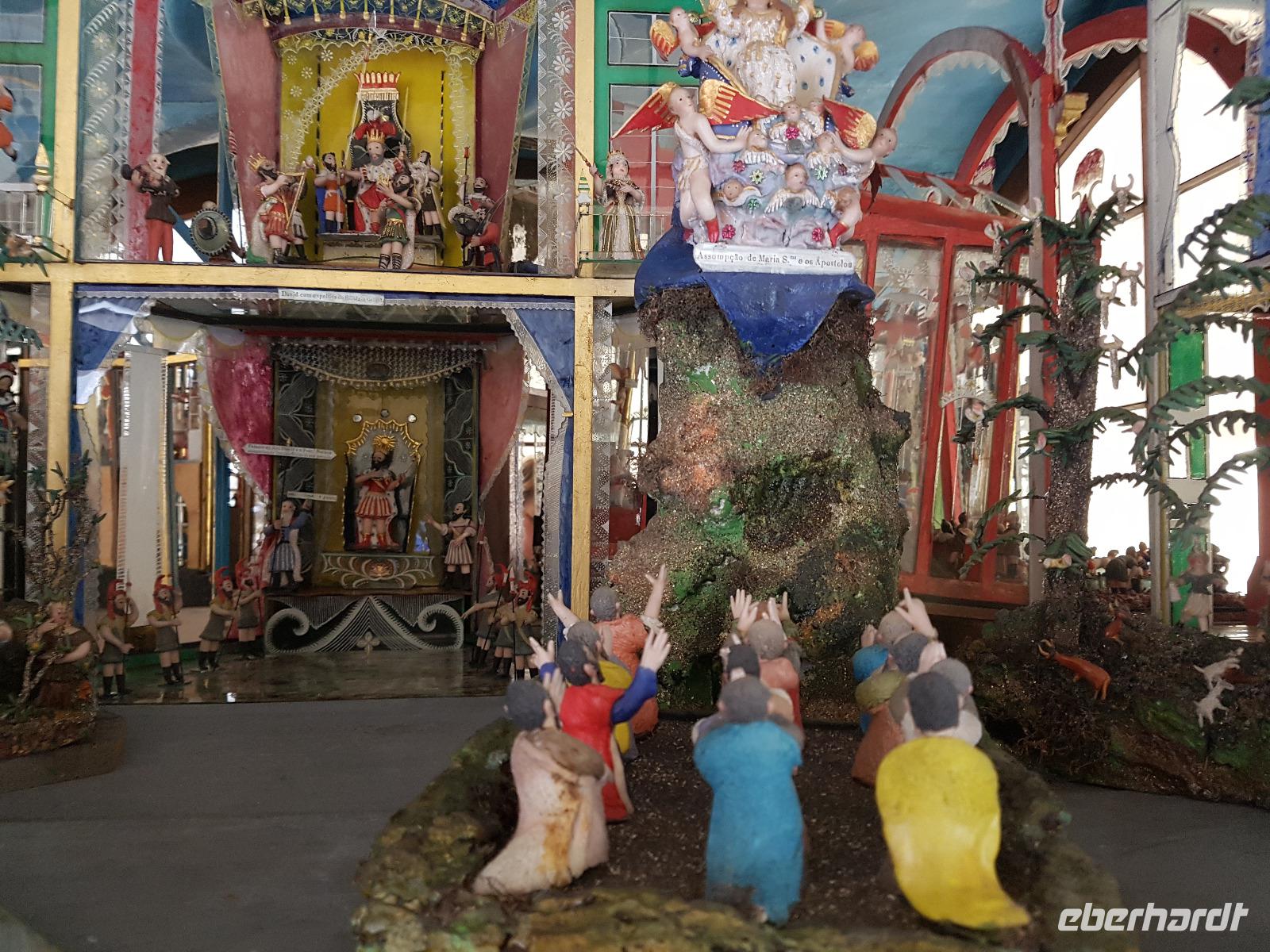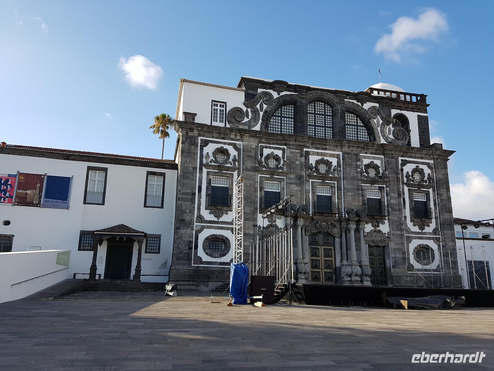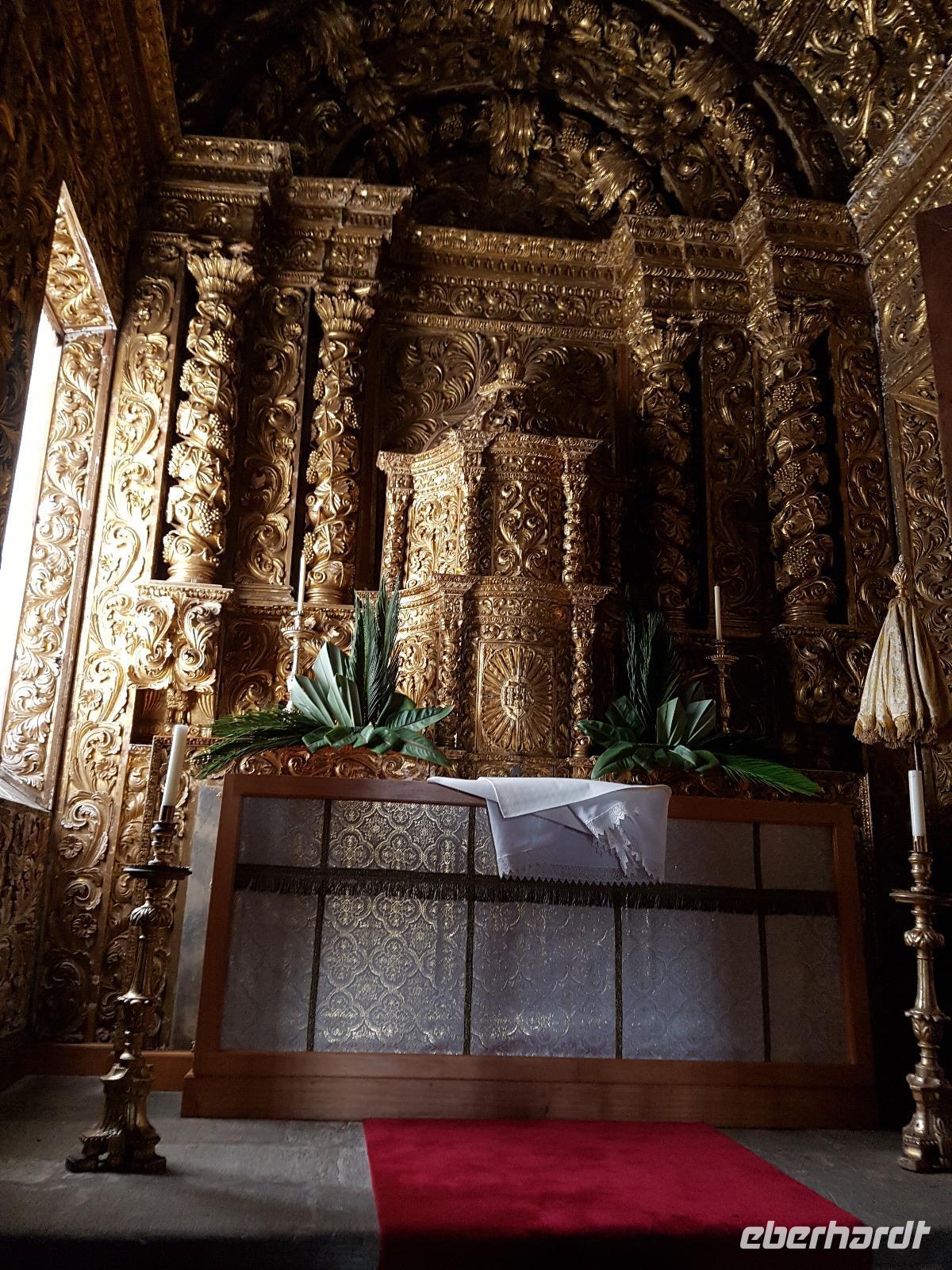 Nach dem Frühstück starteten wir unsere Rundfahrt auf den Monte Brasil mit herrlicher Aussicht auf Angra und auch unser Hotel. Der Berg ist grössten Teils von einer Festungsmauer umgeben und auch das Militär war dort präsent. Weiter fuhren wir noch einmal durch Agra und später oberhalb der Küste durch Ribeirinha. Im Dorf wurde schon alles für das bevorstehende Fest geschmückt und natürlich findet dort auch eine Tourada statt. Über dem Dorf liegen die Viehweiden und sind durch Steinmauern getrennt. Unsere nächster Halt war in Sao Sebastiao mit Besuch eines Heiliggeist Hauses und der Kirche mit wunderschönen Mosaiken an den Wänden.
