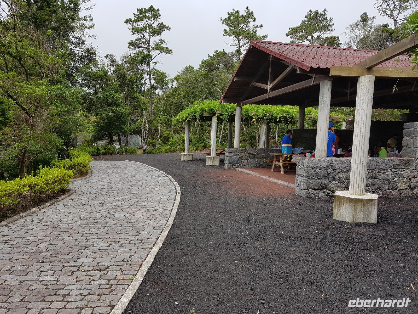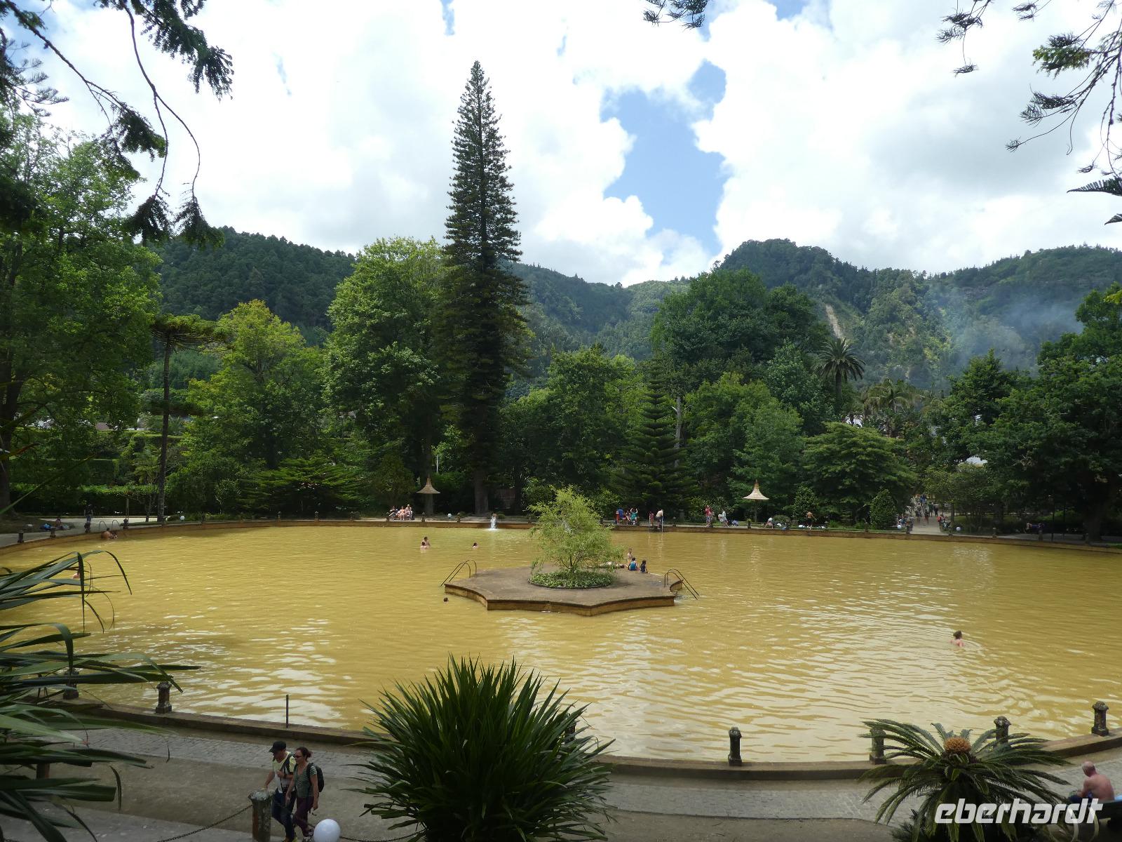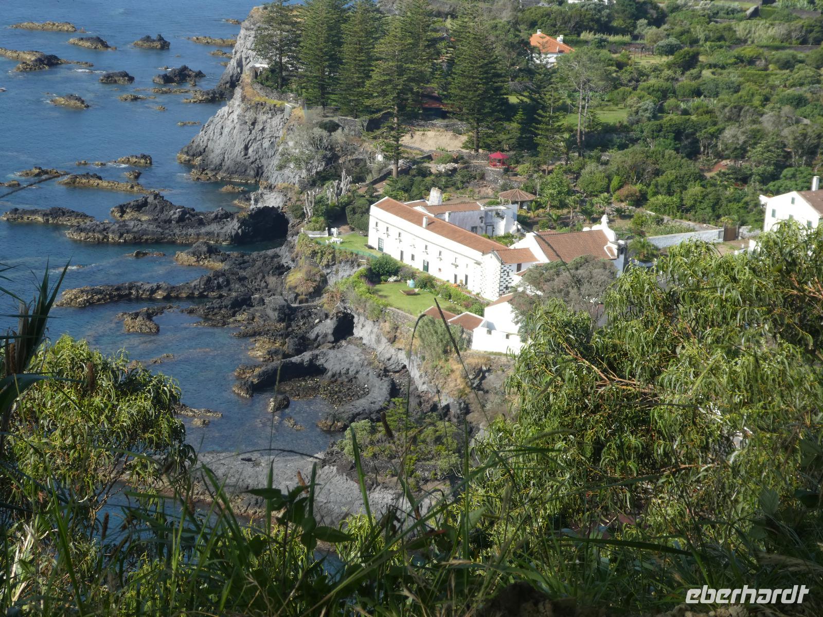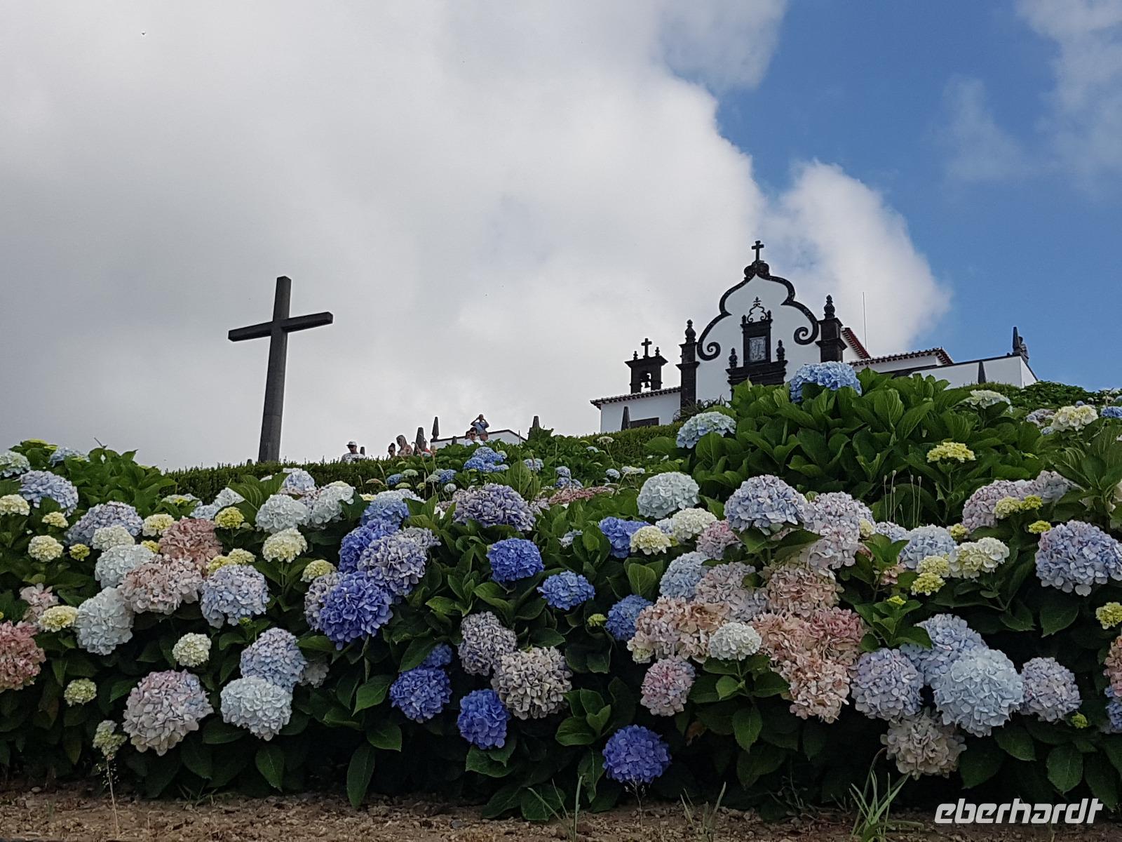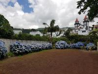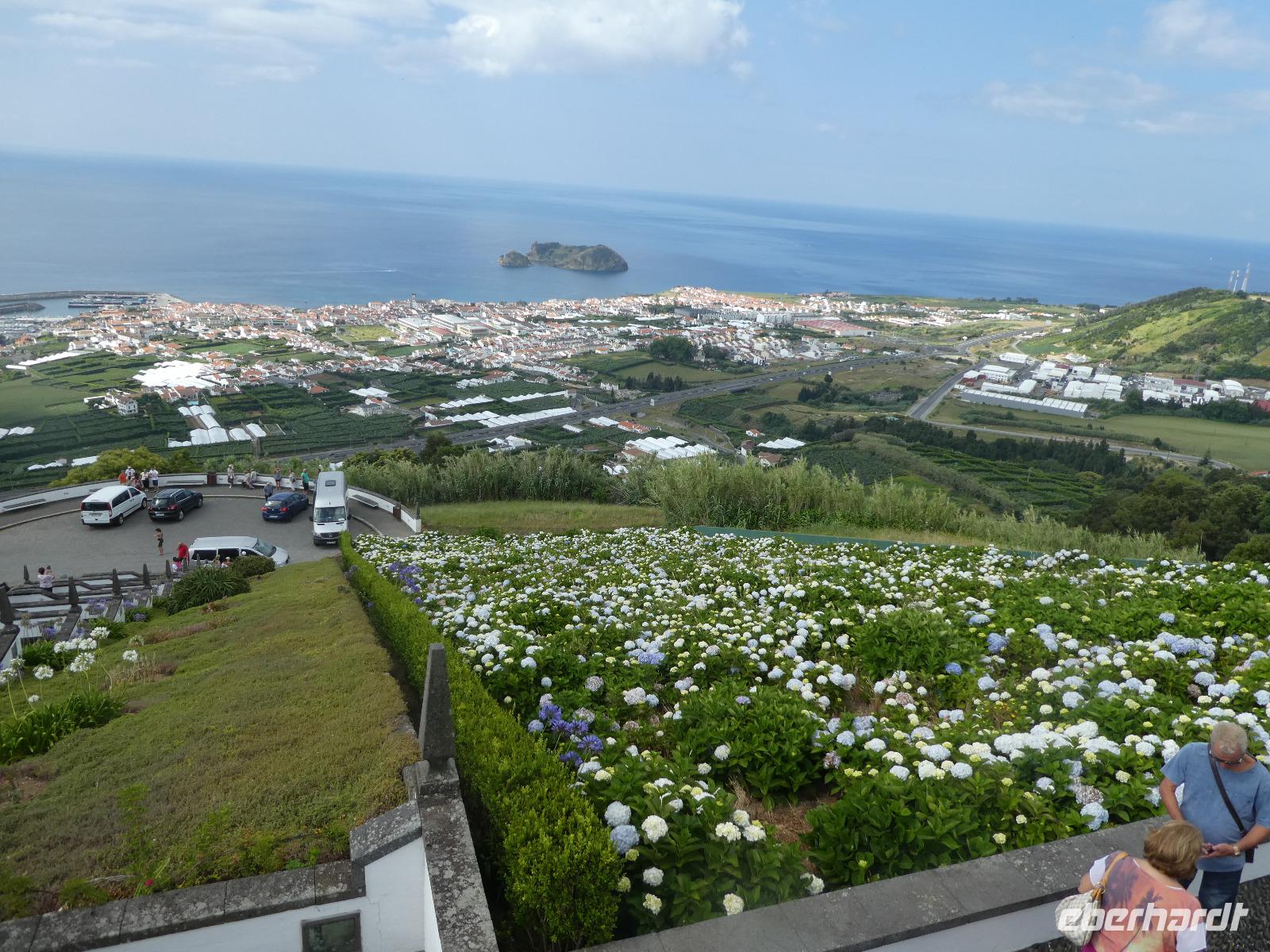 Heute fuhren wir noch einmal Richtung Osten, aber diesmal auf der Schnellstrasse bis nach Vila Franca do Campo. Unterwegs machten wir Halt mit schöner Aussicht hinunter zu einem Lavatunnel und dem Kloster Calura. Dann folgte ein zweiter Halt beim Felsen der Klippenspringer. In Vila Franco probierten wir die berühmten kleinen Käsekuchen Queijadas und kauften sie auch gleich als Mitbringsel ein. Oberhalb des Ortes liegt die berühmte Wallfahrtskirche Mutter Gottes des Friedens und dort lag unser nächstes Ziel. Wir stiegen die vielen Treppen hinauf und hatten von oben eine traumhafte Aussicht. Zahlreiche Hortensien säumten die Straßenränder sowie die Hänge neben dem Treppenaufgang. Unsere Fahrt ging weiter nach Furnas hinunter zu den Quellen und brodelnden Erdlöcher. In einem wurde gerade Mais gegart. Oben am Furnassee sahen wir dann wie der Topf mit unserem Mittagessen Cozido aus dem heissen Erdloch gezogen wurde. Danach probierten wir diese Köstlichkeit in Tonys Restaurant. Den Nachmittag verbrachten wir im Park Terra Nostra zunächst mit einem ausgiebigen Rundgang, um das reichliche Mittagessen zu verdauen und die Pflanzenpracht des Parkes zu bestaunen. Den Abschluss bildete ein Bad im 38 Grad warmen Wasser. Auf der Rückfahrt hielten wir hoch oben über Furnas an einem Aussichtspunkt und fuhren dann noch weiter bis zur Teeplantage von Gorreana. Joaquim führte uns durch die Produktion und nach der Verkostung wurde fleissig Tee gekauft. Zum Abendessen spazierten wir wieder hinunter ins Zentrum und fanden Platz im Cafe Central gegenüber der Hauptkirche.