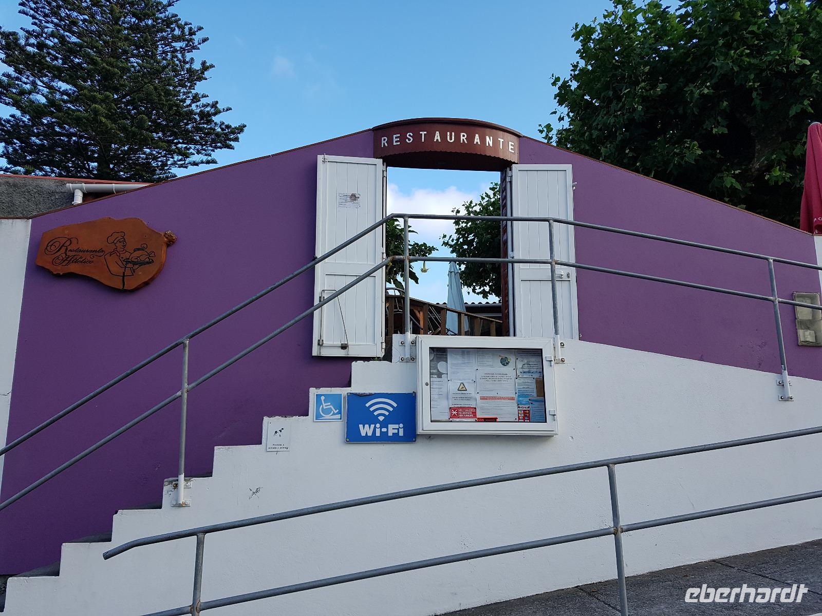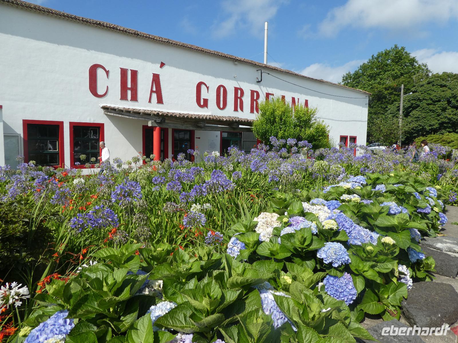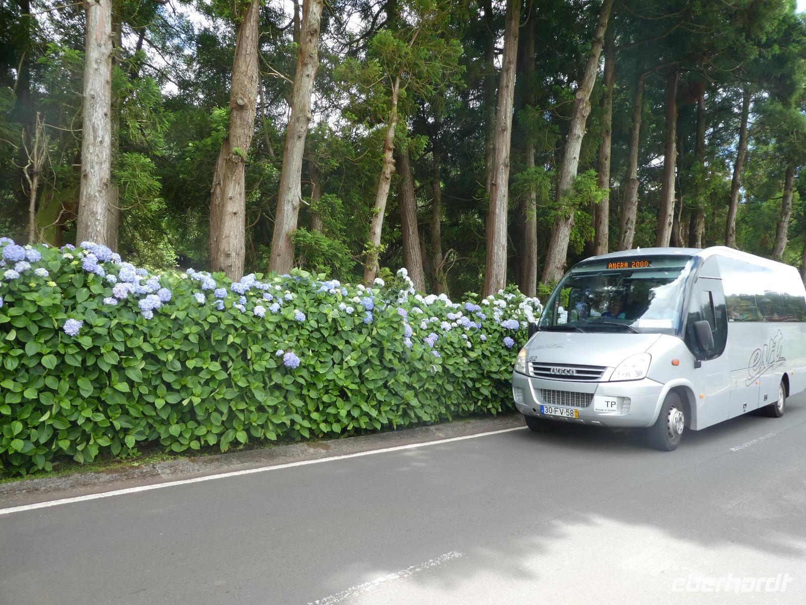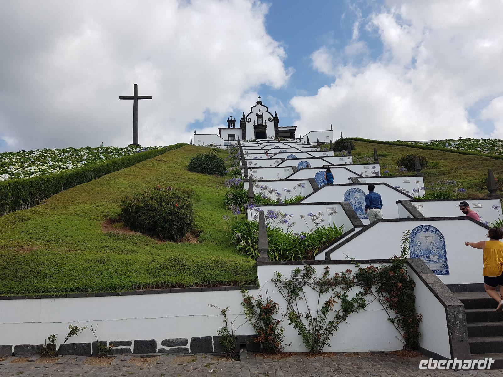 Heute fuhren wir noch einmal Richtung Osten, aber diesmal auf der Schnellstrasse bis nach Vila Franca do Campo. Unterwegs machten wir Halt mit schöner Aussicht hinunter zu einem Lavatunnel und dem Kloster Calura. Dann folgte ein zweiter Halt beim Felsen der Klippenspringer. In Vila Franco probierten wir die berühmten kleinen Käsekuchen Queijadas und kauften sie auch gleich als Mitbringsel ein. Oberhalb des Ortes liegt die berühmte Wallfahrtskirche Mutter Gottes des Friedens und dort lag unser nächstes Ziel. Wir stiegen die vielen Treppen hinauf und hatten von oben eine traumhafte Aussicht. Zahlreiche Hortensien säumten die Straßenränder sowie die Hänge neben dem Treppenaufgang. Unsere Fahrt ging weiter nach Furnas hinunter zu den Quellen und brodelnden Erdlöcher. In einem wurde gerade Mais gegart. Oben am Furnassee sahen wir dann wie der Topf mit unserem Mittagessen Cozido aus dem heissen Erdloch gezogen wurde. Danach probierten wir diese Köstlichkeit in Tonys Restaurant. Den Nachmittag verbrachten wir im Park Terra Nostra zunächst mit einem ausgiebigen Rundgang, um das reichliche Mittagessen zu verdauen und die Pflanzenpracht des Parkes zu bestaunen. Den Abschluss bildete ein Bad im 38 Grad warmen Wasser. Auf der Rückfahrt hielten wir hoch oben über Furnas an einem Aussichtspunkt und fuhren dann noch weiter bis zur Teeplantage von Gorreana. Joaquim führte uns durch die Produktion und nach der Verkostung wurde fleissig Tee gekauft. Zum Abendessen spazierten wir wieder hinunter ins Zentrum und fanden Platz im Cafe Central gegenüber der Hauptkirche.