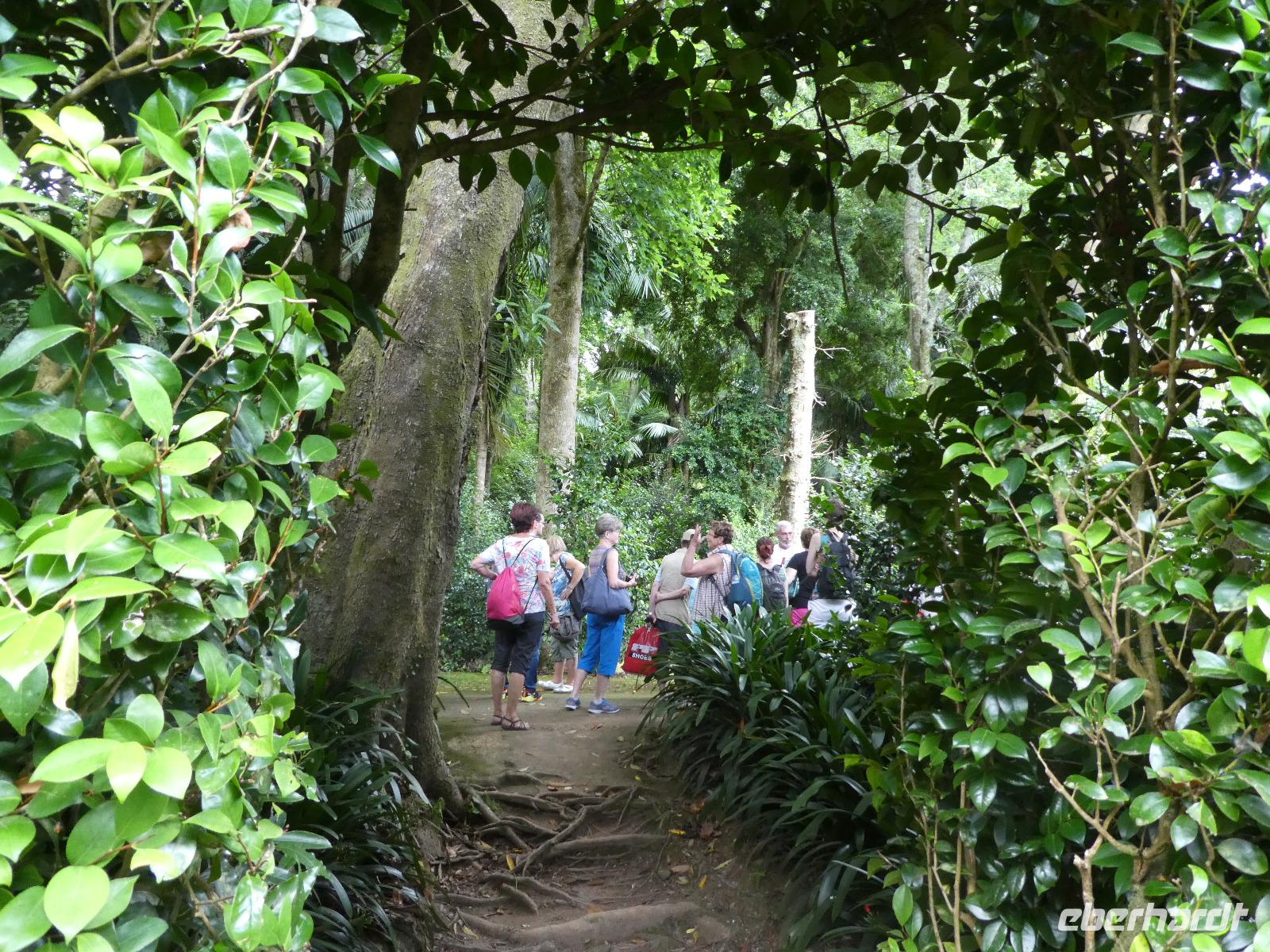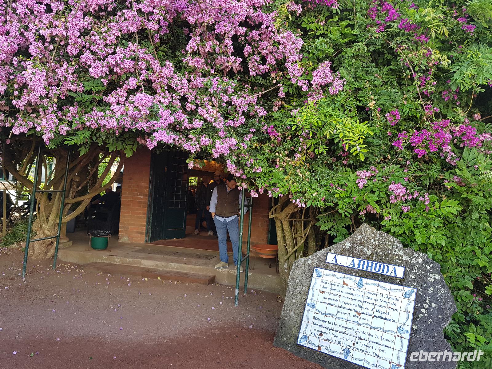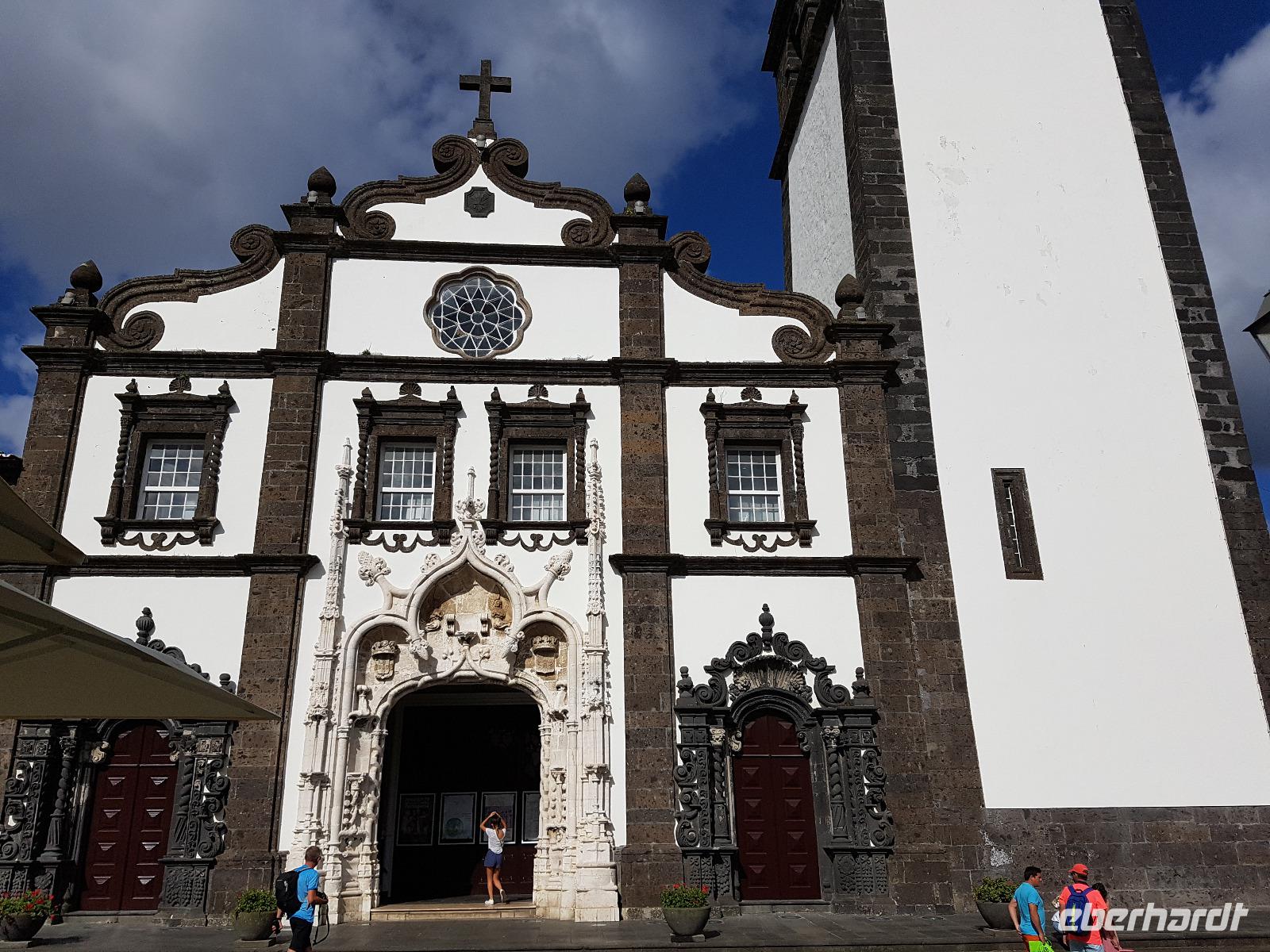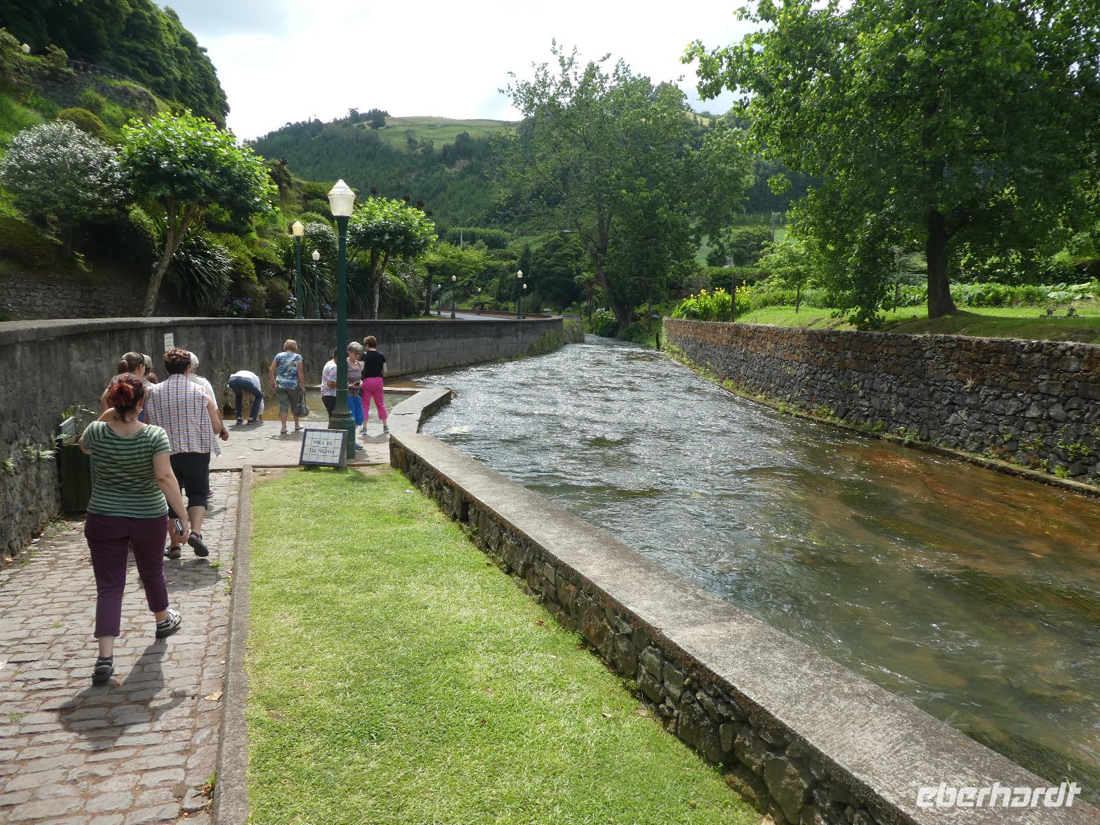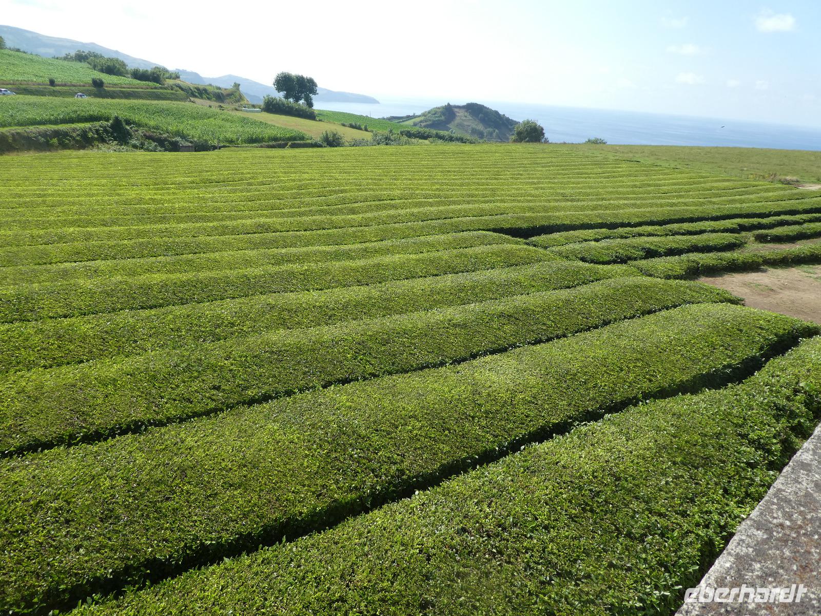 Heute fuhren wir noch einmal Richtung Osten, aber diesmal auf der Schnellstrasse bis nach Vila Franca do Campo. Unterwegs machten wir Halt mit schöner Aussicht hinunter zu einem Lavatunnel und dem Kloster Calura. Dann folgte ein zweiter Halt beim Felsen der Klippenspringer. In Vila Franco probierten wir die berühmten kleinen Käsekuchen Queijadas und kauften sie auch gleich als Mitbringsel ein. Oberhalb des Ortes liegt die berühmte Wallfahrtskirche Mutter Gottes des Friedens und dort lag unser nächstes Ziel. Wir stiegen die vielen Treppen hinauf und hatten von oben eine traumhafte Aussicht. Zahlreiche Hortensien säumten die Straßenränder sowie die Hänge neben dem Treppenaufgang. Unsere Fahrt ging weiter nach Furnas hinunter zu den Quellen und brodelnden Erdlöcher. In einem wurde gerade Mais gegart. Oben am Furnassee sahen wir dann wie der Topf mit unserem Mittagessen Cozido aus dem heissen Erdloch gezogen wurde. Danach probierten wir diese Köstlichkeit in Tonys Restaurant. Den Nachmittag verbrachten wir im Park Terra Nostra zunächst mit einem ausgiebigen Rundgang, um das reichliche Mittagessen zu verdauen und die Pflanzenpracht des Parkes zu bestaunen. Den Abschluss bildete ein Bad im 38 Grad warmen Wasser. Auf der Rückfahrt hielten wir hoch oben über Furnas an einem Aussichtspunkt und fuhren dann noch weiter bis zur Teeplantage von Gorreana. Joaquim führte uns durch die Produktion und nach der Verkostung wurde fleissig Tee gekauft. Zum Abendessen spazierten wir wieder hinunter ins Zentrum und fanden Platz im Cafe Central gegenüber der Hauptkirche.