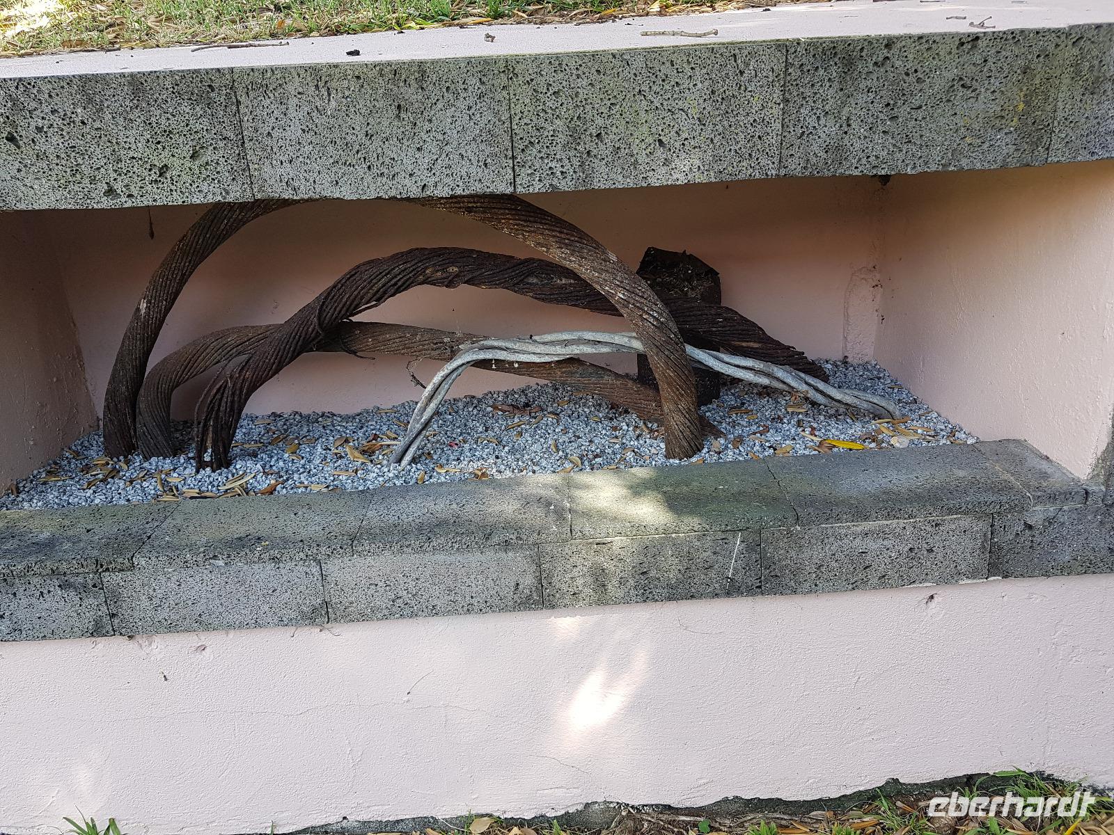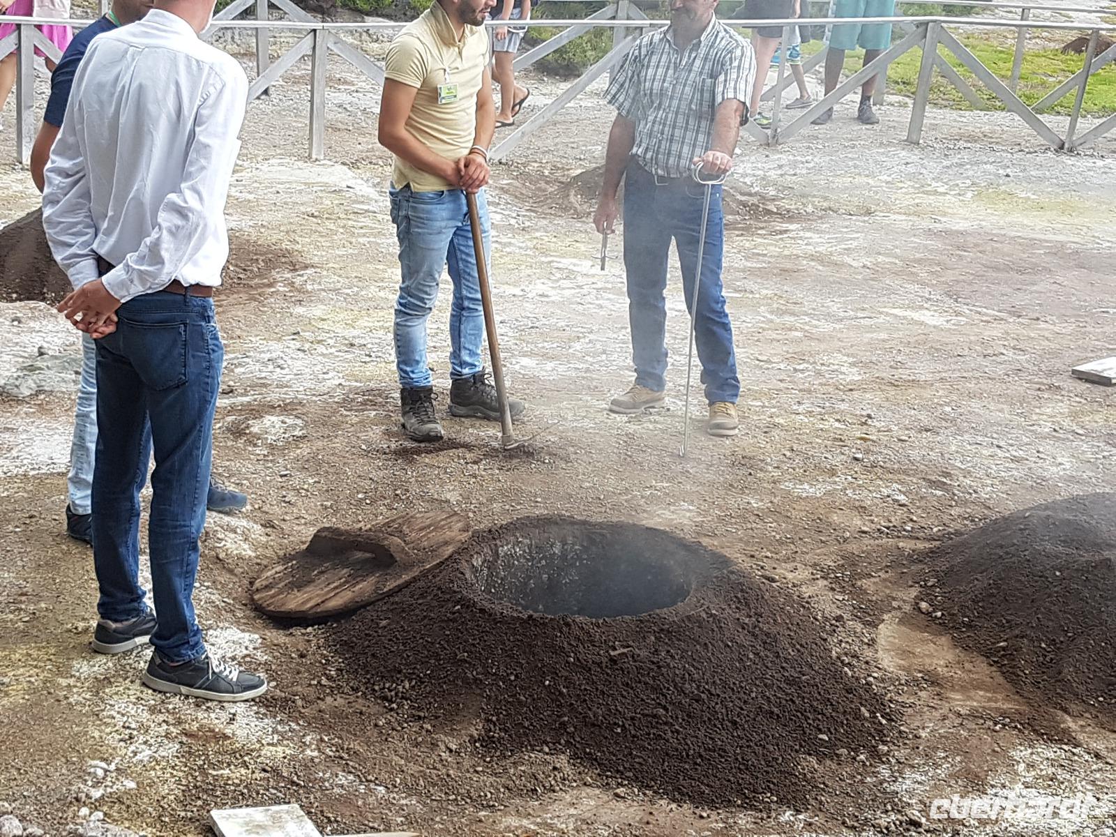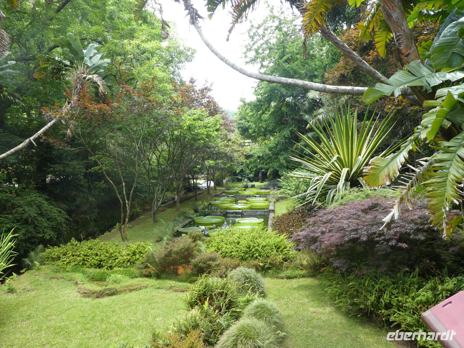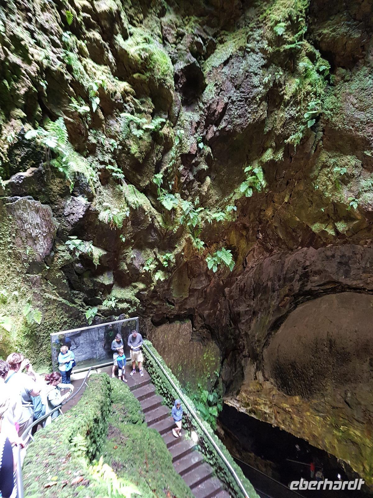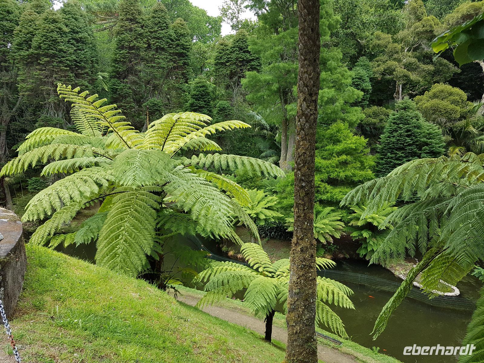 Heute fuhren wir noch einmal Richtung Osten, aber diesmal auf der Schnellstrasse bis nach Vila Franca do Campo. Unterwegs machten wir Halt mit schöner Aussicht hinunter zu einem Lavatunnel und dem Kloster Calura. Dann folgte ein zweiter Halt beim Felsen der Klippenspringer. In Vila Franco probierten wir die berühmten kleinen Käsekuchen Queijadas und kauften sie auch gleich als Mitbringsel ein. Oberhalb des Ortes liegt die berühmte Wallfahrtskirche Mutter Gottes des Friedens und dort lag unser nächstes Ziel. Wir stiegen die vielen Treppen hinauf und hatten von oben eine traumhafte Aussicht. Zahlreiche Hortensien säumten die Straßenränder sowie die Hänge neben dem Treppenaufgang. Unsere Fahrt ging weiter nach Furnas hinunter zu den Quellen und brodelnden Erdlöcher. In einem wurde gerade Mais gegart. Oben am Furnassee sahen wir dann wie der Topf mit unserem Mittagessen Cozido aus dem heissen Erdloch gezogen wurde. Danach probierten wir diese Köstlichkeit in Tonys Restaurant. Den Nachmittag verbrachten wir im Park Terra Nostra zunächst mit einem ausgiebigen Rundgang, um das reichliche Mittagessen zu verdauen und die Pflanzenpracht des Parkes zu bestaunen. Den Abschluss bildete ein Bad im 38 Grad warmen Wasser. Auf der Rückfahrt hielten wir hoch oben über Furnas an einem Aussichtspunkt und fuhren dann noch weiter bis zur Teeplantage von Gorreana. Joaquim führte uns durch die Produktion und nach der Verkostung wurde fleissig Tee gekauft. Zum Abendessen spazierten wir wieder hinunter ins Zentrum und fanden Platz im Cafe Central gegenüber der Hauptkirche.
