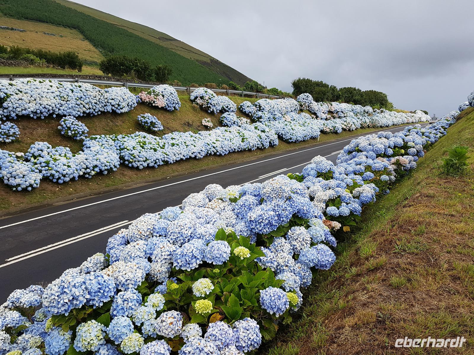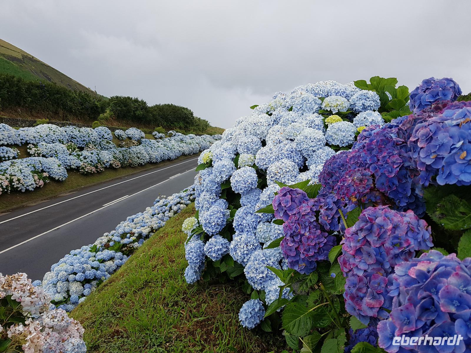 9 Inseln weit draussen im Atlantik, viel Grün, Hortensien soweit das Auge schauen kann, erloschene und eigestürzte Vulkane, Seglerhäfen, Stiere, Wale und Delphine, brodelnde Erdlöcher und vieles mehr