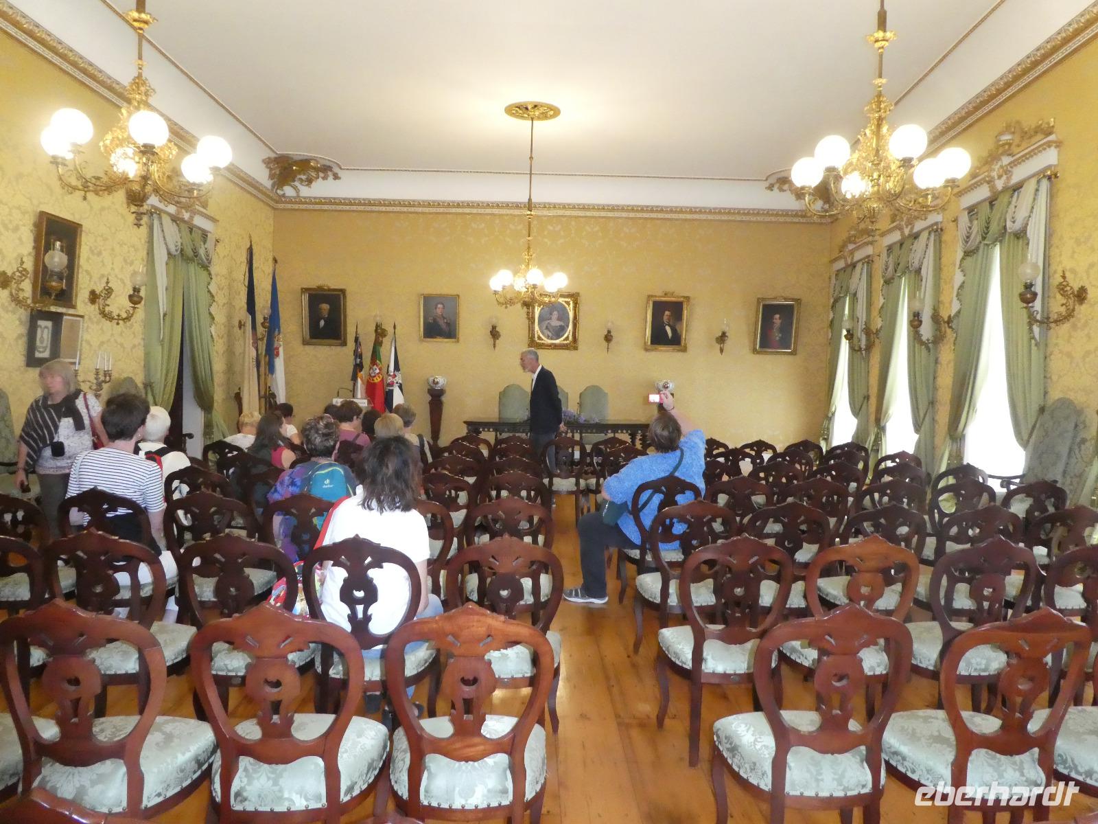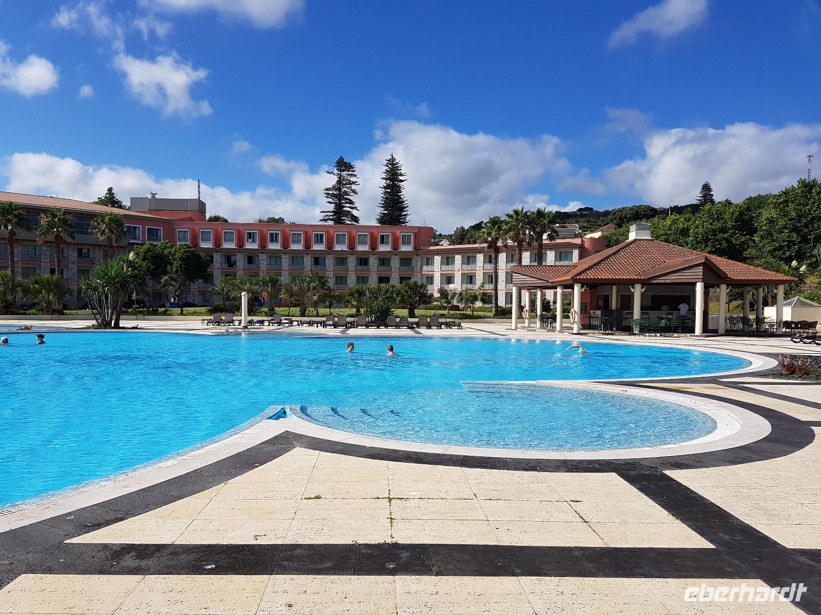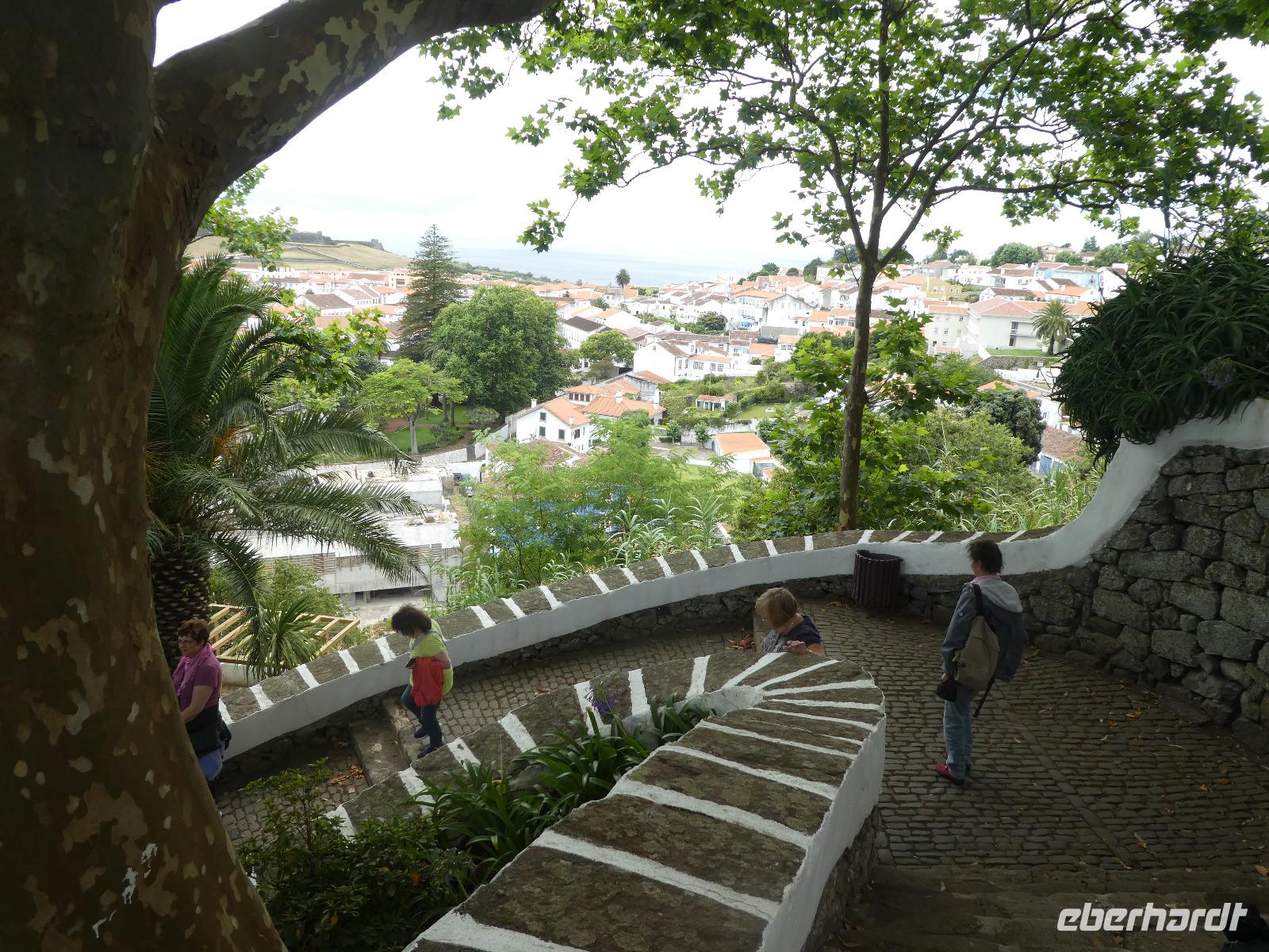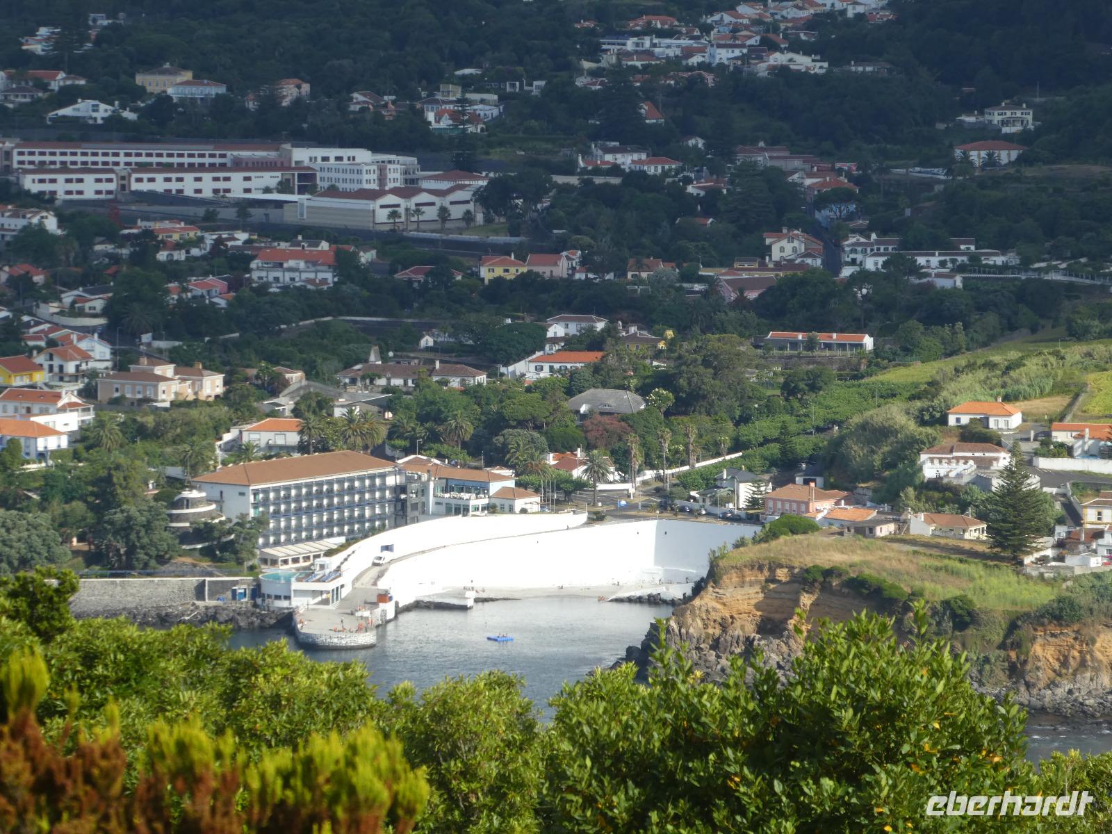 Nach einem zeitigen Frühstück brachte uns Paolo zum Flughafen und wir verabschiedeten uns sehr herzlich von ihm, denn einen Fahrer, der deutsch bei uns in Thüringen lernte, hatten wir nicht erwartet. Am Flughafen erfuhren wir, dass unser Flug 9 Uhr gestrichen war, aber nach einiger Aufregung wurden wir alle auf die 11 Uhr Maschine gebucht und bekamen ein zweites Frühstück von der SATA. Leider flogen wir dann aber erst nach 13 Uhr ab. In Terceira wurden wir schon erwartet und der Bus brachte uns nach Angra zum Obelisken im Park und von dort oben begannen wir unseren Stadtspaziergang. Über viele Treppen gingen wir hinunter zur Jesuitenkirche und sahen unterwegs herrlich gepflegte Blumenbeete und einen sehr schön gestalteten Park. Im Rathaus besuchten wir im Obergeschoss die beiden Ratssäle und Joaquim erklärte uns die Geschichte dieser berühmten Stadt. Durch wunderschöne Strassen und Gassen sahen wir am Hafen das Denkmal für Vasco da Gama und im beühmtesten Cafe endlich machten wir eine Pause. Der nächste Abstecher führte in ein Jugendstiltheater und dort zitierte Joaquim den Text aus der Nationalhymne. Nach einem Stopp im Supermarkt gingen wir durch die Peterstrasse zu unserem Hotel Terceira Mar. Unsere Koffer waren schon auf den Zimmern und so erkundeten wir sogleich den Garten mit dem riesigen Pool am Meer.