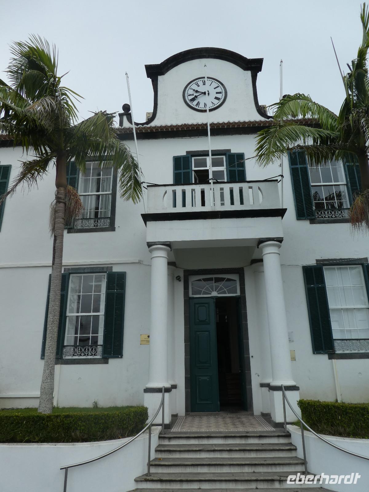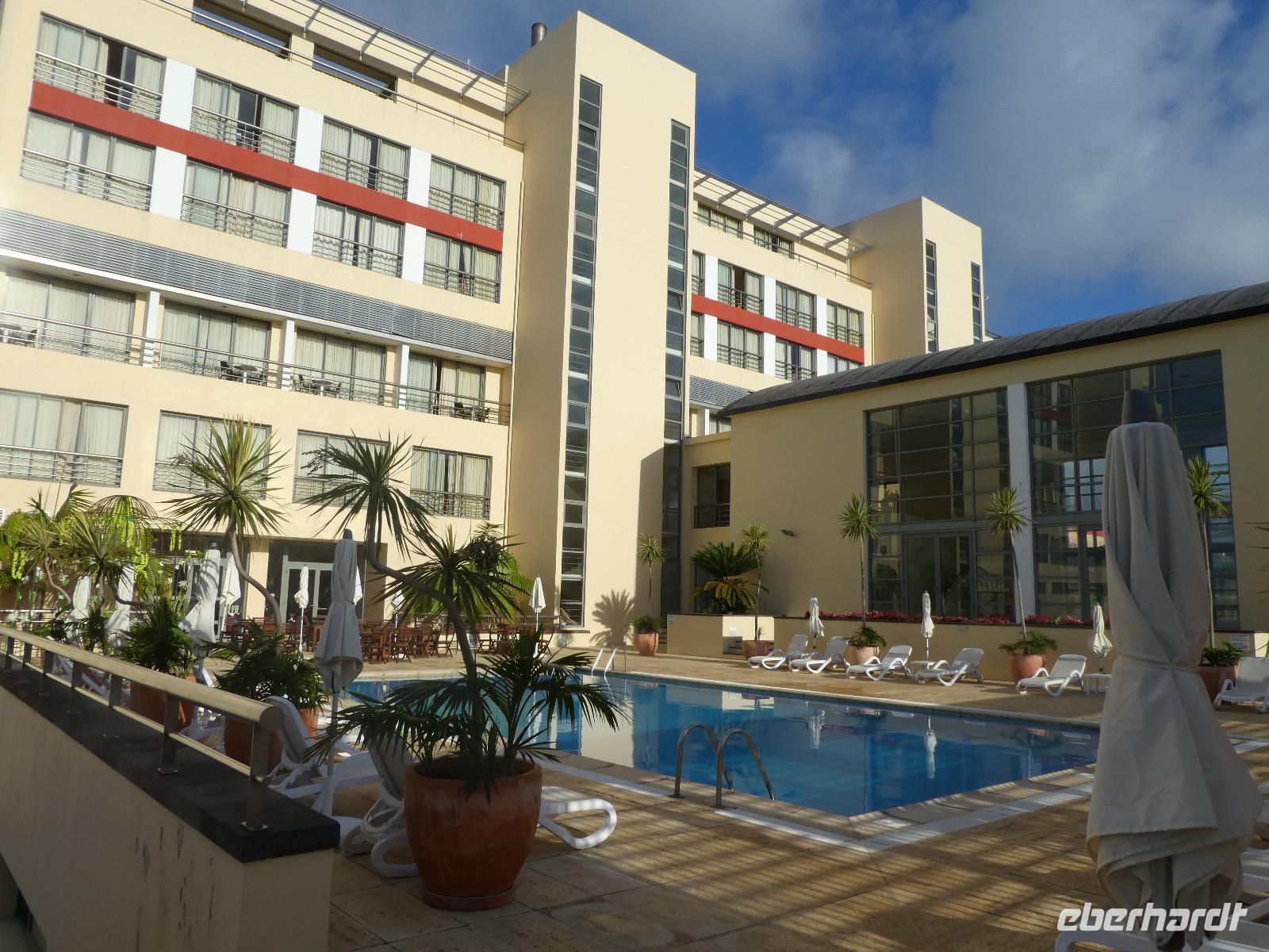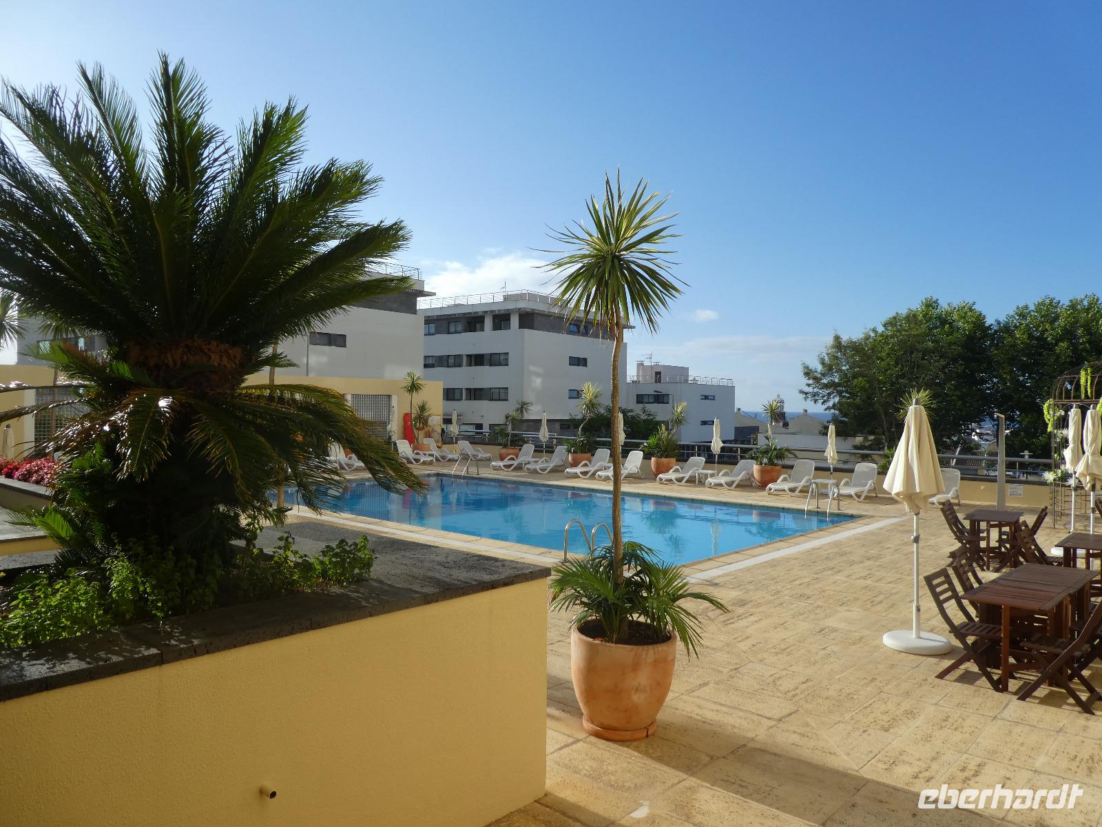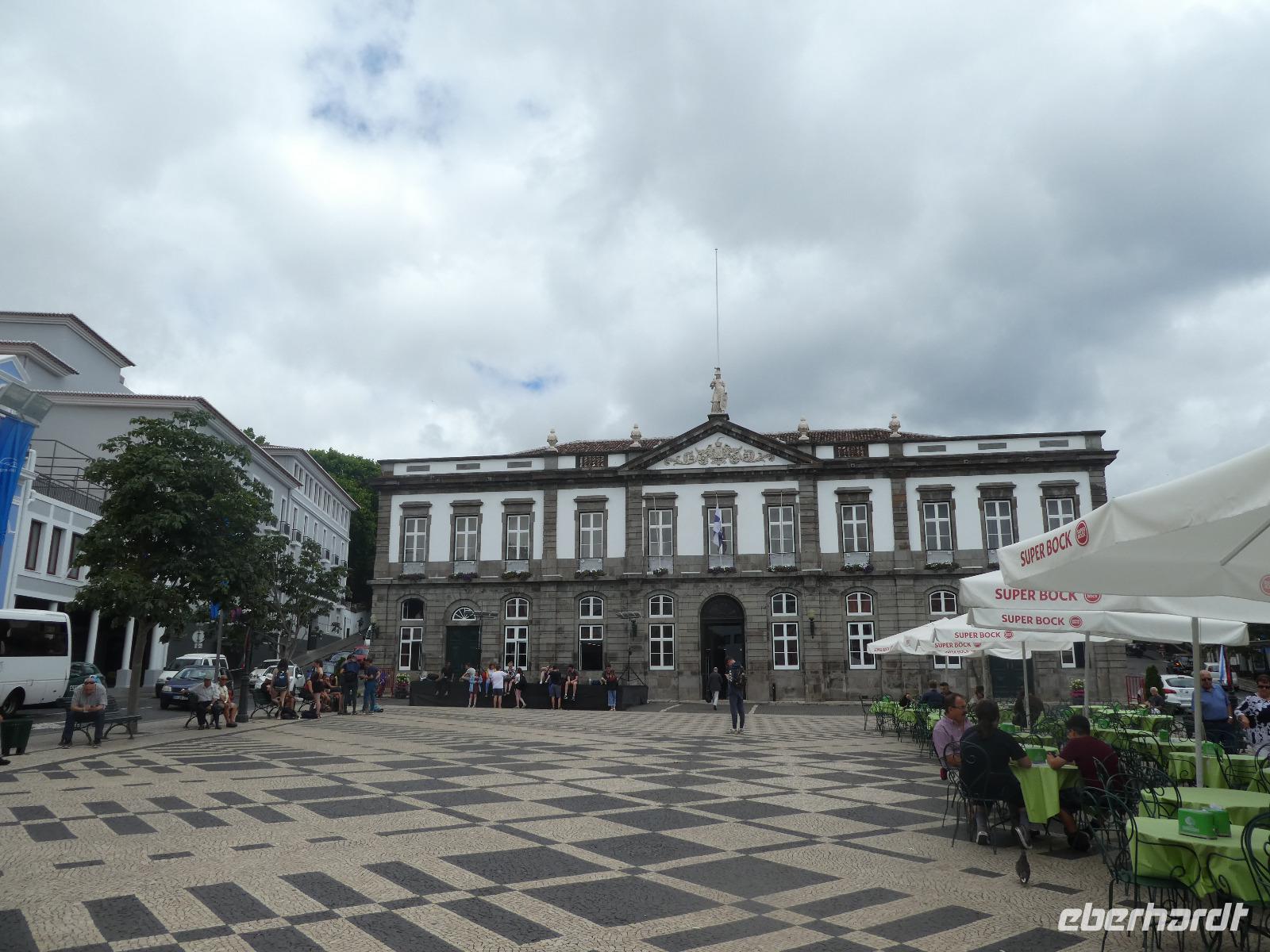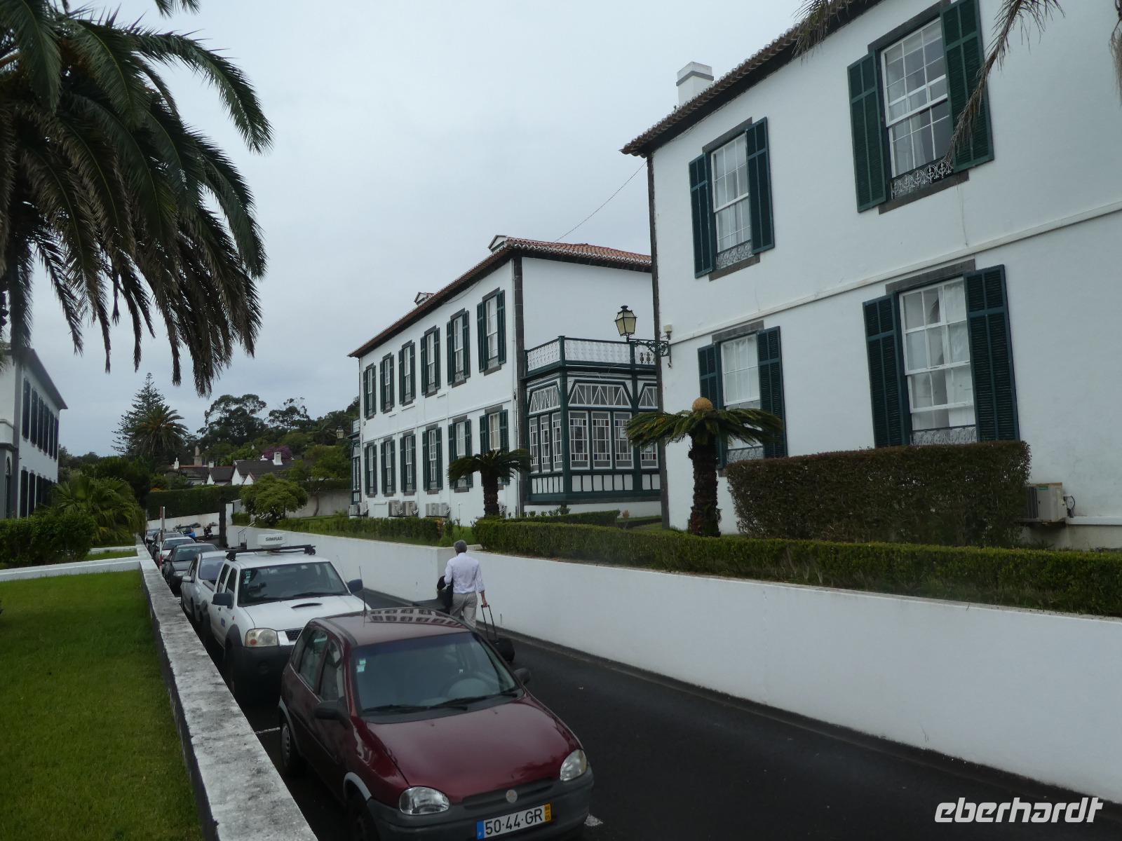Nach einem zeitigen Frühstück brachte uns Paolo zum Flughafen und wir verabschiedeten uns sehr herzlich von ihm, denn einen Fahrer, der deutsch bei uns in Thüringen lernte, hatten wir nicht erwartet. Am Flughafen erfuhren wir, dass unser Flug 9 Uhr gestrichen war, aber nach einiger Aufregung wurden wir alle auf die 11 Uhr Maschine gebucht und bekamen ein zweites Frühstück von der SATA. Leider flogen wir dann aber erst nach 13 Uhr ab. In Terceira wurden wir schon erwartet und der Bus brachte uns nach Angra zum Obelisken im Park und von dort oben begannen wir unseren Stadtspaziergang. Über viele Treppen gingen wir hinunter zur Jesuitenkirche und sahen unterwegs herrlich gepflegte Blumenbeete und einen sehr schön gestalteten Park. Im Rathaus besuchten wir im Obergeschoss die beiden Ratssäle und Joaquim erklärte uns die Geschichte dieser berühmten Stadt. Durch wunderschöne Strassen und Gassen sahen wir am Hafen das Denkmal für Vasco da Gama und im beühmtesten Cafe endlich machten wir eine Pause. Der nächste Abstecher führte in ein Jugendstiltheater und dort zitierte Joaquim den Text aus der Nationalhymne. Nach einem Stopp im Supermarkt gingen wir durch die Peterstrasse zu unserem Hotel Terceira Mar. Unsere Koffer waren schon auf den Zimmern und so erkundeten wir sogleich den Garten mit dem riesigen Pool am Meer.