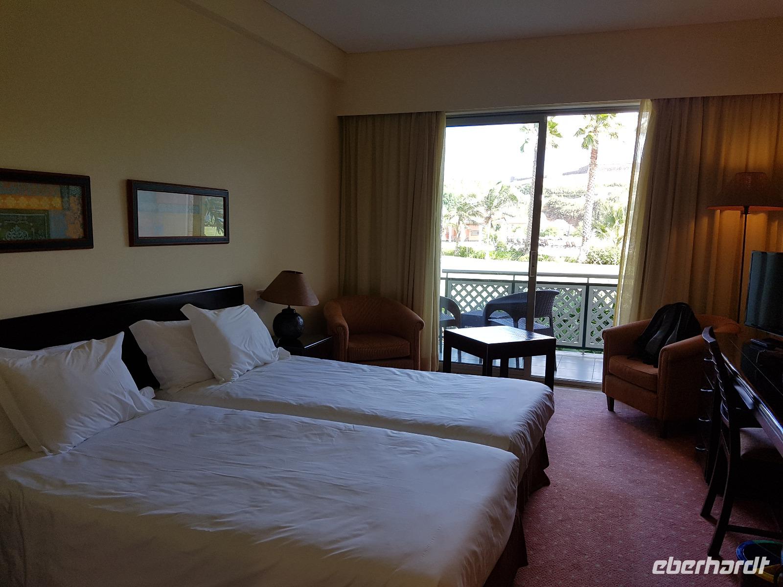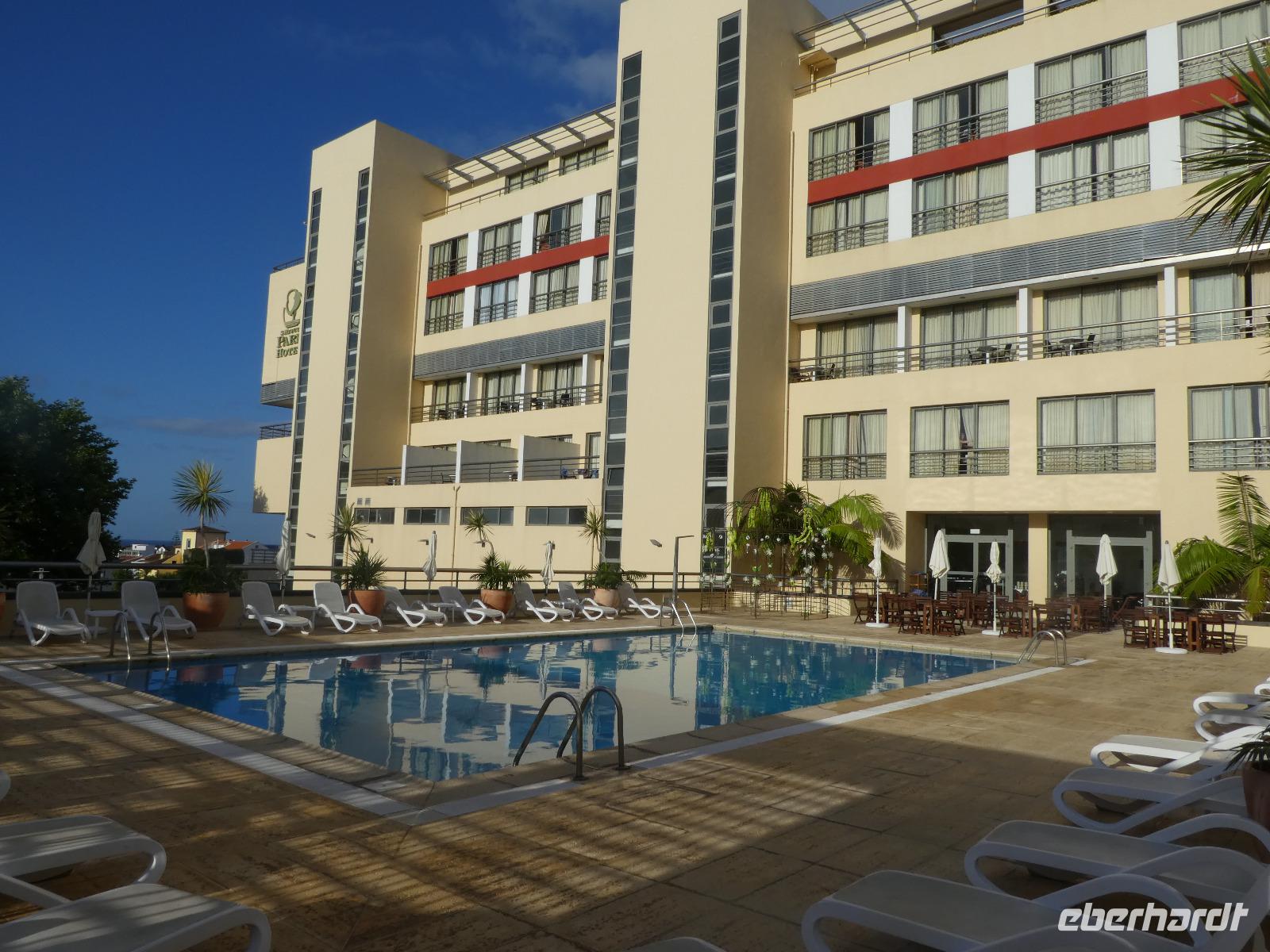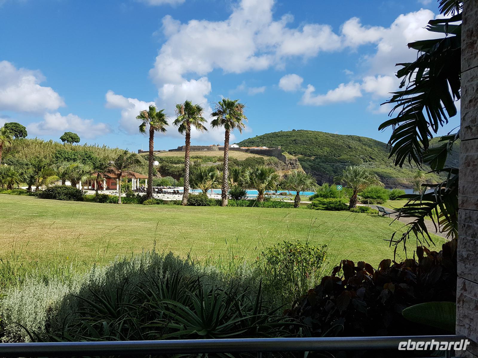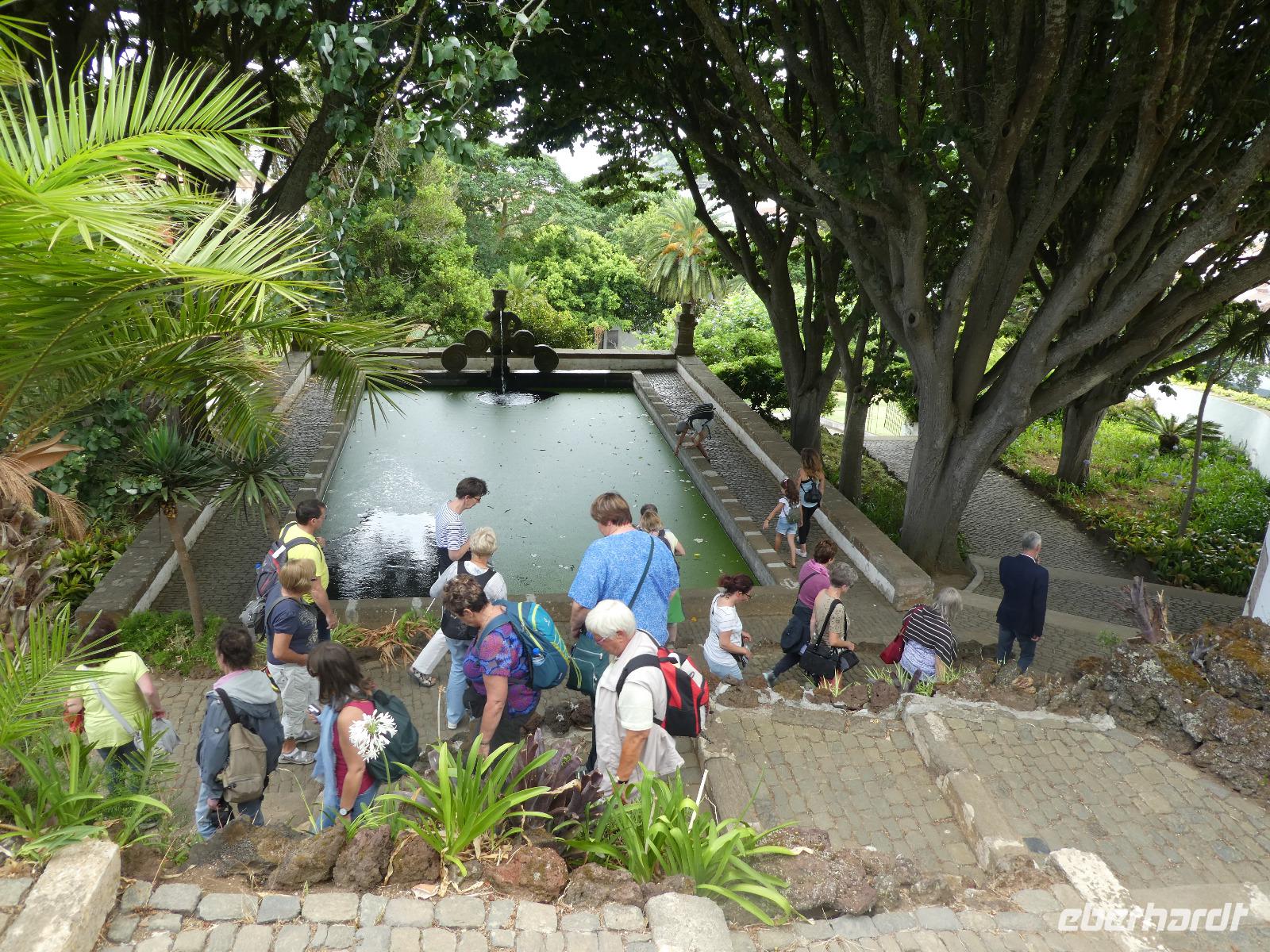 Nach einem zeitigen Frühstück brachte uns Paolo zum Flughafen und wir verabschiedeten uns sehr herzlich von ihm, denn einen Fahrer, der deutsch bei uns in Thüringen lernte, hatten wir nicht erwartet. Am Flughafen erfuhren wir, dass unser Flug 9 Uhr gestrichen war, aber nach einiger Aufregung wurden wir alle auf die 11 Uhr Maschine gebucht und bekamen ein zweites Frühstück von der SATA. Leider flogen wir dann aber erst nach 13 Uhr ab. In Terceira wurden wir schon erwartet und der Bus brachte uns nach Angra zum Obelisken im Park und von dort oben begannen wir unseren Stadtspaziergang. Über viele Treppen gingen wir hinunter zur Jesuitenkirche und sahen unterwegs herrlich gepflegte Blumenbeete und einen sehr schön gestalteten Park. Im Rathaus besuchten wir im Obergeschoss die beiden Ratssäle und Joaquim erklärte uns die Geschichte dieser berühmten Stadt. Durch wunderschöne Strassen und Gassen sahen wir am Hafen das Denkmal für Vasco da Gama und im beühmtesten Cafe endlich machten wir eine Pause. Der nächste Abstecher führte in ein Jugendstiltheater und dort zitierte Joaquim den Text aus der Nationalhymne. Nach einem Stopp im Supermarkt gingen wir durch die Peterstrasse zu unserem Hotel Terceira Mar. Unsere Koffer waren schon auf den Zimmern und so erkundeten wir sogleich den Garten mit dem riesigen Pool am Meer.