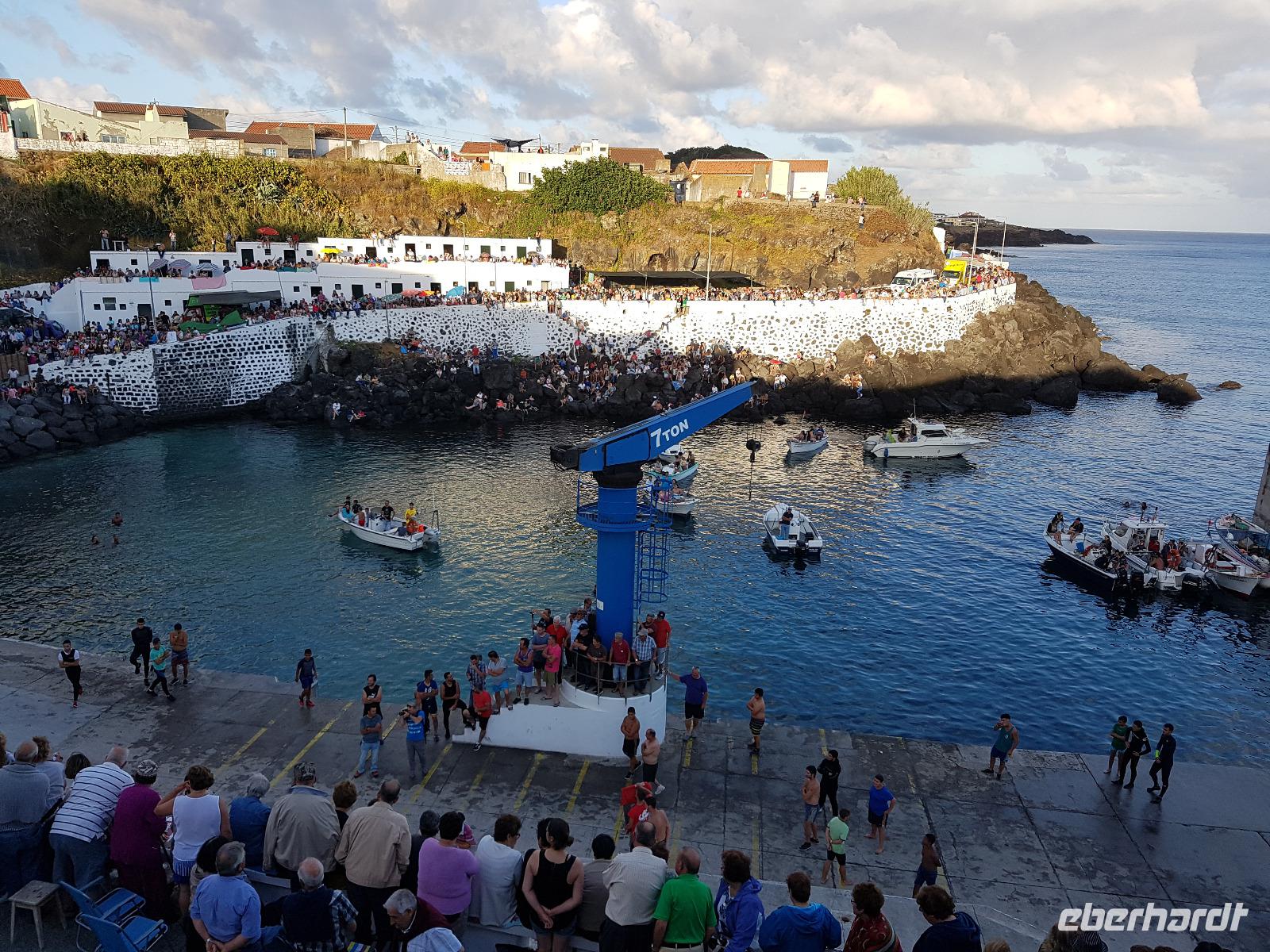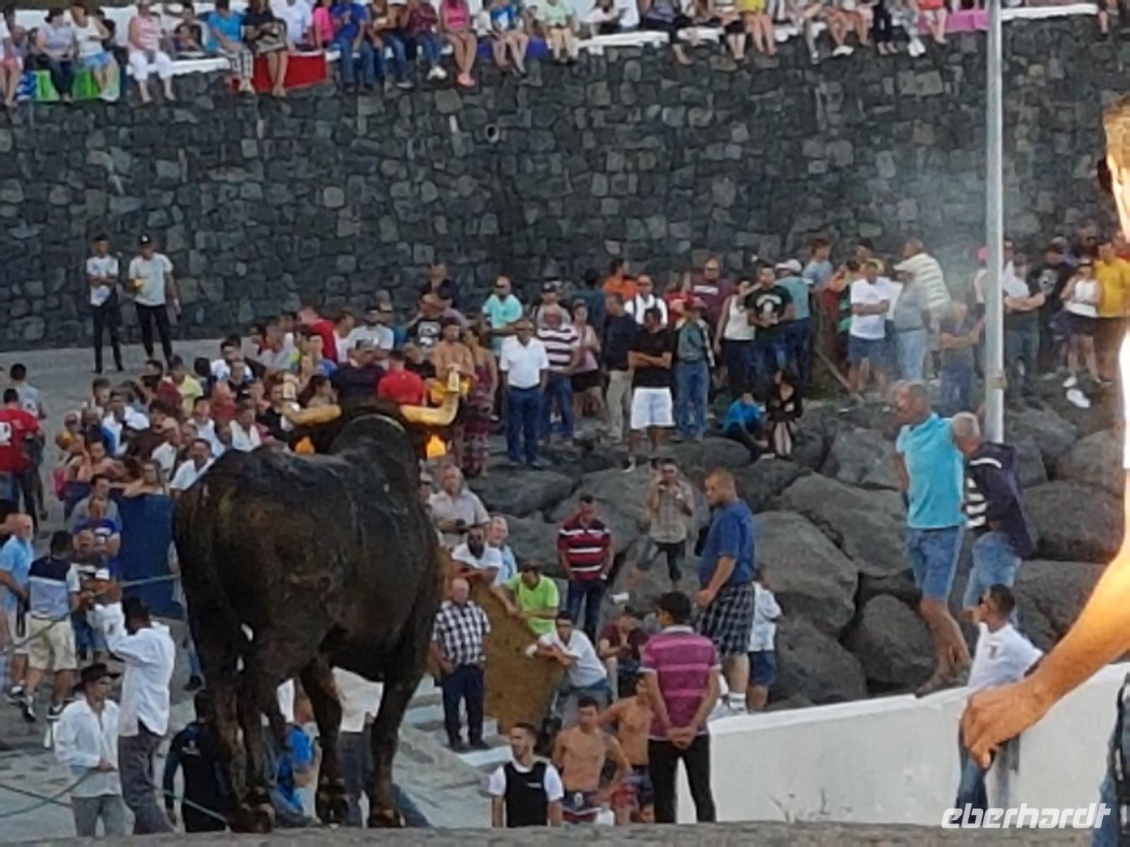 Bereits auf der Fahrt vom Flughafen gab Joaquim viele Informationen zu den Festen auf der Insel und vom Busfahrer erfuhren wir, dass im Nachbarort eine TOURADA stattfindet. So fuhren 14 Singles Abends mit Taxen dorthin und alle waren sehr gespannt. In Porto Judeu stiegen wkr aus und liefen die von vielen Menschen gesäumte Strasse hinunter zum Hafen. Plötzlich waren alle ganz aufgeregt und rissen uns von der Strasse und da stand der Stier auch schon vor uns. Wir waren sehr überrascht und erfreut zugleich und mussten uns danach erst einen sicheren Beobachtungsplatz suchen Das war aber kein Problem, weil die Dorfbewohner sehr freundlich und besorgt um uns waren. Auf den Schreck stärkten wir uns erst einmal und suchten uns dann einen neuen Platz, wo wir sicher waren und die Stierspiele auch gut beobachten konnten. Auf den zweiten, dritten und vierten Stier waren wir gut vorbereitet und konnten das Spektakel geniessen. Der Stier wird an einer langen Leine von 4 bis 5 starken Männern gehalten und Mutige versuchen ihn zu reizen und damit die Zuschauer zu unterhalten. Auch ist es Ziel, den Stier ins Hafenbecken springen zu sehen. Nach 15 Minuten darf der Stier wieder in seine Box, dann folgt eine Pause und der nächste Stier kommt raus. Wir waren überwältigt von der Gastfreundschaft der Menschen und wurden danach von den Taxen wieder ins Hotel zurück gebracht. Dort nahmen wir auf der Terrasse noch einen Drink zum Tagesausklang.