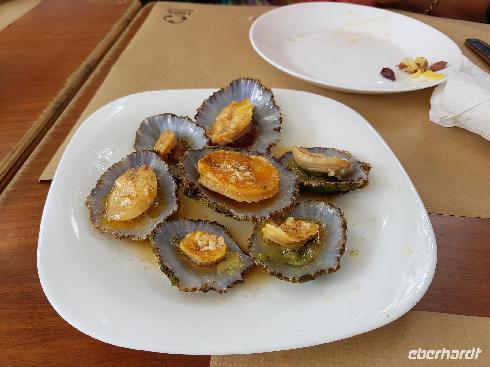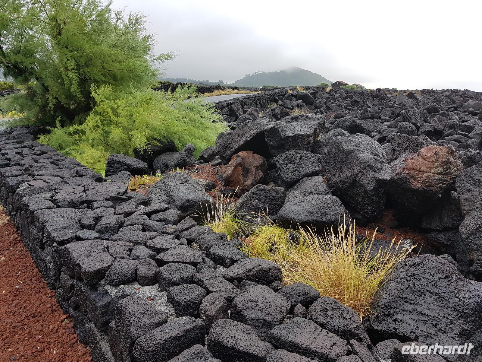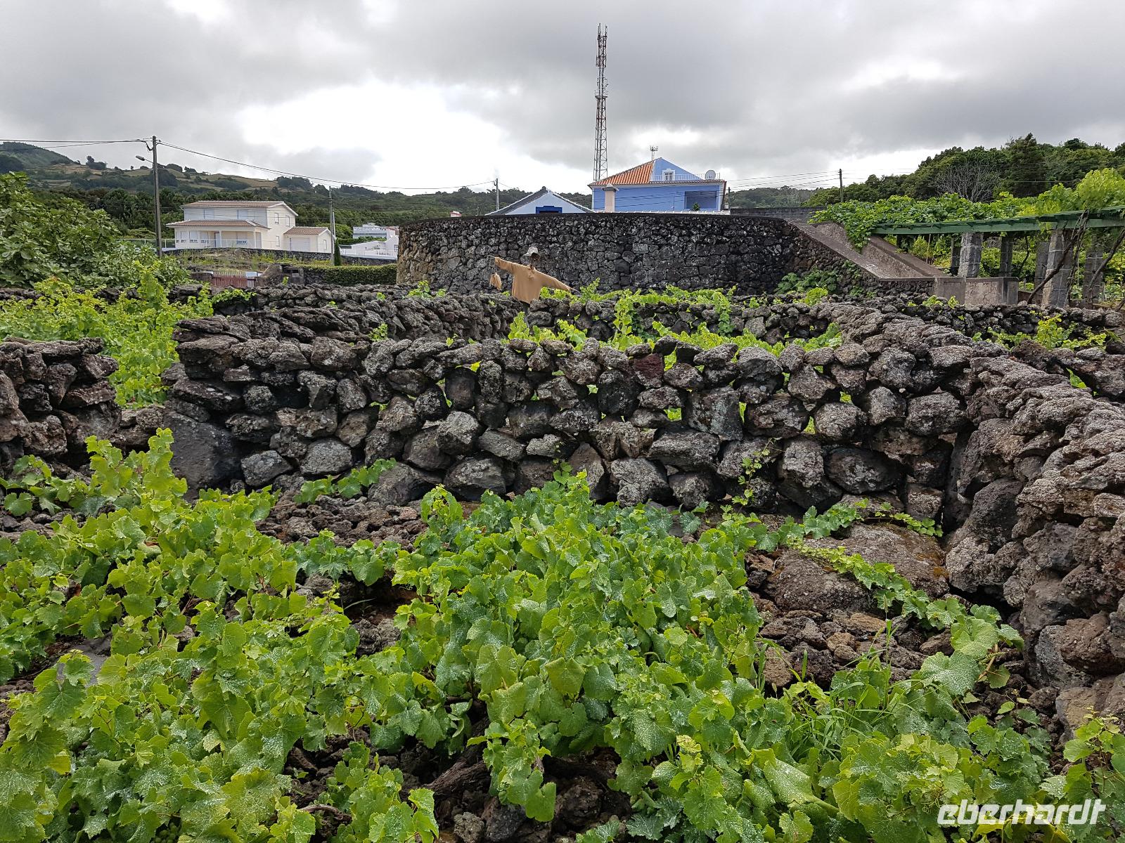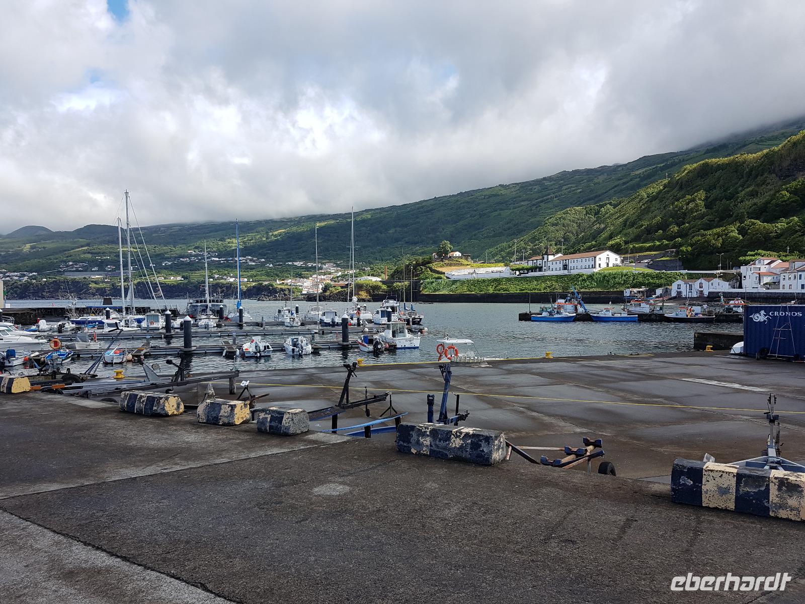 Heute war kein prächtiges Wetter und alles in Wolken gehüllt. Nach einem zeitigen Frühstück fuhren wir mit dem Bus zum Fährhafen und von dort 7.30 Uhr mit der Fähre hinüber nach Pico. Drüben auf der schwarzen Insel wartete schon der Bus für unsere Rundfahrt. Da kein schönes Wetter war, fuhren wir zunächst am Meer entlang zu den Weingärten und spazierten hindurch, um die Kultur der Reben ganz aus der Nähe zu sehen. Die Weinreben sind durch Mauern aus Lavasteinen gegen Wind geschützt und auch die Weinlese wird damit sehr aufwändig. In Lajes besuchten wir nach einer Kaffeepause das Walfang Museum. Wir sahen einen Film über den Walfang, der seit 1986 nun endich verboten ist. Leider besserte sich das Wetter nicht und so ging unsere Fahrt über das Hochland, von wo man eigentlich den Berg Pico sehr schön sieht, nur durch dicke Wolken -sehr schade, aber nicht zu ändern. Wieder unten am Meer an der Nordküste in Sao Roque besuchten wir die Kirche und machten eine ausgiebige Mittagspause mit sehr reichlich zu essen. Sogar Napfschnecken durften wir probieren und freche kleine Vögel und Eidechsen stiebitzten von unserem Buffet. Die dortigen Meerwasserpools nutzten wir nicht, sondern fuhren zurück nach Madalena und nahmen schon die 16 Uhr Fähre zurück nach Horta. Zum Abendessen gingen wir hinunter zum Hafen und assen im Peter Cafe- dem angesagten Lokal der Azoren, was in diesem Jahr 100 Jahre besteht. Sehnsüchtig schauten wir hinüber nach Pico, aber der höchste Berg Portugals war immer noch in Wolken versteckt.
