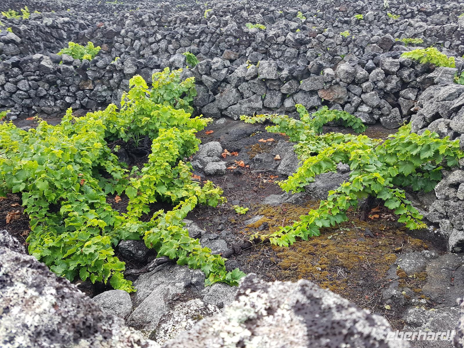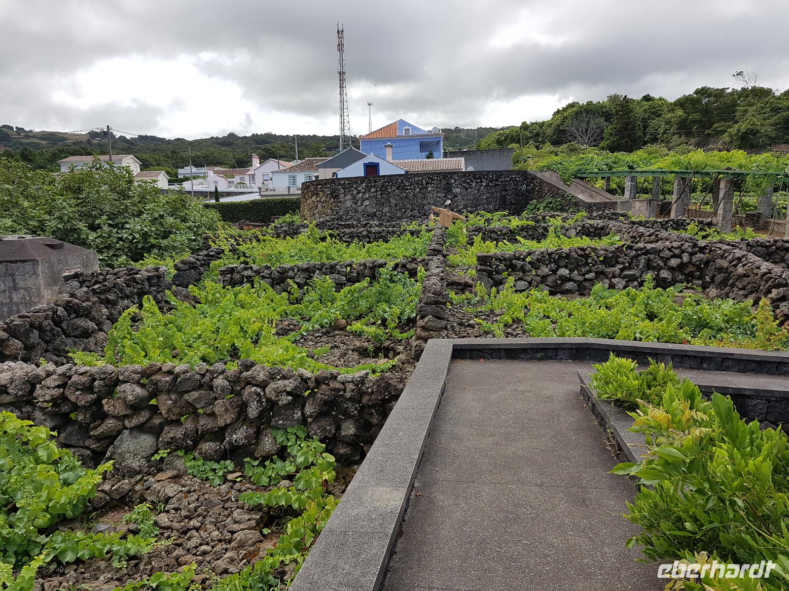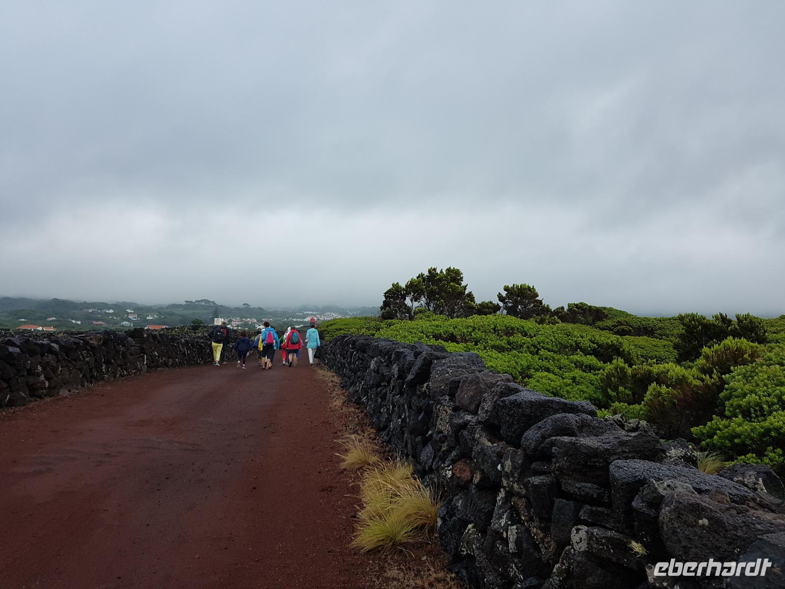 Heute war kein prächtiges Wetter und alles in Wolken gehüllt. Nach einem zeitigen Frühstück fuhren wir mit dem Bus zum Fährhafen und von dort 7.30 Uhr mit der Fähre hinüber nach Pico. Drüben auf der schwarzen Insel wartete schon der Bus für unsere Rundfahrt. Da kein schönes Wetter war, fuhren wir zunächst am Meer entlang zu den Weingärten und spazierten hindurch, um die Kultur der Reben ganz aus der Nähe zu sehen. Die Weinreben sind durch Mauern aus Lavasteinen gegen Wind geschützt und auch die Weinlese wird damit sehr aufwändig. In Lajes besuchten wir nach einer Kaffeepause das Walfang Museum. Wir sahen einen Film über den Walfang, der seit 1986 nun endich verboten ist. Leider besserte sich das Wetter nicht und so ging unsere Fahrt über das Hochland, von wo man eigentlich den Berg Pico sehr schön sieht, nur durch dicke Wolken -sehr schade, aber nicht zu ändern. Wieder unten am Meer an der Nordküste in Sao Roque besuchten wir die Kirche und machten eine ausgiebige Mittagspause mit sehr reichlich zu essen. Sogar Napfschnecken durften wir probieren und freche kleine Vögel und Eidechsen stiebitzten von unserem Buffet. Die dortigen Meerwasserpools nutzten wir nicht, sondern fuhren zurück nach Madalena und nahmen schon die 16 Uhr Fähre zurück nach Horta. Zum Abendessen gingen wir hinunter zum Hafen und assen im Peter Cafe- dem angesagten Lokal der Azoren, was in diesem Jahr 100 Jahre besteht. Sehnsüchtig schauten wir hinüber nach Pico, aber der höchste Berg Portugals war immer noch in Wolken versteckt.
